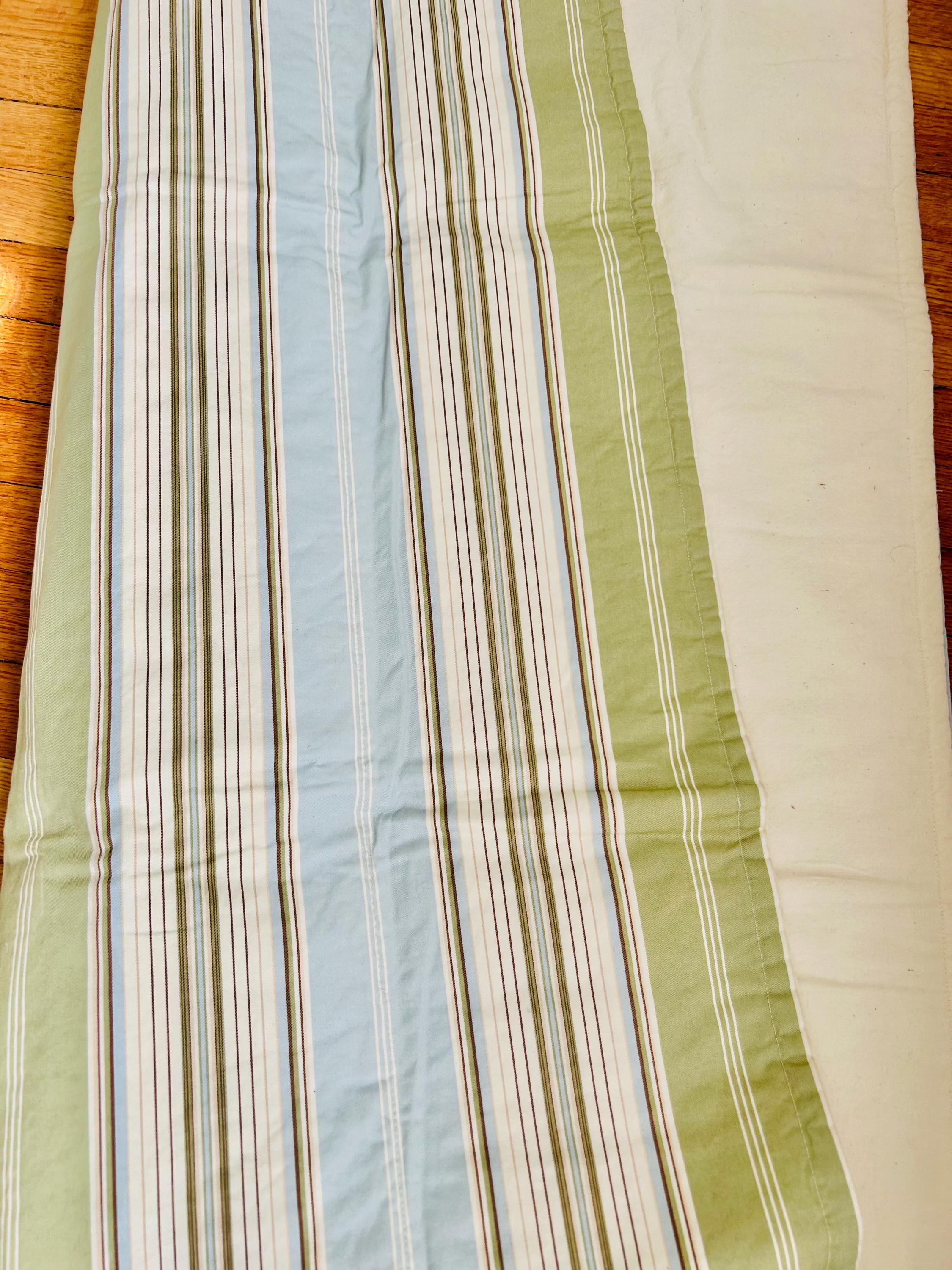 The quilt is backed with a coordinating striped cotton fabric in soft sage green, blue, and brown tones that has been knife-edge finished and machine sewn to form the binding. The batting appears to be lightweight flannel.