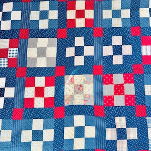 The hand-quilting is in outlines of the stars and in diagonal grids in the red open blocks. The back is off-white, cream muslin while the binding has been more recently replaced with a red and blue tiny floral print that has been machine-stitched to both sides. The cotton batting is very lightweight.