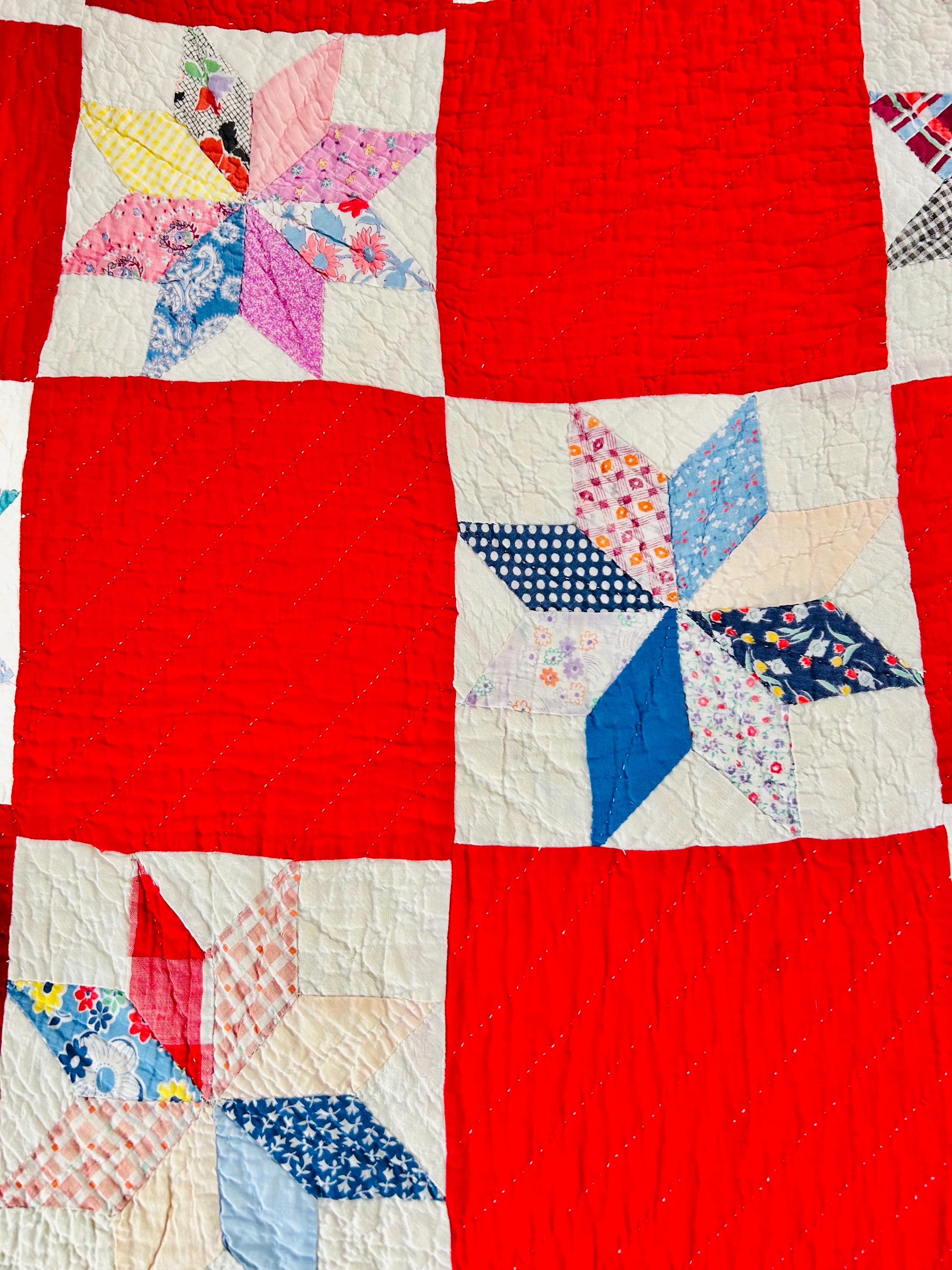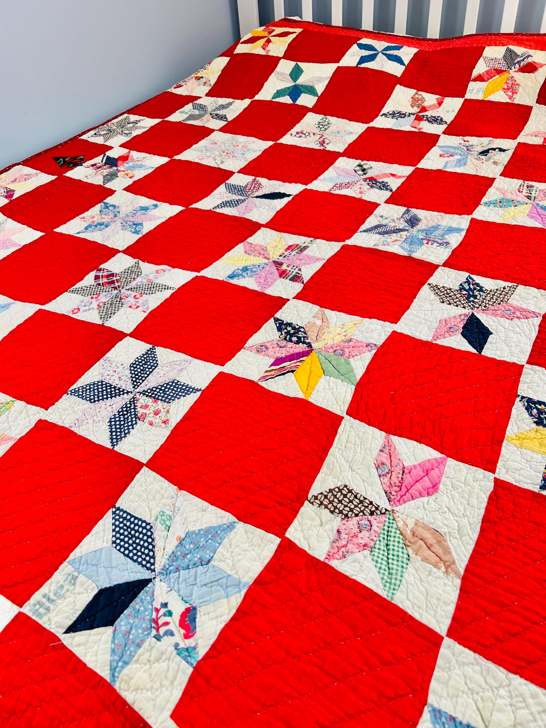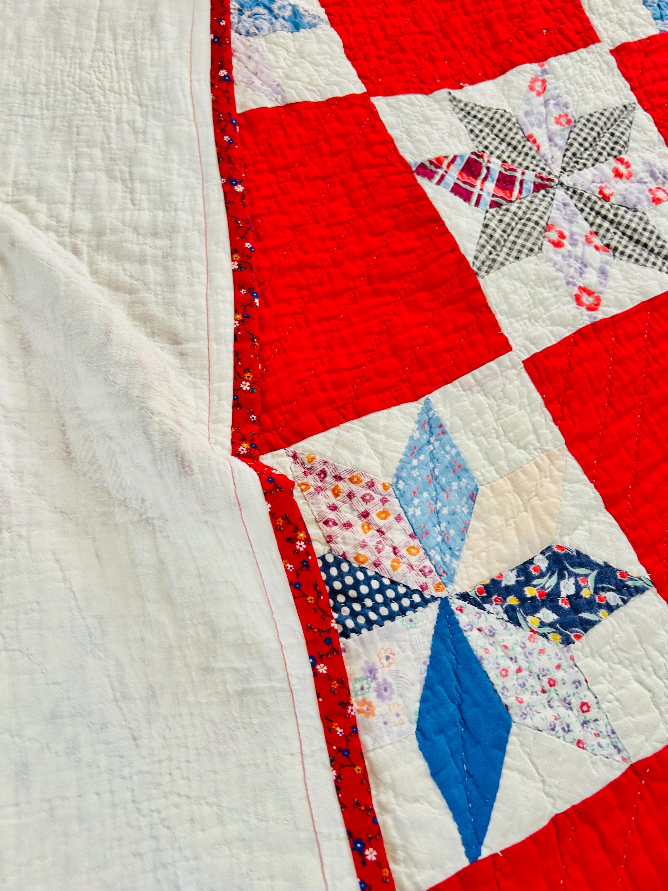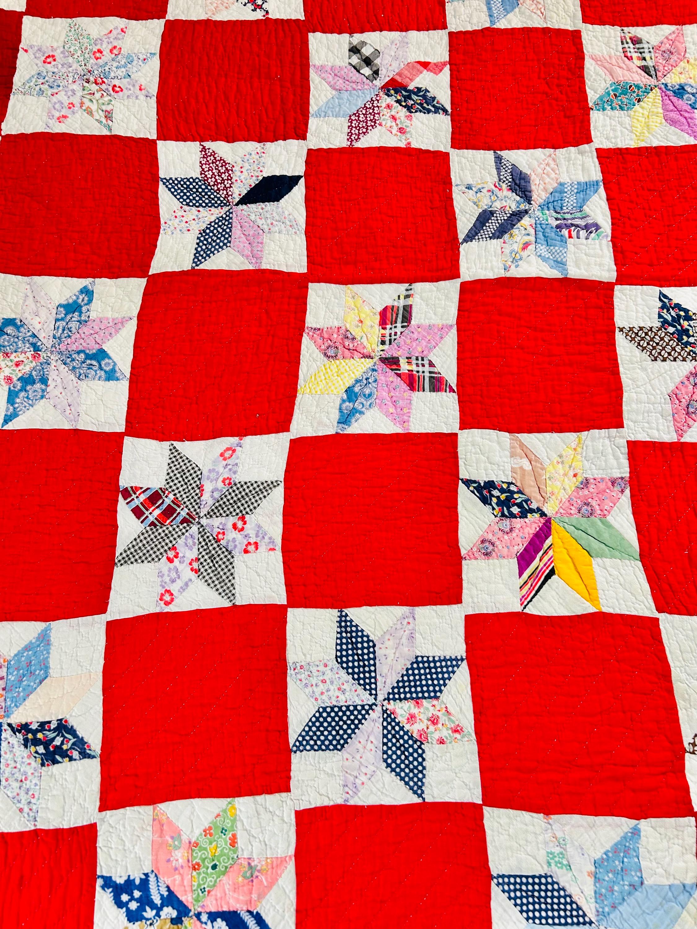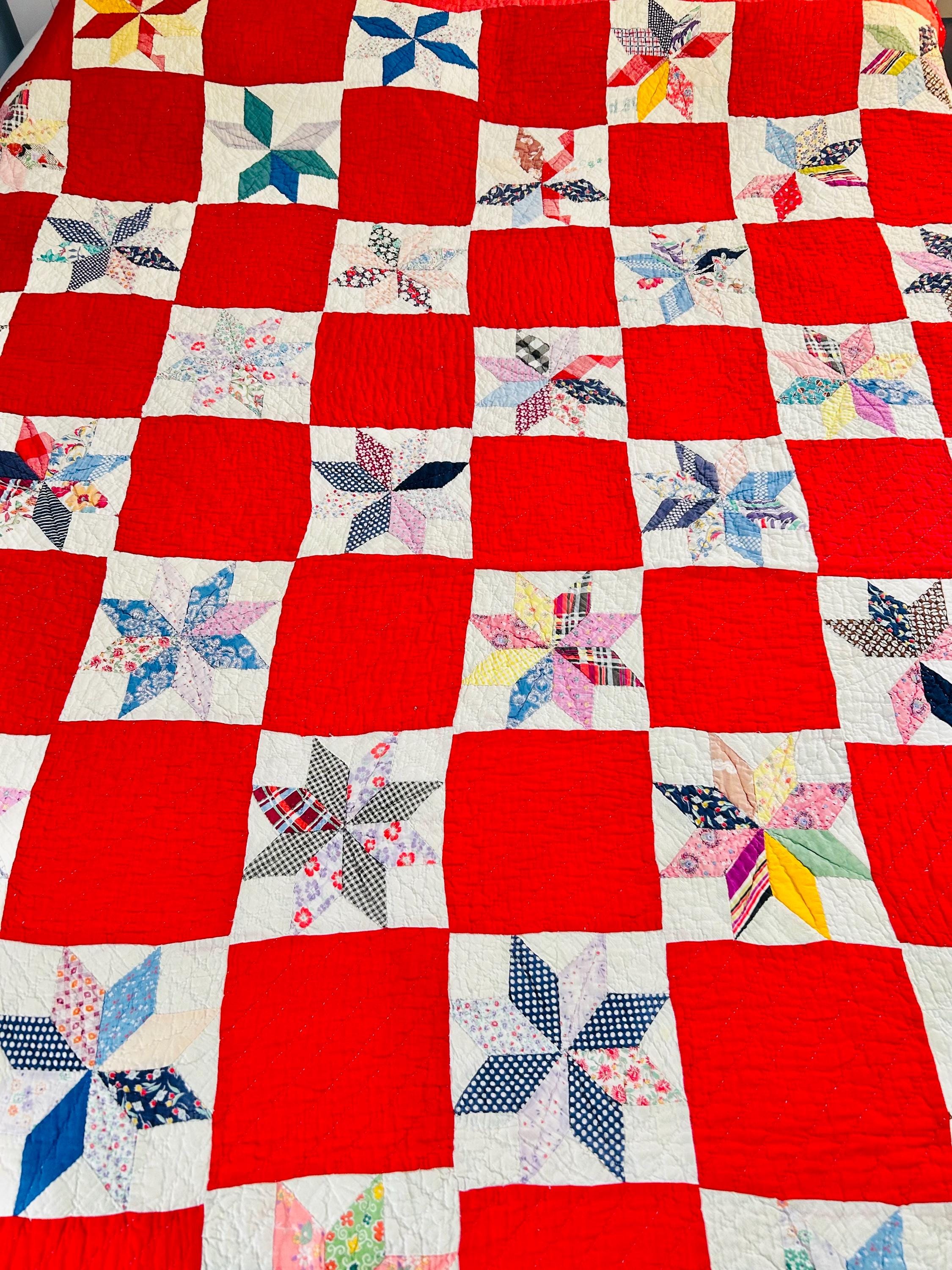 CONDITION: The quilt is in very good vintage condition with some dropped quilting stitches visible in some of the red blocks. PLEASE NOTE: Blue lettering from the feedsacks are visible in some of the star motifs but this is original to the quilt and not considered a condition issue.