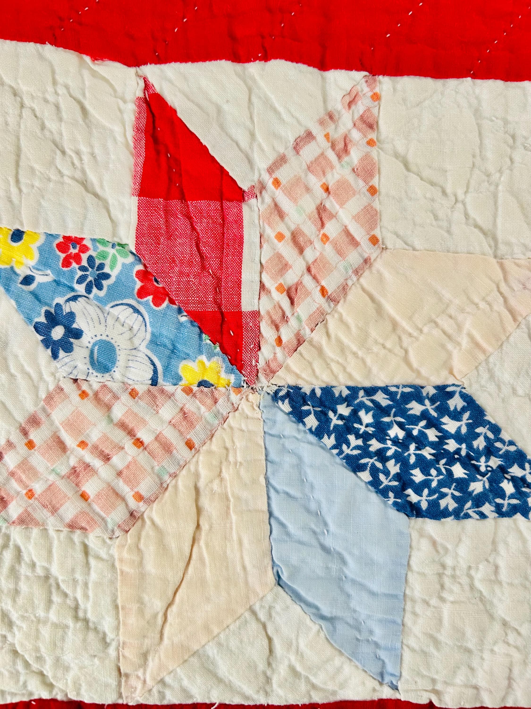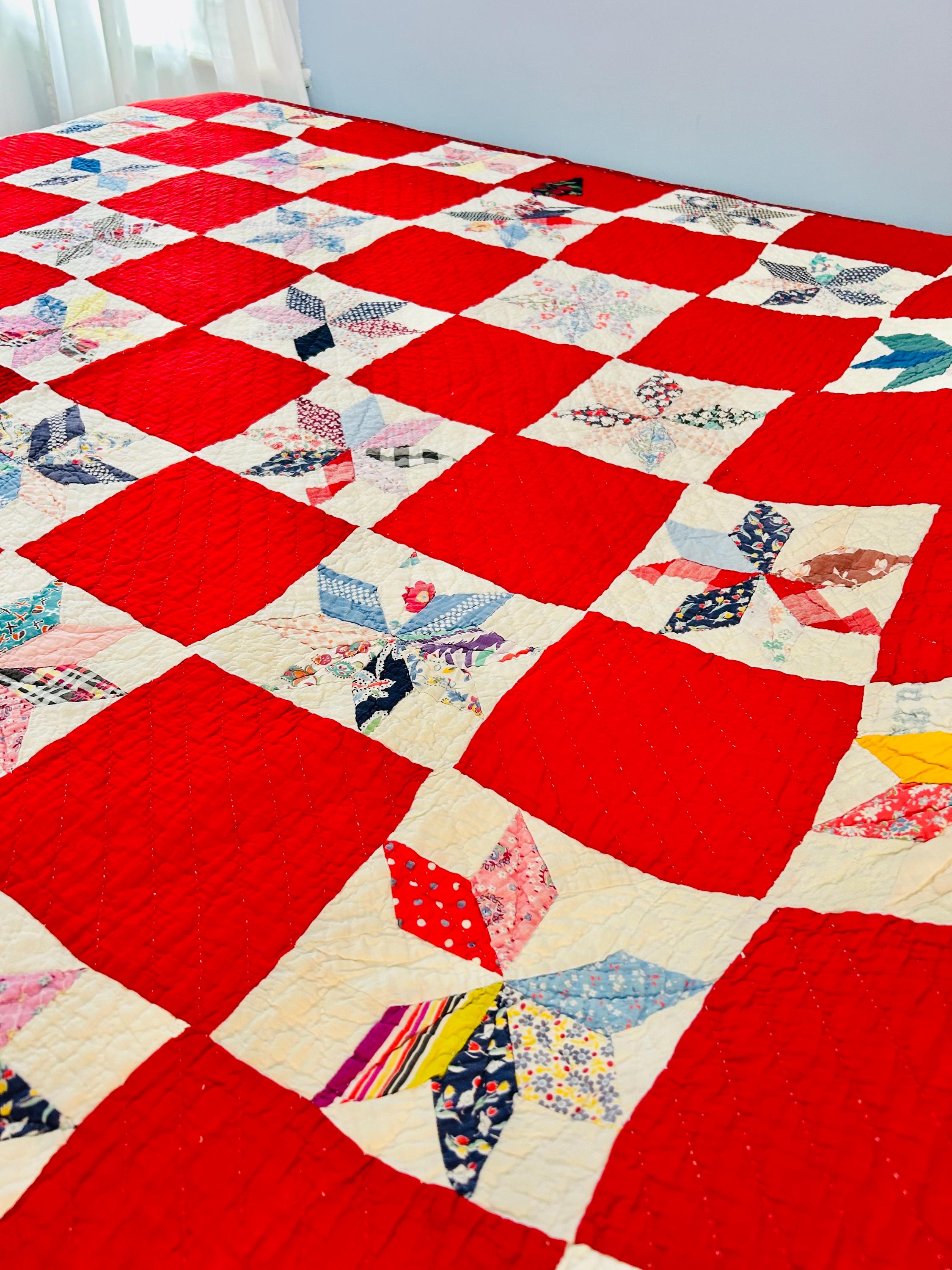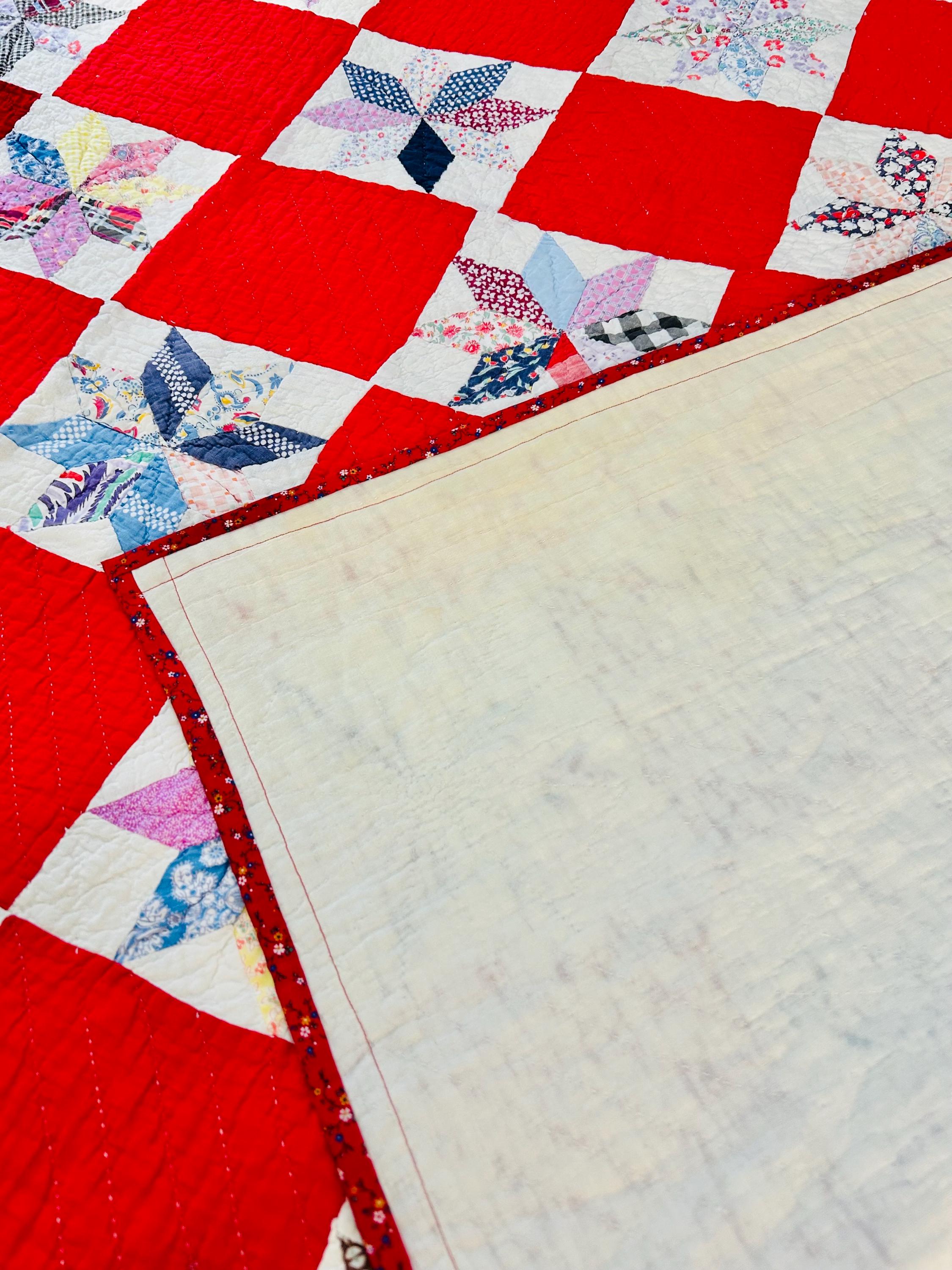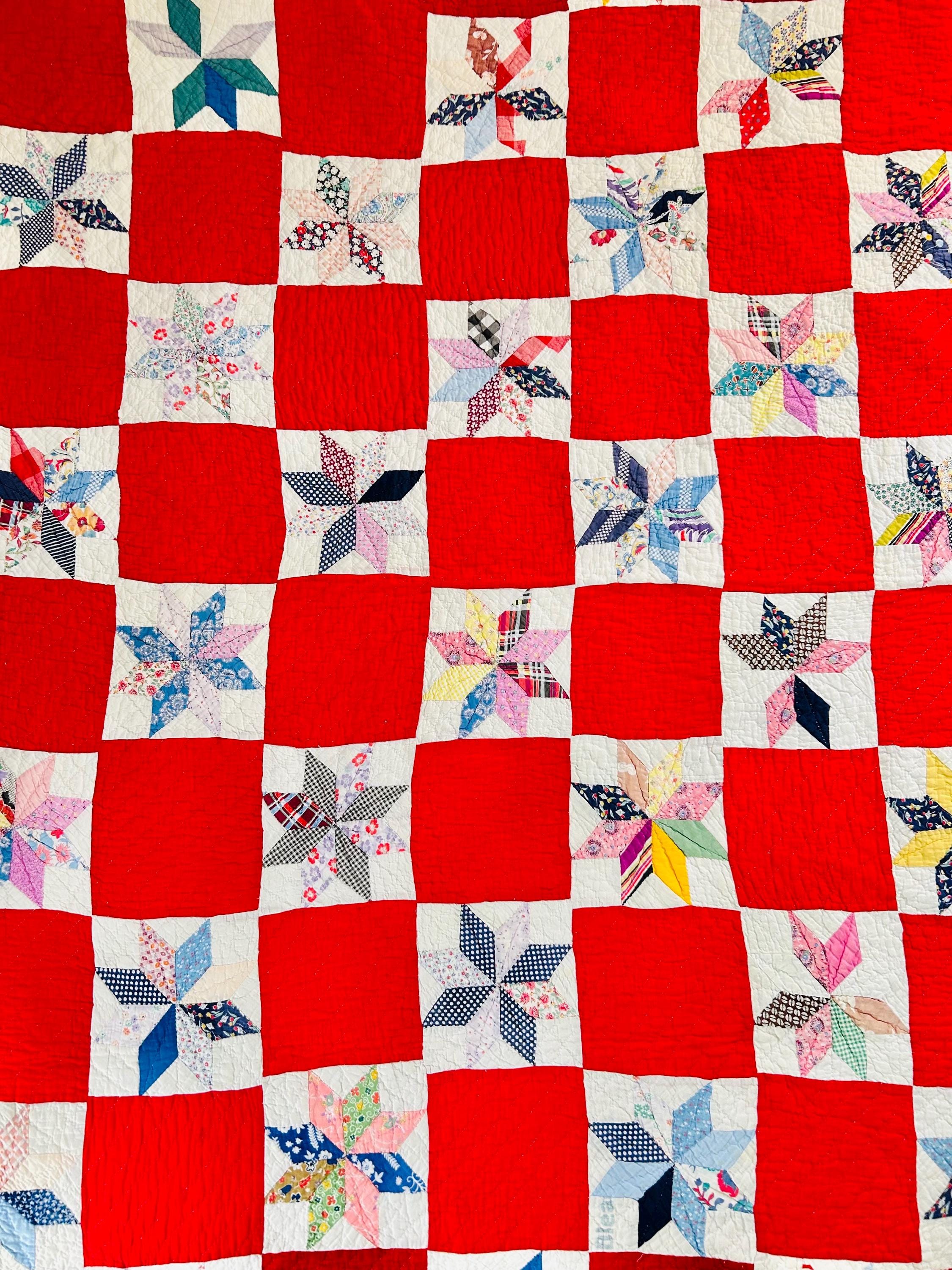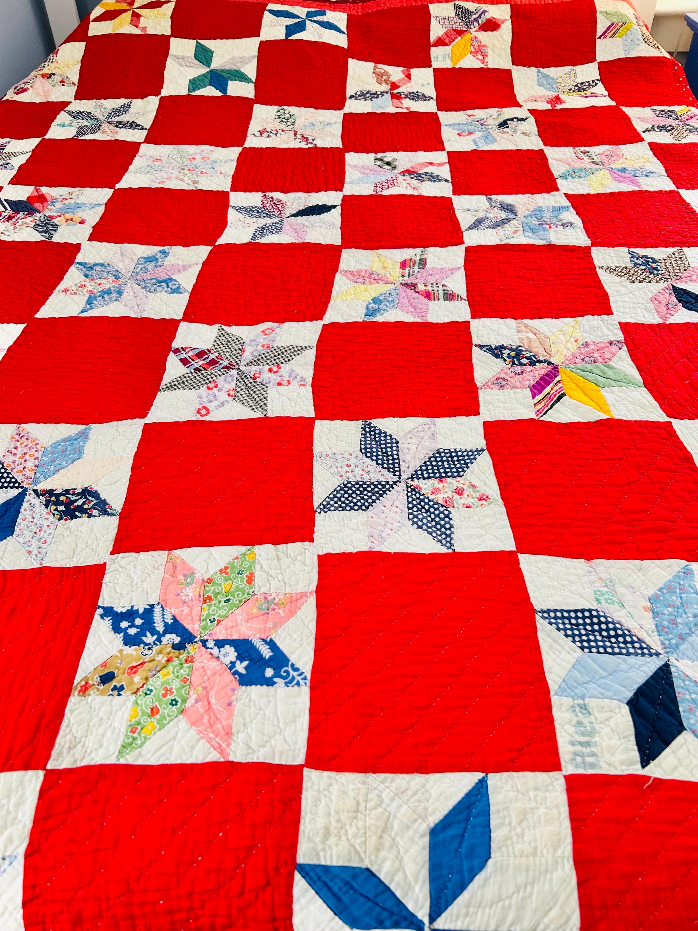 CONDITION: The quilt is in very good vintage condition with some dropped quilting stitches visible in some of the red blocks. PLEASE NOTE: Blue lettering from the feedsacks are visible in some of the star motifs but this is original to the quilt and not considered a condition issue.