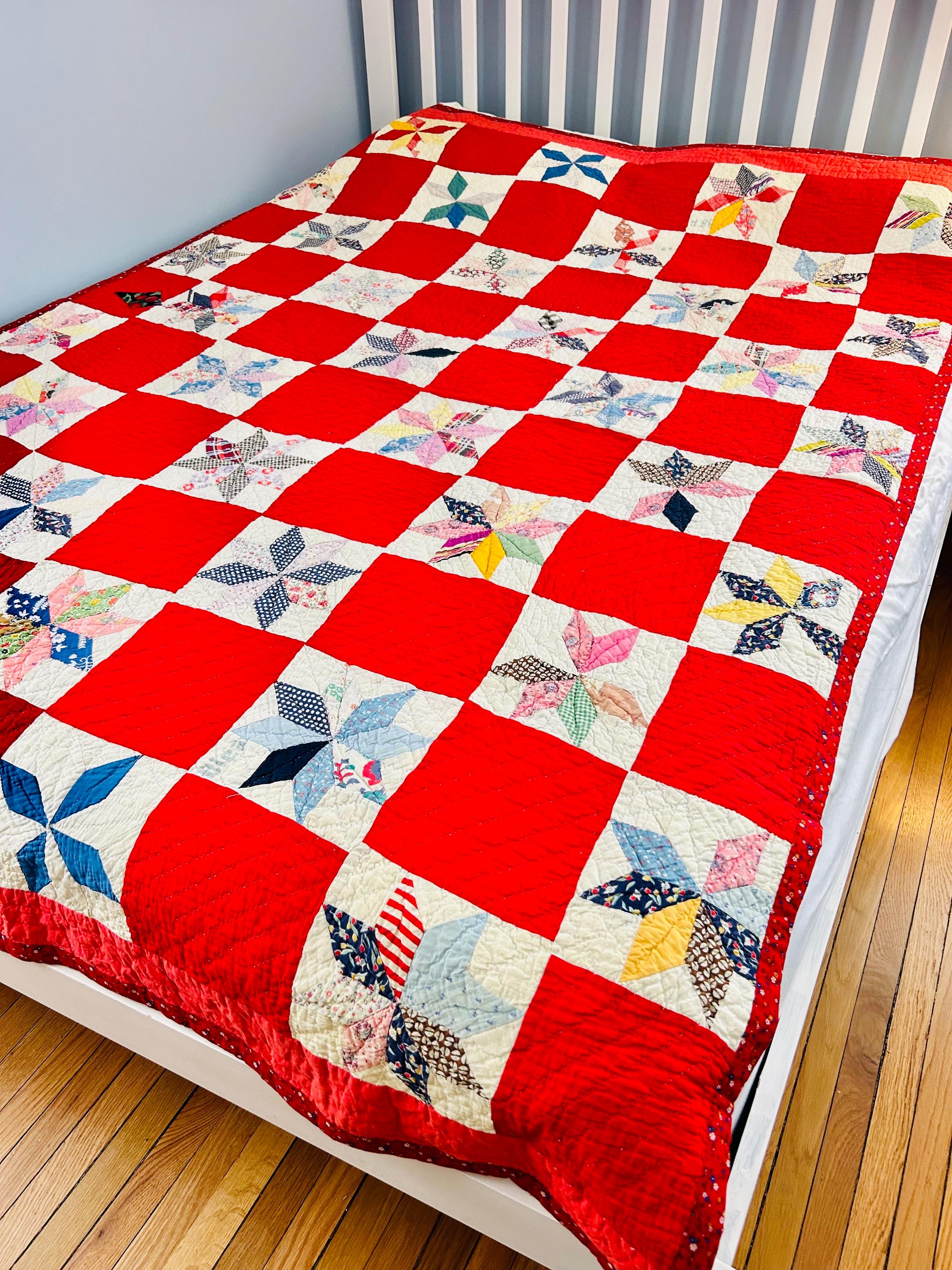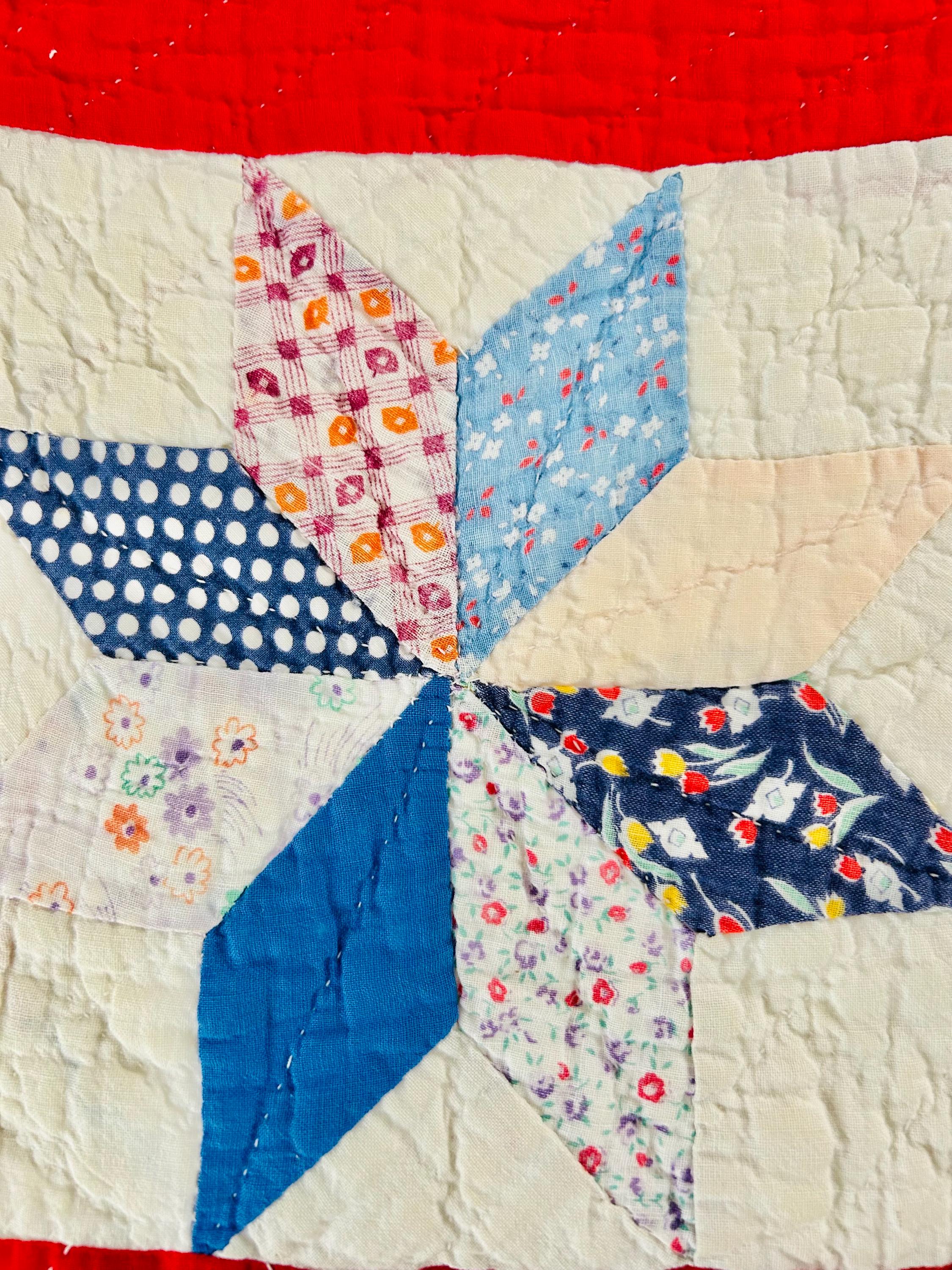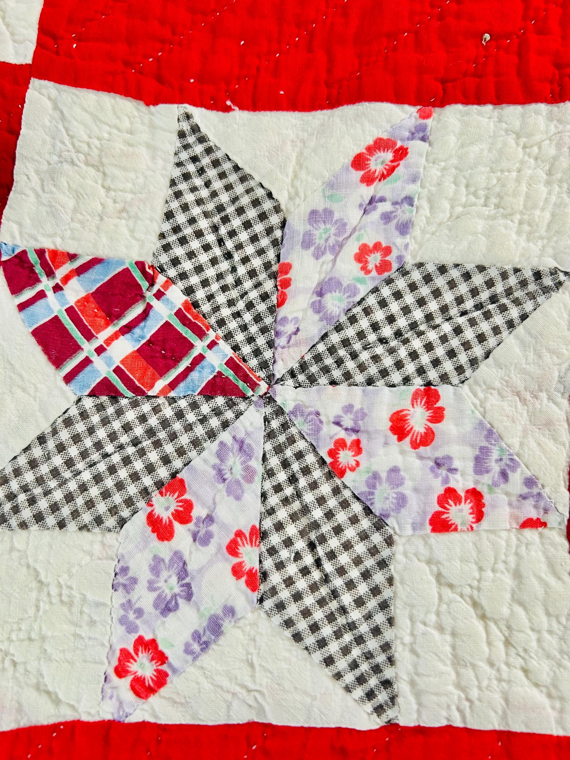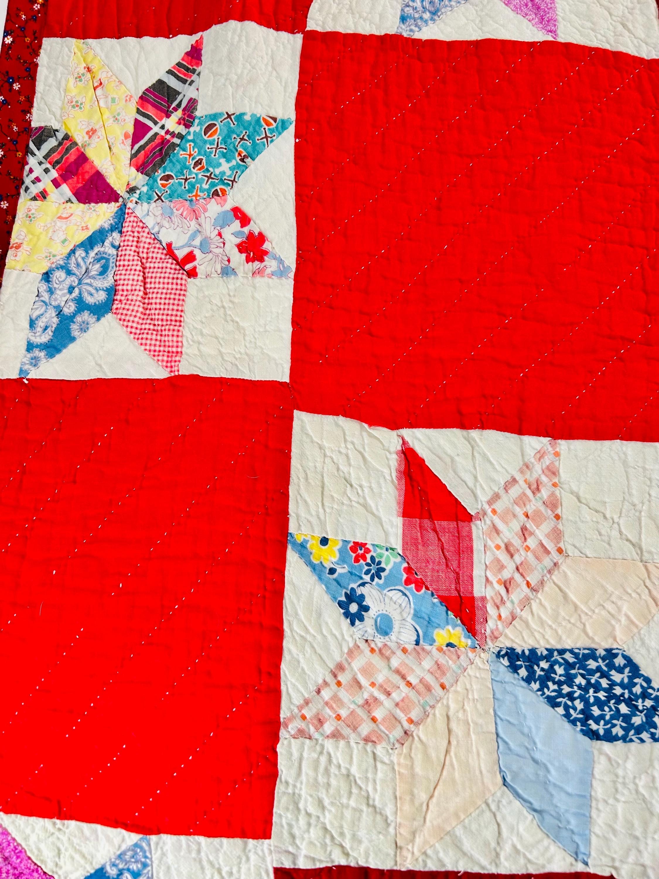 CONDITION: The quilt is in very good vintage condition with some dropped quilting stitches visible in some of the red blocks. PLEASE NOTE: Blue lettering from the feedsacks are visible in some of the star motifs but this is original to the quilt and not considered a condition issue.