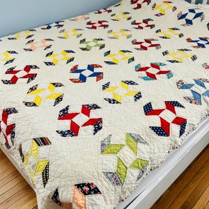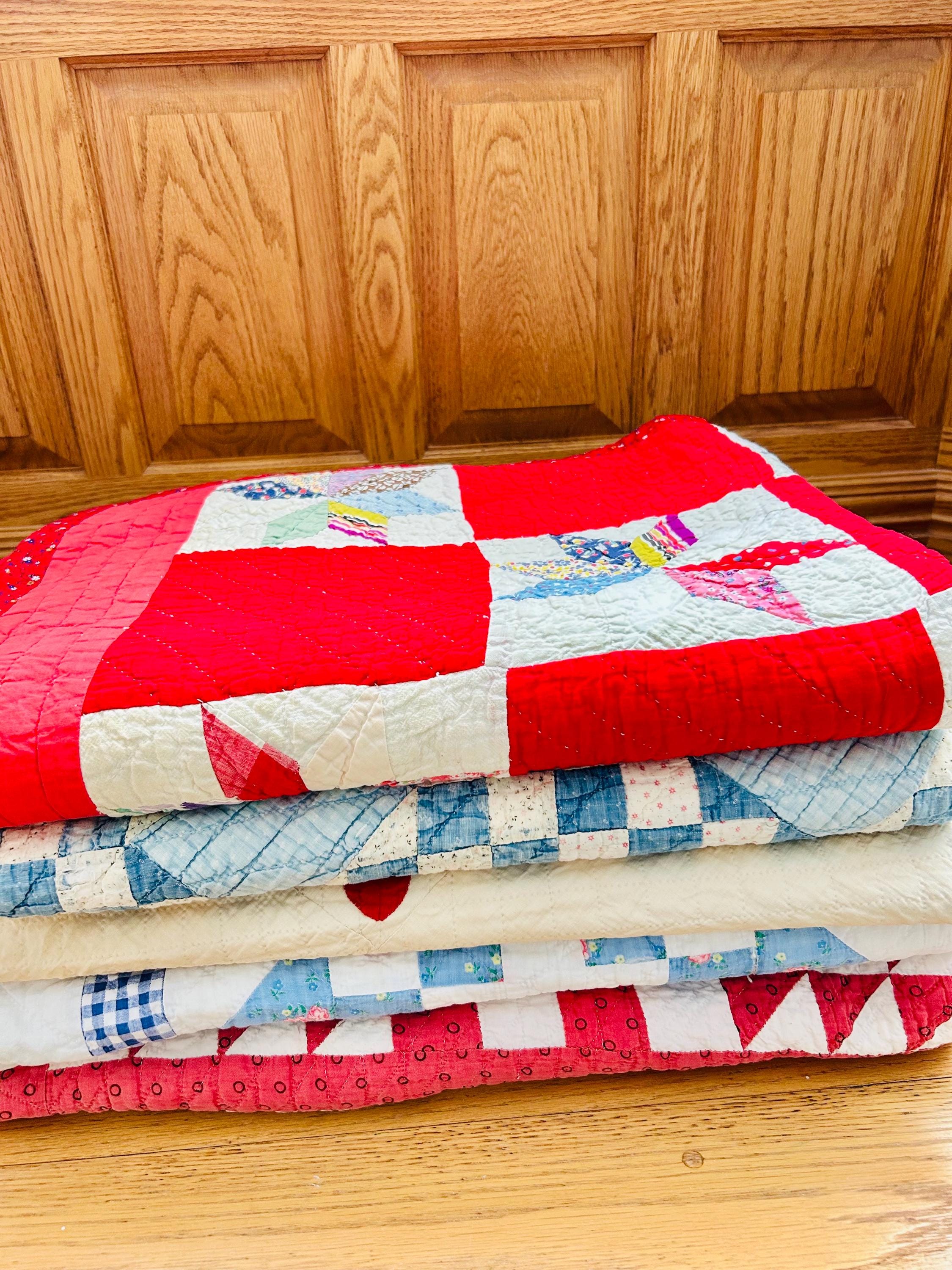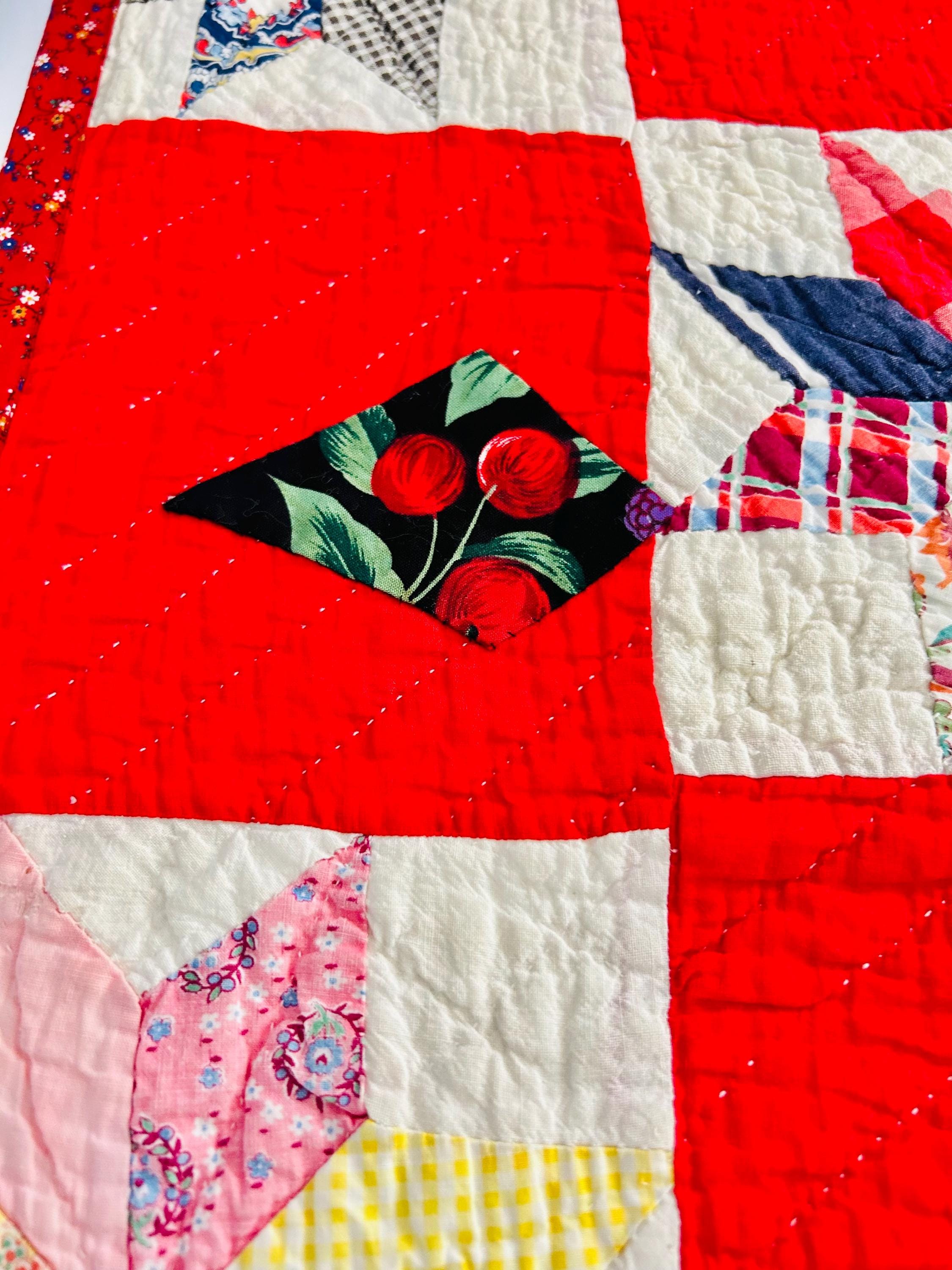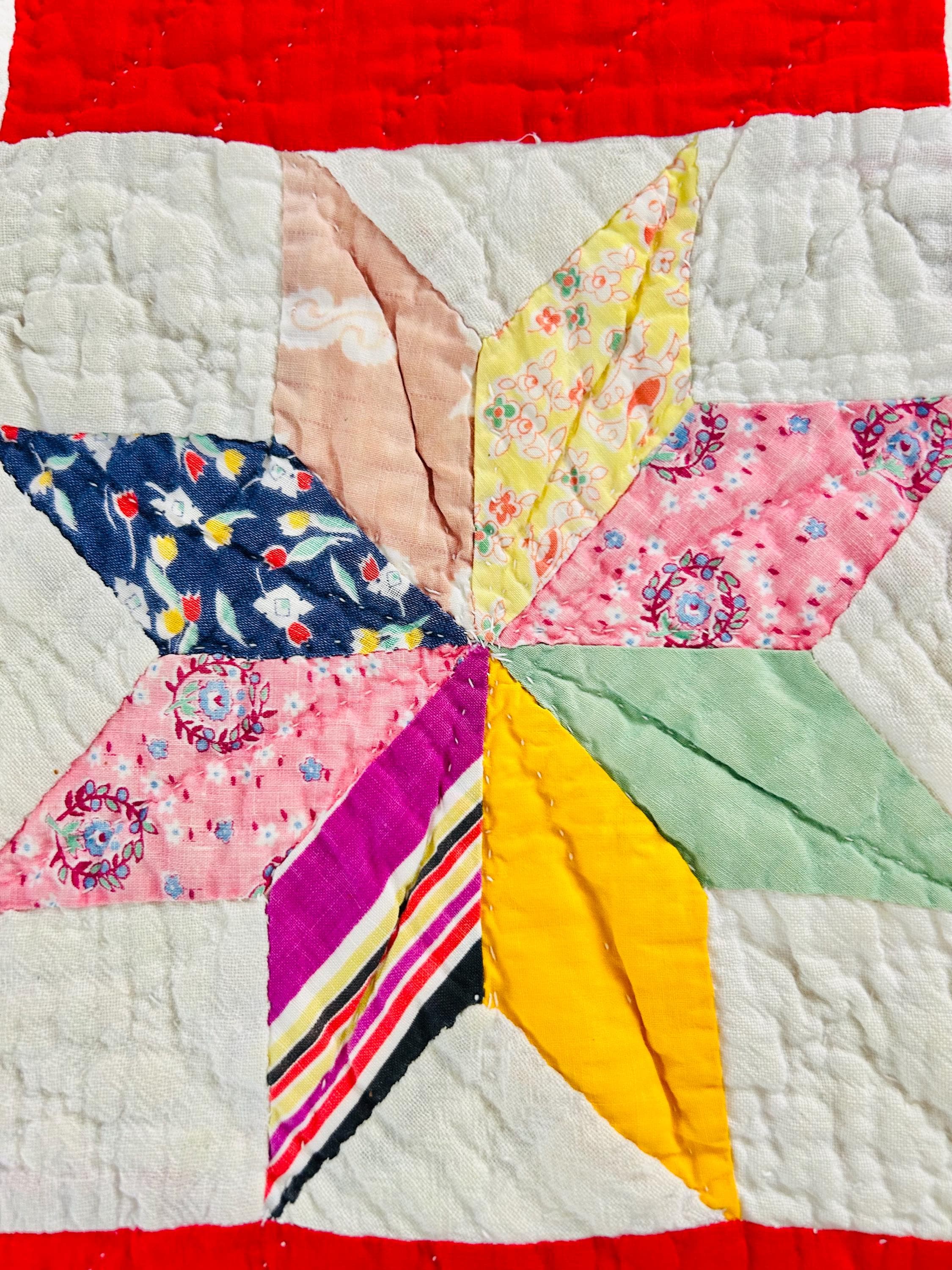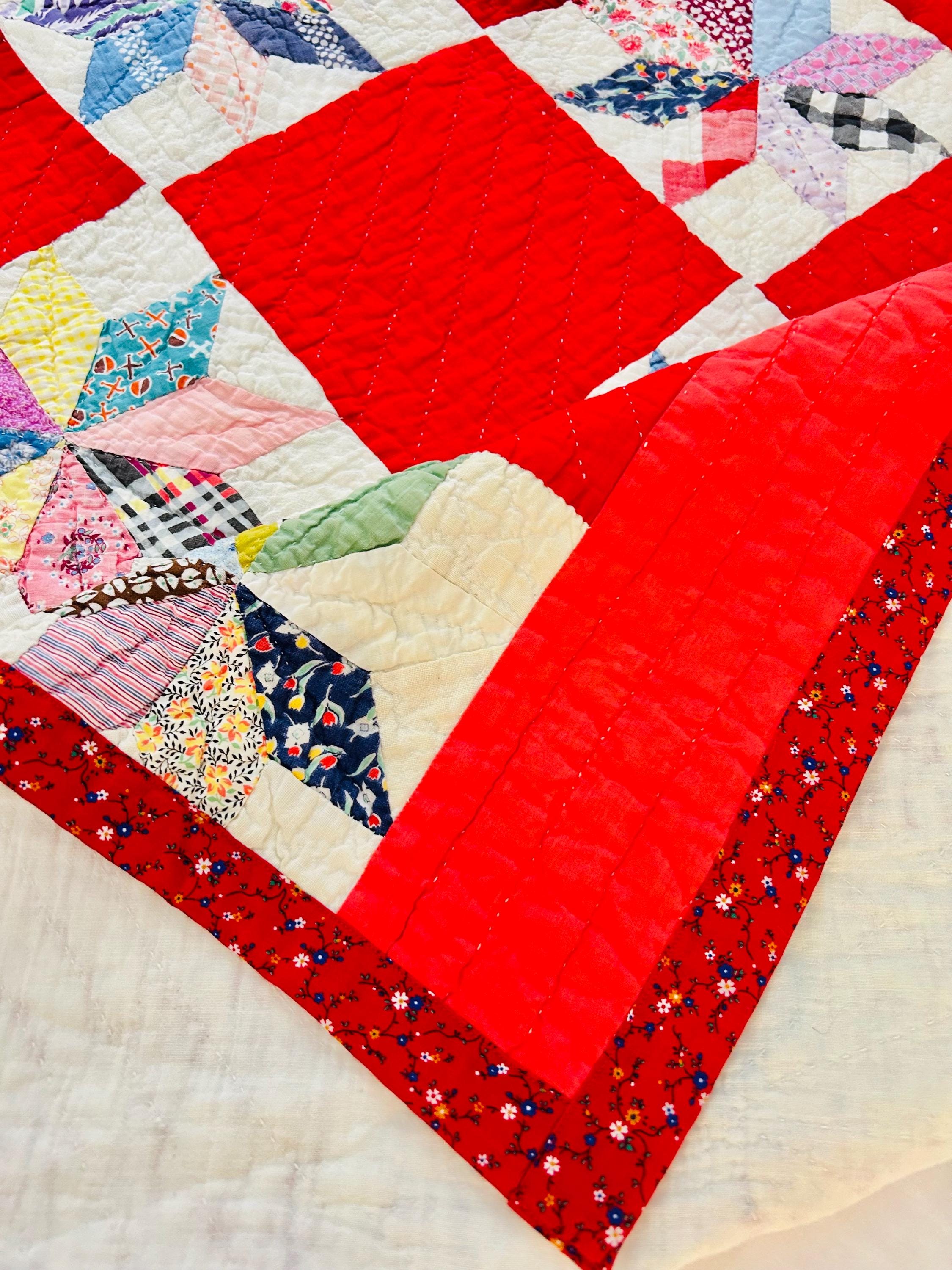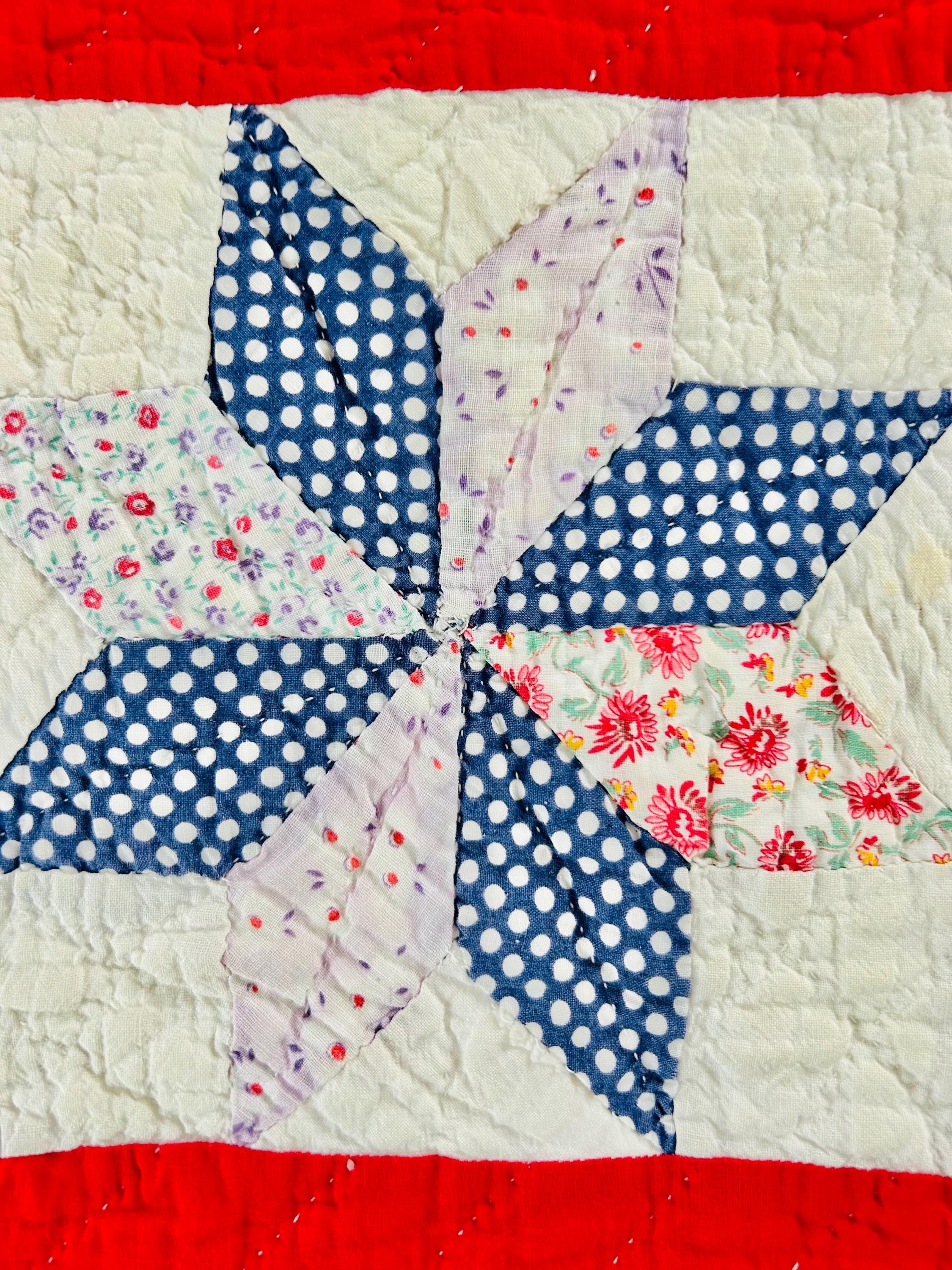 CONDITION: The quilt is in very good vintage condition with some dropped quilting stitches visible in some of the red blocks. PLEASE NOTE: Blue lettering from the feedsacks are visible in some of the star motifs but this is original to the quilt and not considered a condition issue.
