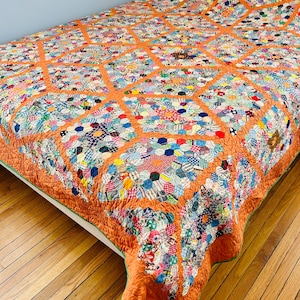 The quilt is from a smoke-free, pet-free home and is pictured on a queen-size bed.