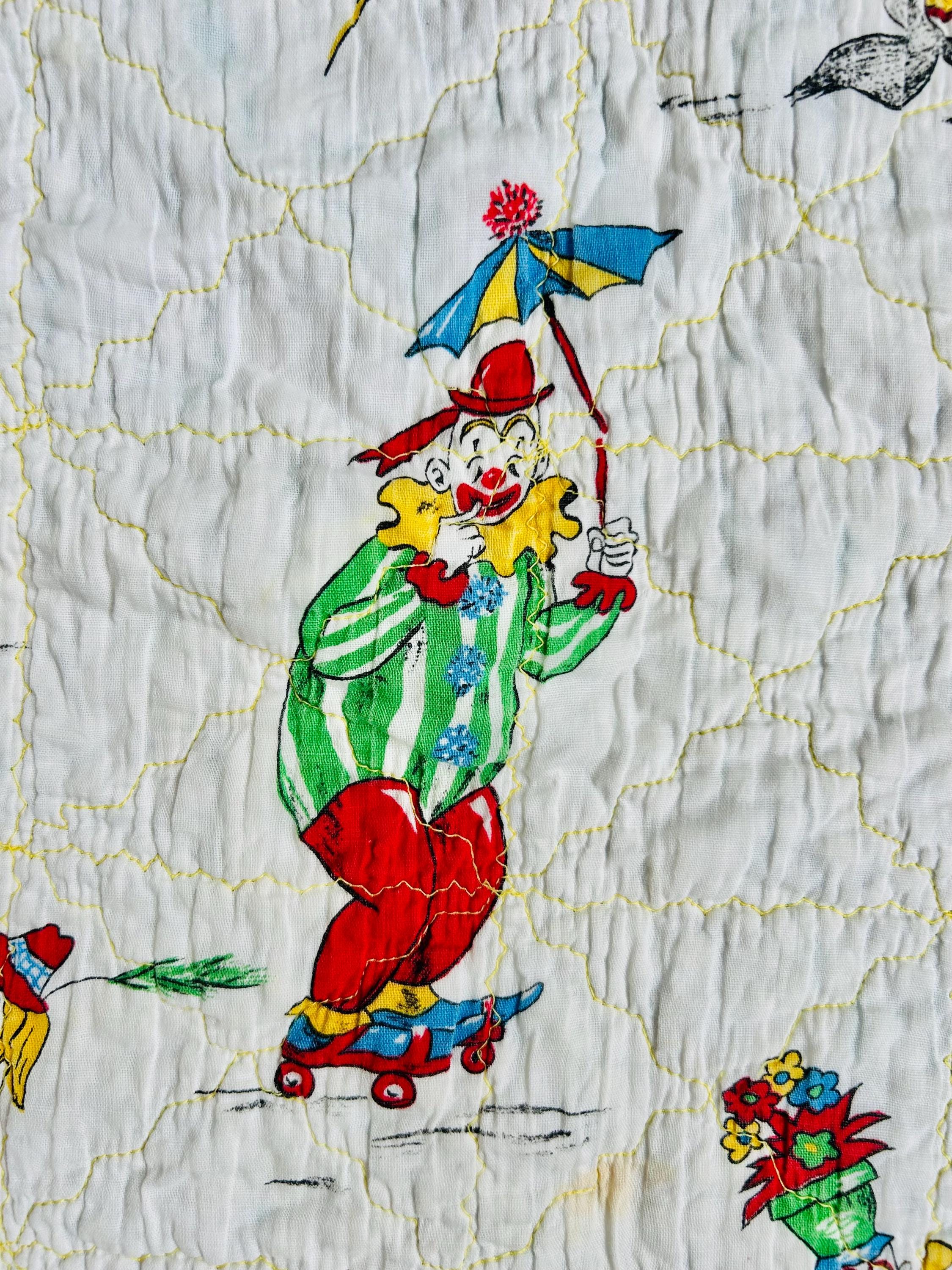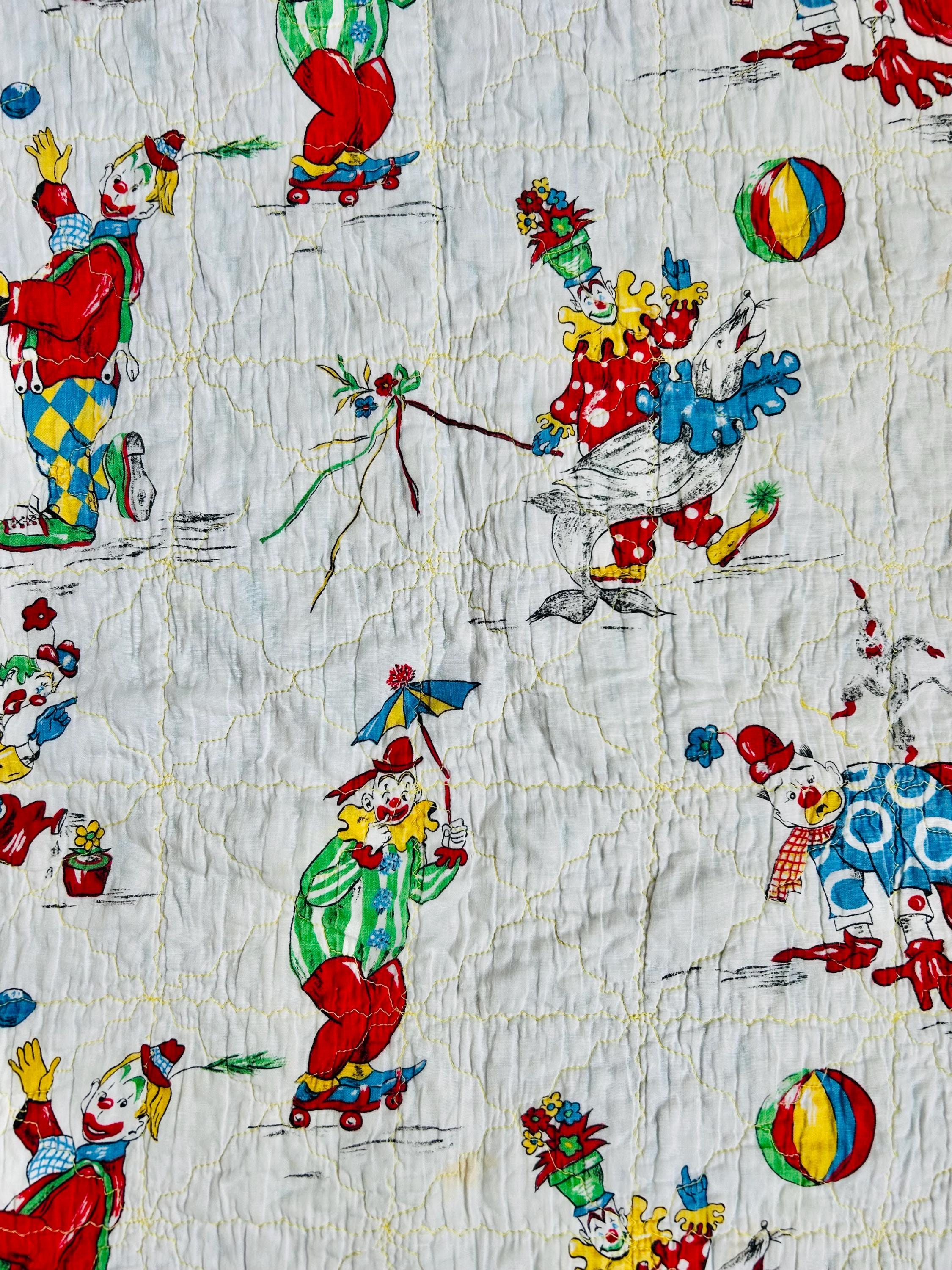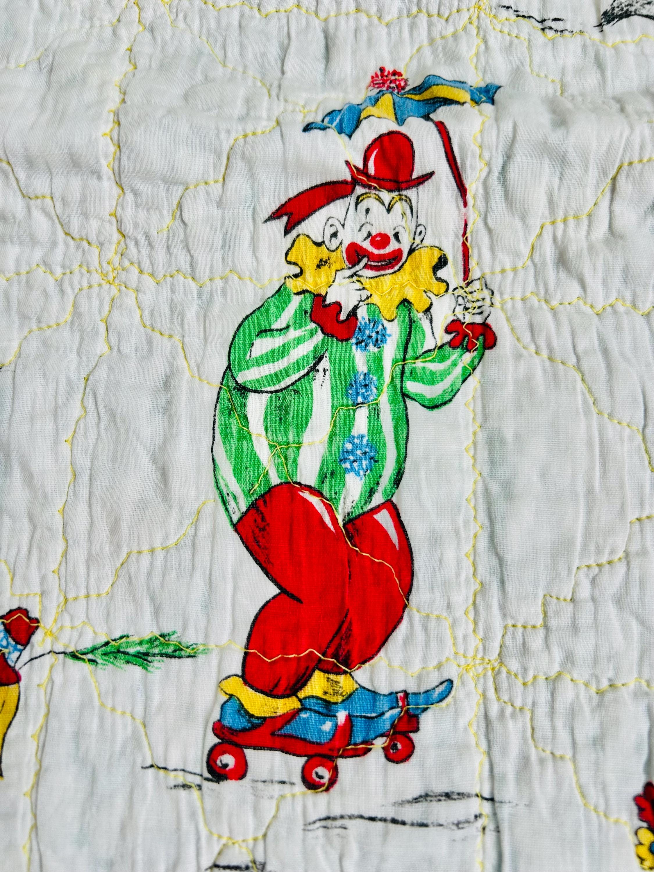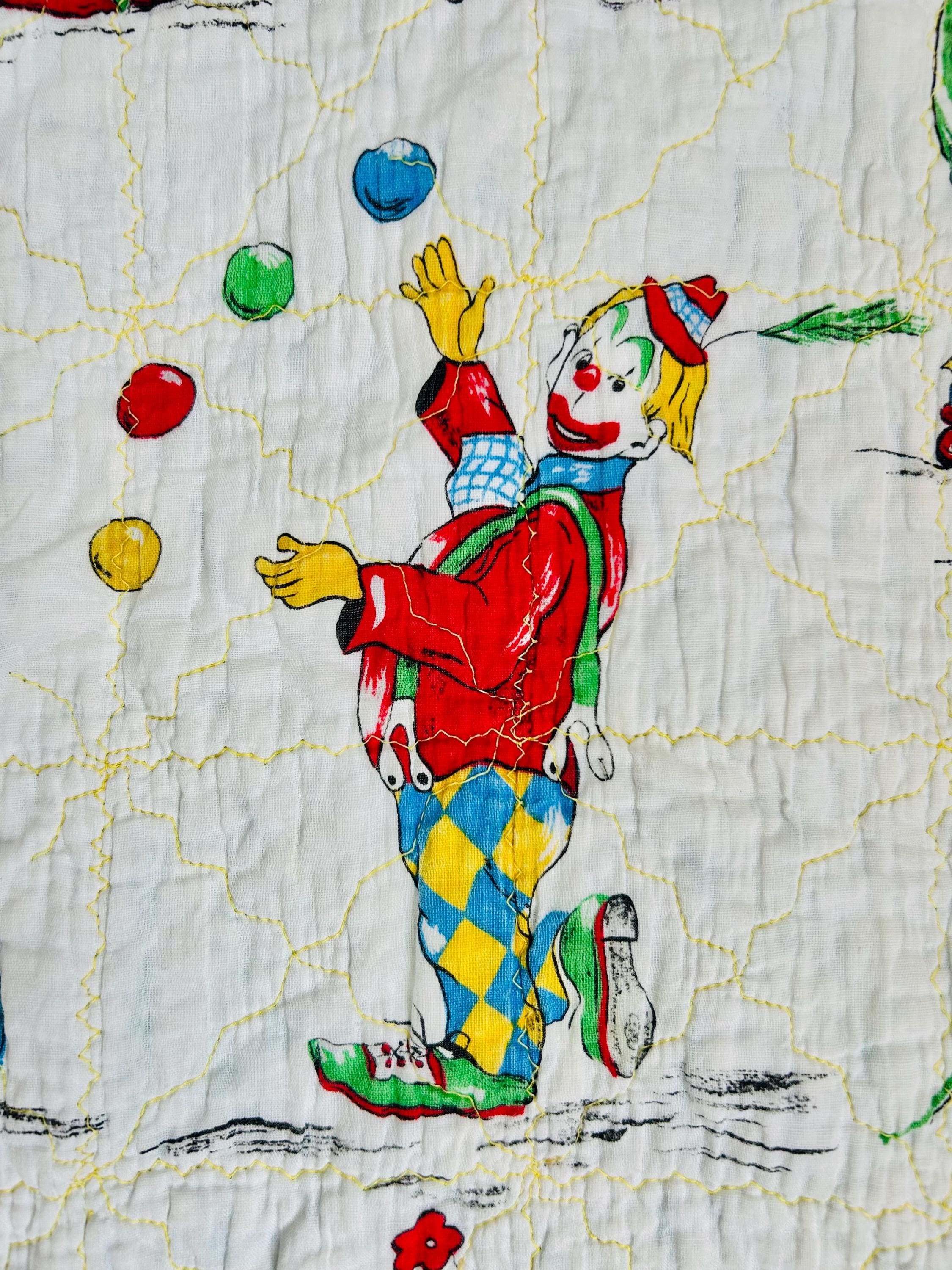 This cheerful mid-century crib-size quilt features a lively allover print of clowns juggling, dancing, and performing clownish antics. The central fabric is a classic novelty print from the postwar era with bright, saturated colors and cartoon figures that were popular in children’s fabrics of the late 1940s through the 1950s. The machine quilting is an all over meandering pattern.