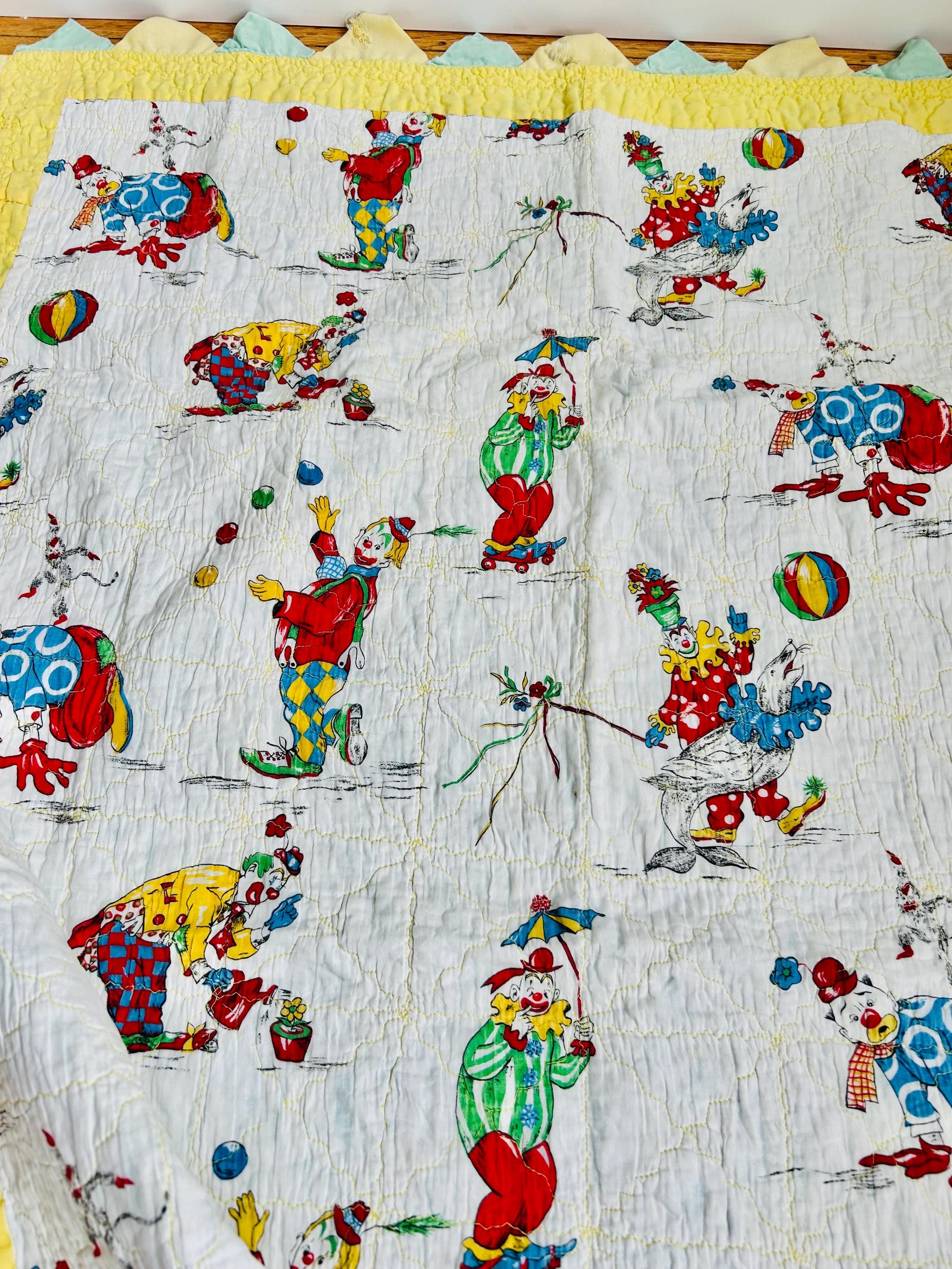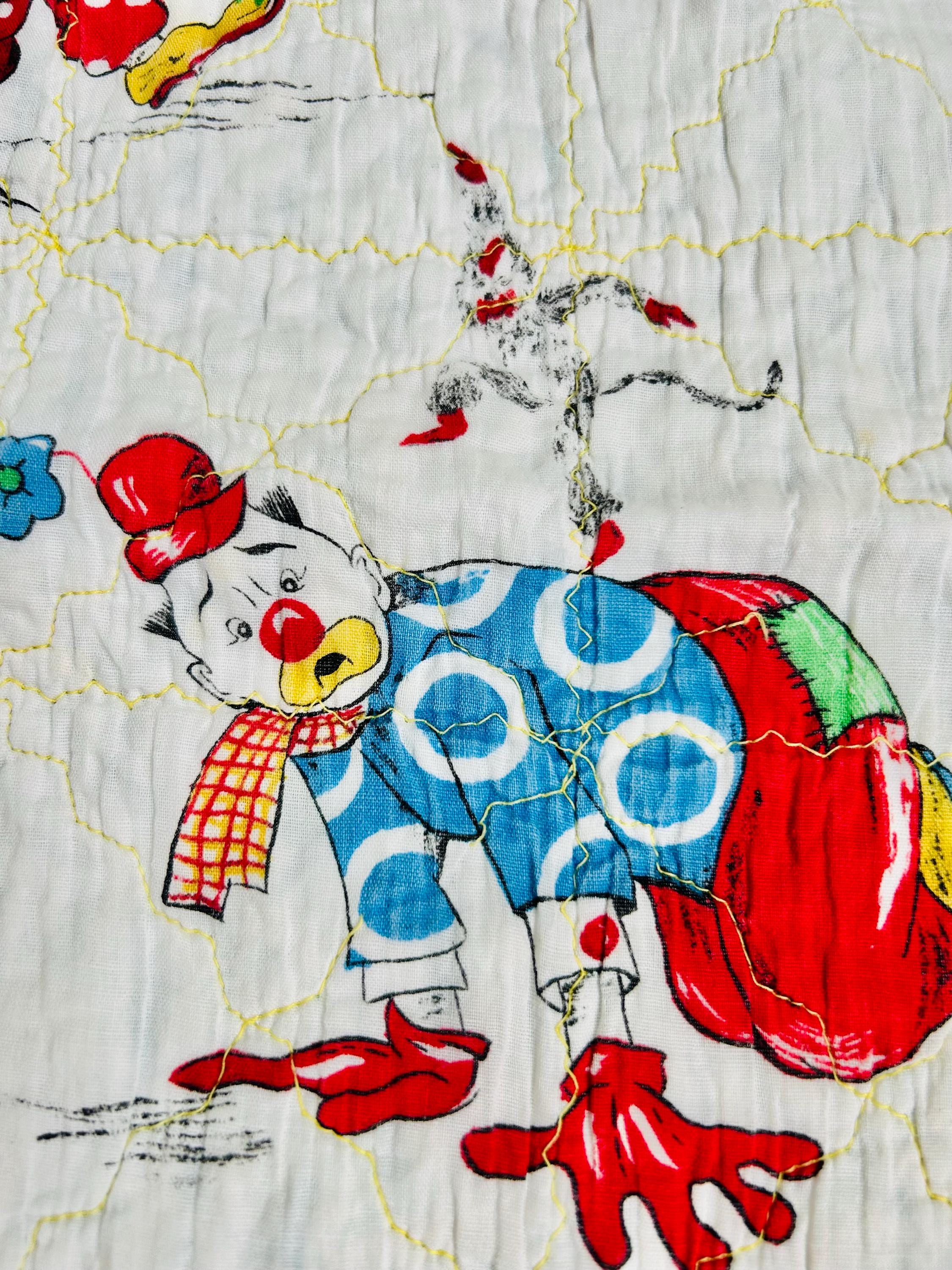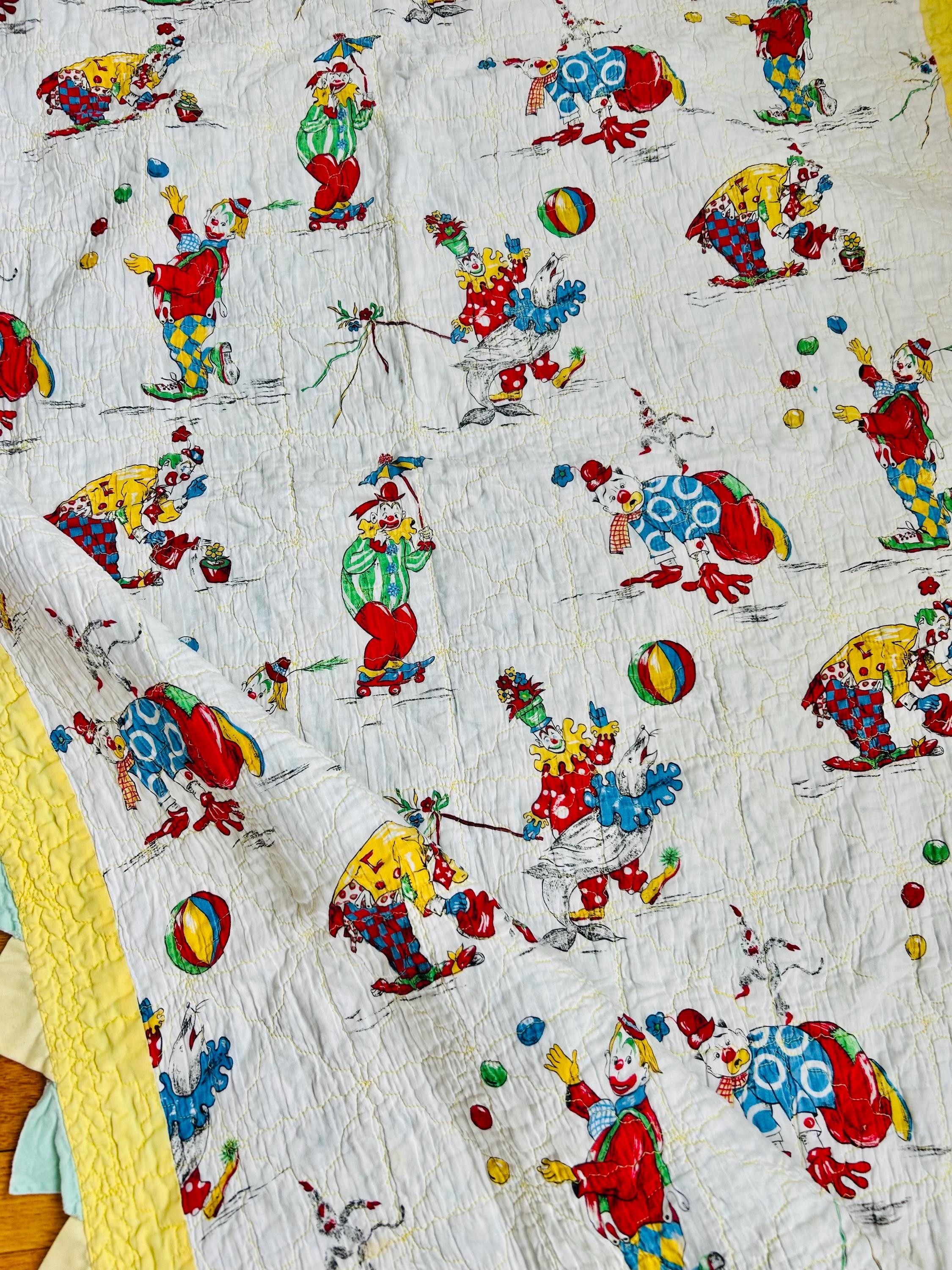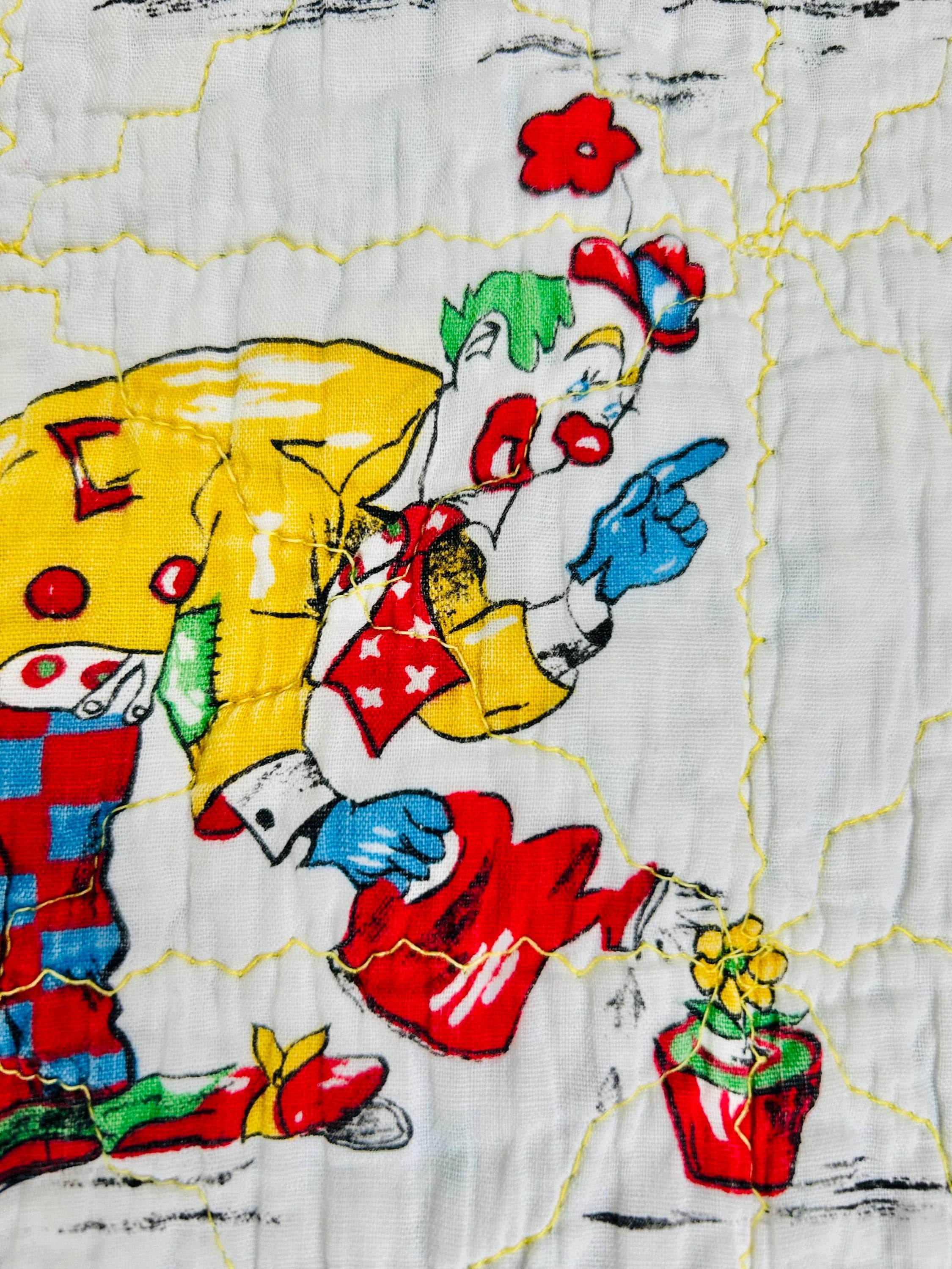 This cheerful mid-century crib-size quilt features a lively allover print of clowns juggling, dancing, and performing clownish antics. The central fabric is a classic novelty print from the postwar era with bright, saturated colors and cartoon figures that were popular in children’s fabrics of the late 1940s through the 1950s. The machine quilting is an all over meandering pattern.