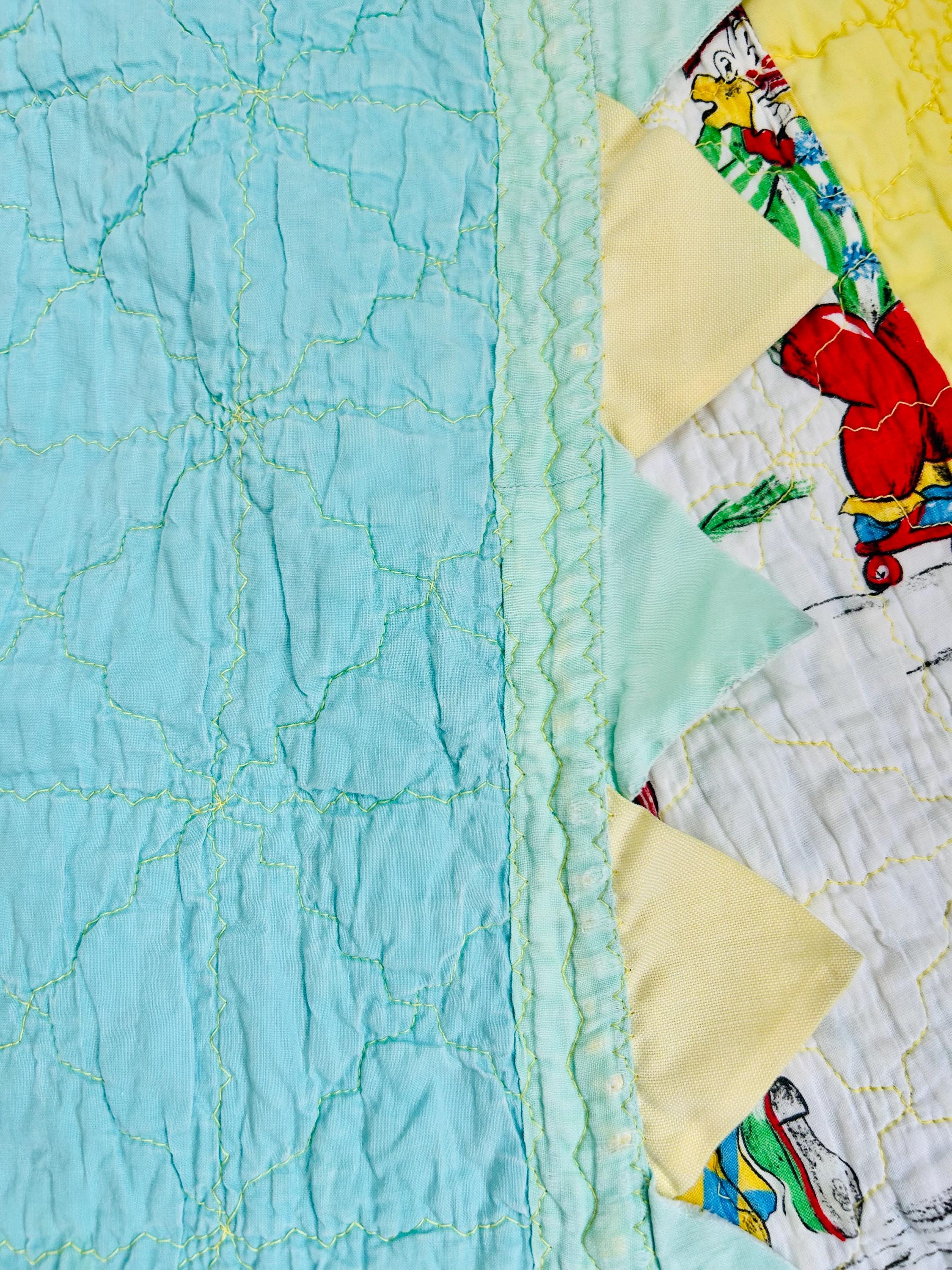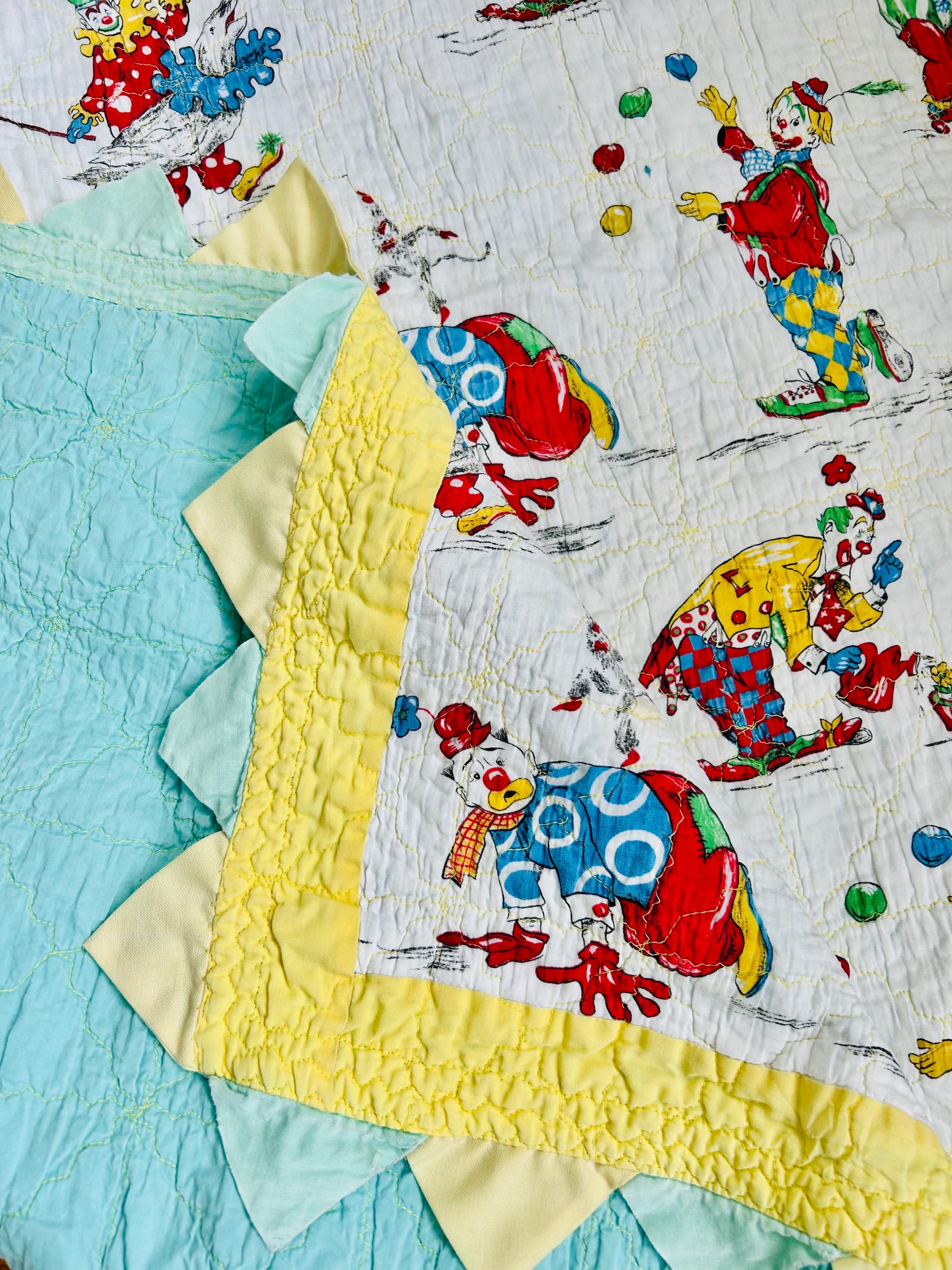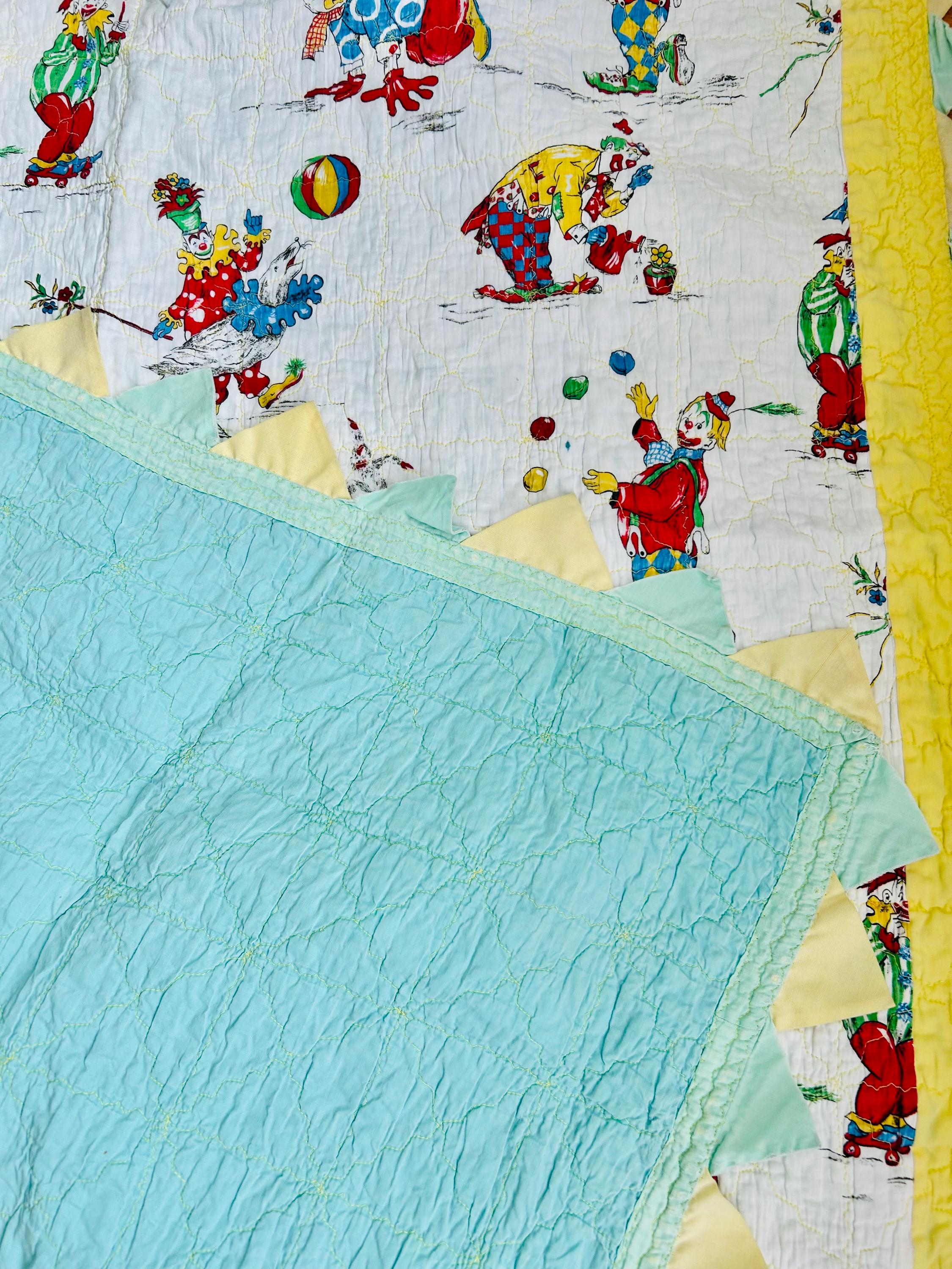 Details: • Date: Circa 1950s • Size: 39” x 55 ½” • Materials: Cotton fabrics, cotton batting • Construction: Machine quilted • Design: Circus clown novelty print with prairie point border • Colors: Red, yellow, blue, green on white with pastel yellow and aqua borders • Backing: Solid aqua cotton
