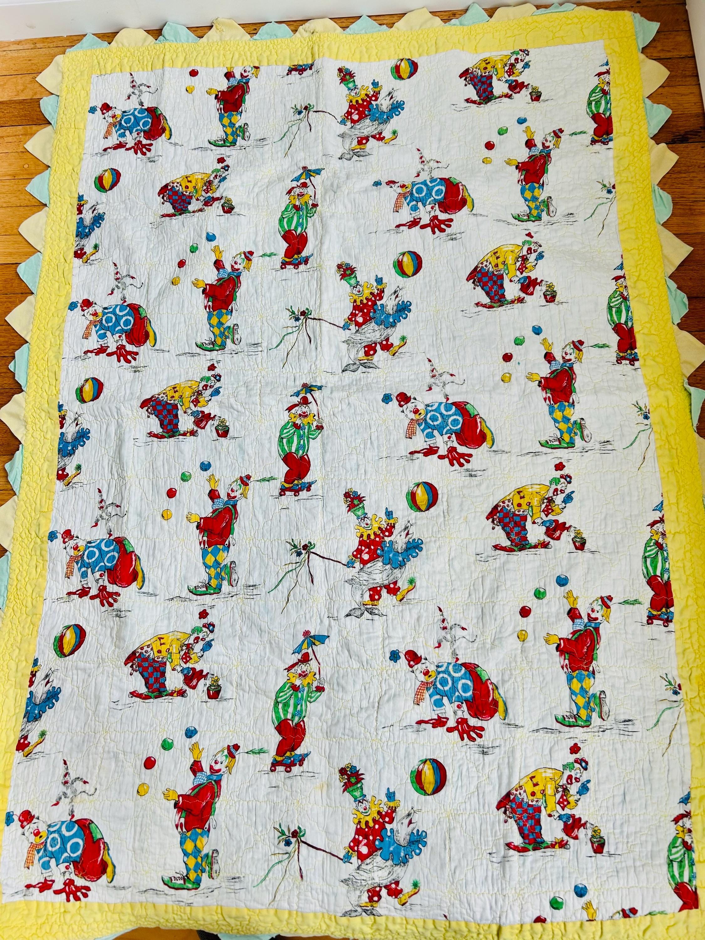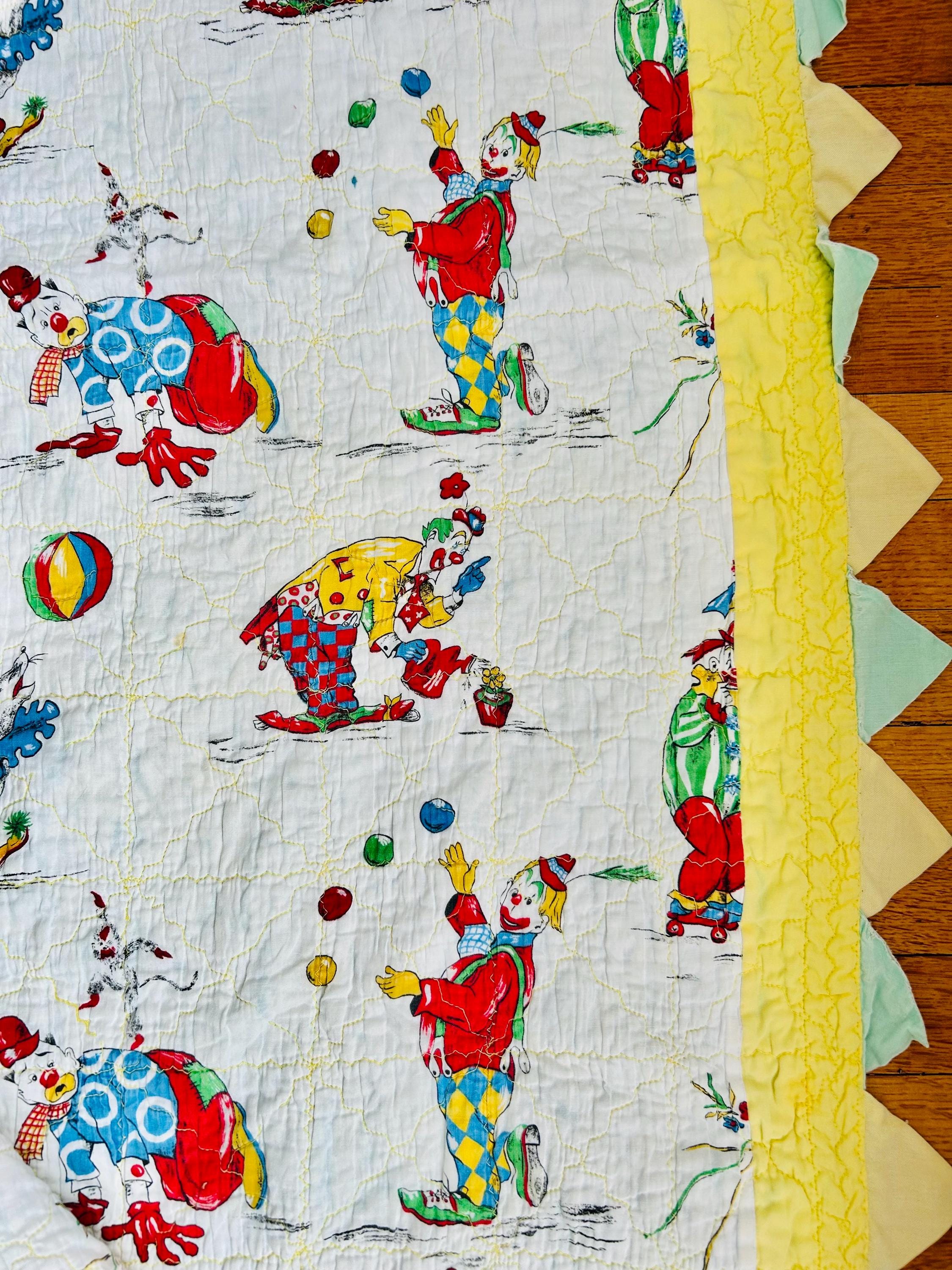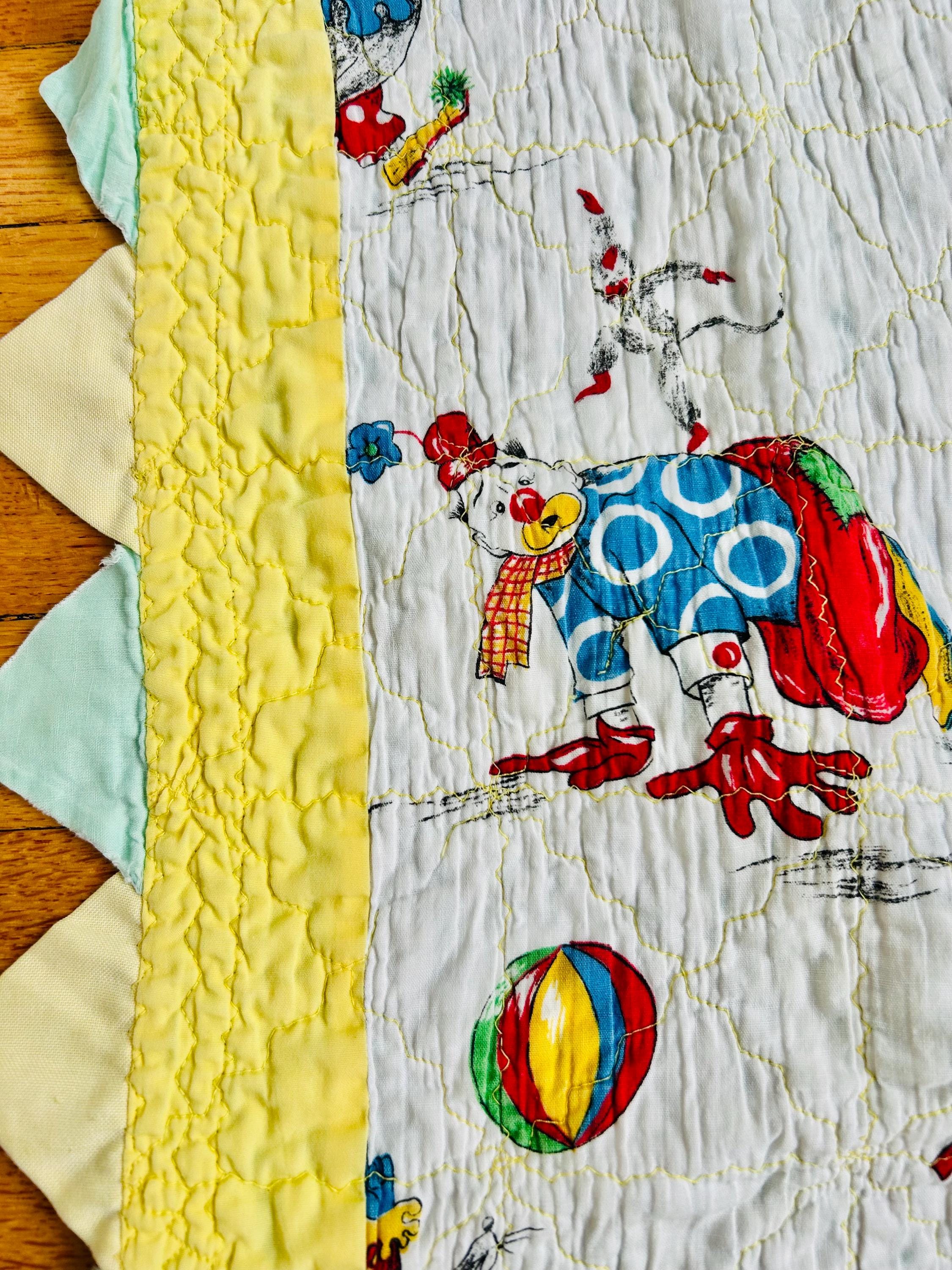 Details: • Date: Circa 1950s • Size: 39” x 55 ½” • Materials: Cotton fabrics, cotton batting • Construction: Machine quilted • Design: Circus clown novelty print with prairie point border • Colors: Red, yellow, blue, green on white with pastel yellow and aqua borders • Backing: Solid aqua cotton