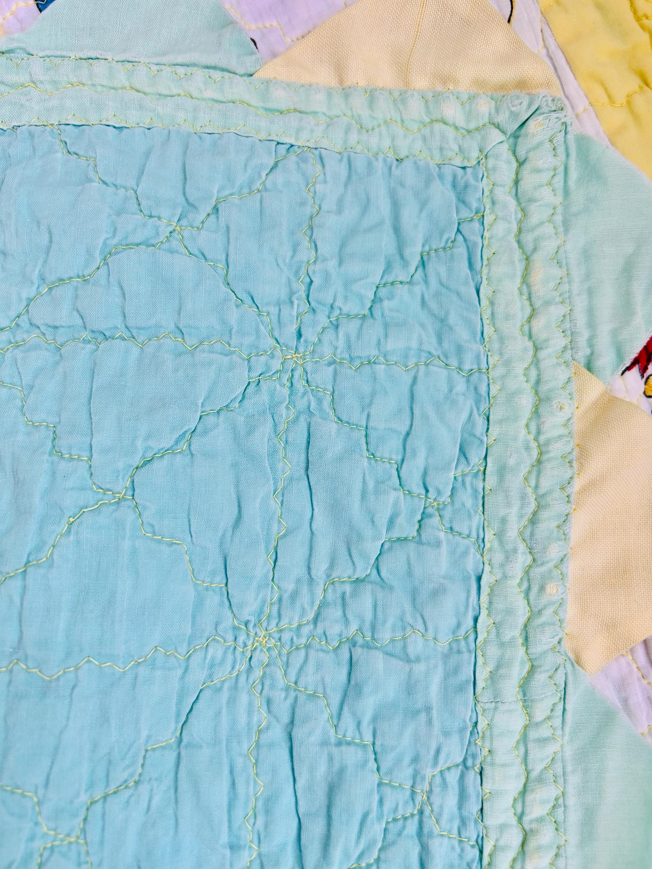 A soft yellow border frames the print, finished with prairie points in alternating pastel yellow and aqua. The back is aqua cotton and the cotton batting is very lightweight.