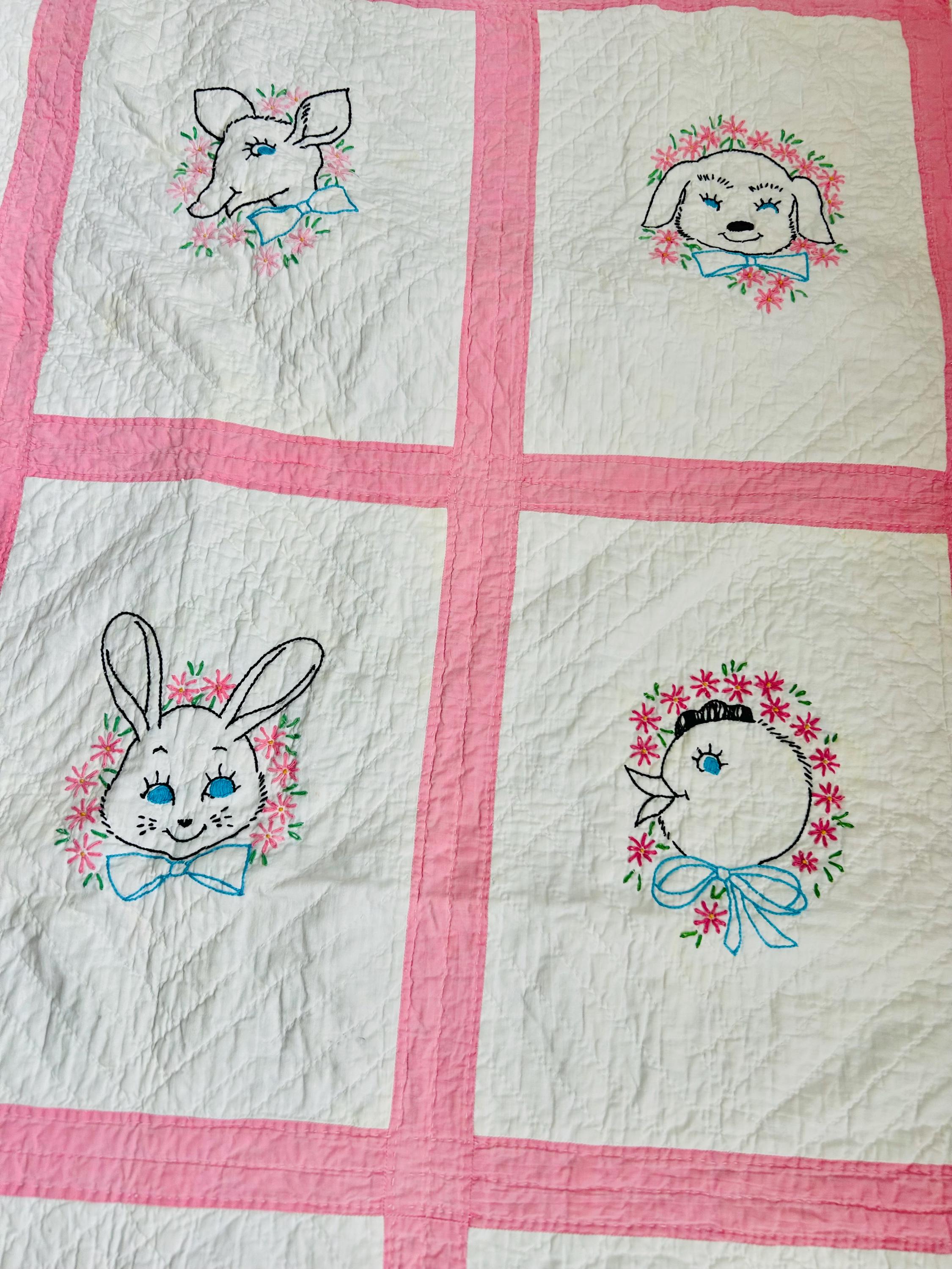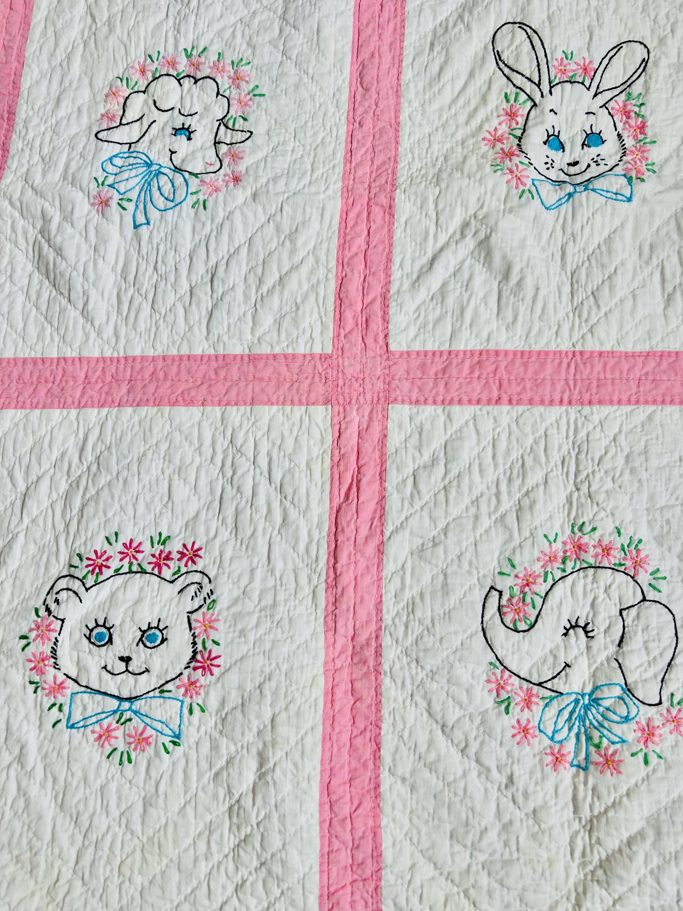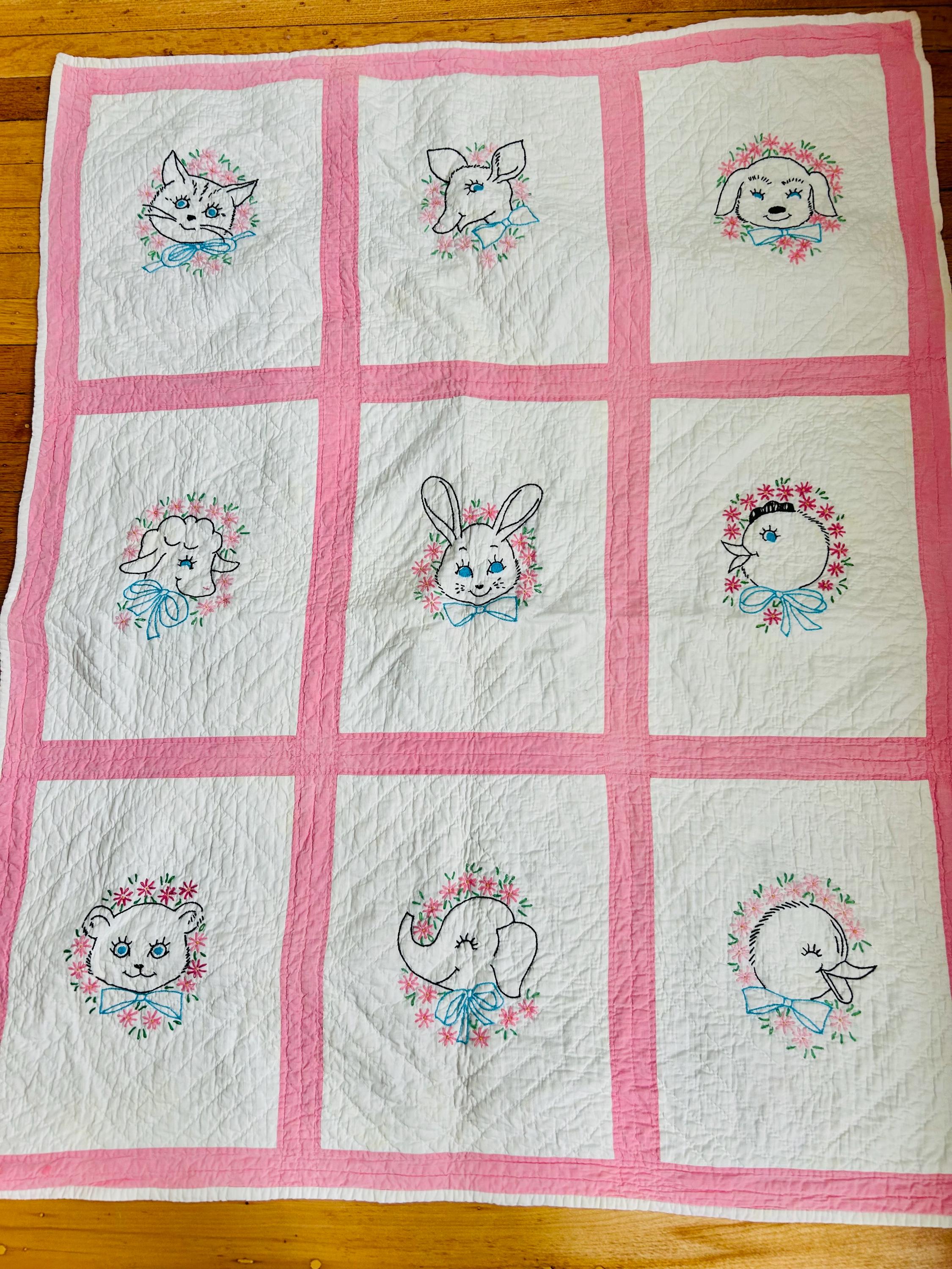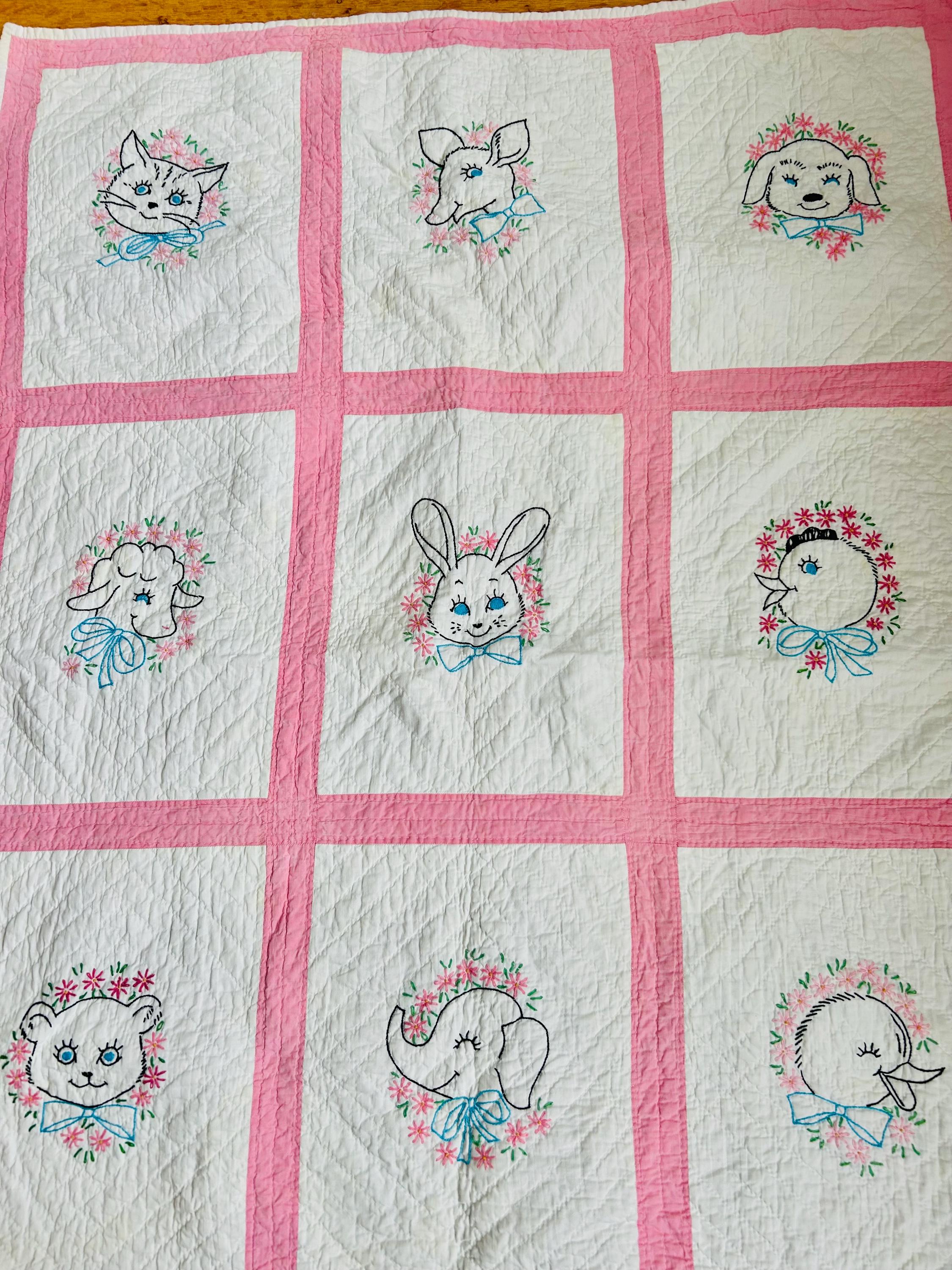This is an absolutely charming vintage crib quilt dating to the early 1940s and featuring nine hand-embroidered nursery animal blocks, each framed by pink sashing. Each block showcases a different animal—bunny, lamb, kitten, elephant, duck, and more—stitched by hand in classic outline embroidery with cheerful pastel accents. The hand quilting is expertly done in diagonal grids.