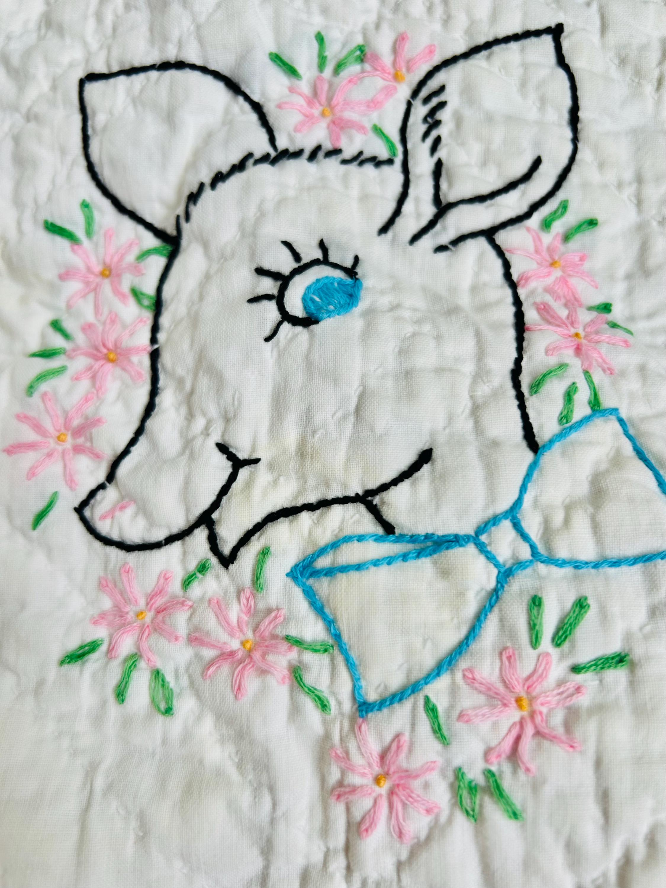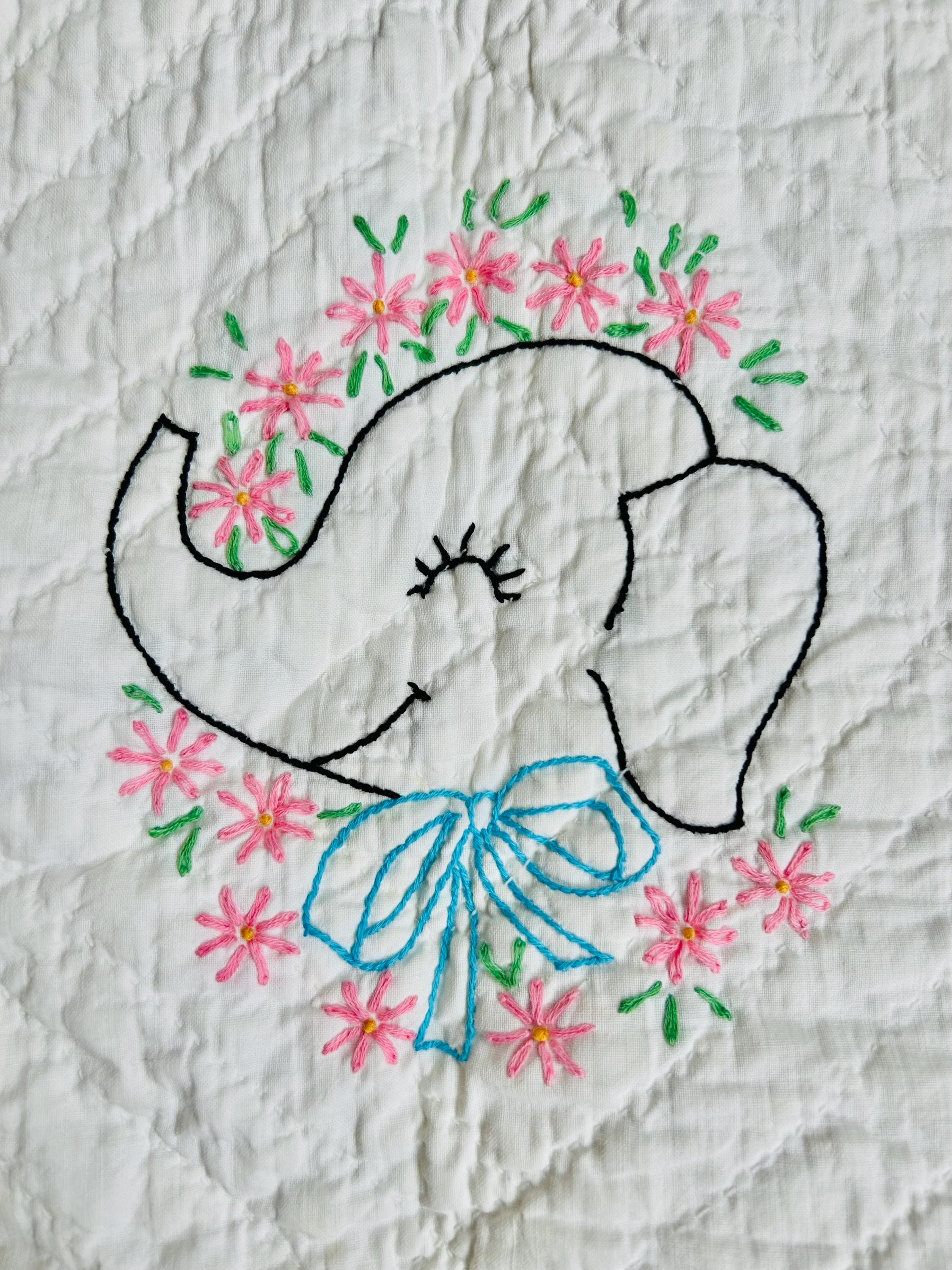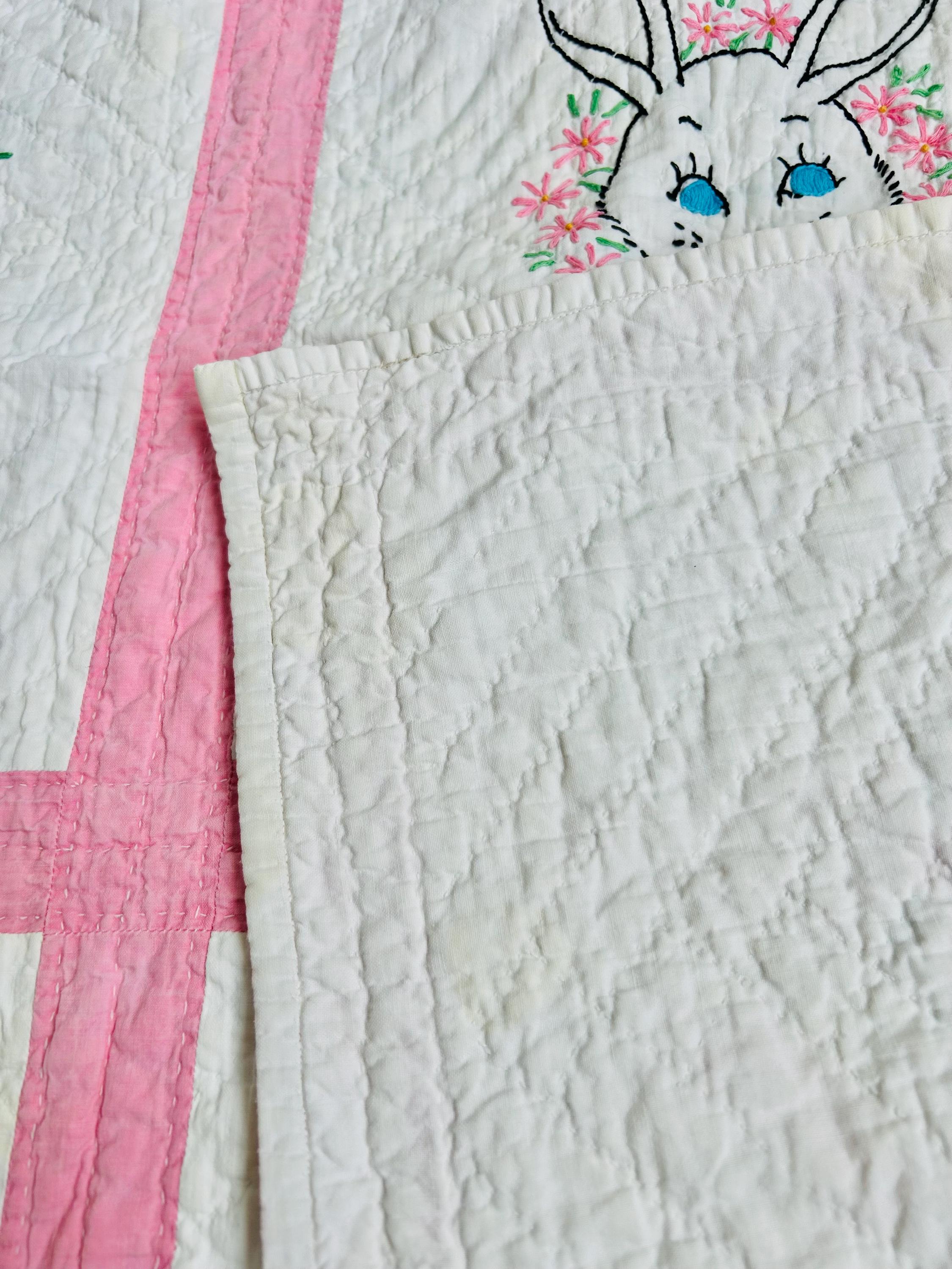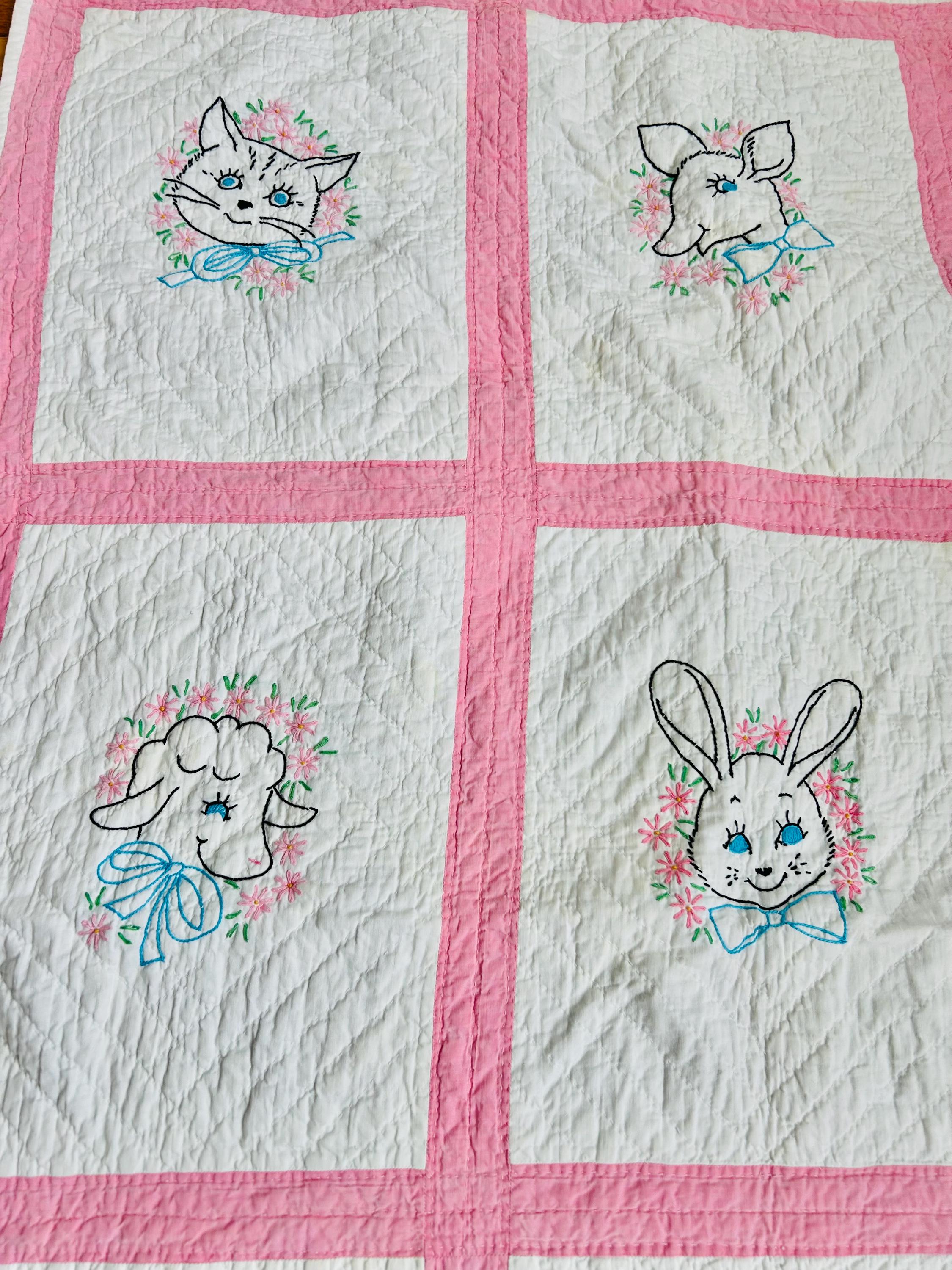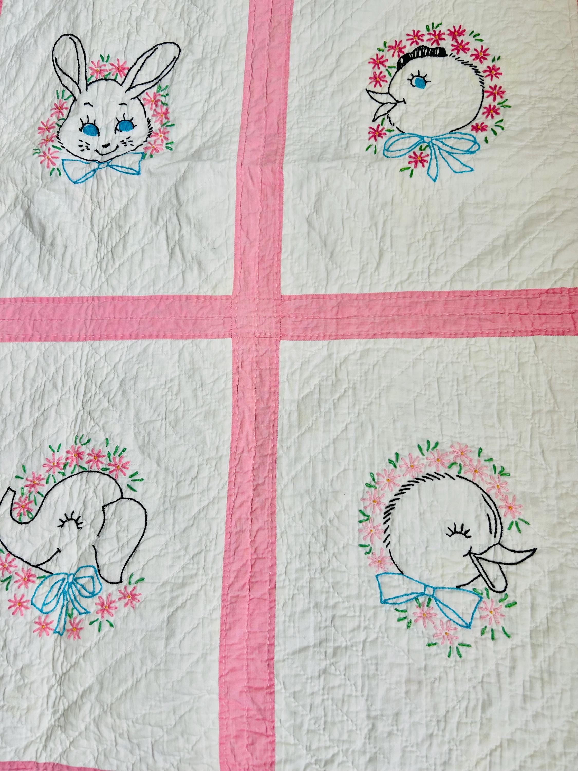 This is an absolutely charming vintage crib quilt dating to the early 1940s and featuring nine hand-embroidered nursery animal blocks, each framed by pink sashing. Each block showcases a different animal—bunny, lamb, kitten, elephant, duck, and more—stitched by hand in classic outline embroidery with cheerful pastel accents. The hand quilting is expertly done in diagonal grids.