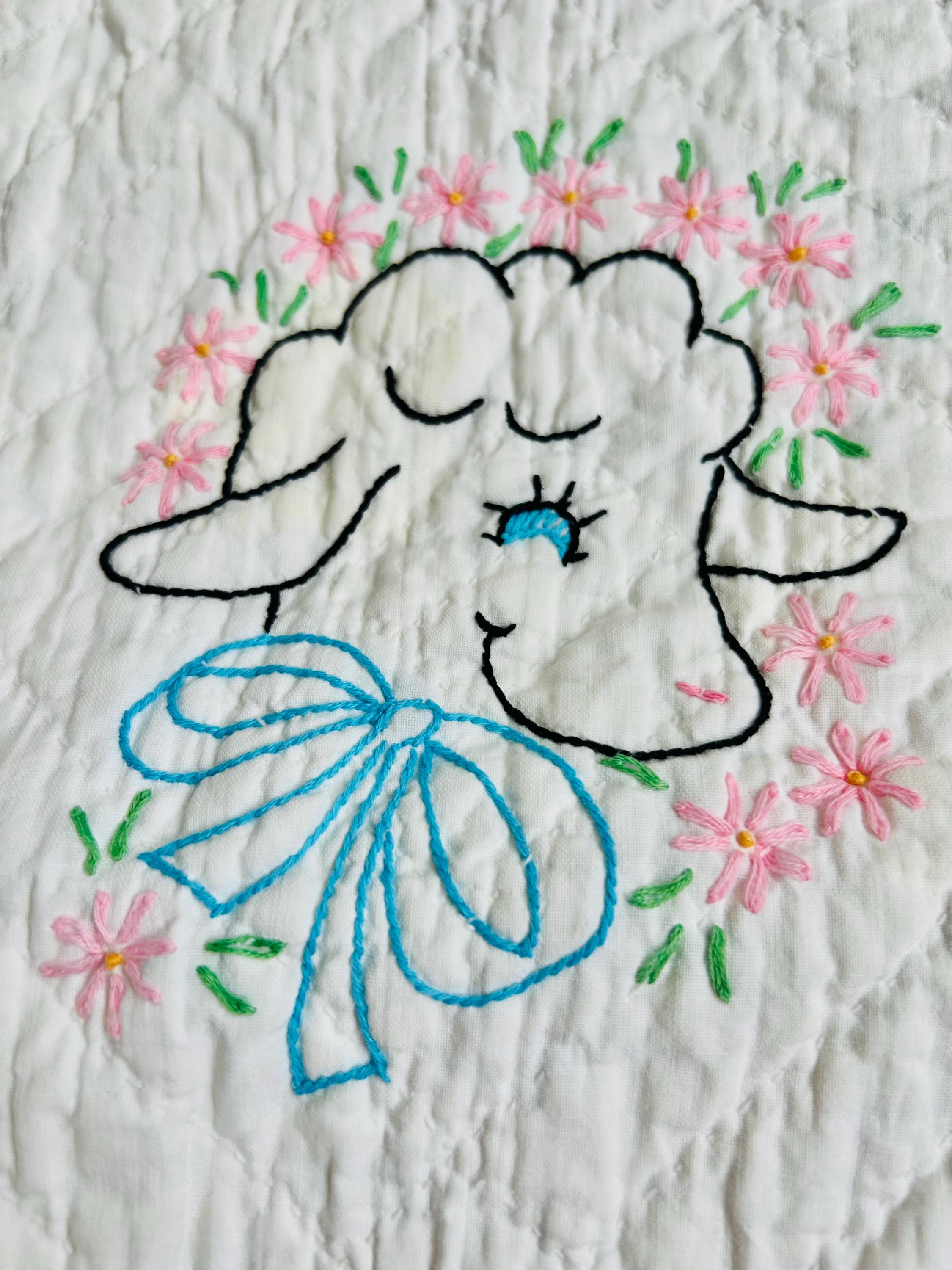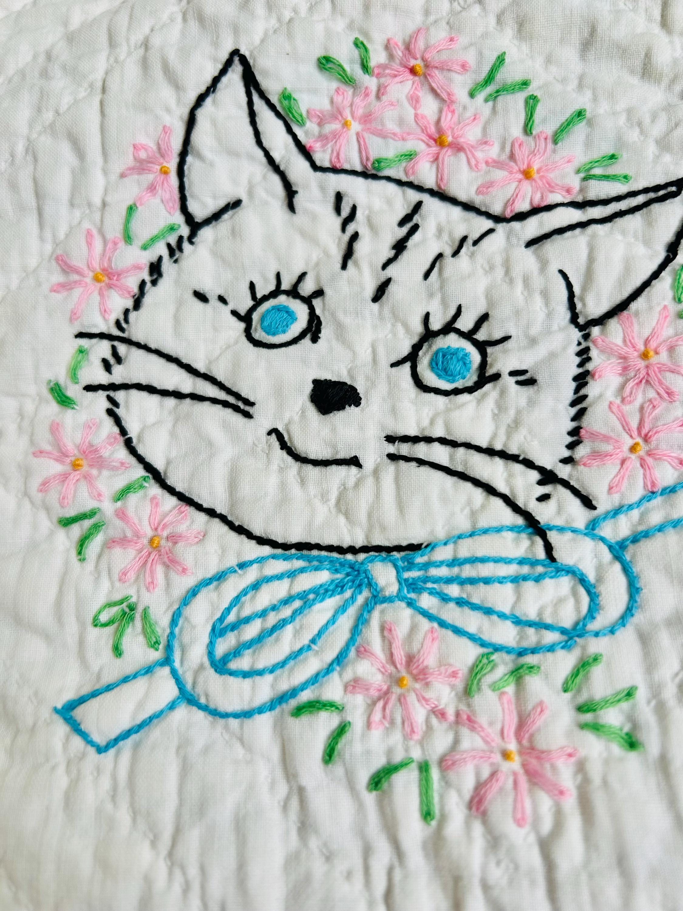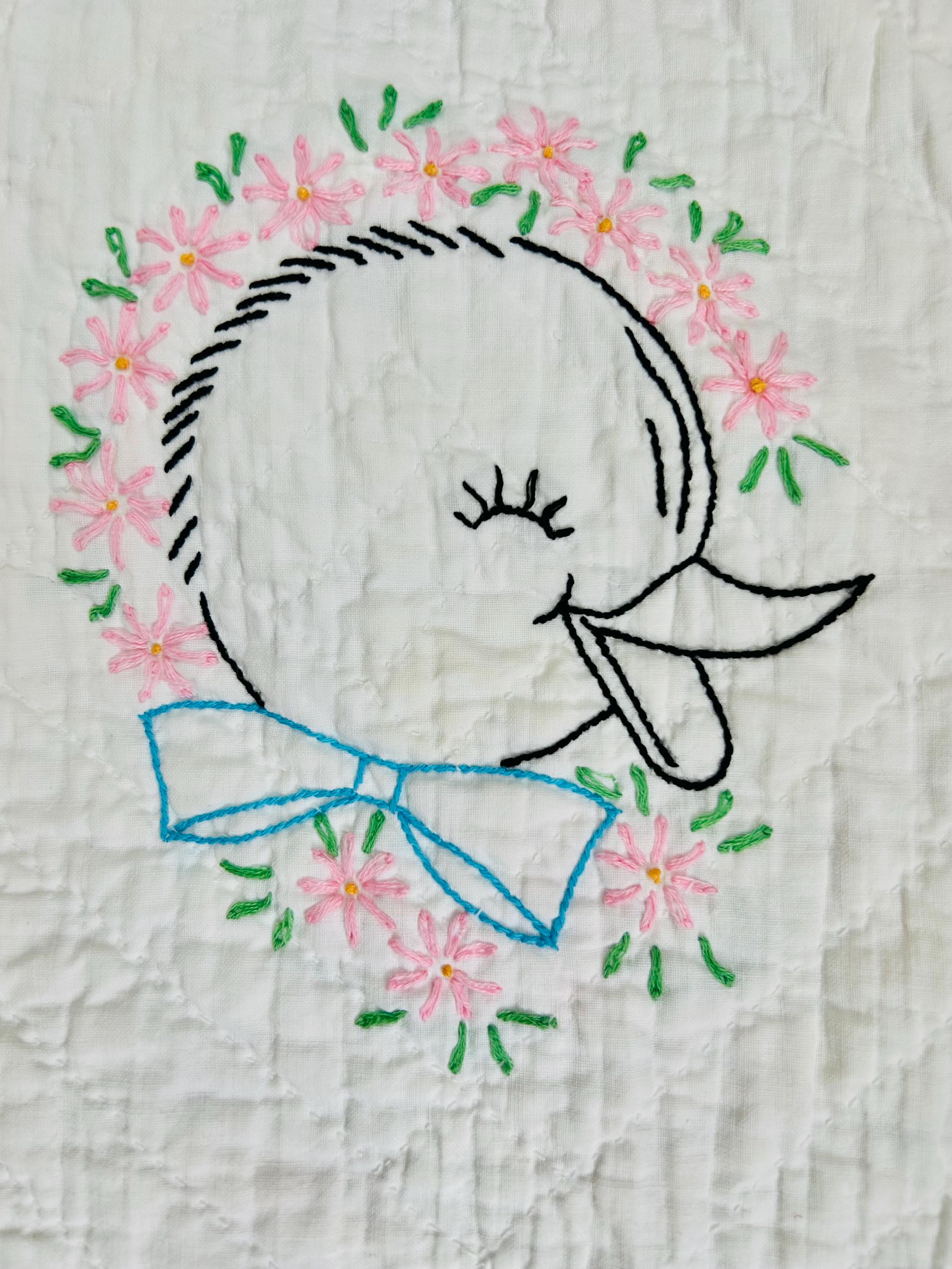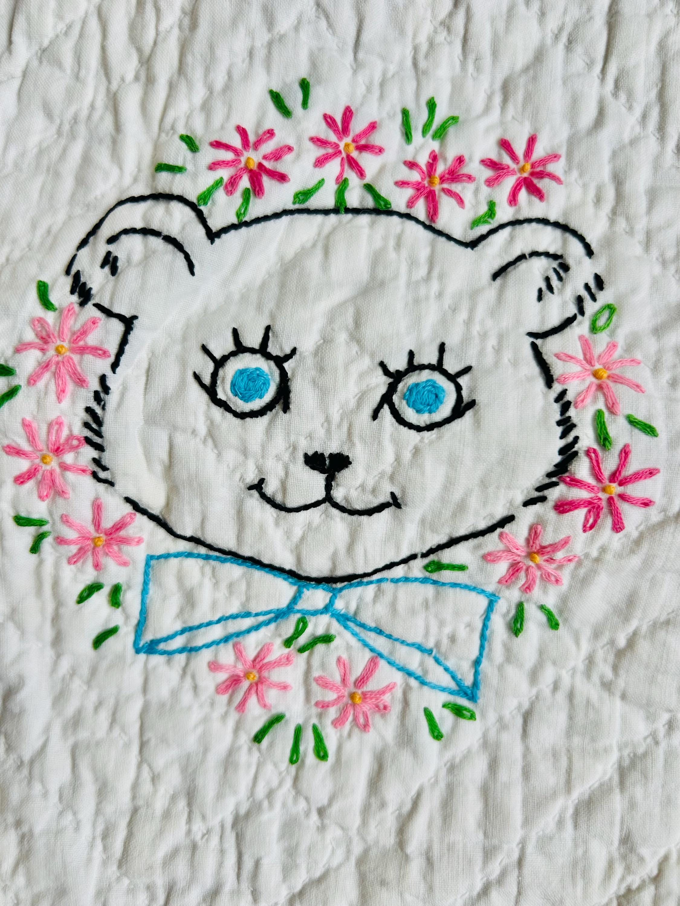 This is an absolutely charming vintage crib quilt dating to the early 1940s and featuring nine hand-embroidered nursery animal blocks, each framed by pink sashing. Each block showcases a different animal—bunny, lamb, kitten, elephant, duck, and more—stitched by hand in classic outline embroidery with cheerful pastel accents. The hand quilting is expertly done in diagonal grids.