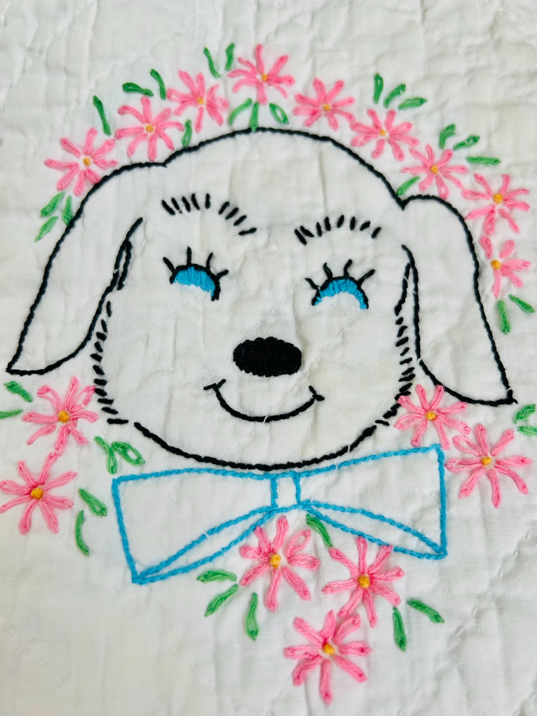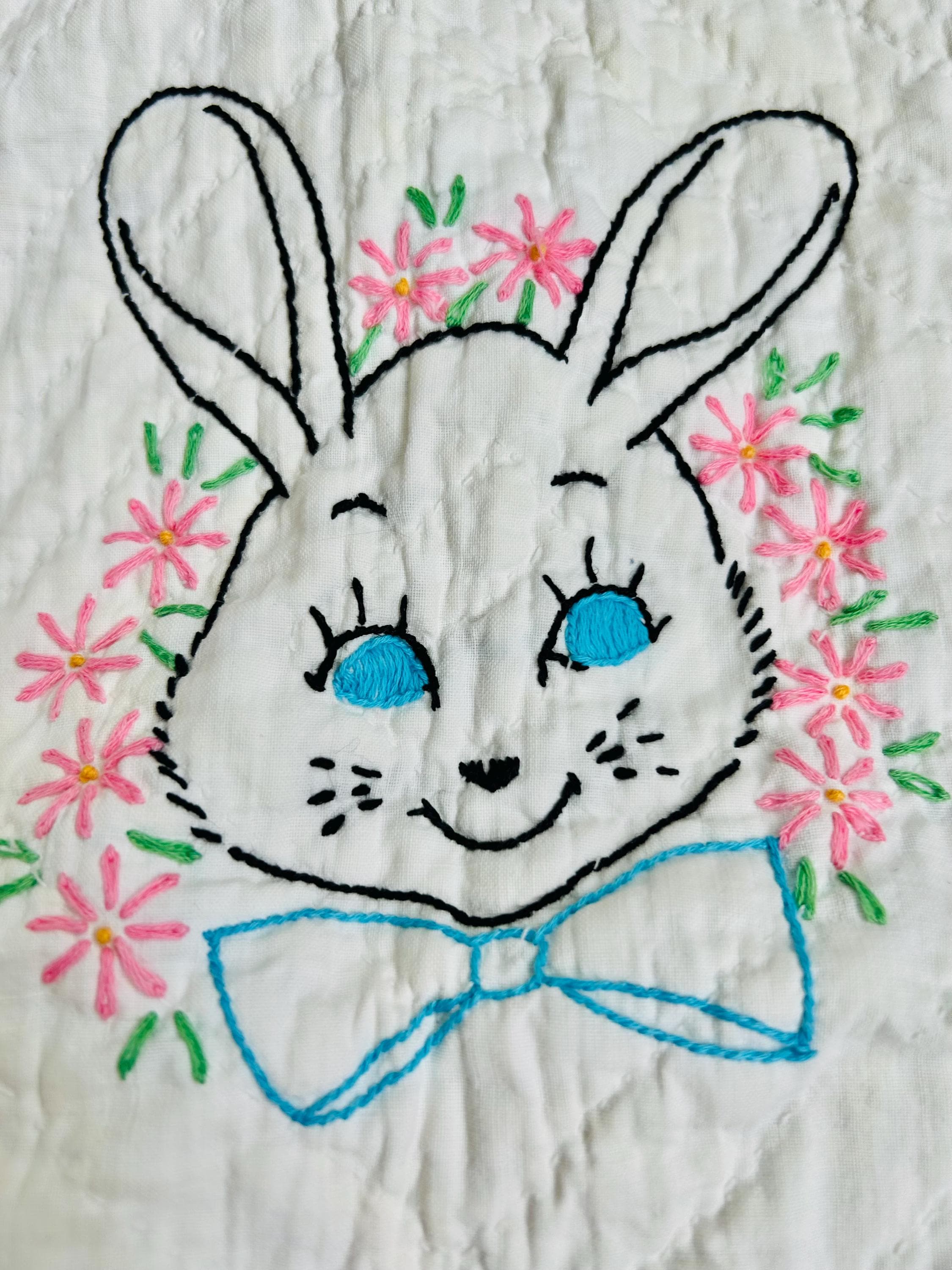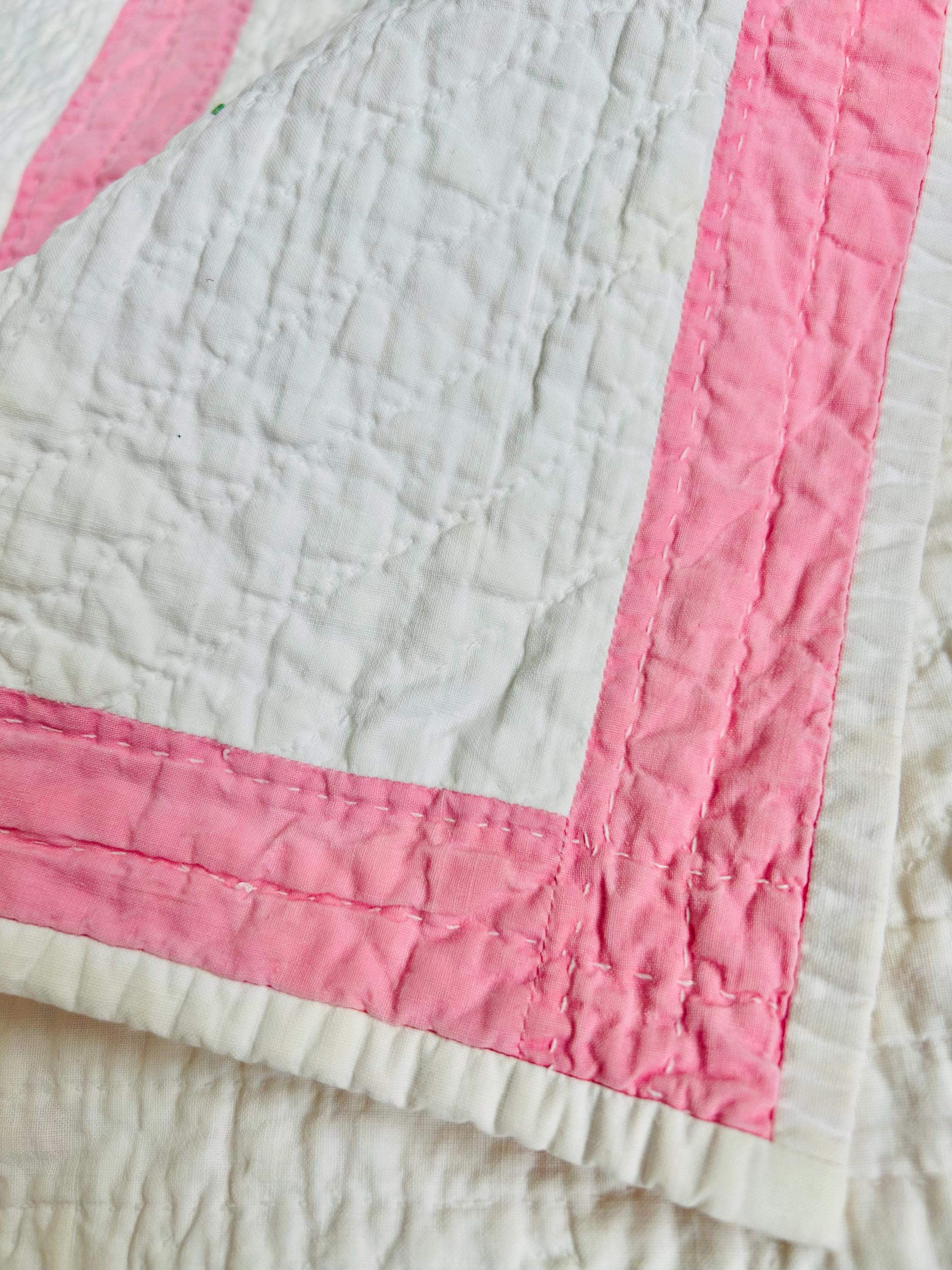 🧵 Details • Date: Circa 1940–1945 • Size: 35 1/2” x 44” (crib/baby size) • Pattern: Embroidered nursery animal blocks (9-block layout) • Materials: Cotton fabrics • Colors: White ground with pink sashing, pastel embroidery (pink, green, blue, black outlines) • Construction: Hand embroidered and hand quilted • Quilting: Hand quilted in a simple diagonal grid/outline pattern • Binding: White cotton binding