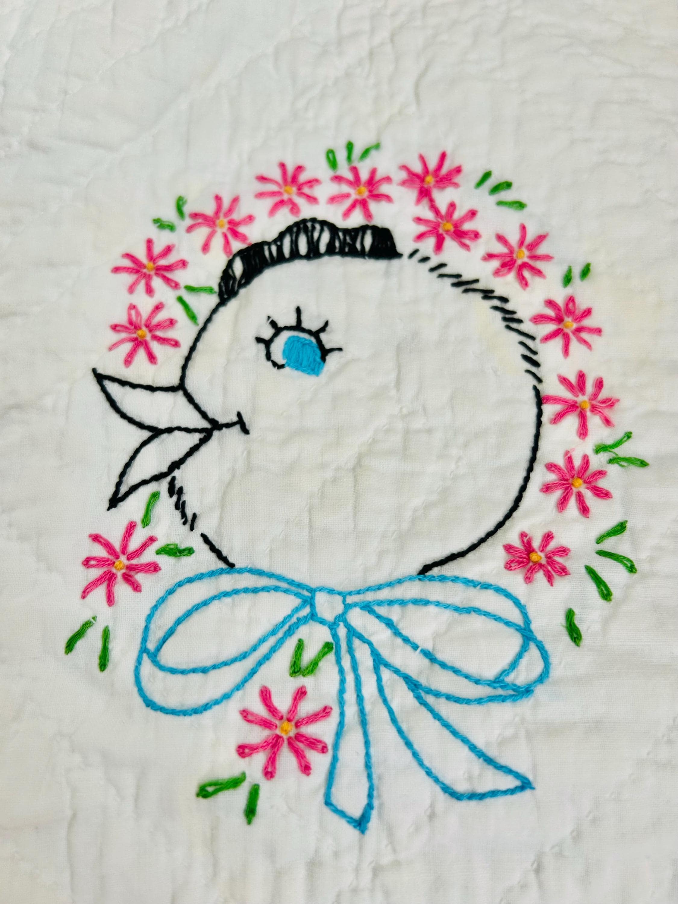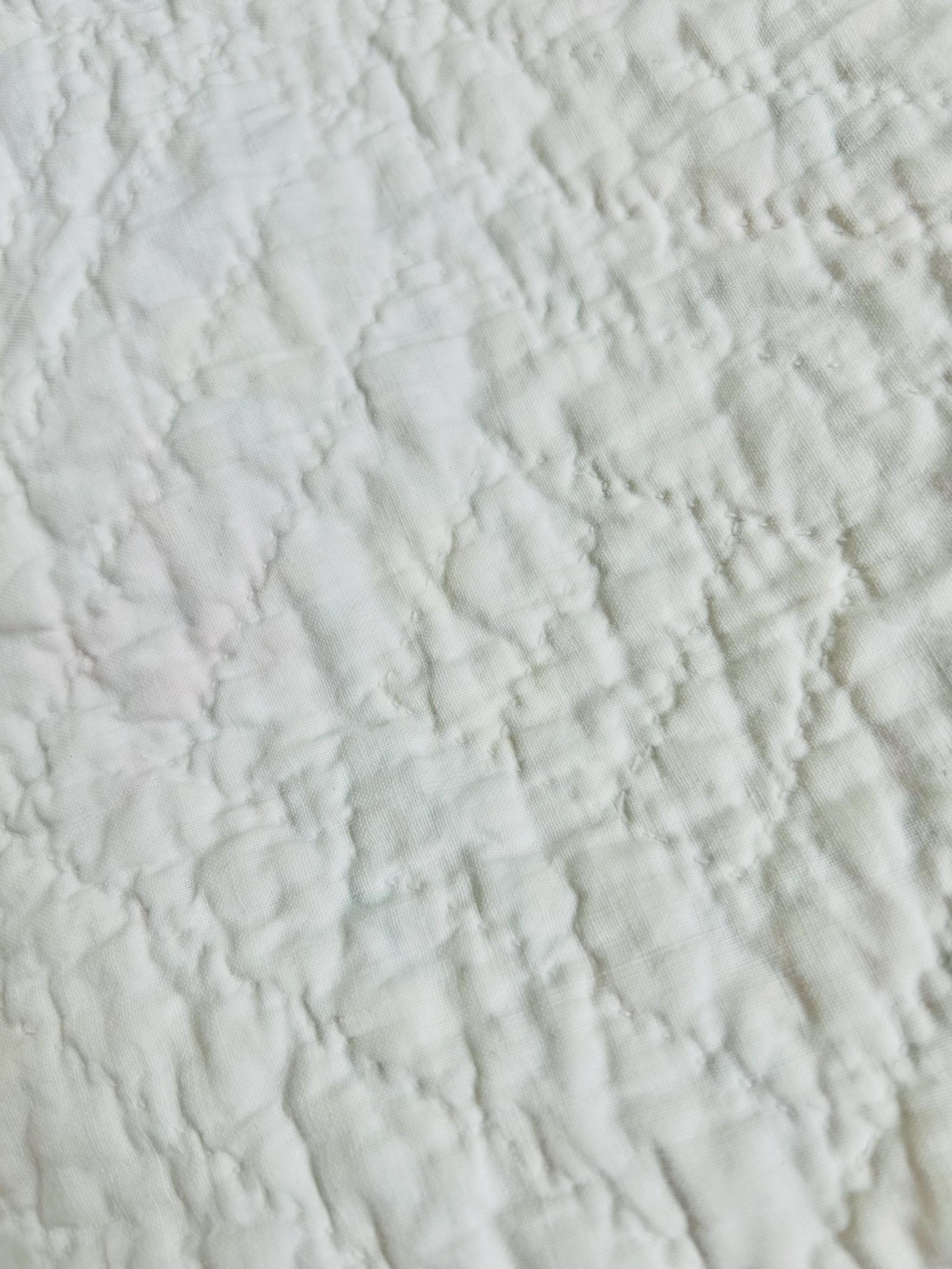 The back is white cotton as is the binding that has been hand-stitched to both sides. The cotton batting is lightweight.
