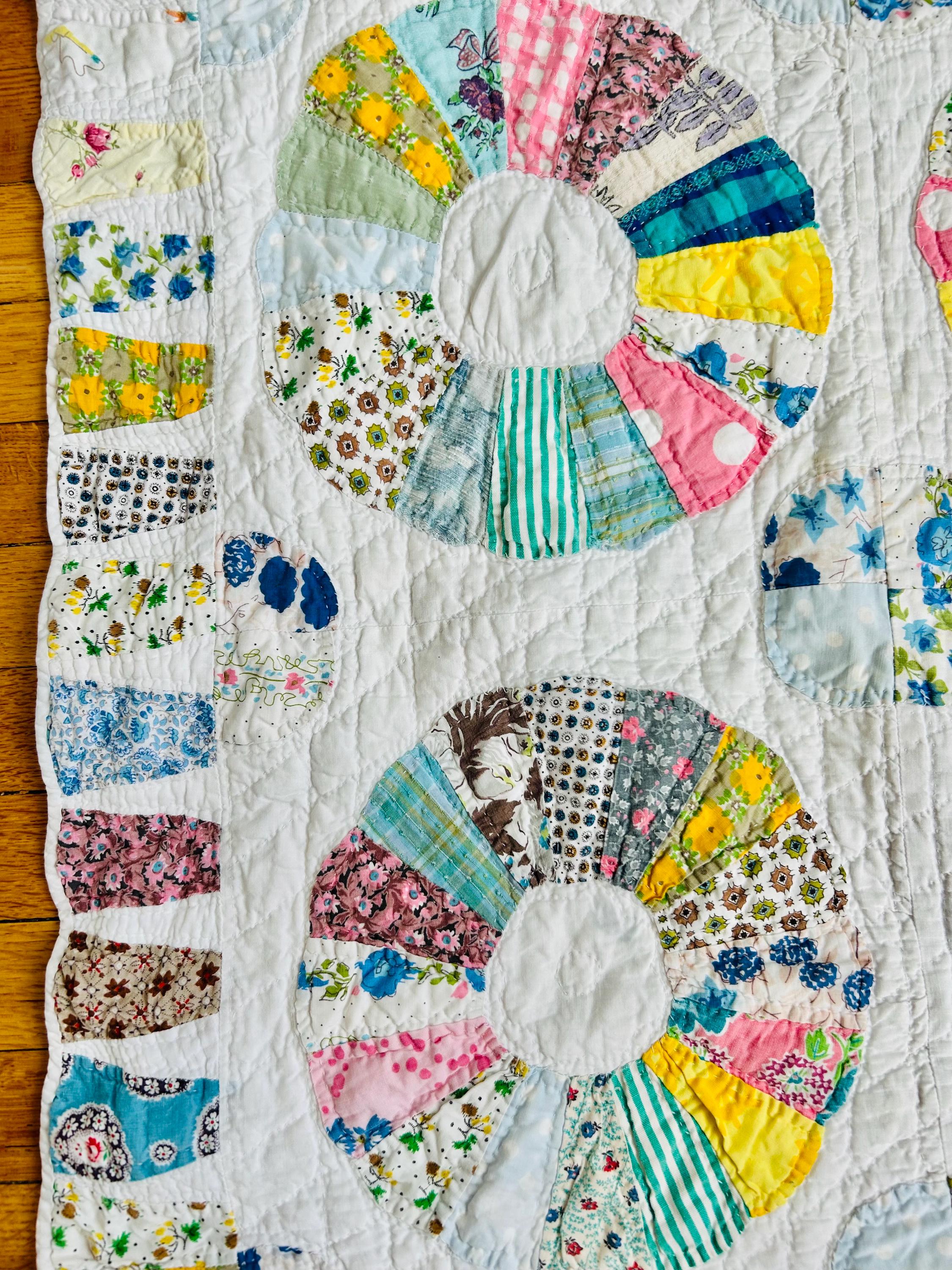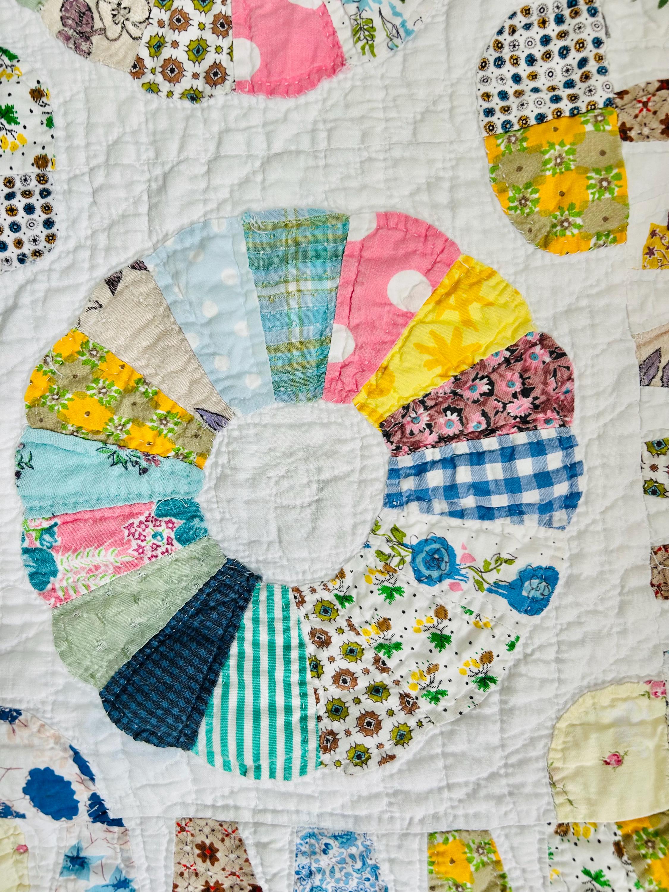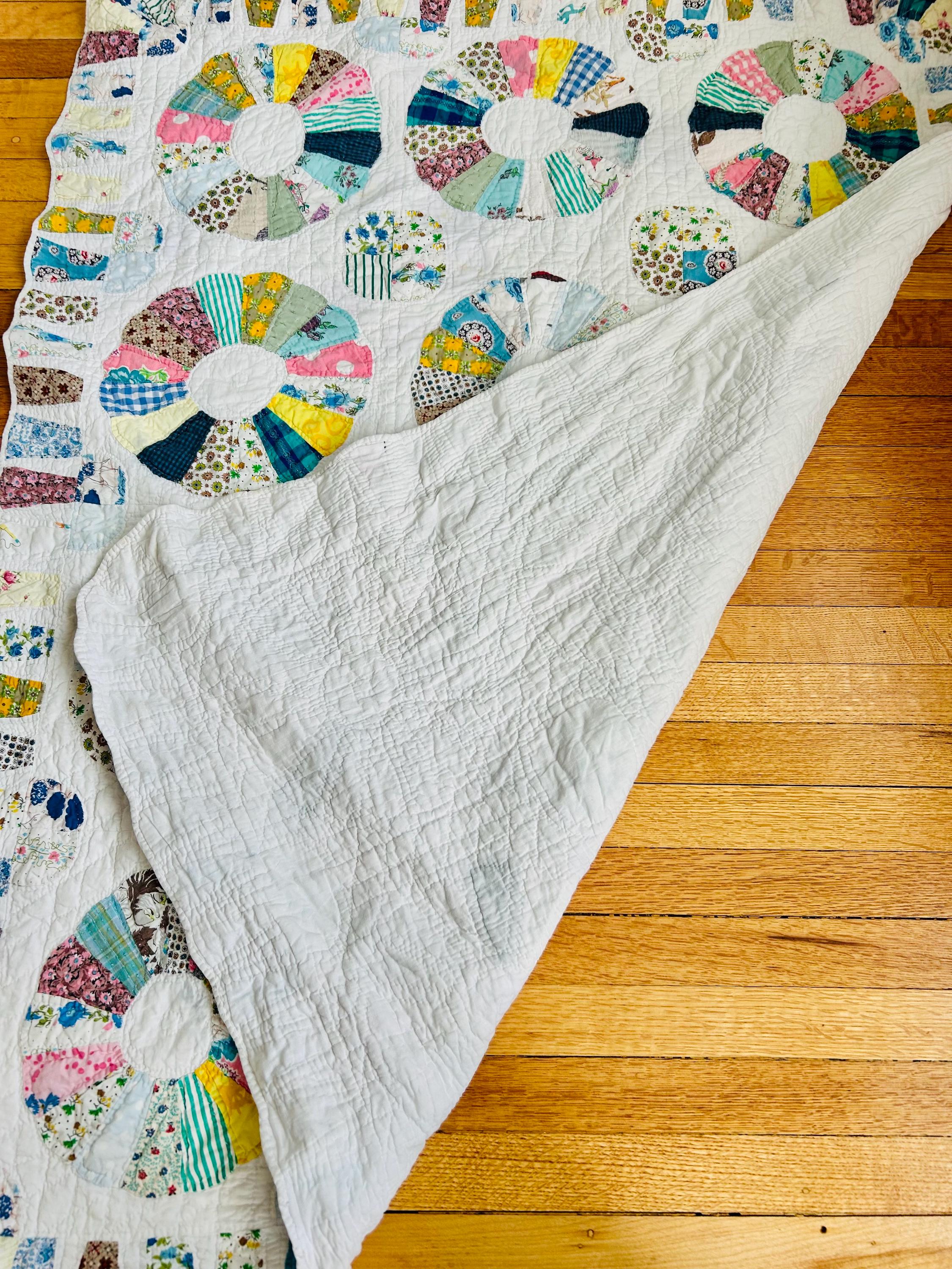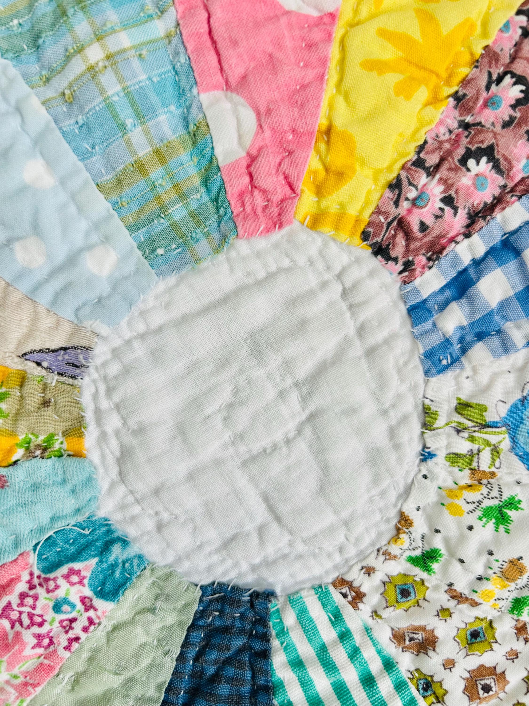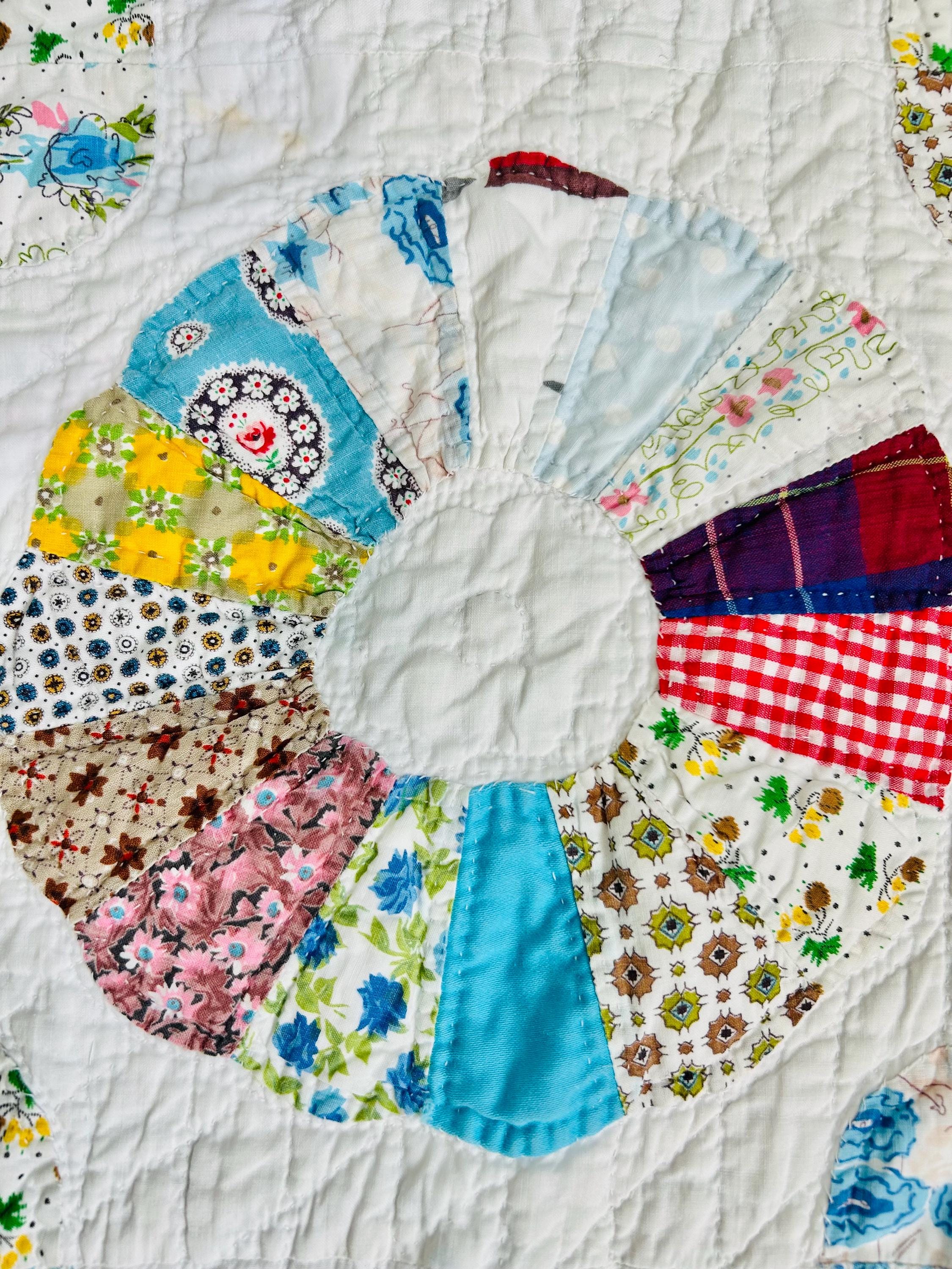 CONDITION: This little quilt has been soaked and hand-washed and is in excellent vintage condition with one small -1/8-inch dark mark in the middle of one of the Dresden Plates circles - see photos. There is also age-related fading to some of the fabrics.