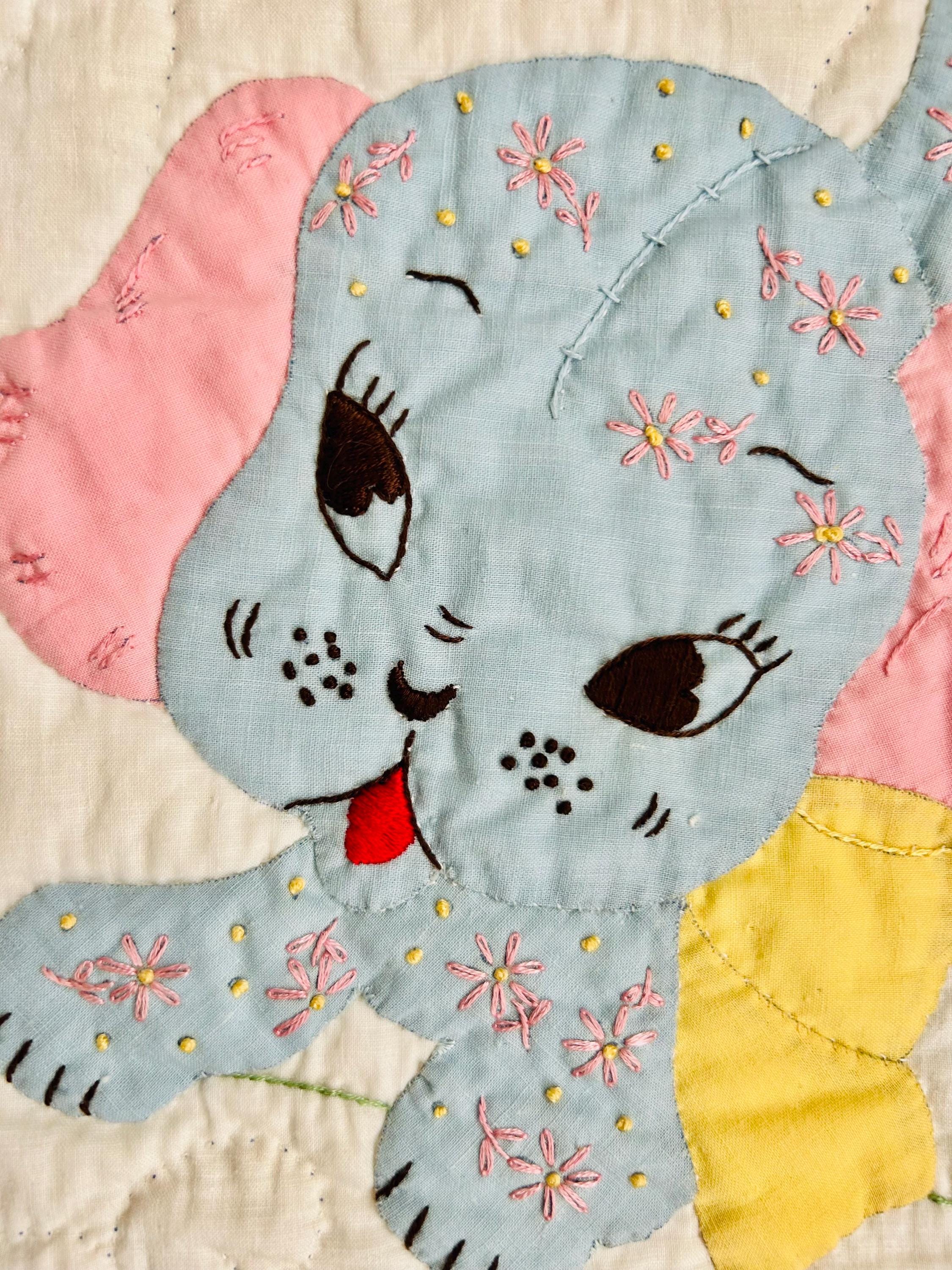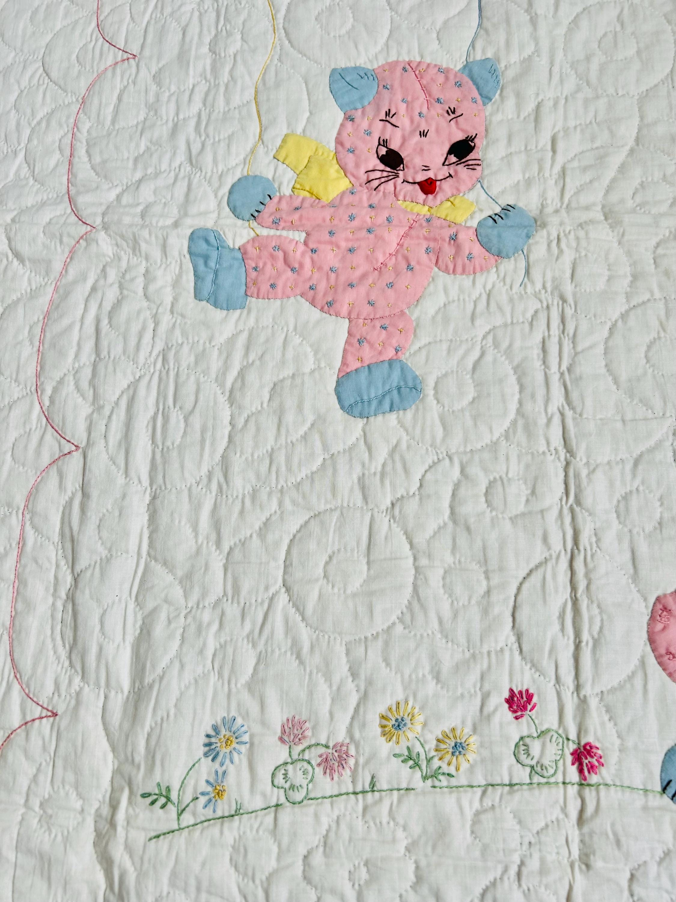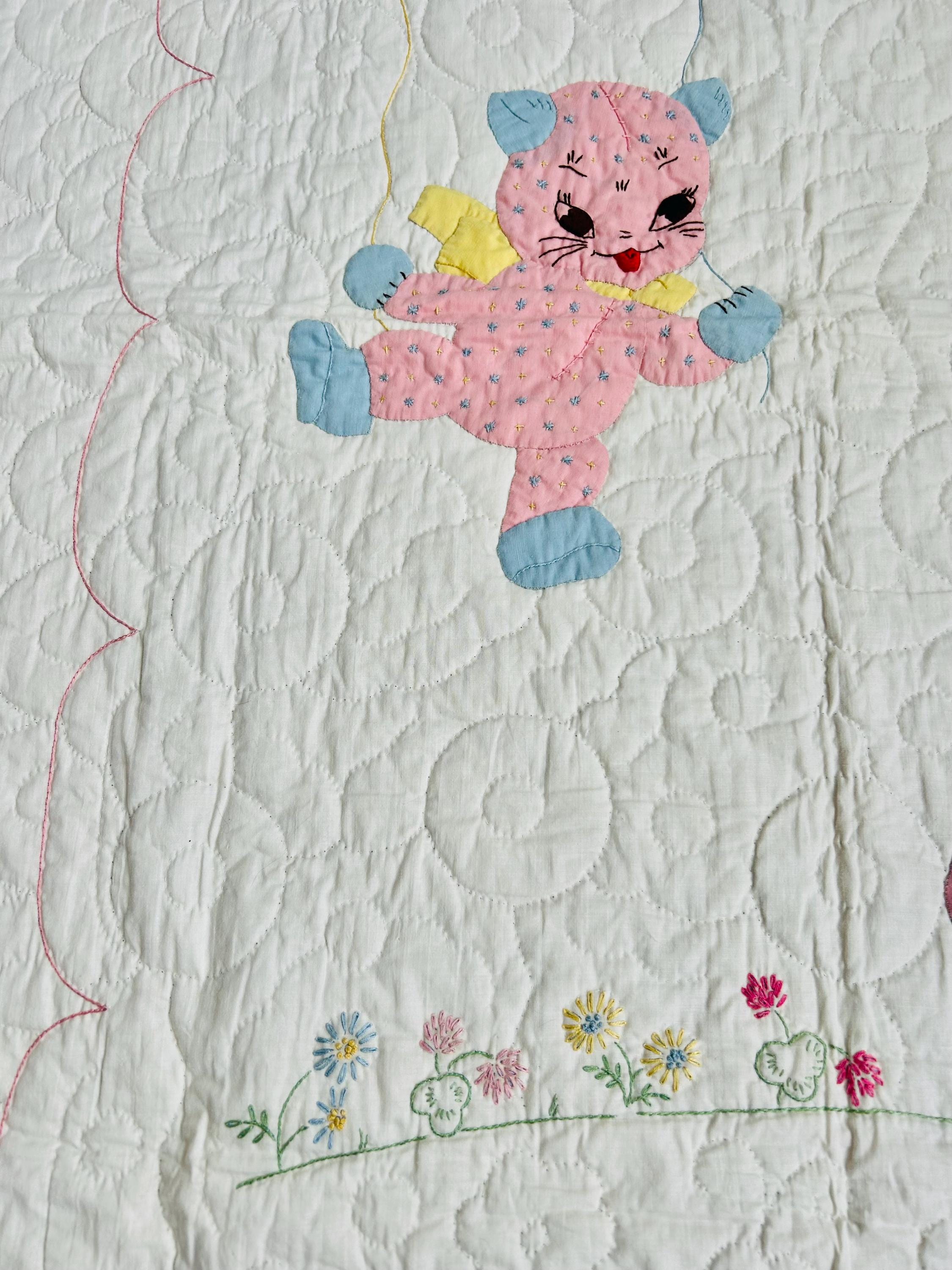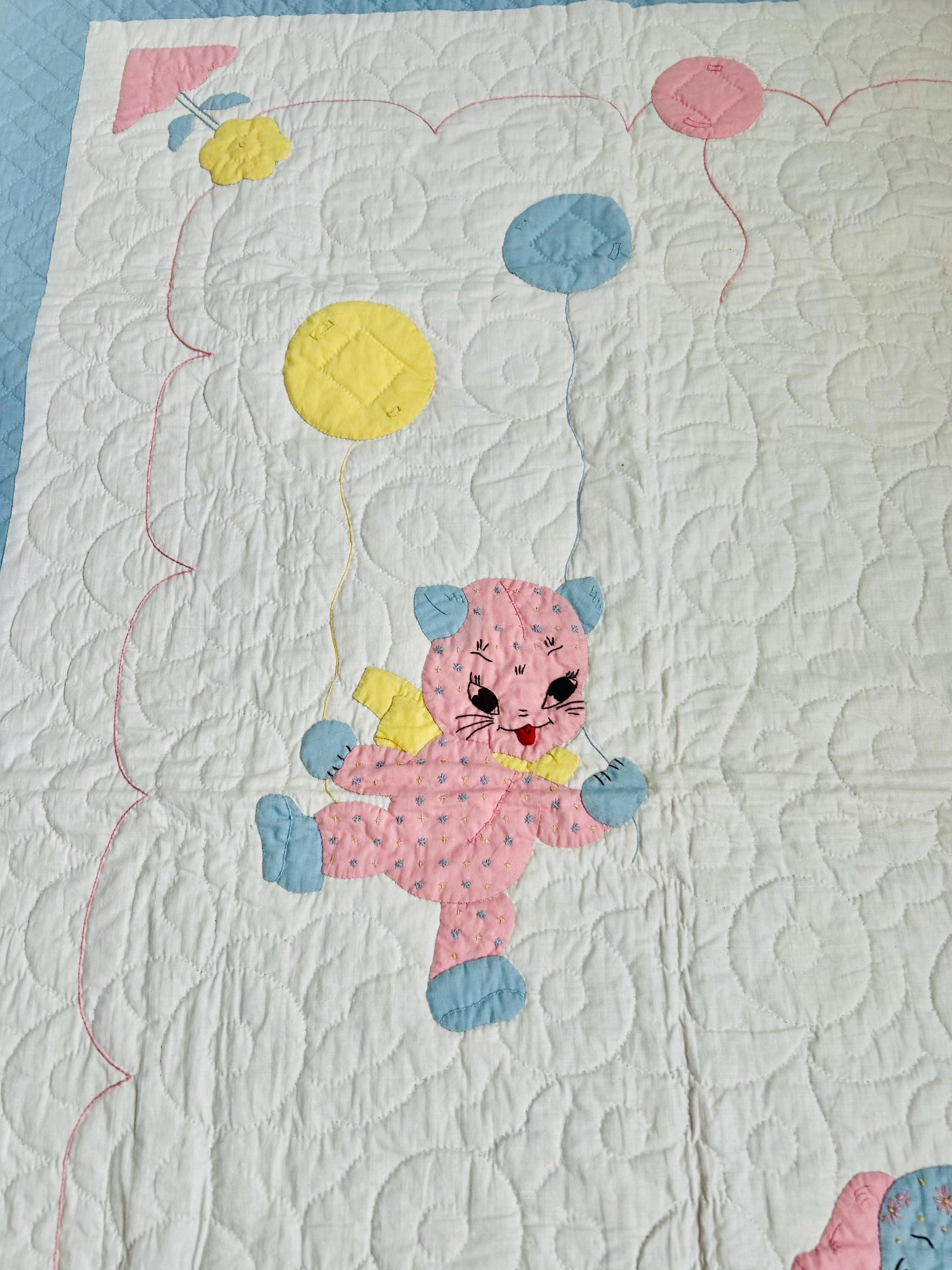 Details • Date: 1940s • Size: 40” x 55” (crib size) • Materials: Cotton fabrics and lightweight batting • Construction: Hand appliquéd, hand embroidered, and hand quilted • Design: Whimsical nursery theme with puppy, kitten, balloons, and floral accents • Colors: Pastel blue, pink, yellow, and white