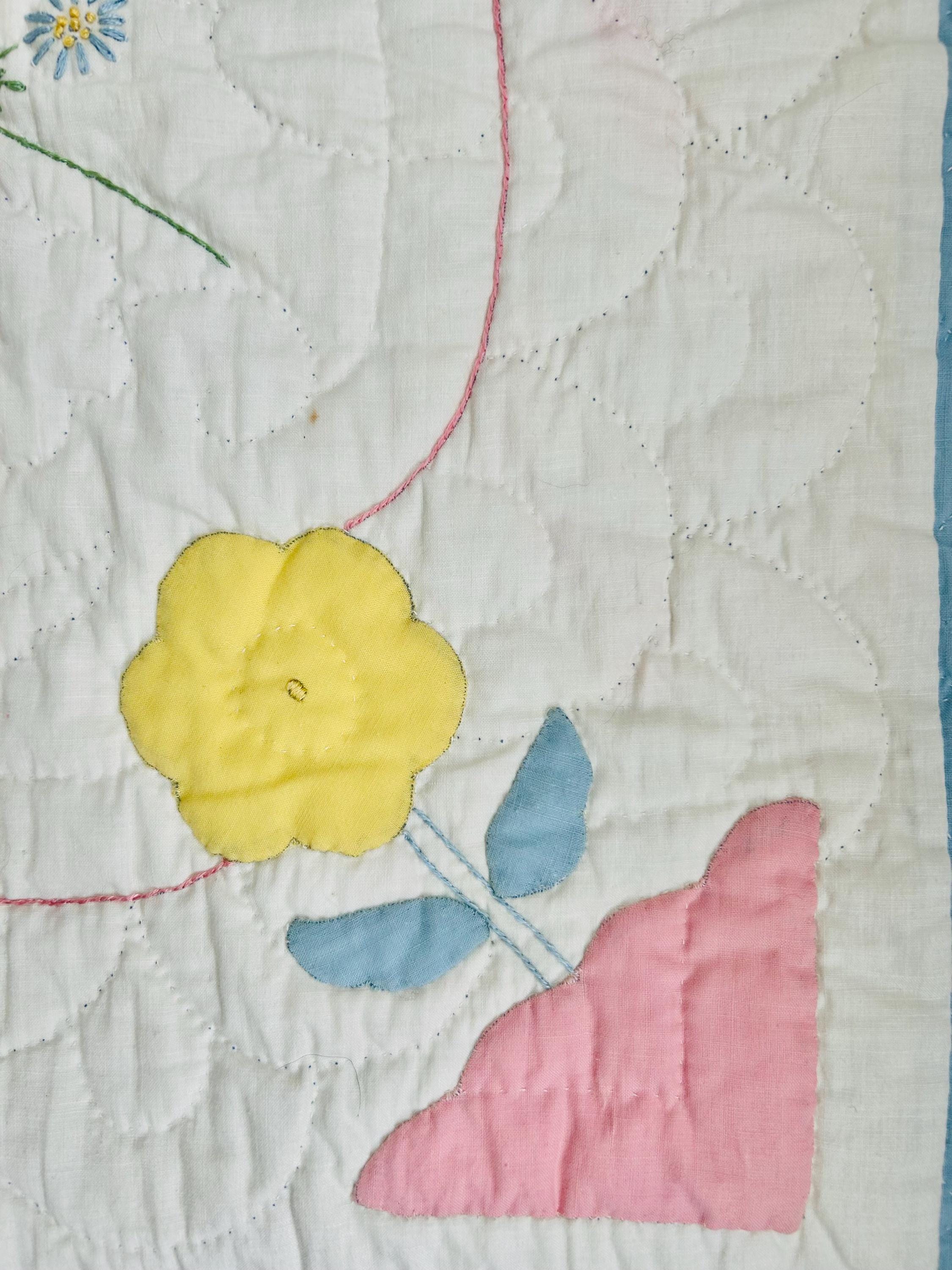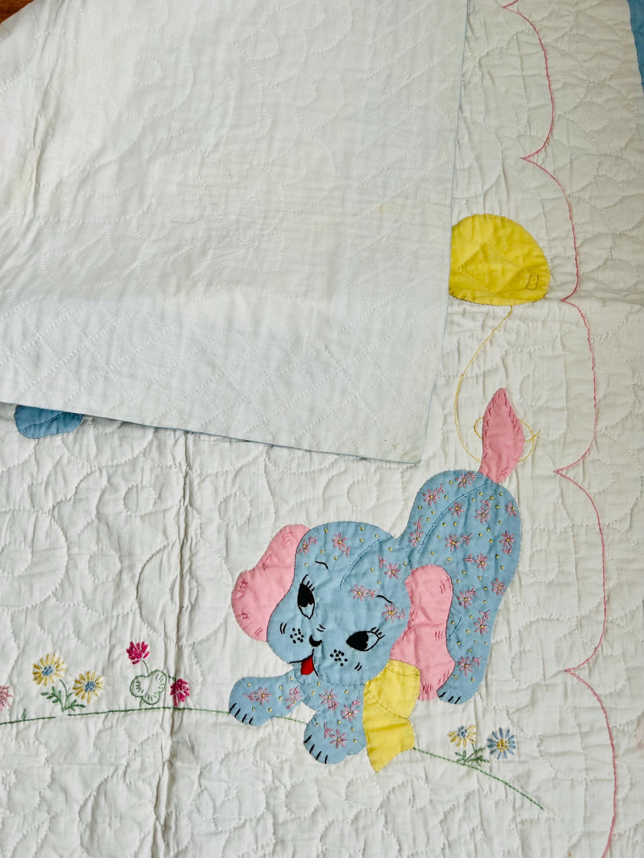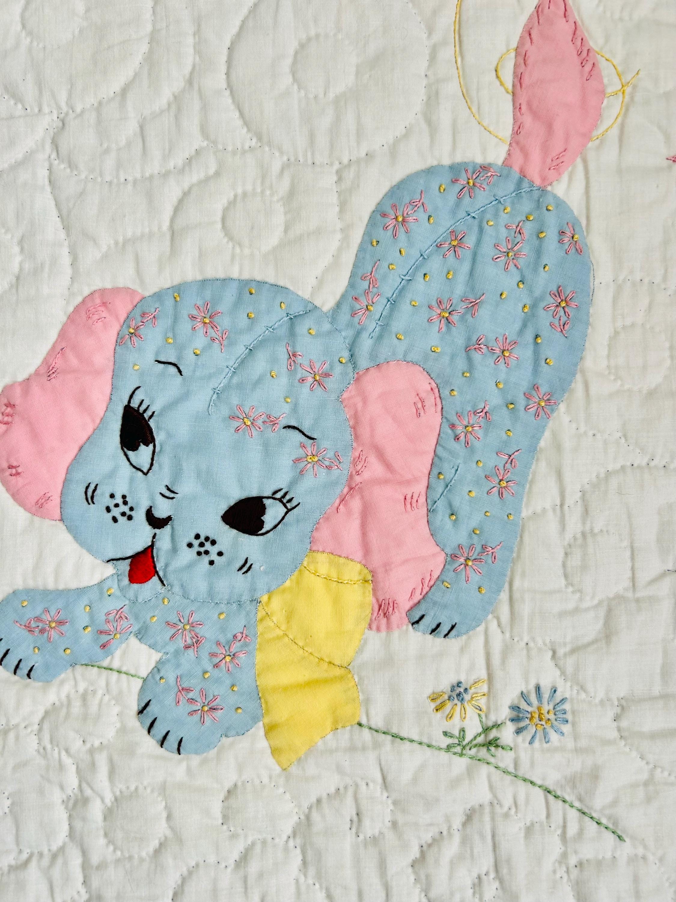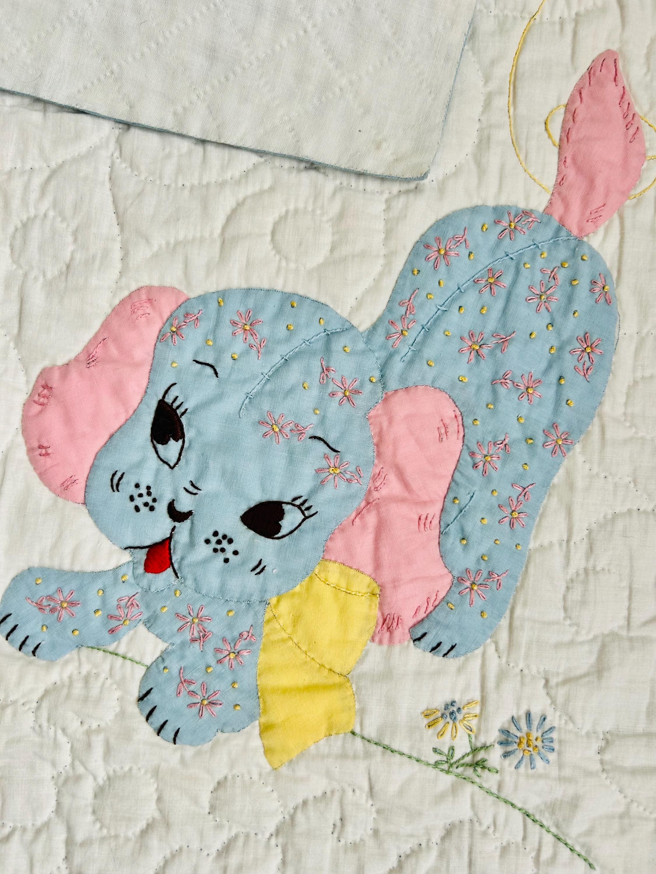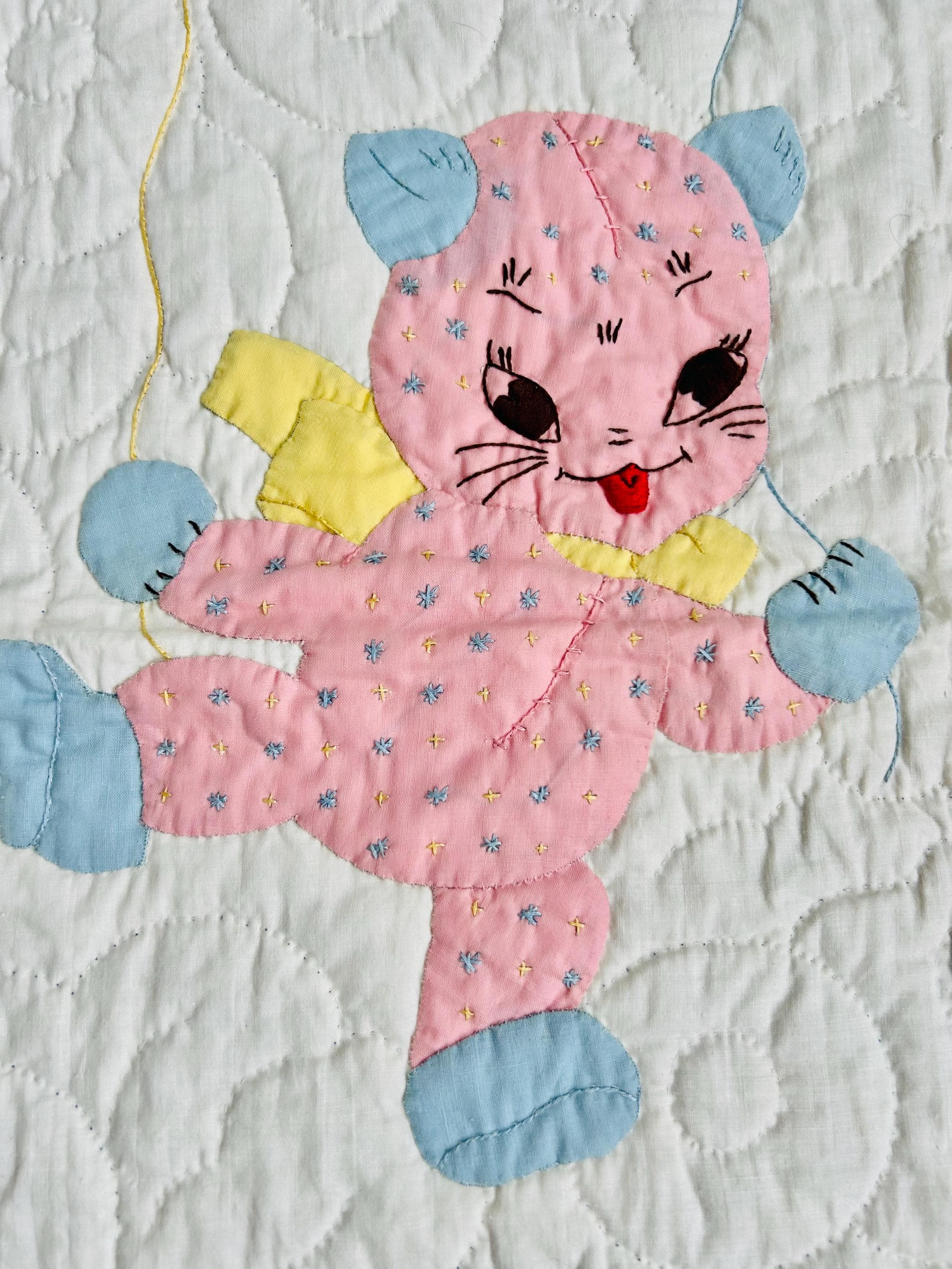 Details • Date: 1940s • Size: 40” x 55” (crib size) • Materials: Cotton fabrics and lightweight batting • Construction: Hand appliquéd, hand embroidered, and hand quilted • Design: Whimsical nursery theme with puppy, kitten, balloons, and floral accents • Colors: Pastel blue, pink, yellow, and white