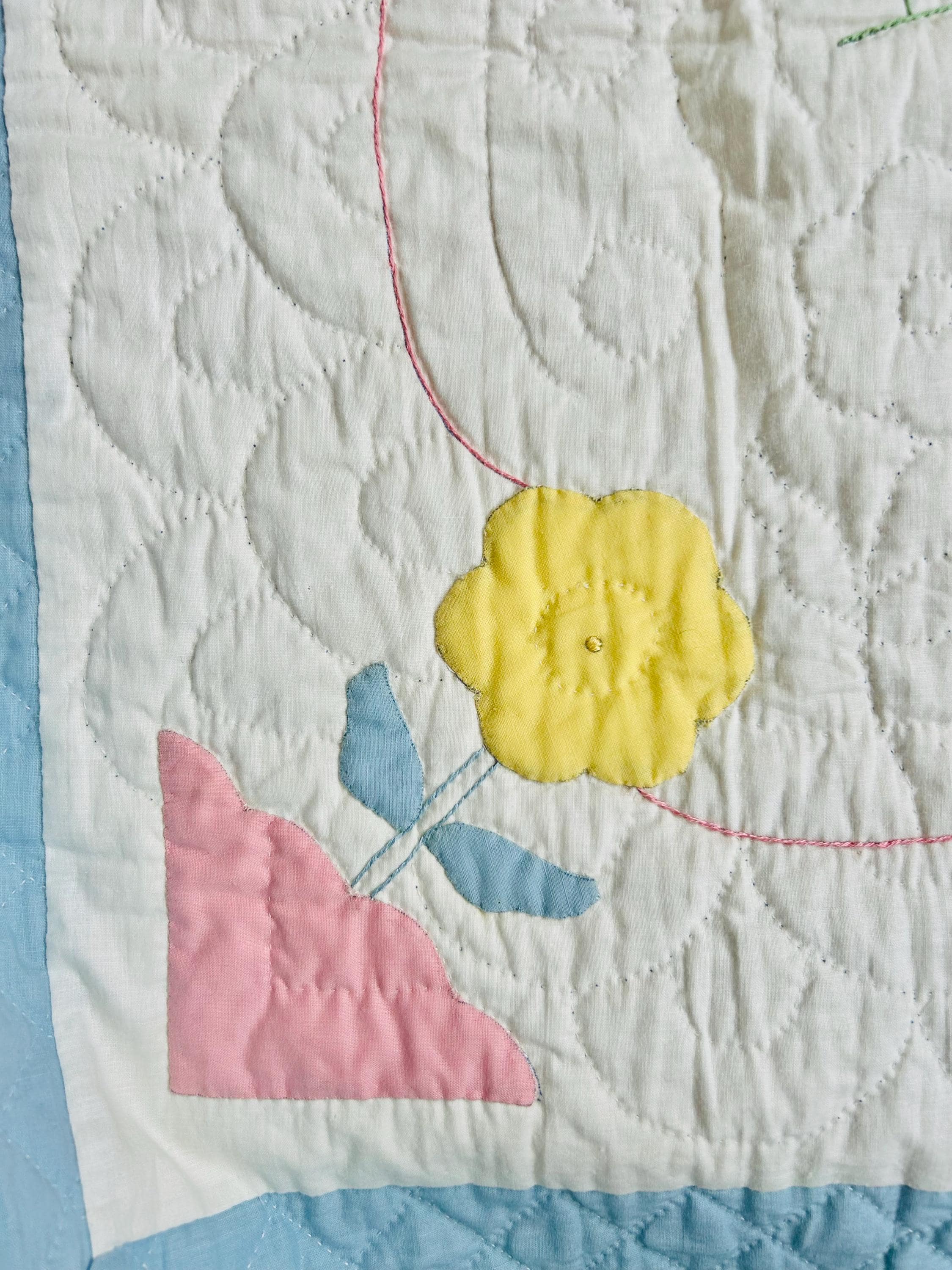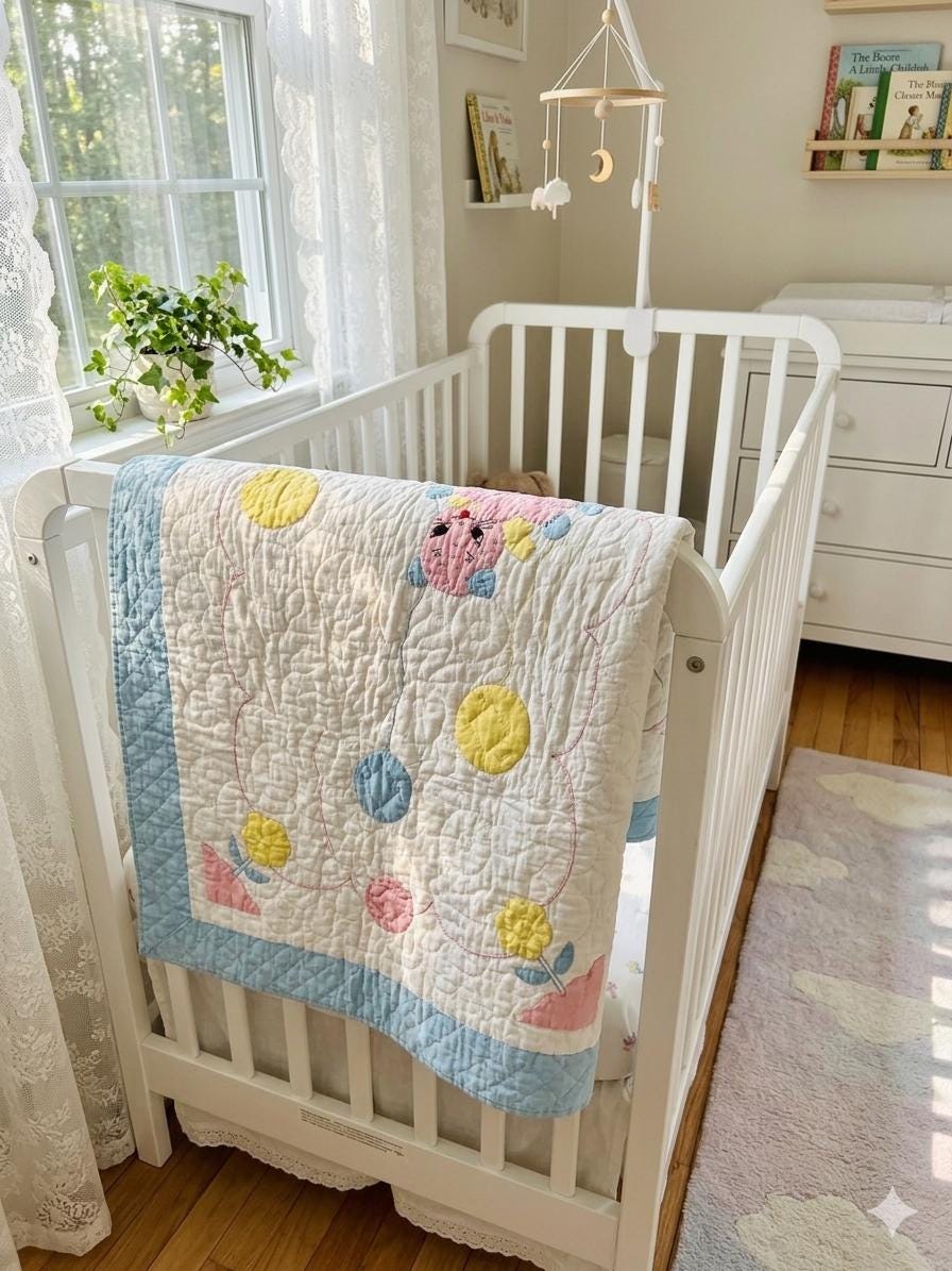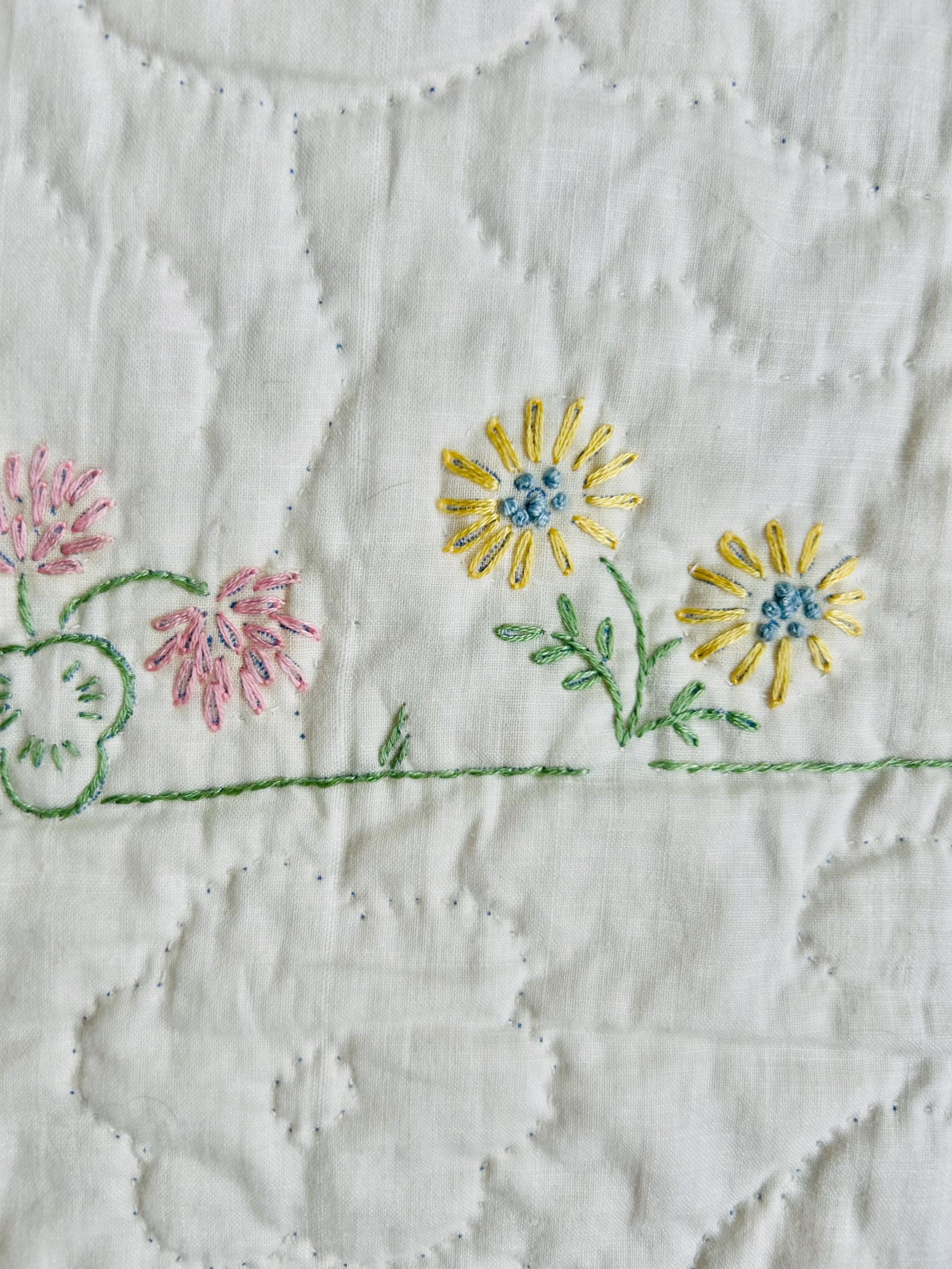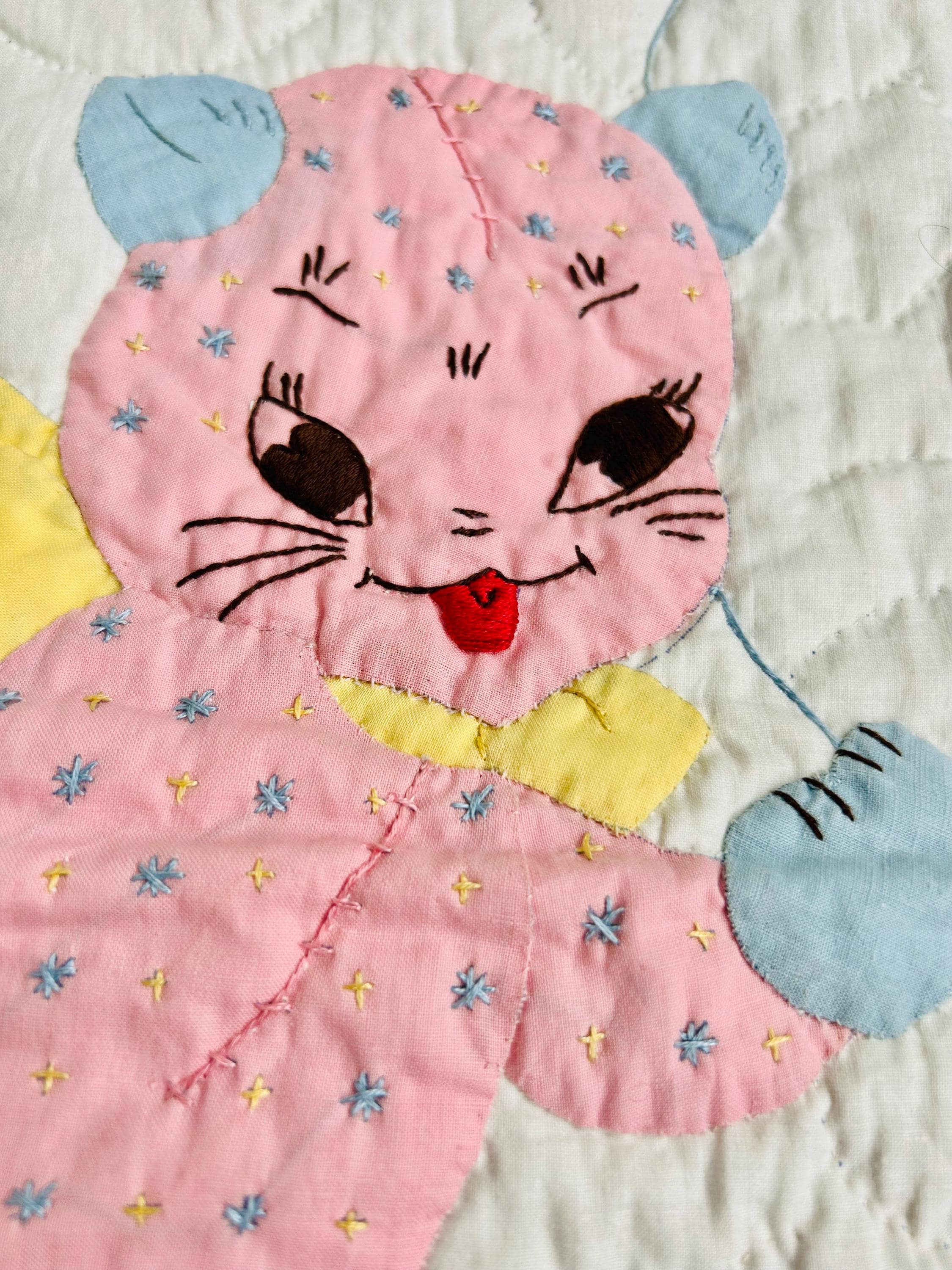 Details • Date: 1940s • Size: 40” x 55” (crib size) • Materials: Cotton fabrics and lightweight batting • Construction: Hand appliquéd, hand embroidered, and hand quilted • Design: Whimsical nursery theme with puppy, kitten, balloons, and floral accents • Colors: Pastel blue, pink, yellow, and white