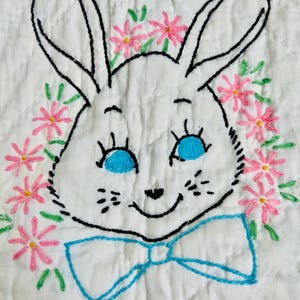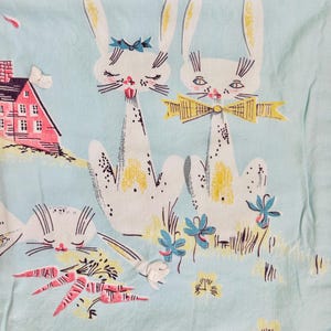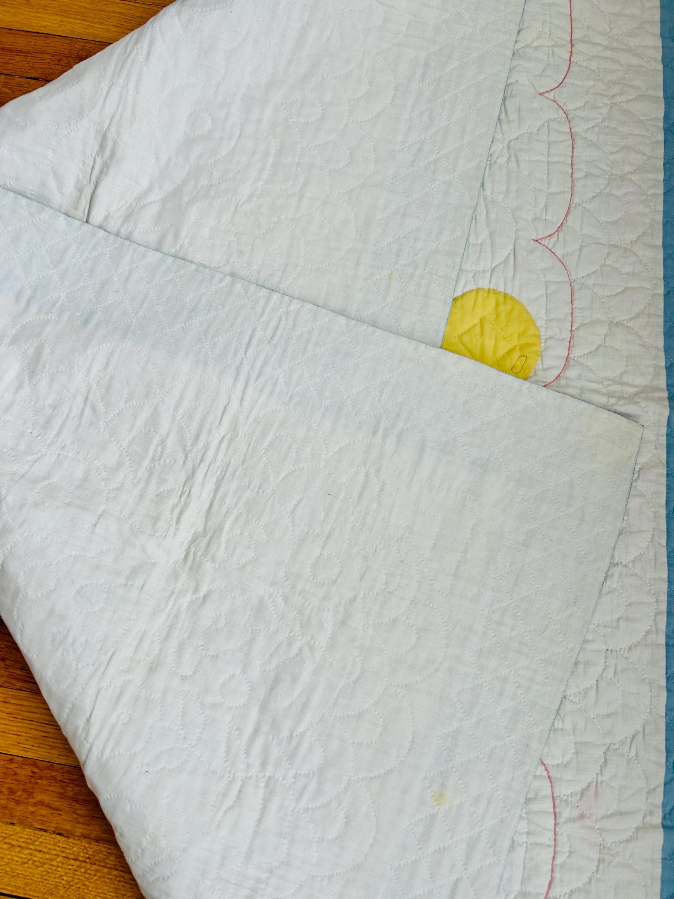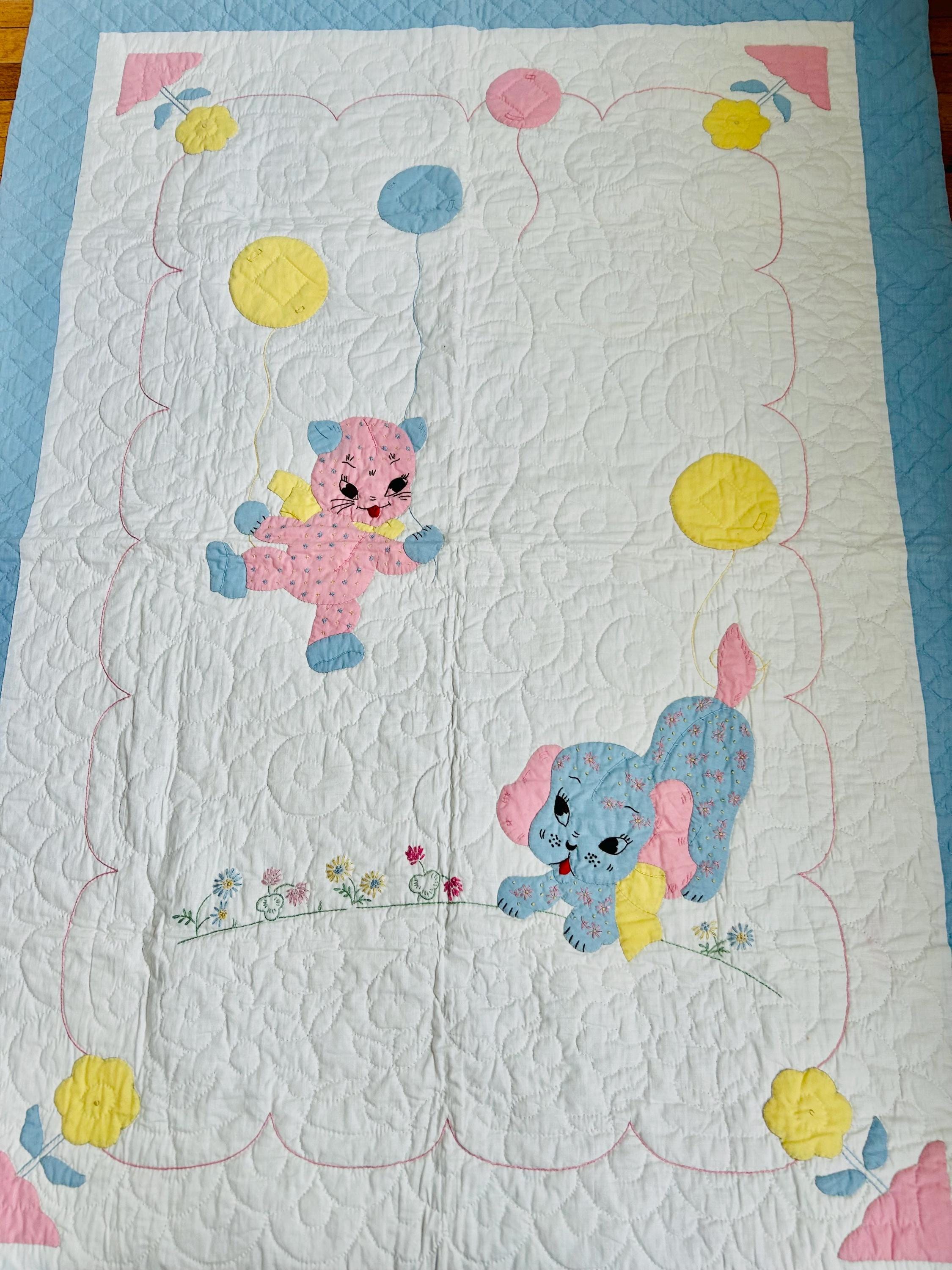 This charming 1940s child’s quilt features a playful blue puppy and pink kitten floating with colorful balloons across a softly quilted white ground. The color palette is pastel —baby blue, soft pink, and sunny yellow.