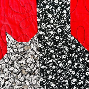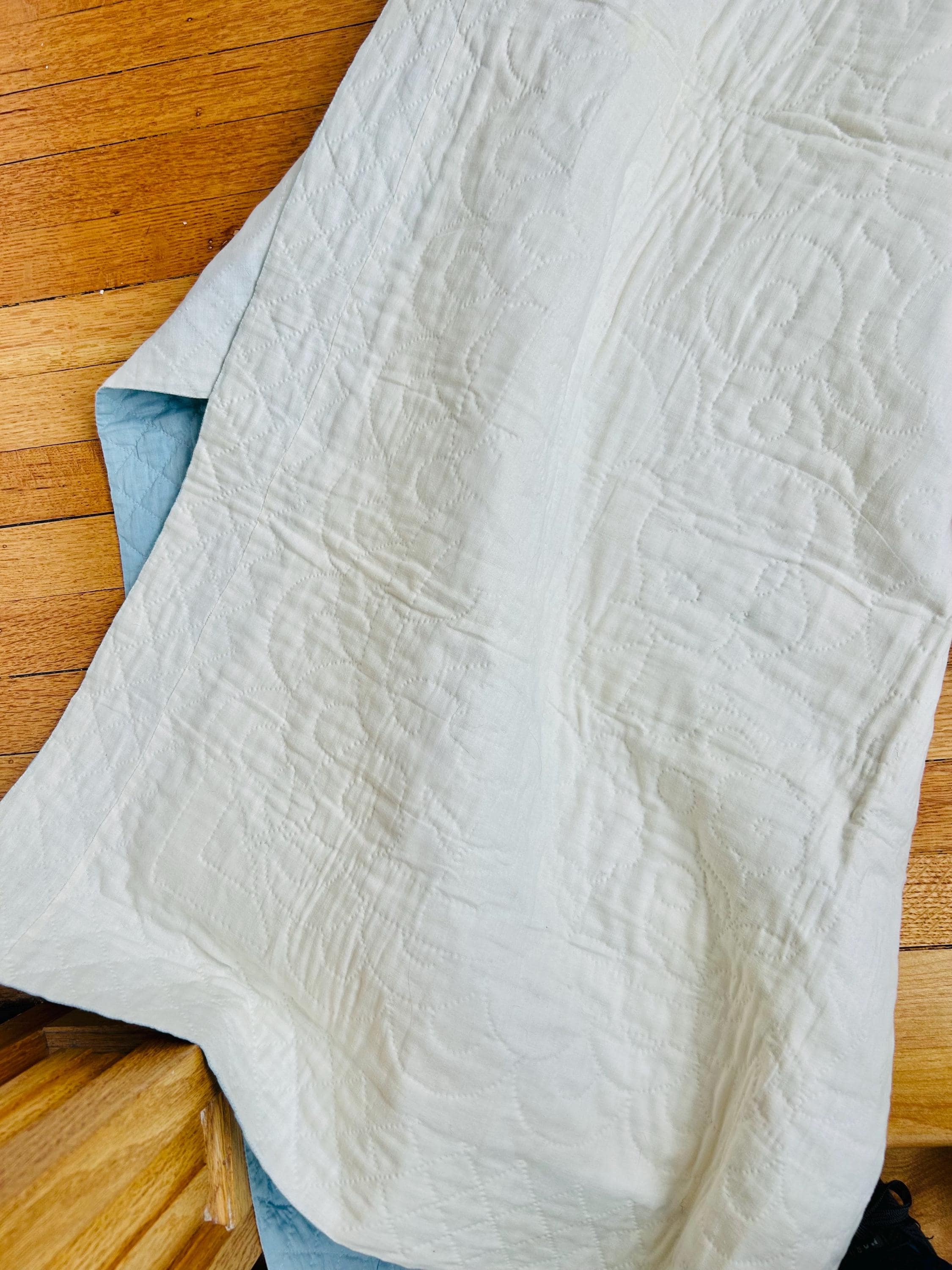 The back is white cotton while this little quilt has been knife-edge finished in hand-stitching. The cotton batting is very lightweight.