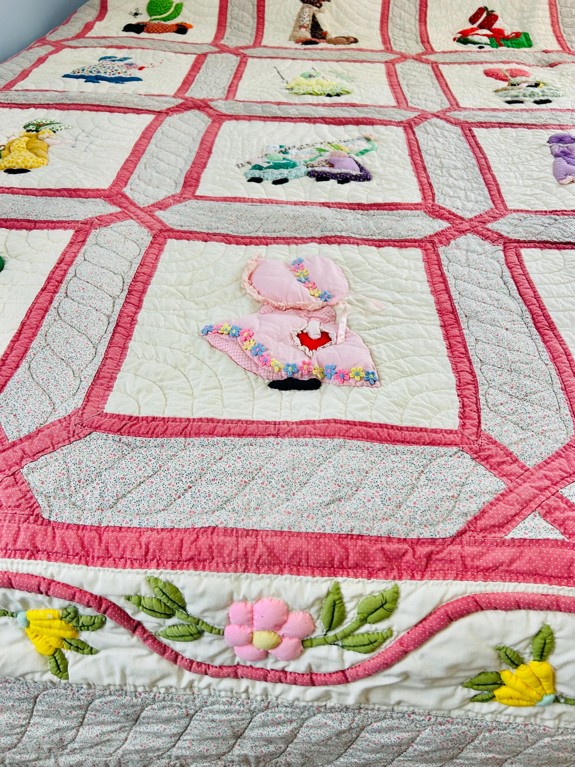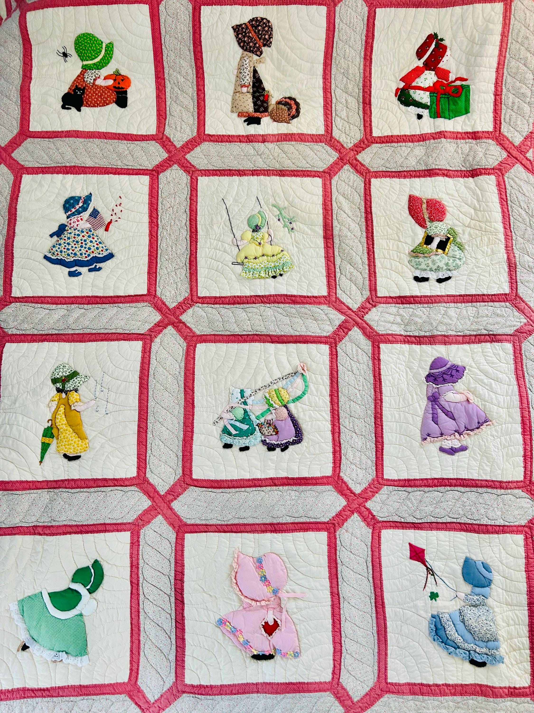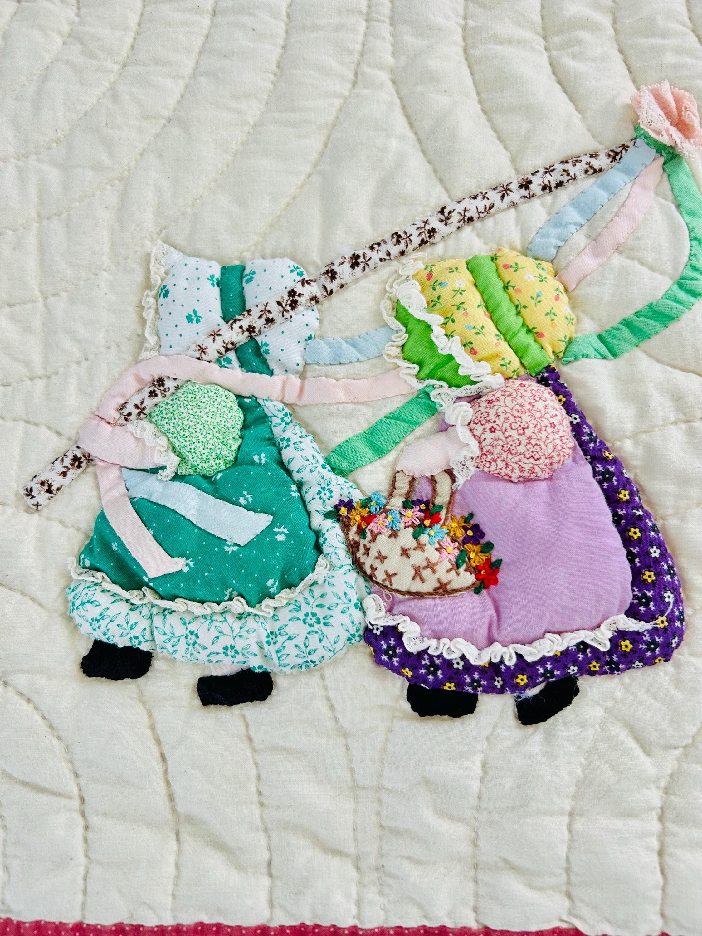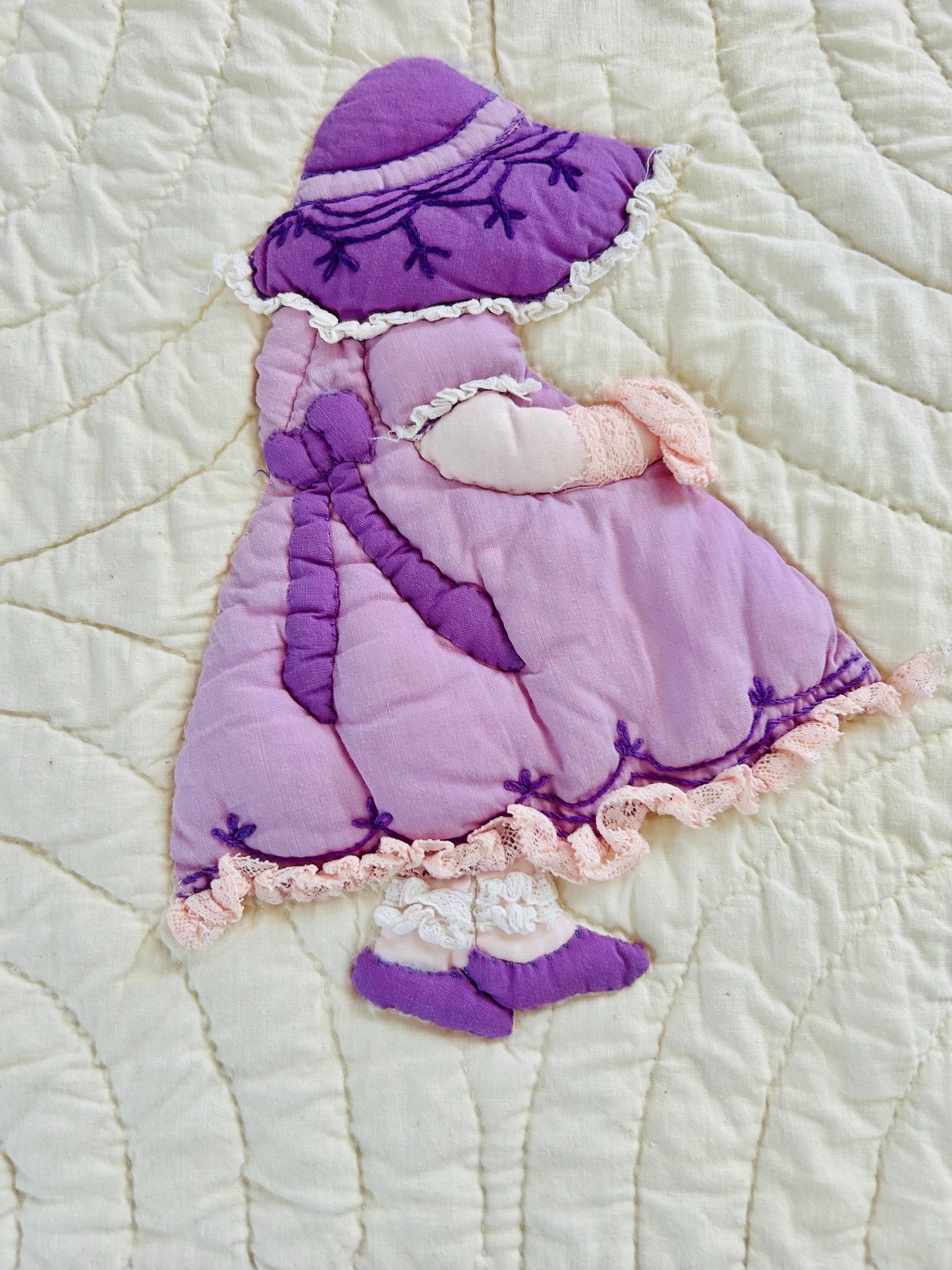 Details • Size: 72” x 92” • Date: 1970s • Pattern: Sunbonnet Sue variation (embellished / dimensional appliqué) • Materials: Cotton fabrics with stuffed appliqué and decorative trims • Construction: Hand-appliquéd and hand-quilted • Batting: Lightweight cotton