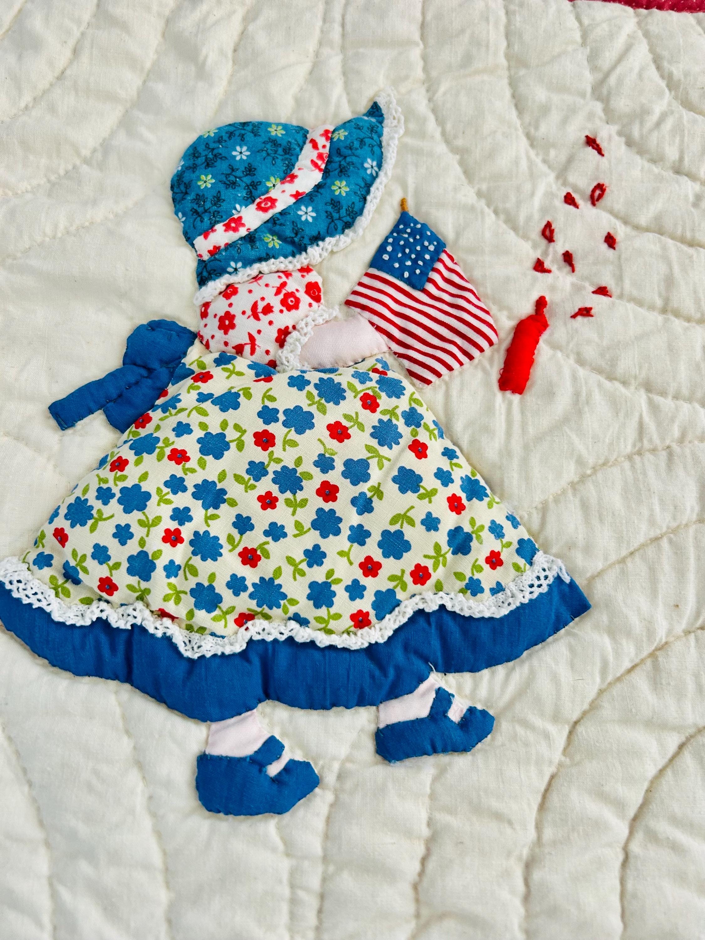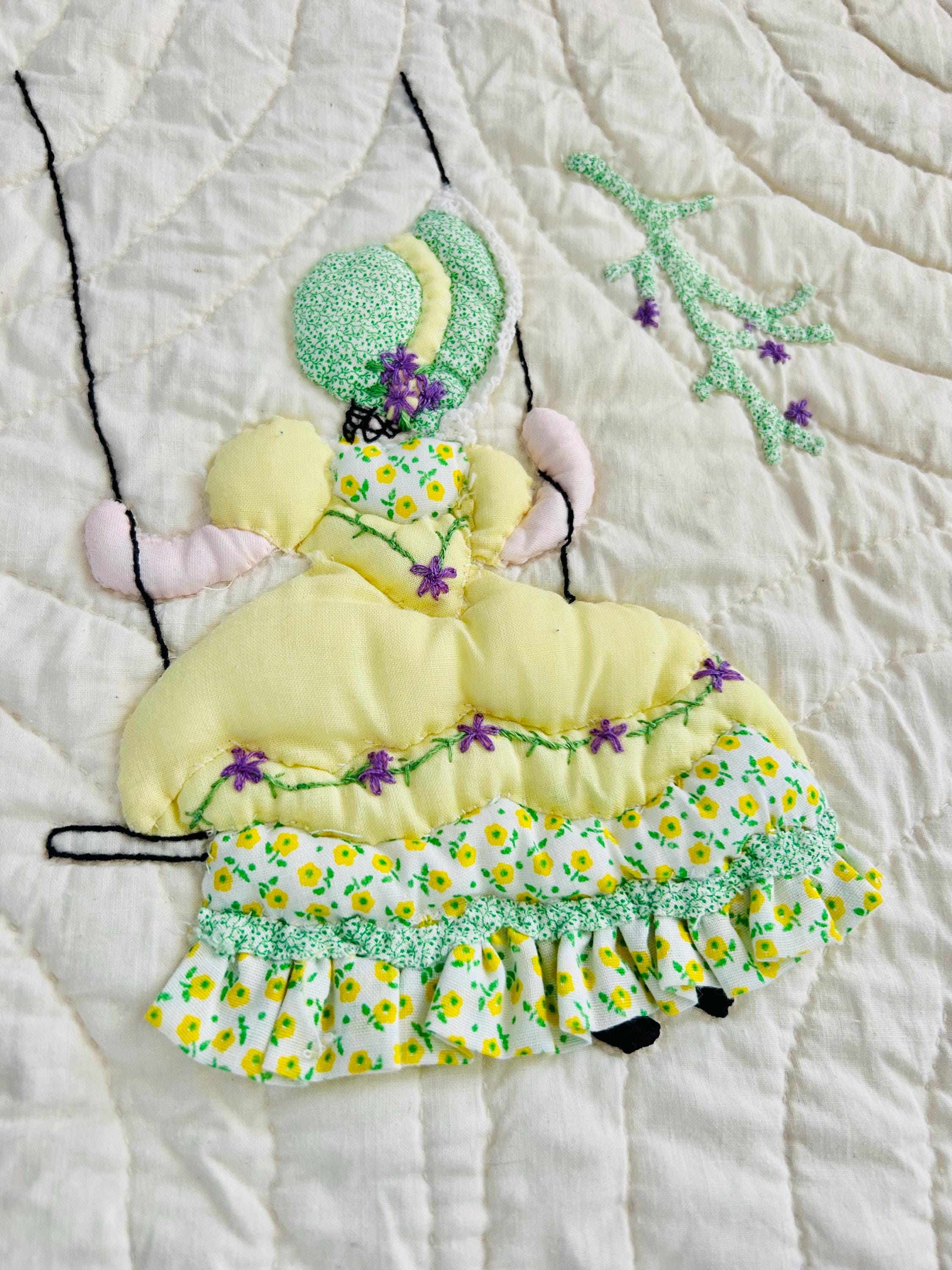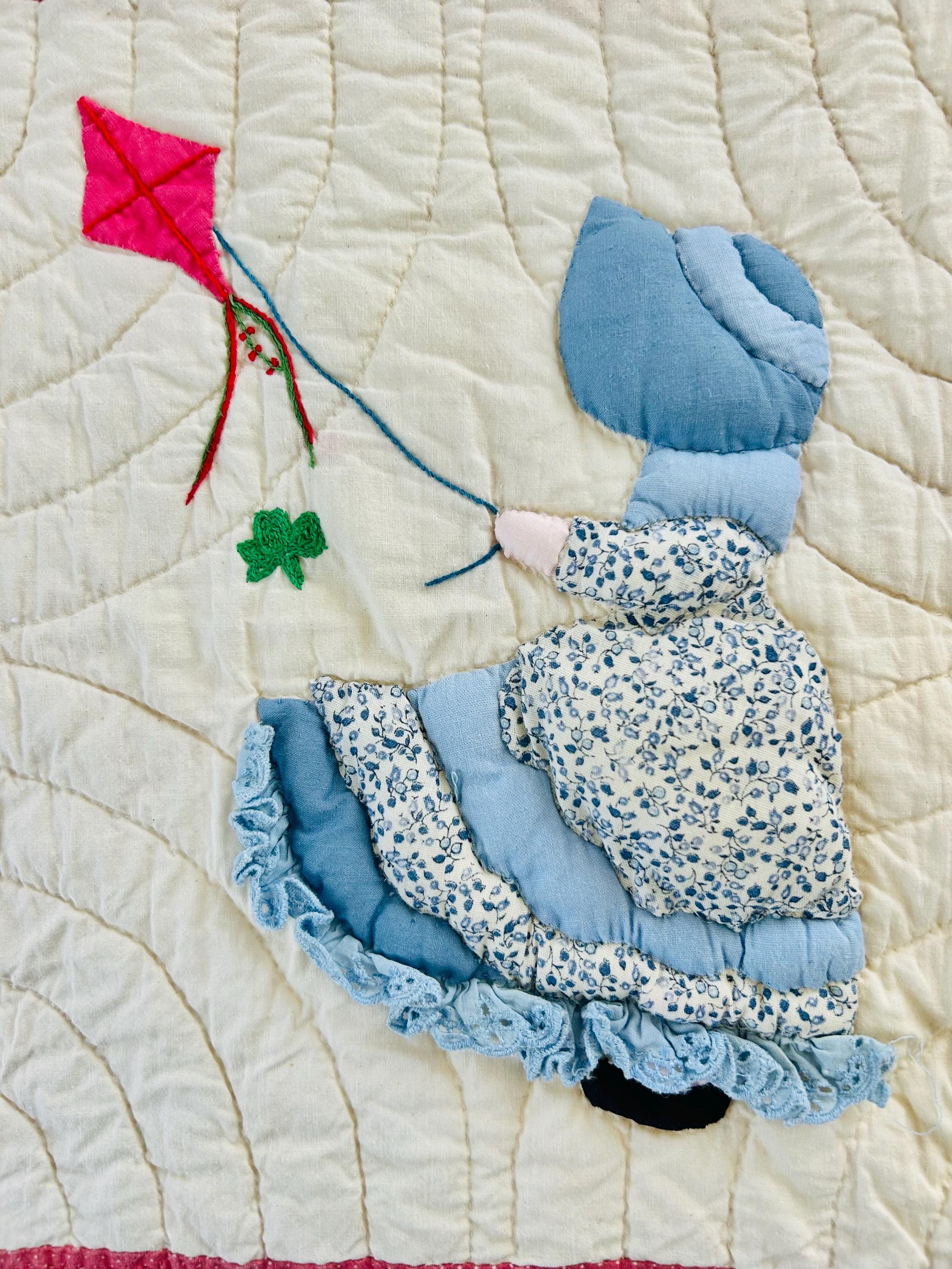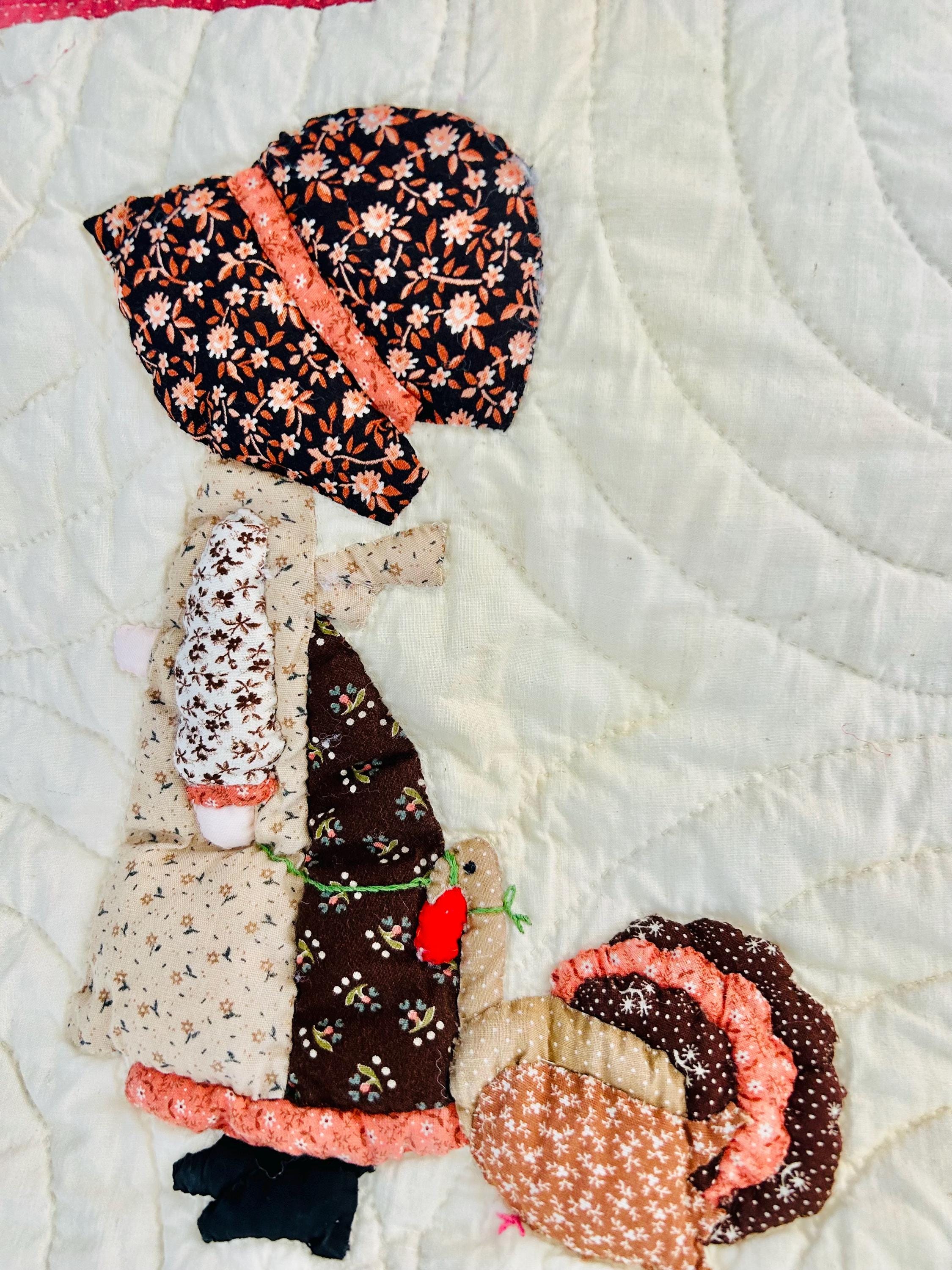 Details • Size: 72” x 92” • Date: 1970s • Pattern: Sunbonnet Sue variation (embellished / dimensional appliqué) • Materials: Cotton fabrics with stuffed appliqué and decorative trims • Construction: Hand-appliquéd and hand-quilted • Batting: Lightweight cotton