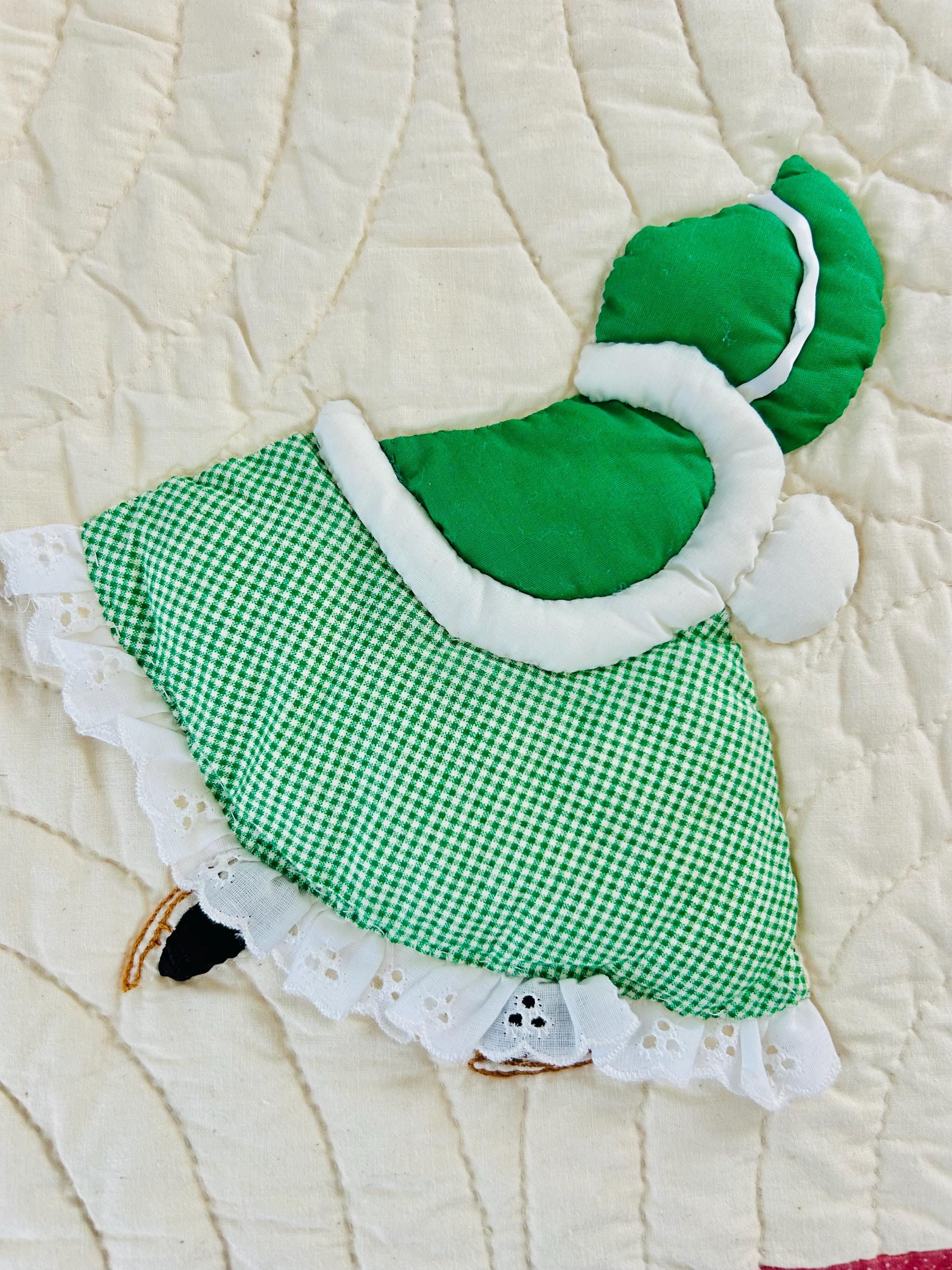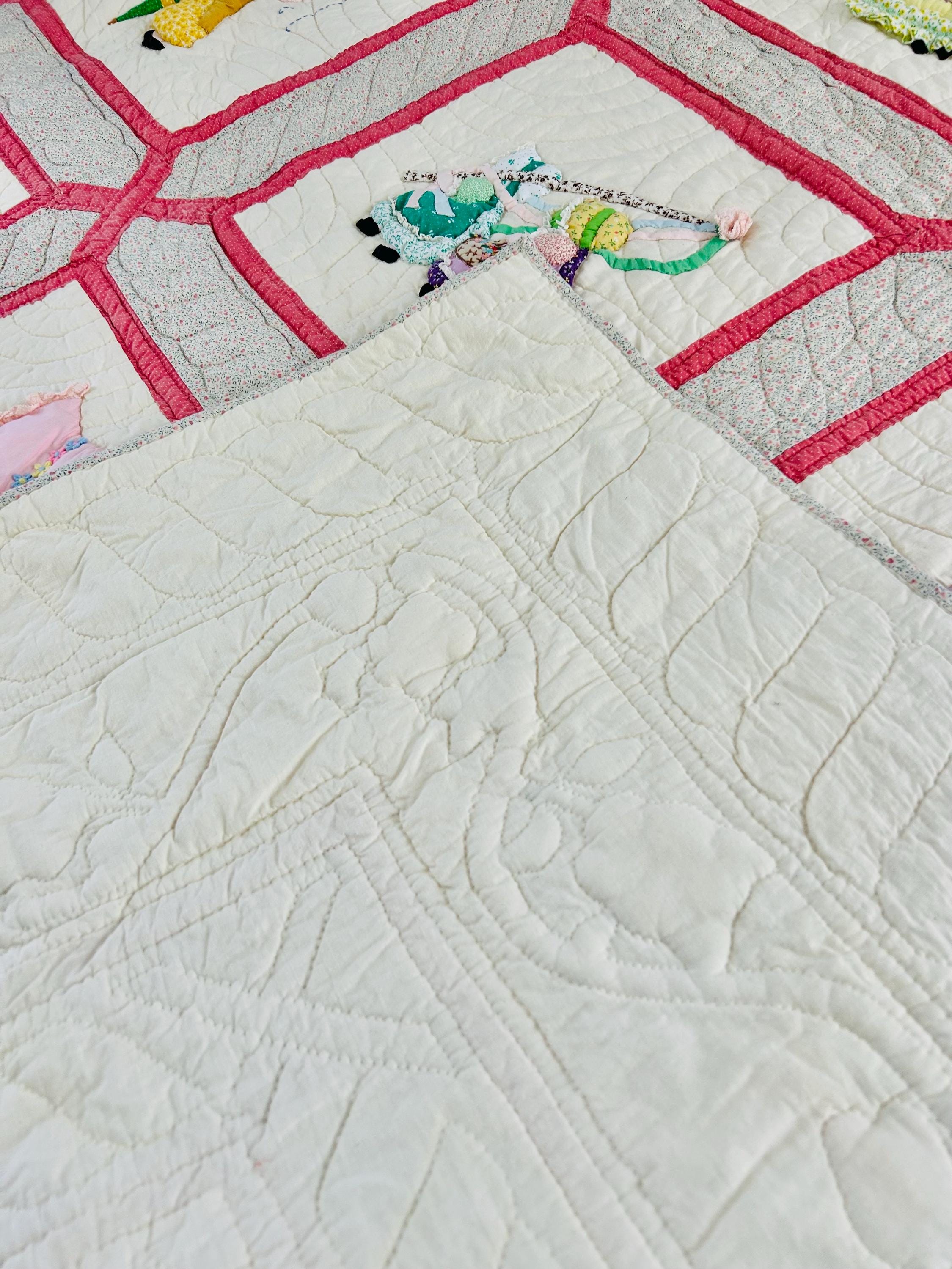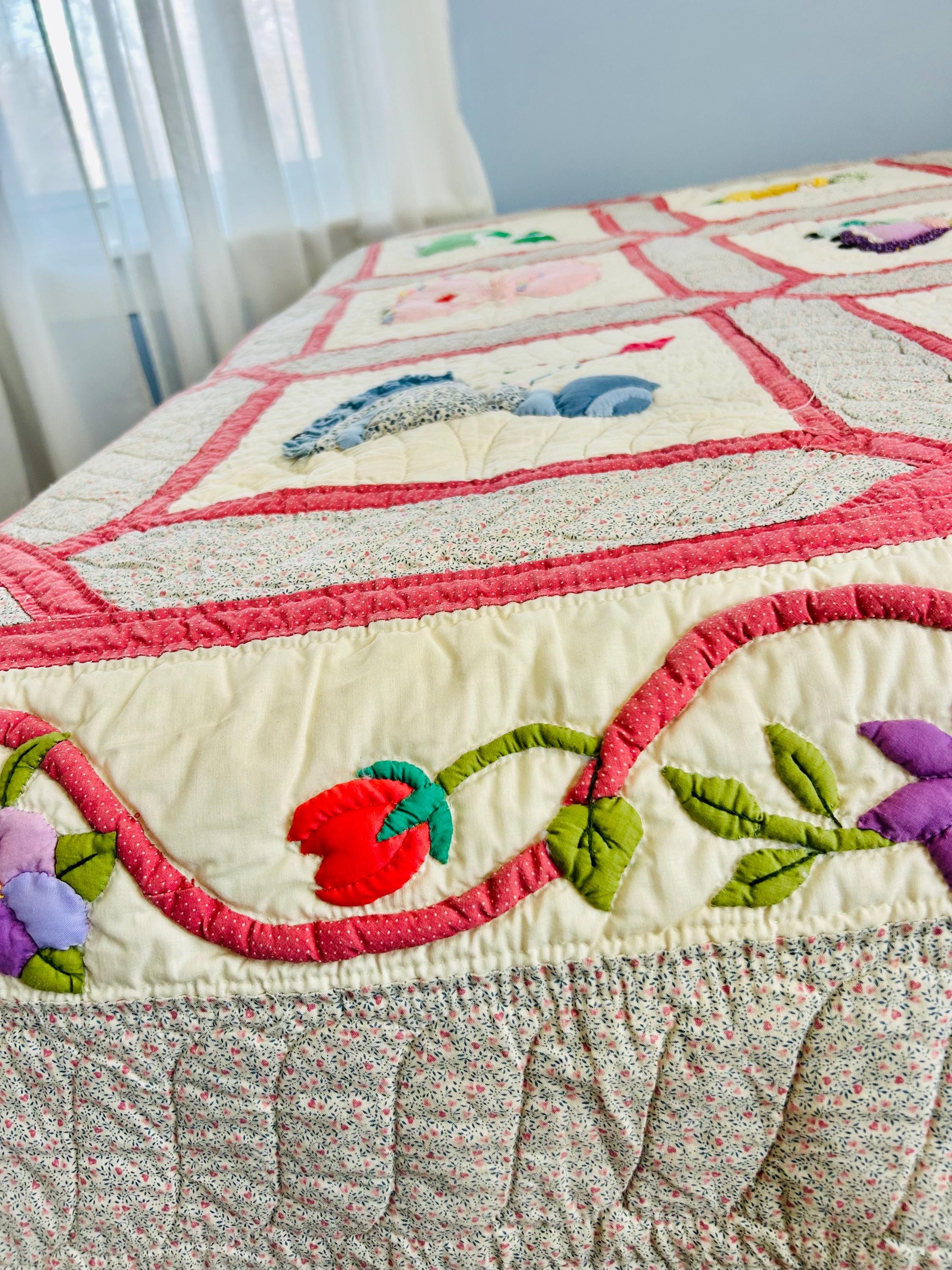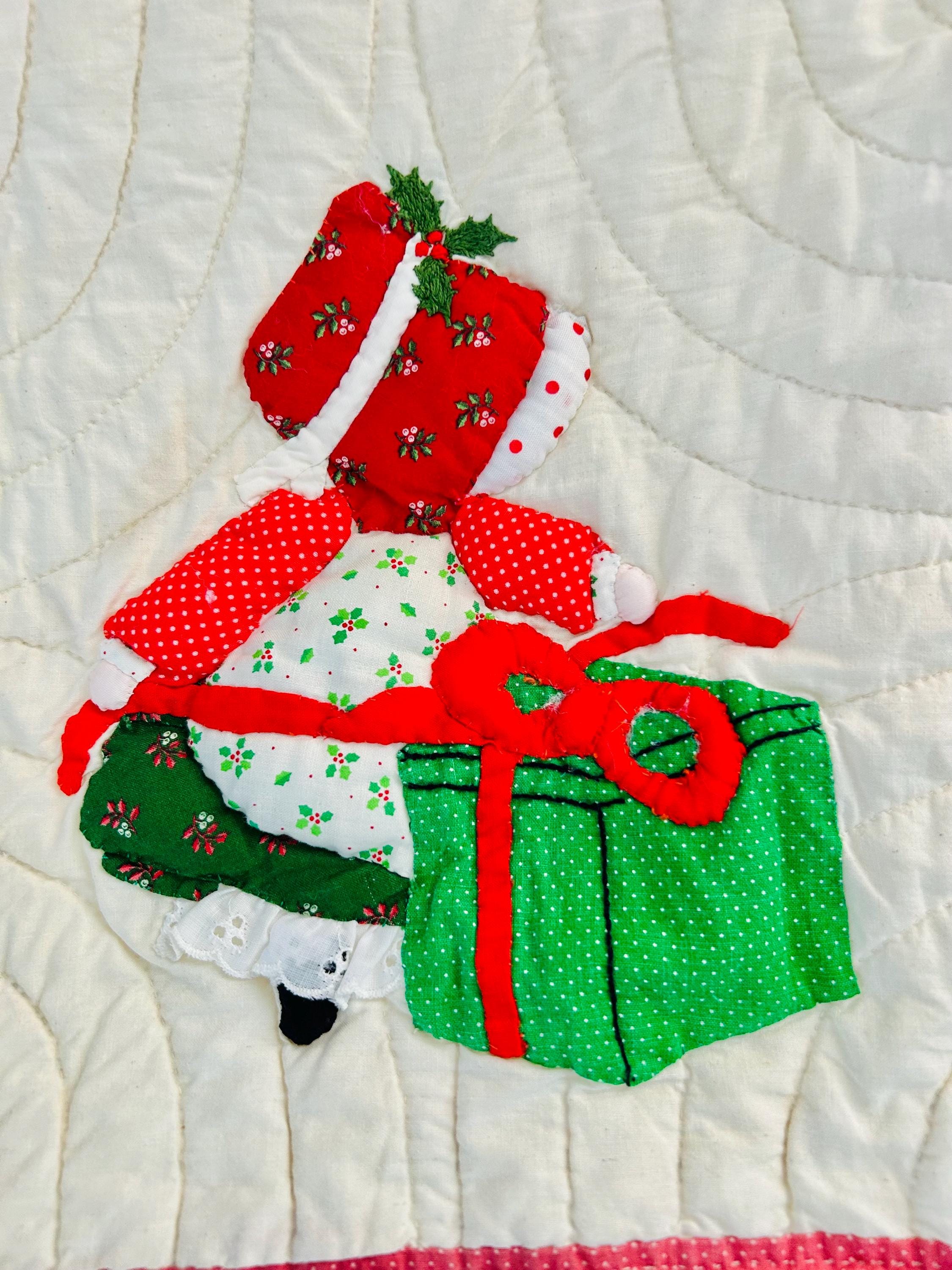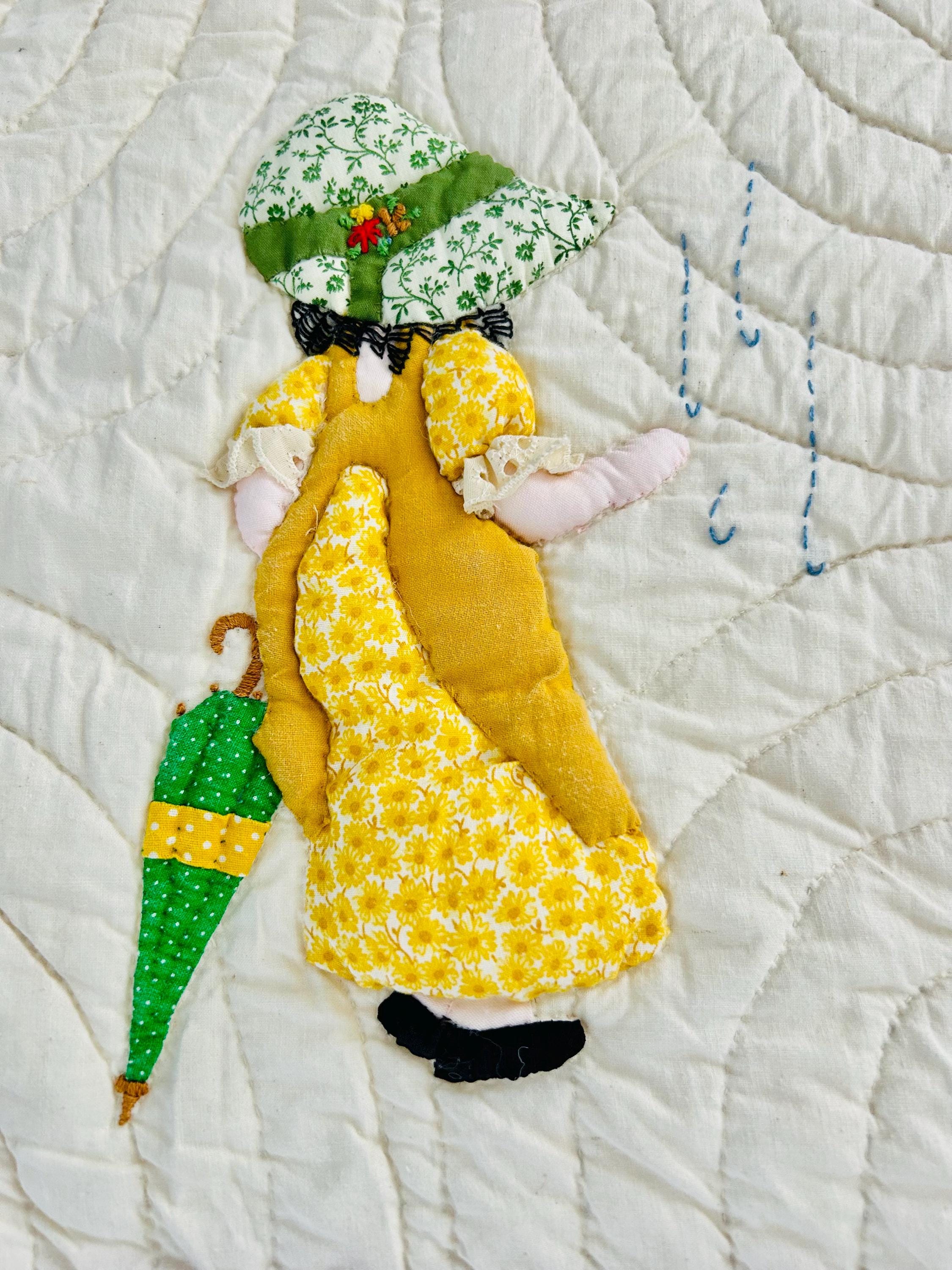 Details • Size: 72” x 92” • Date: 1970s • Pattern: Sunbonnet Sue variation (embellished / dimensional appliqué) • Materials: Cotton fabrics with stuffed appliqué and decorative trims • Construction: Hand-appliquéd and hand-quilted • Batting: Lightweight cotton