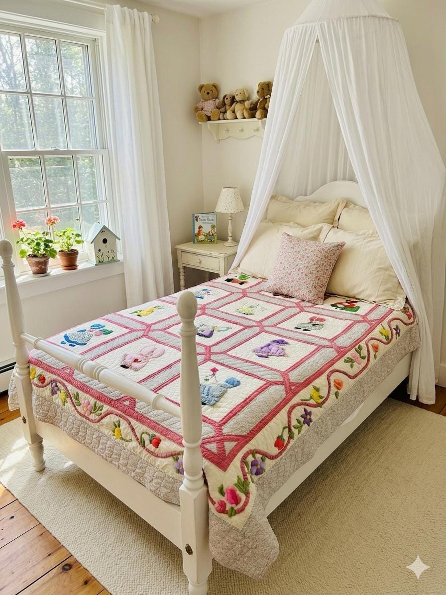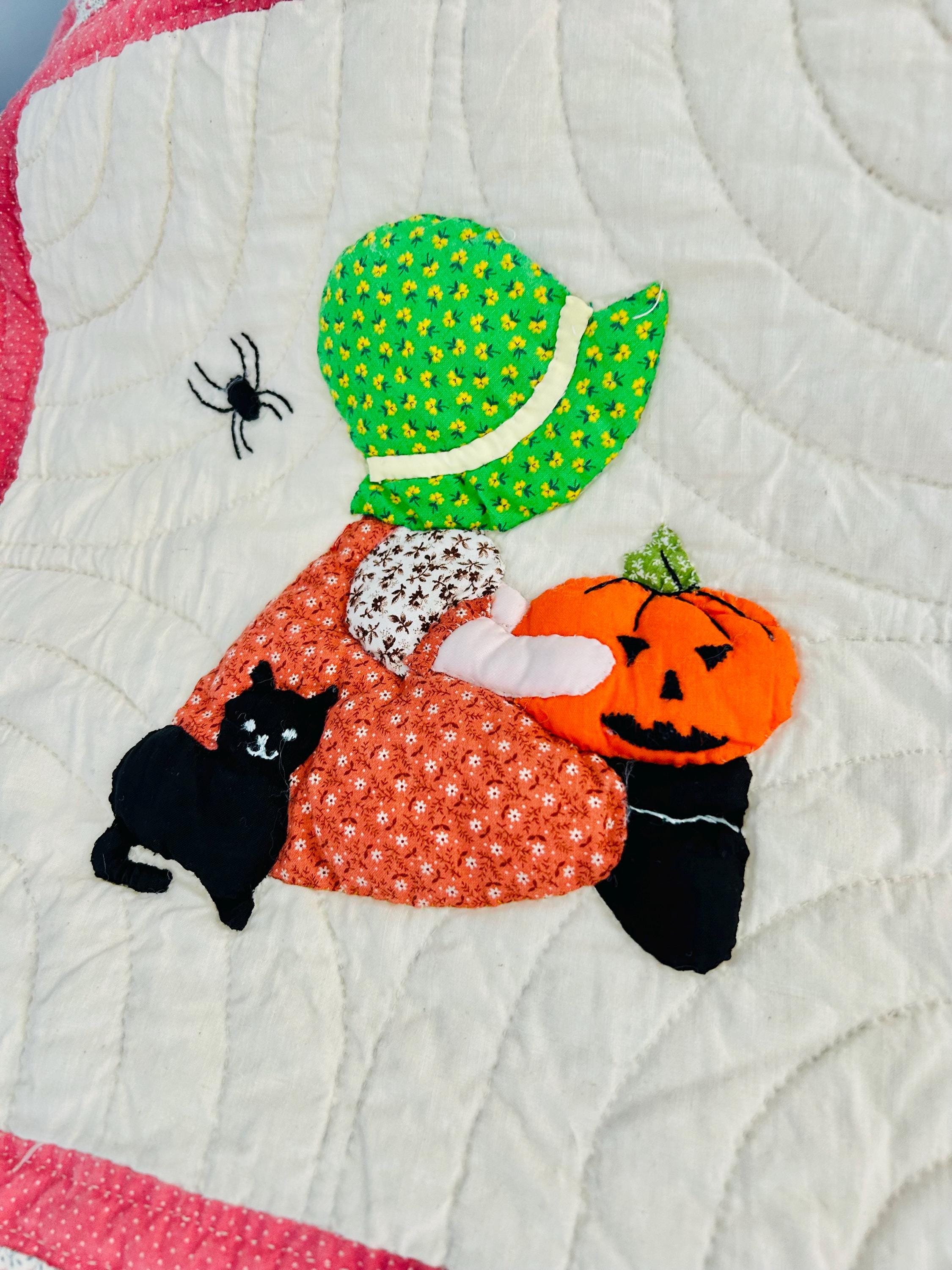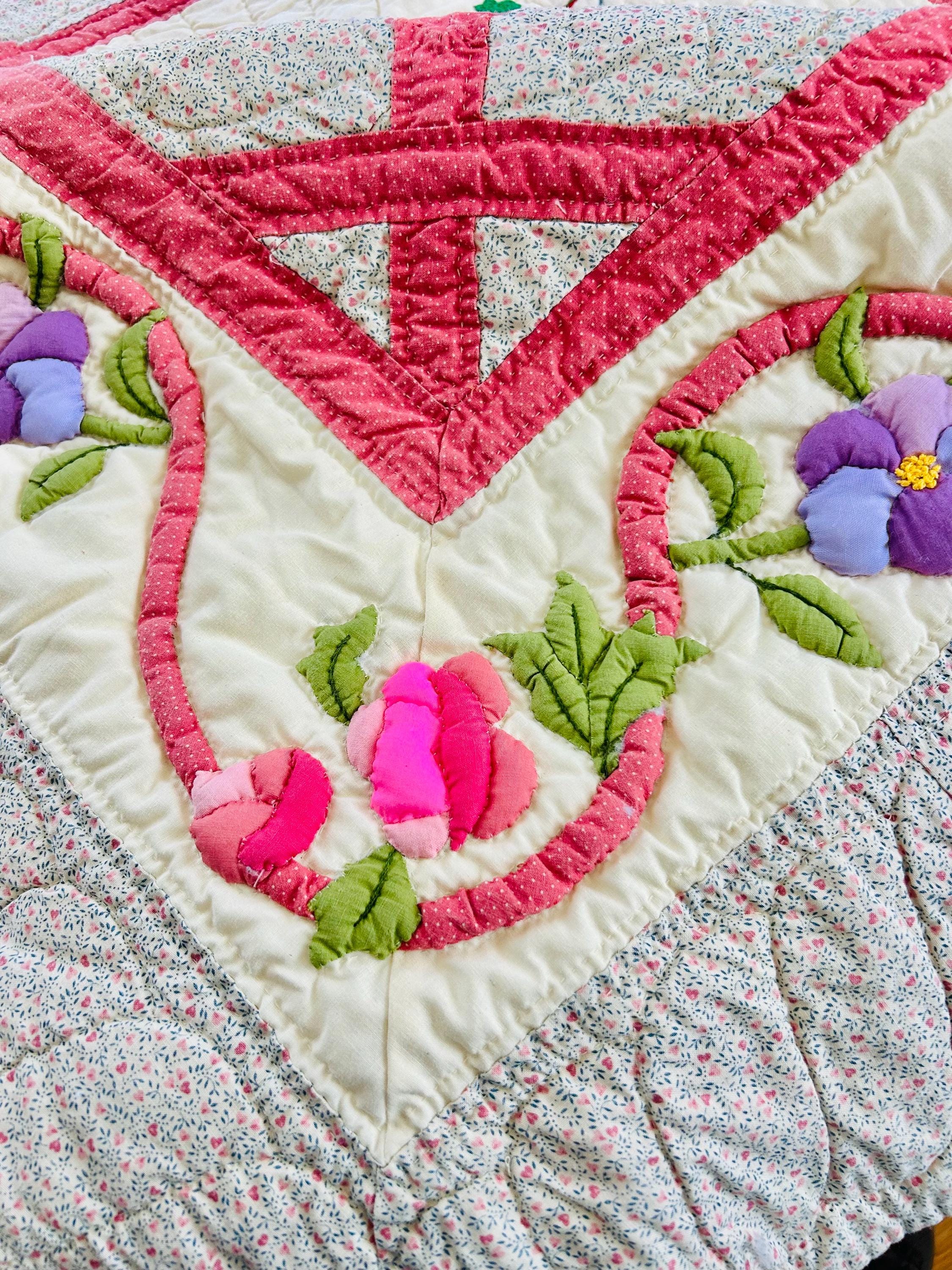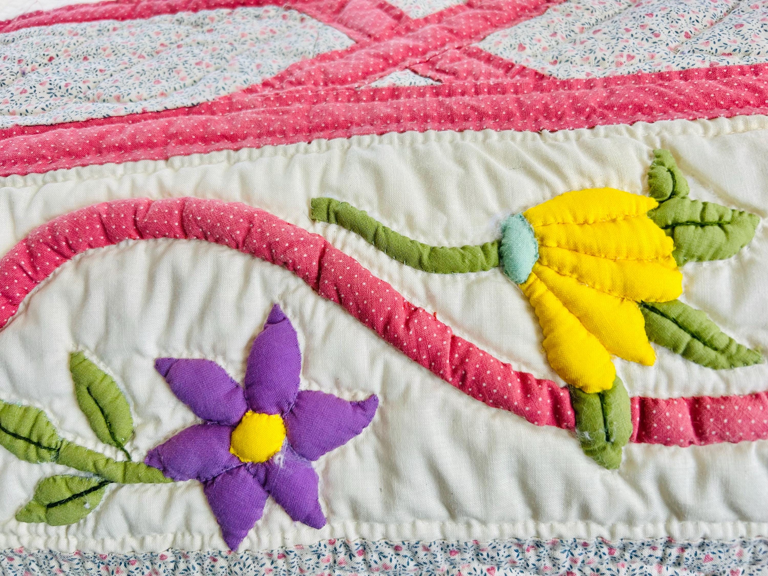 Details • Size: 72” x 92” • Date: 1970s • Pattern: Sunbonnet Sue variation (embellished / dimensional appliqué) • Materials: Cotton fabrics with stuffed appliqué and decorative trims • Construction: Hand-appliquéd and hand-quilted • Batting: Lightweight cotton