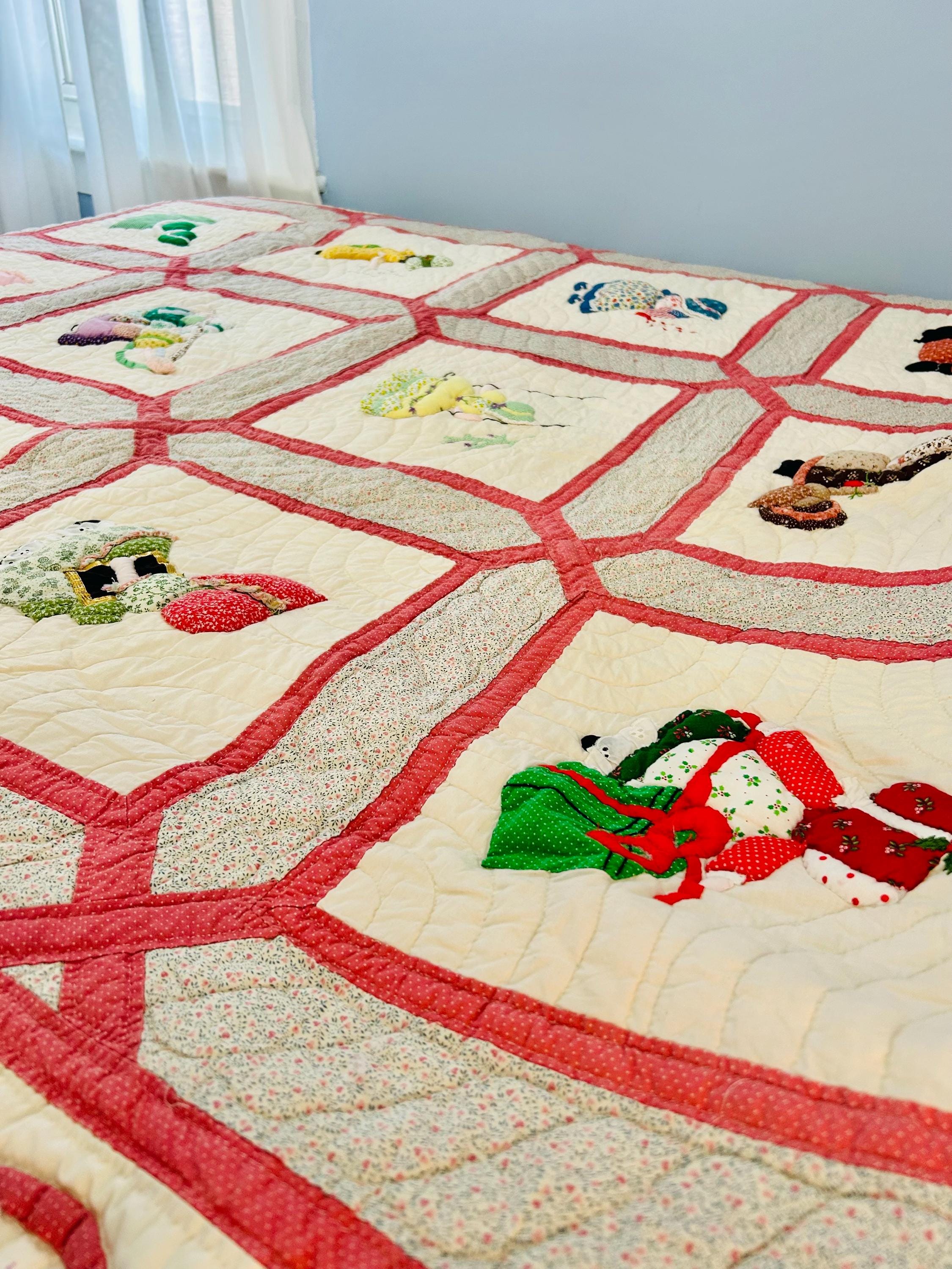 This delightful vintage quilt from the 1970s showcases a highly creative interpretation of the Sunbonnet Sue pattern, featuring dimensional, embellished appliqué Sunbonnet Sues set within a geometric lattice layout with each “Sue” uniquely dressed and posed.