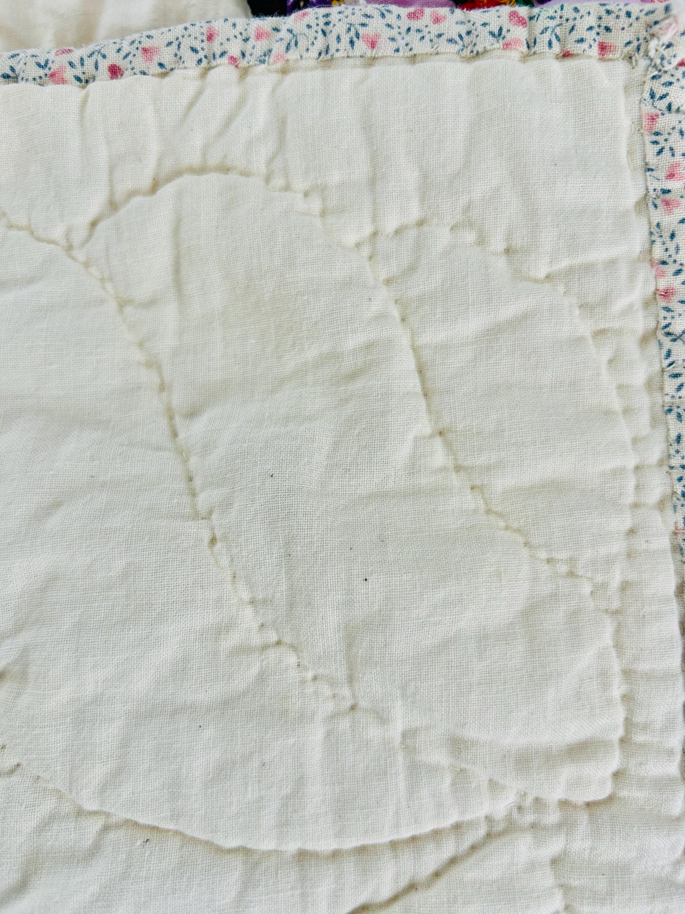 The back is cream/white cotton while the binding is a tiny cotton print that has been machine-stitched to the front and hand-stitched to the back. The cotton batting is lightweight.
