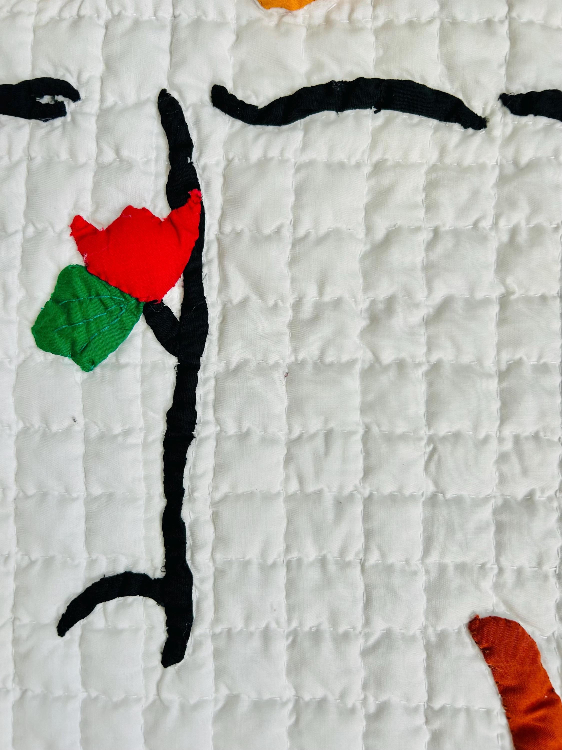 • Construction: Hand-appliquéd and padded figures with hand-guided quilting and hand-quilting in cross-hatch grids