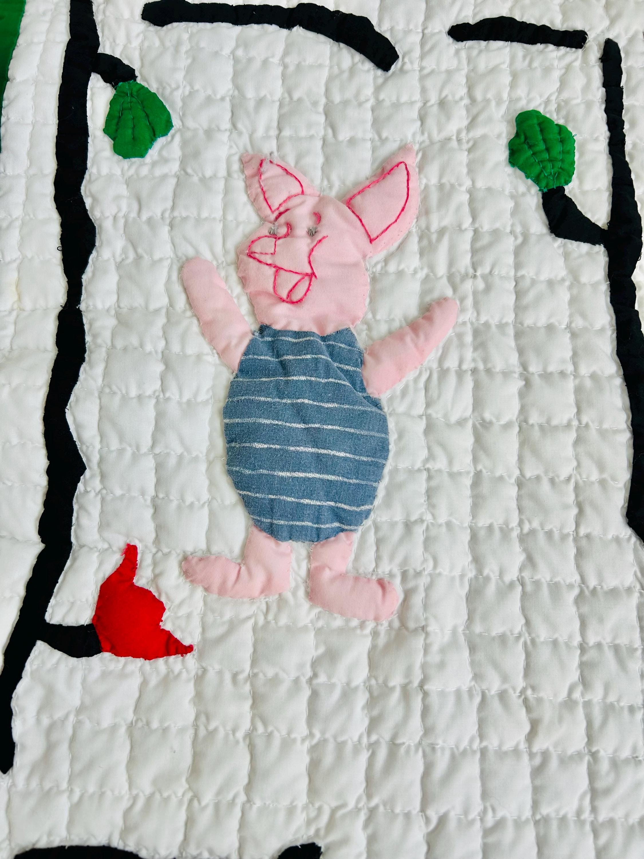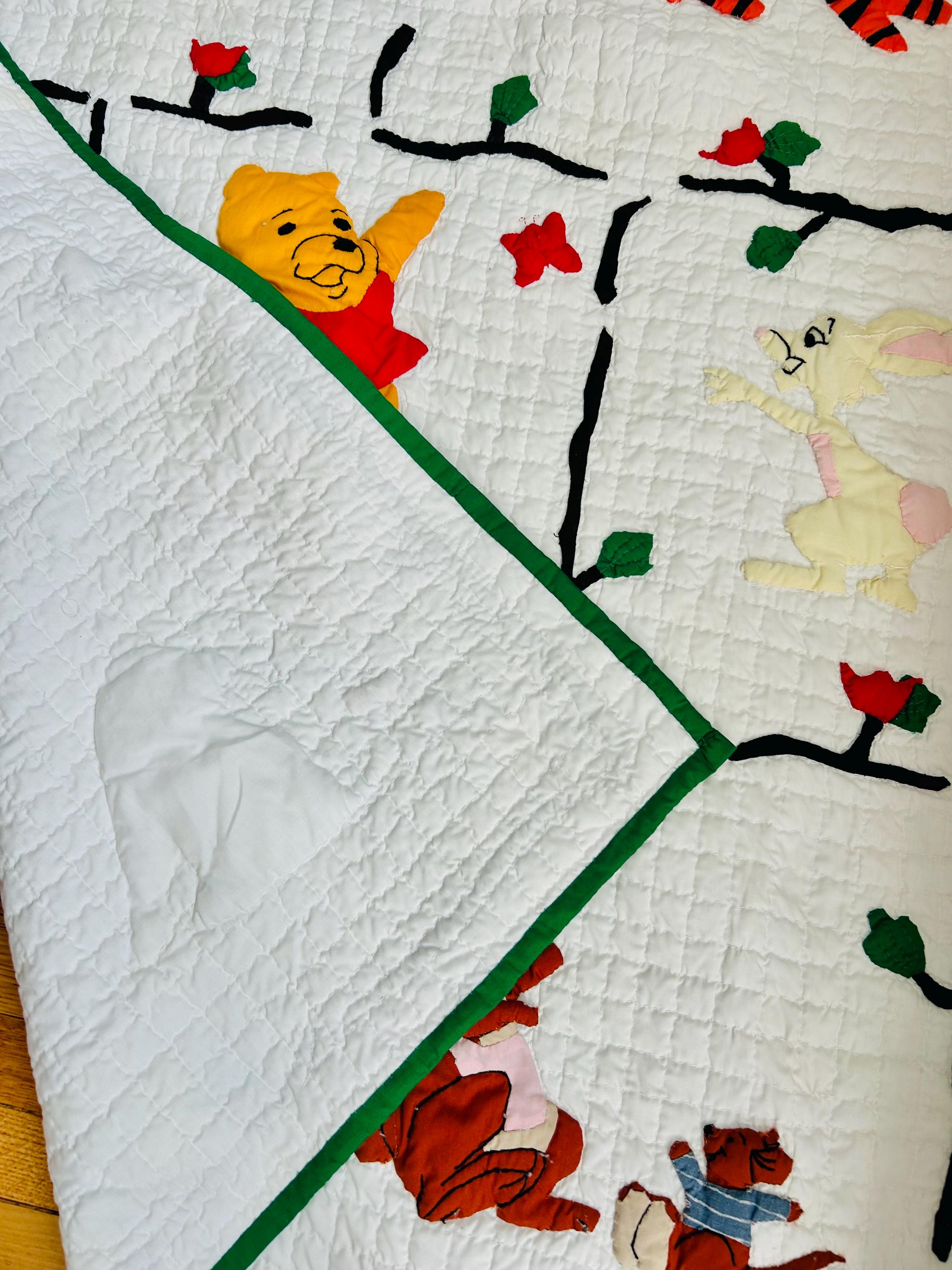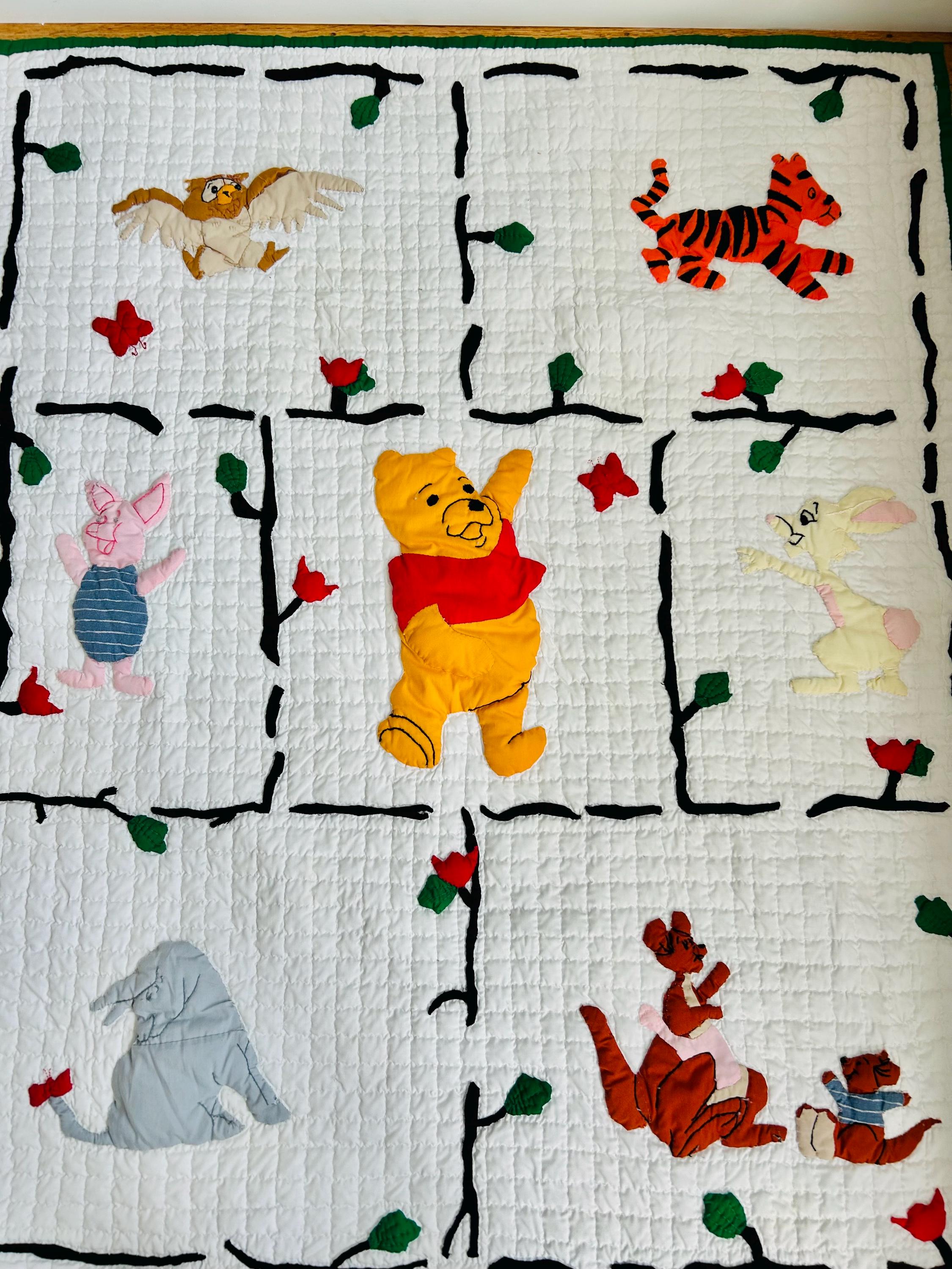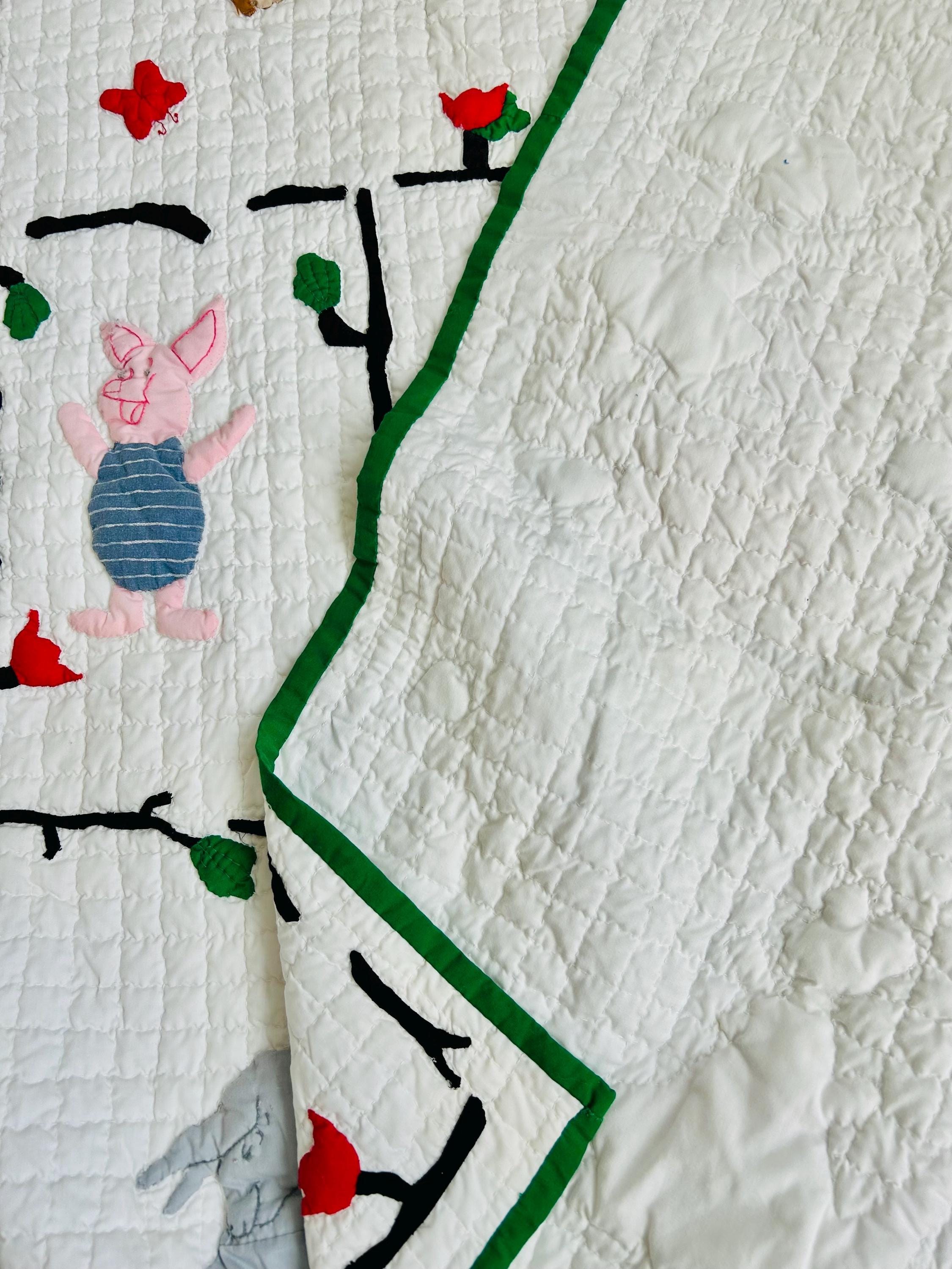 This charming vintage 1990s Winnie the Pooh Quilt is set in the Hundred Acre Wood with Pooh, Tigger, Piglet, Rabbit, Kanga & Roo, and Eeyore, each detailed with stuffed appliqué and hand-embroidery. It is all set against a crisp white background with whimsical black tree branches along with green leaves, and bright red blossoms. The hand-quilting is in an all over cross-hatch grid.