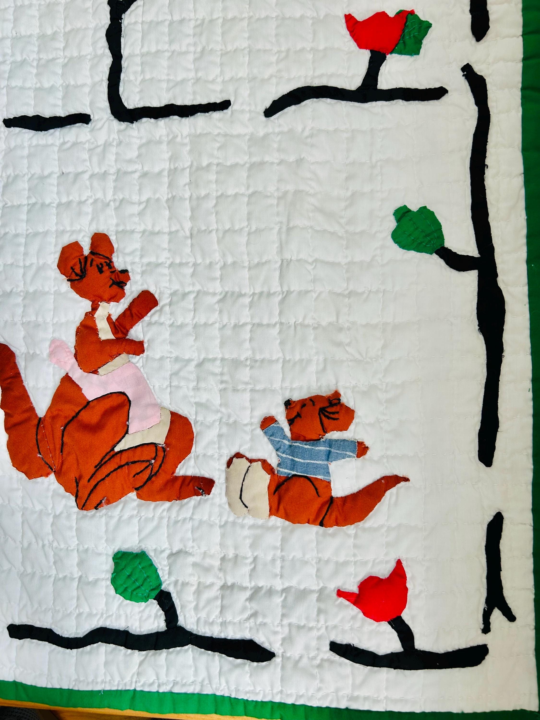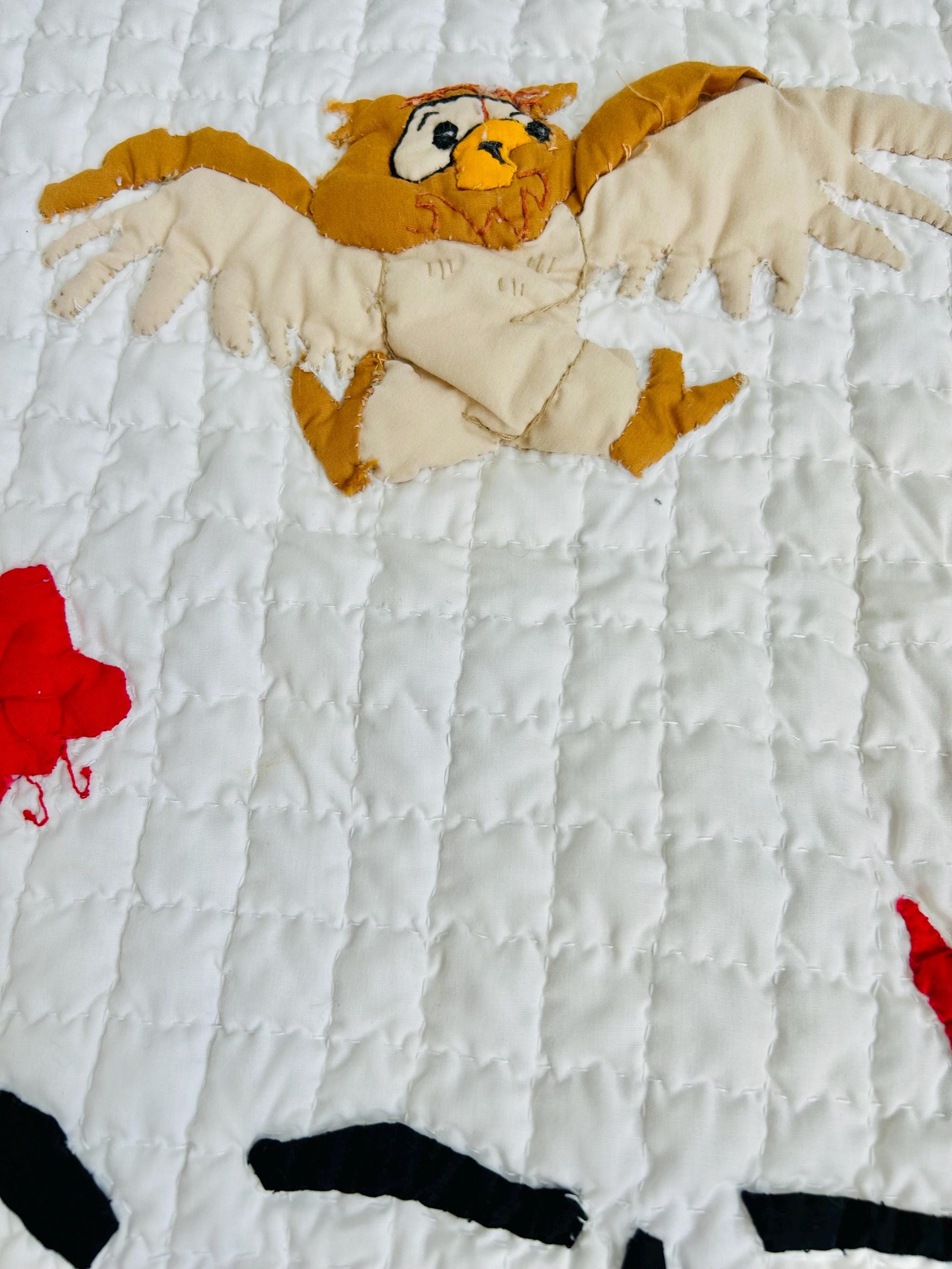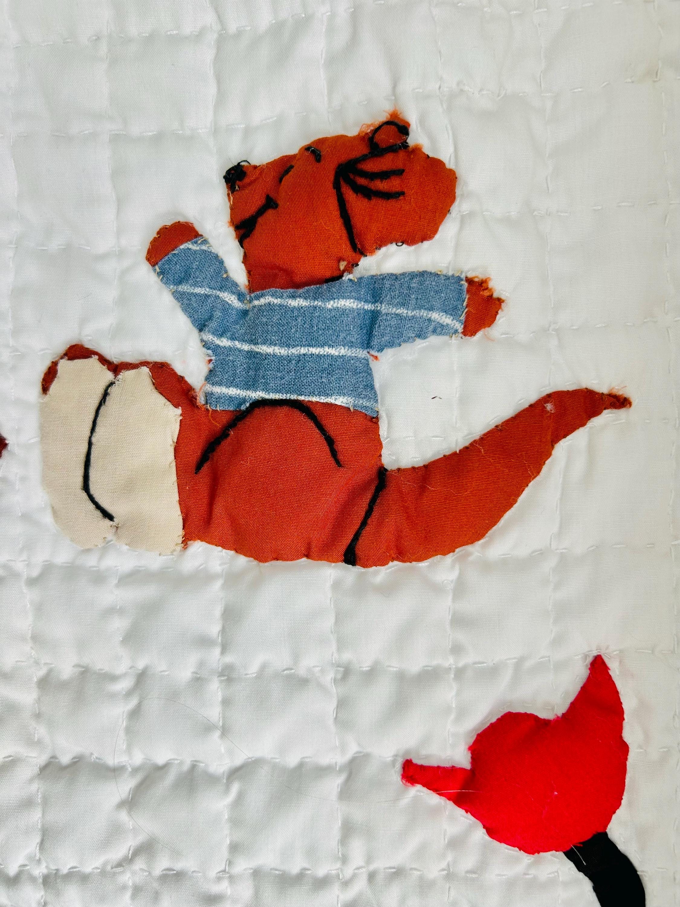 This charming vintage 1990s Winnie the Pooh Quilt is set in the Hundred Acre Wood with Pooh, Tigger, Piglet, Rabbit, Kanga & Roo, and Eeyore, each detailed with stuffed appliqué and hand-embroidery. It is all set against a crisp white background with whimsical black tree branches along with green leaves, and bright red blossoms. The hand-quilting is in an all over cross-hatch grid.