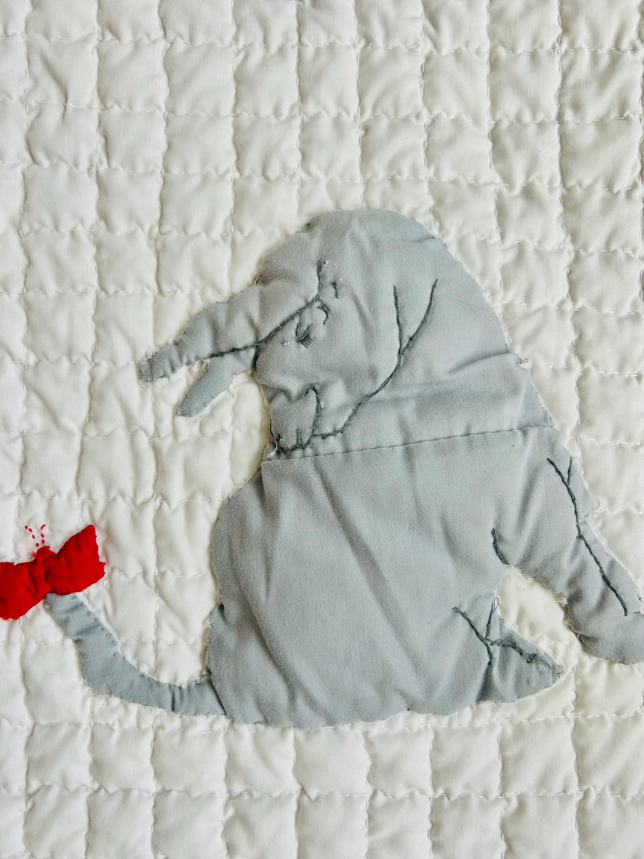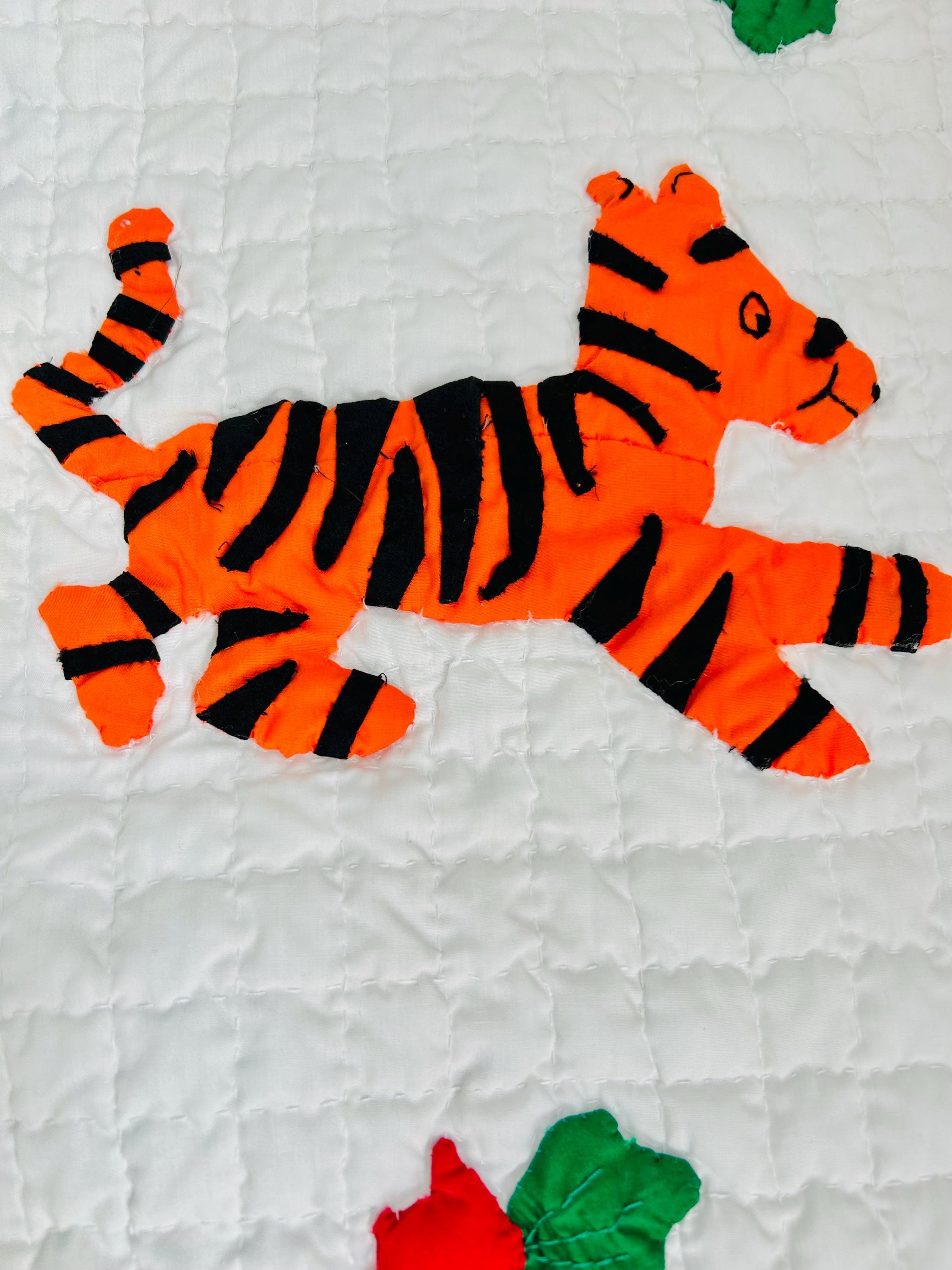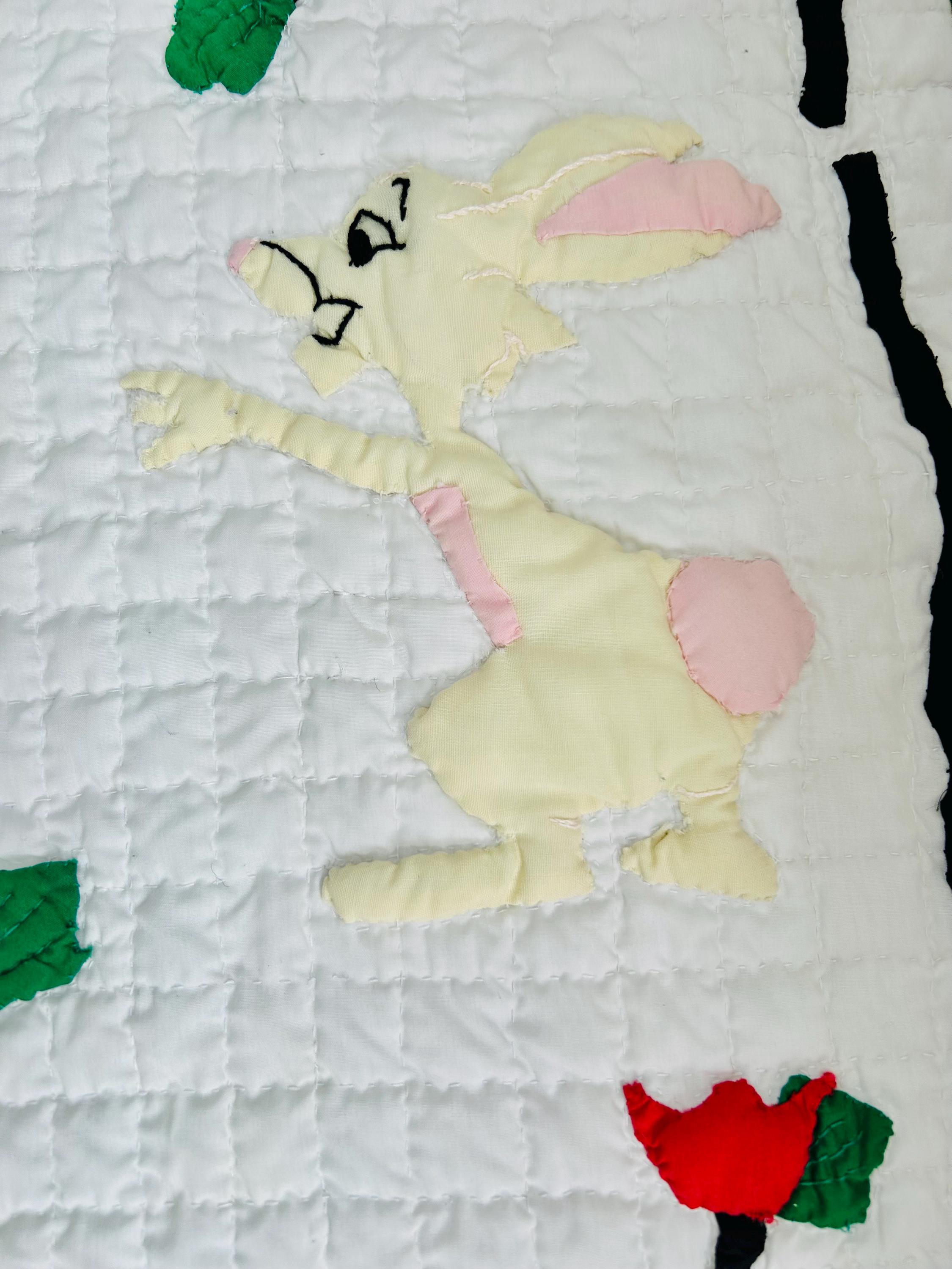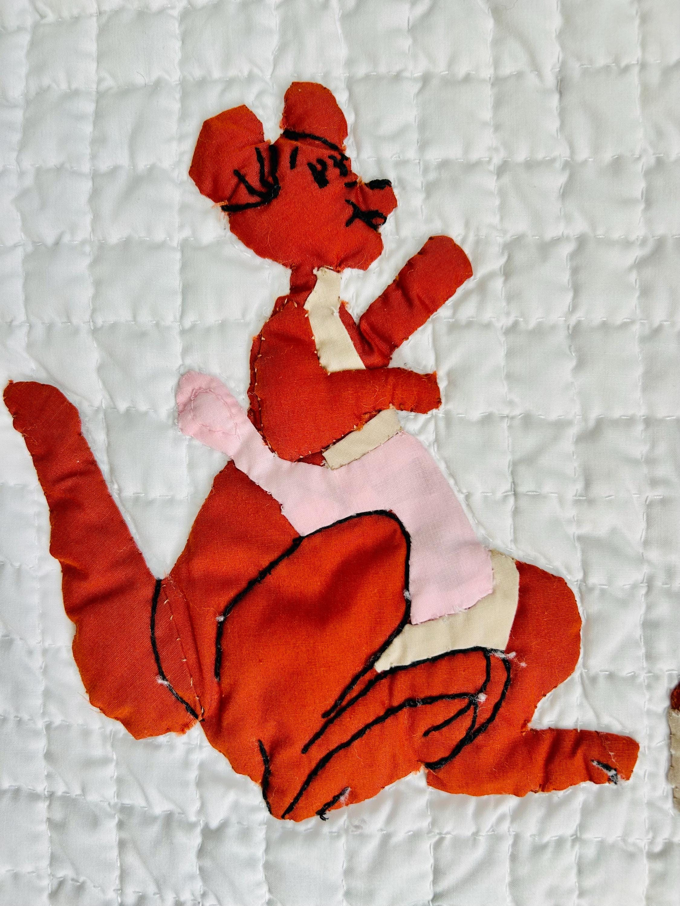 This charming vintage 1990s Winnie the Pooh Quilt is set in the Hundred Acre Wood with Pooh, Tigger, Piglet, Rabbit, Kanga & Roo, and Eeyore, each detailed with stuffed appliqué and hand-embroidery. It is all set against a crisp white background with whimsical black tree branches along with green leaves, and bright red blossoms. The hand-quilting is in an all over cross-hatch grid.