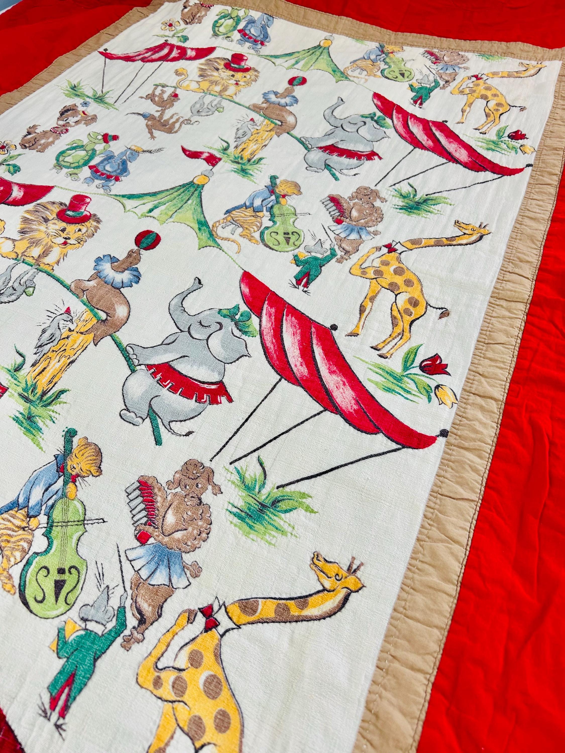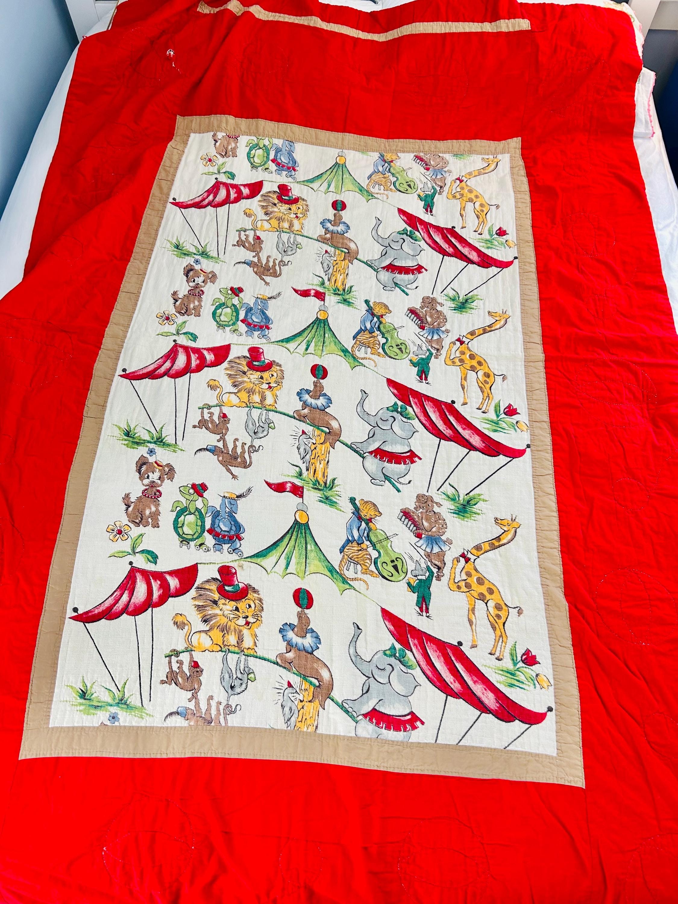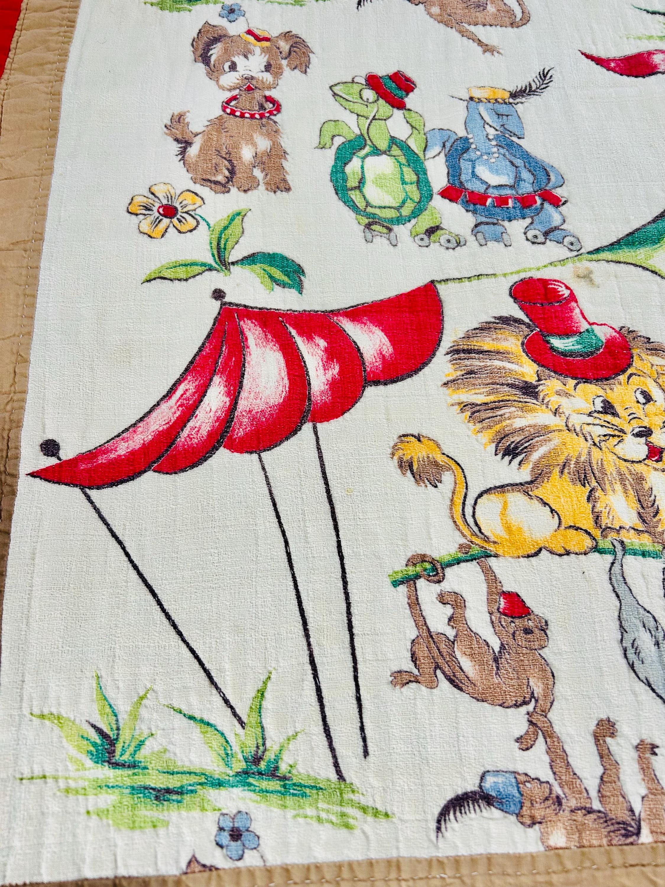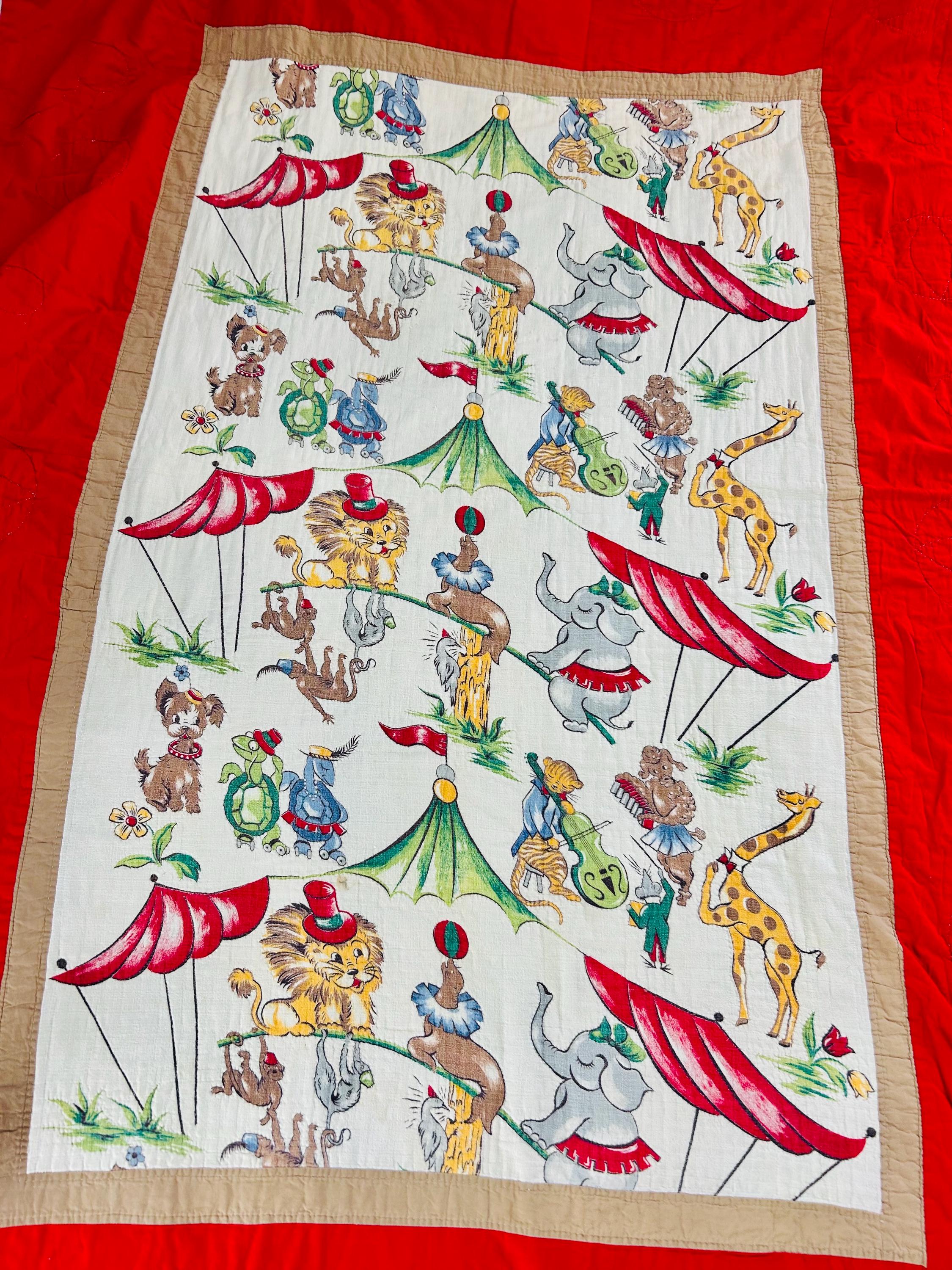 This retro child's quilt has a mid-century aesthetic and is circa 1960s-1970s. It features a circus-themed print filled with animals, including lions, elephants, giraffes, seals, cats and other animals balancing balls, playing instruments, dancing and playing, all in bright colors framed by a vivid red border.