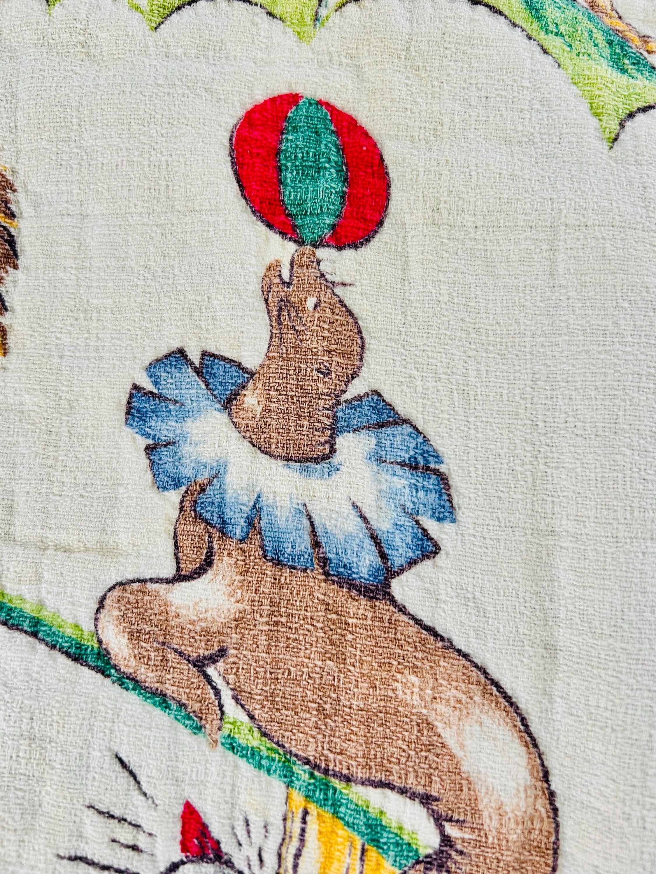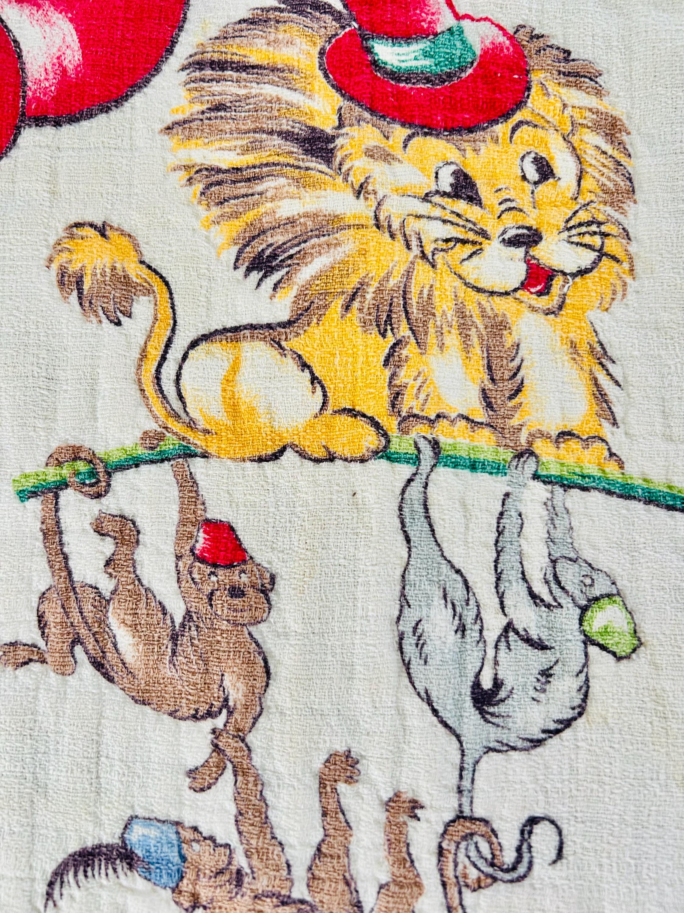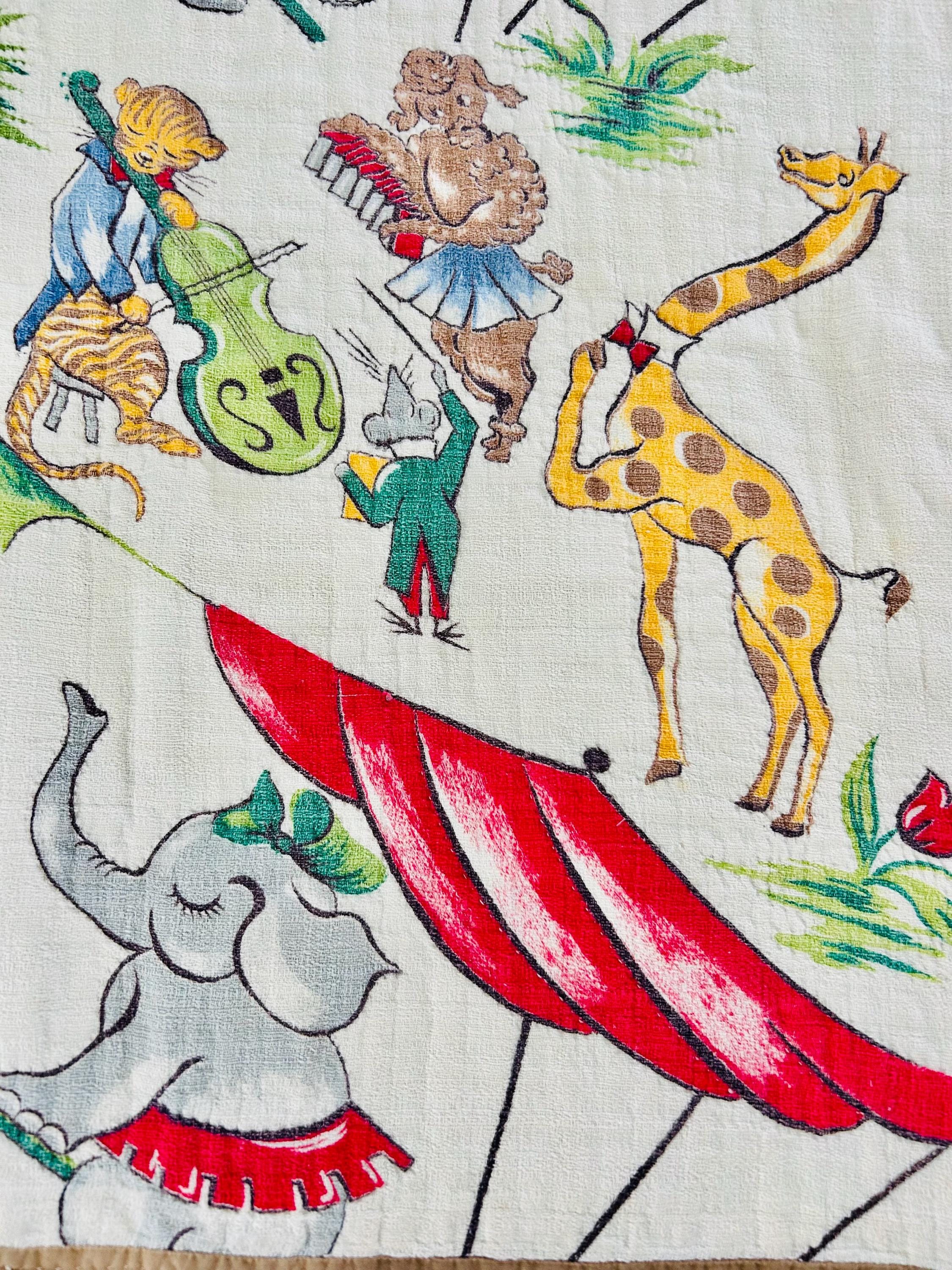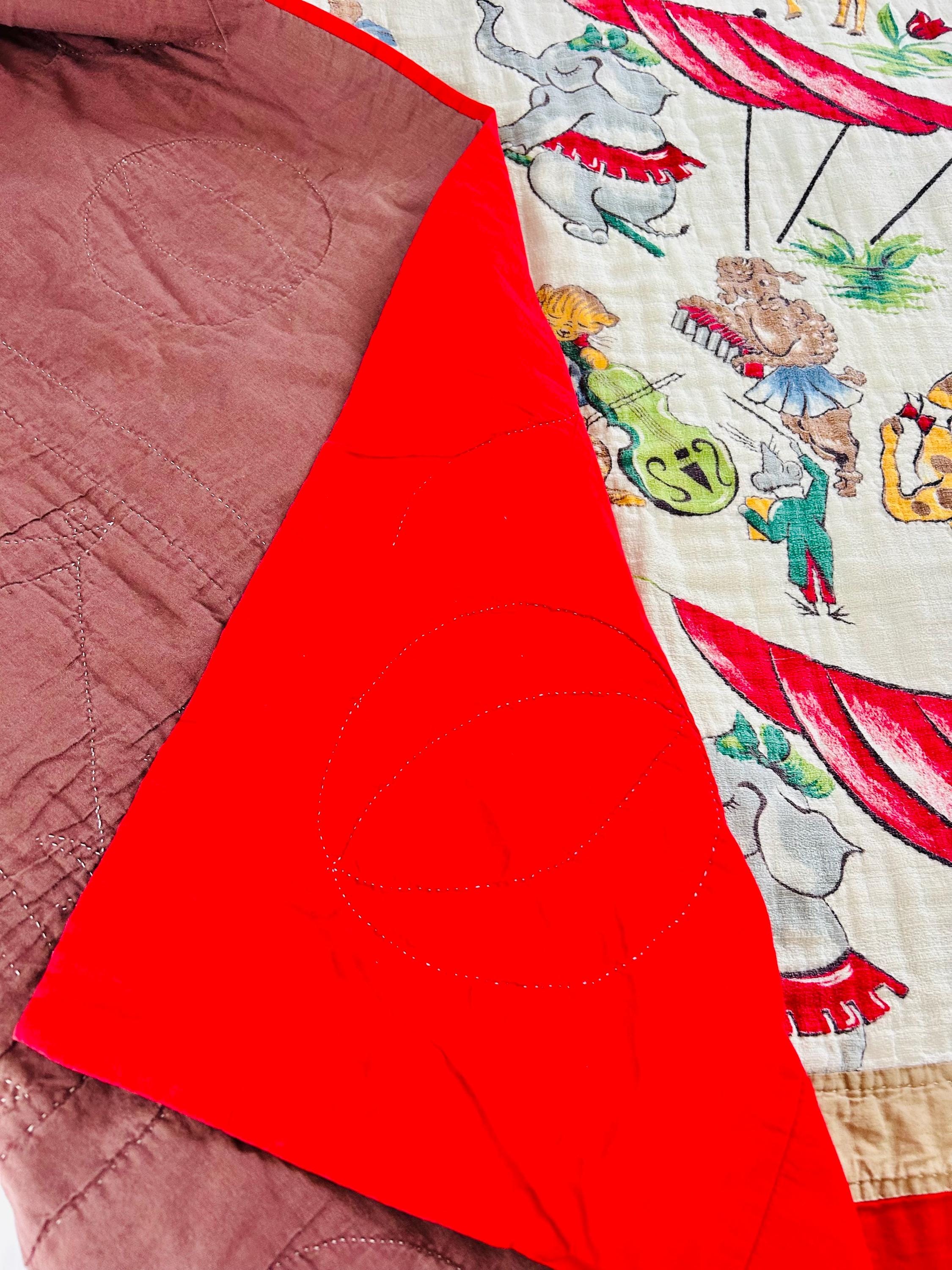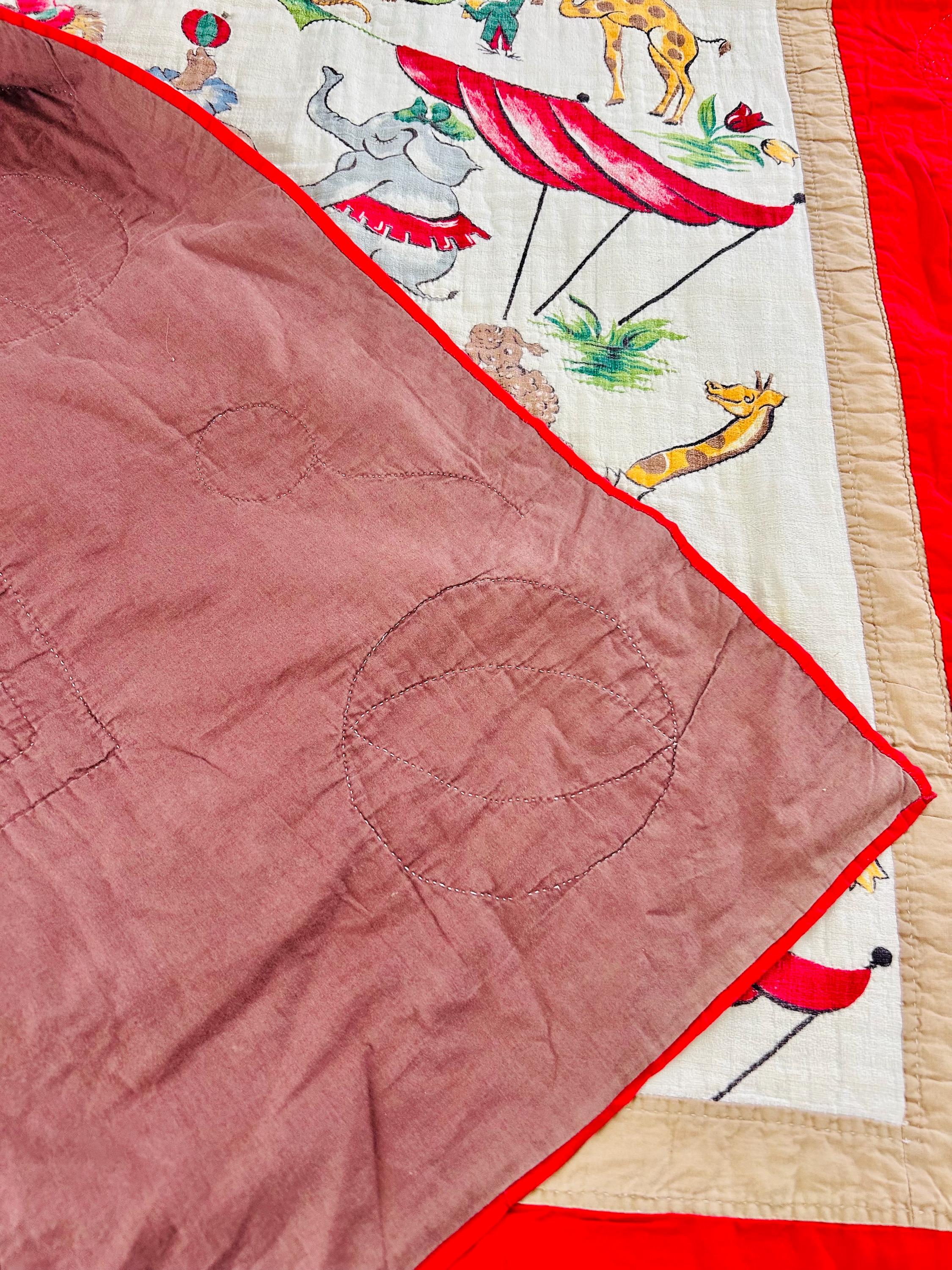 This retro child's quilt has a mid-century aesthetic and is circa 1960s-1970s. It features a circus-themed print filled with animals, including lions, elephants, giraffes, seals, cats and other animals balancing balls, playing instruments, dancing and playing, all in bright colors framed by a vivid red border.