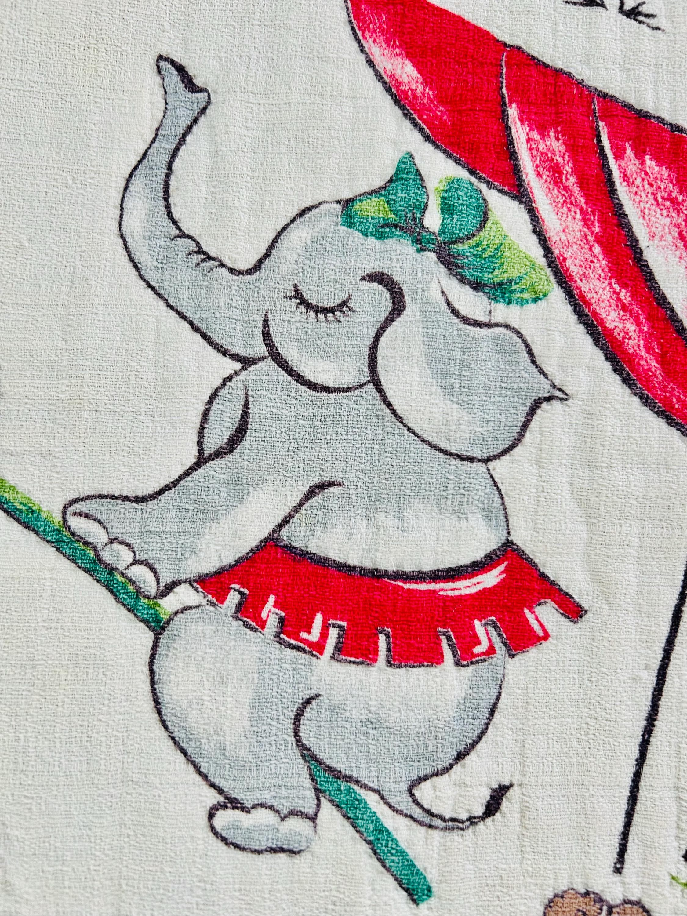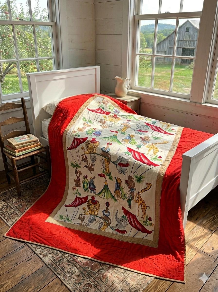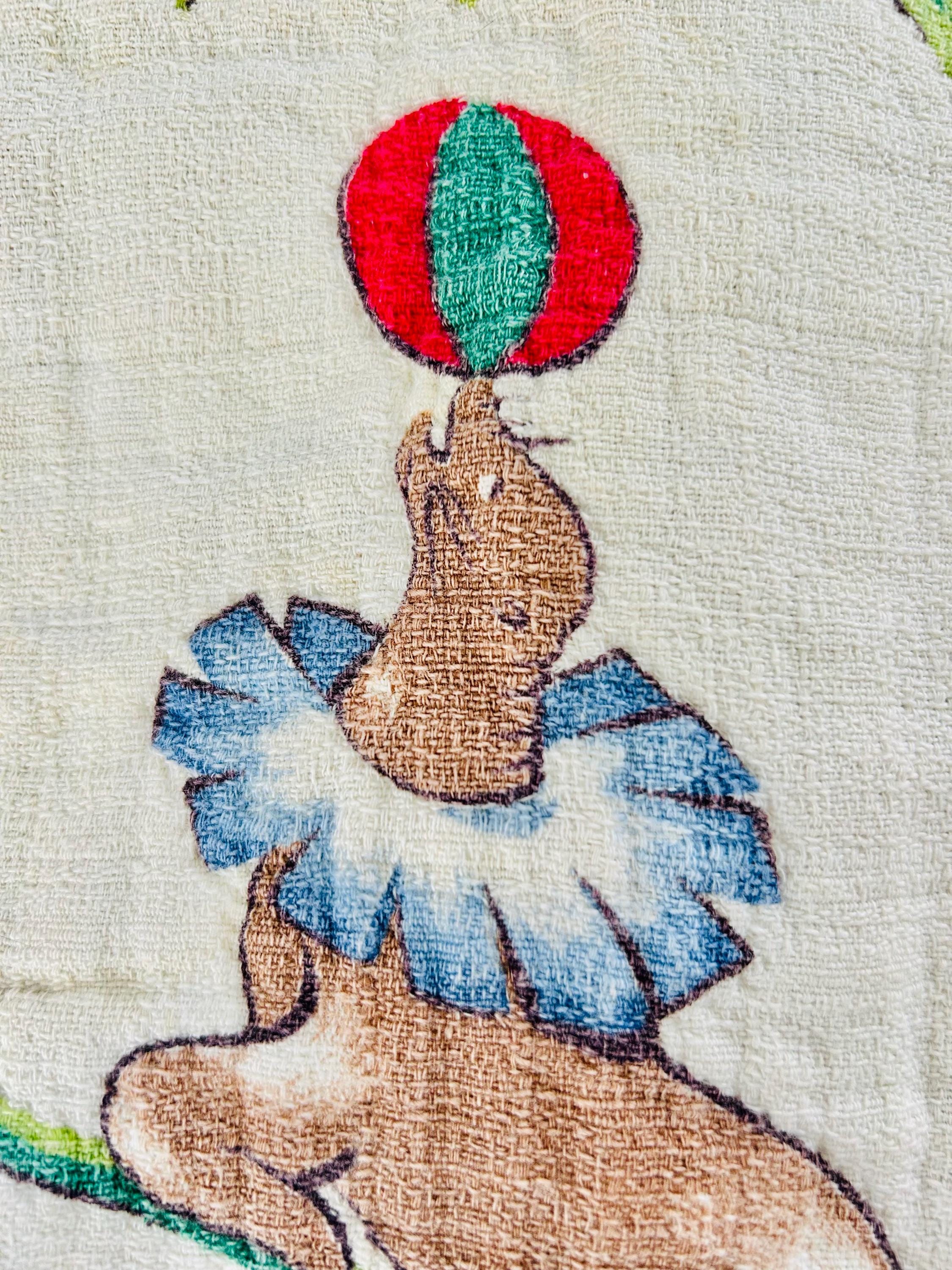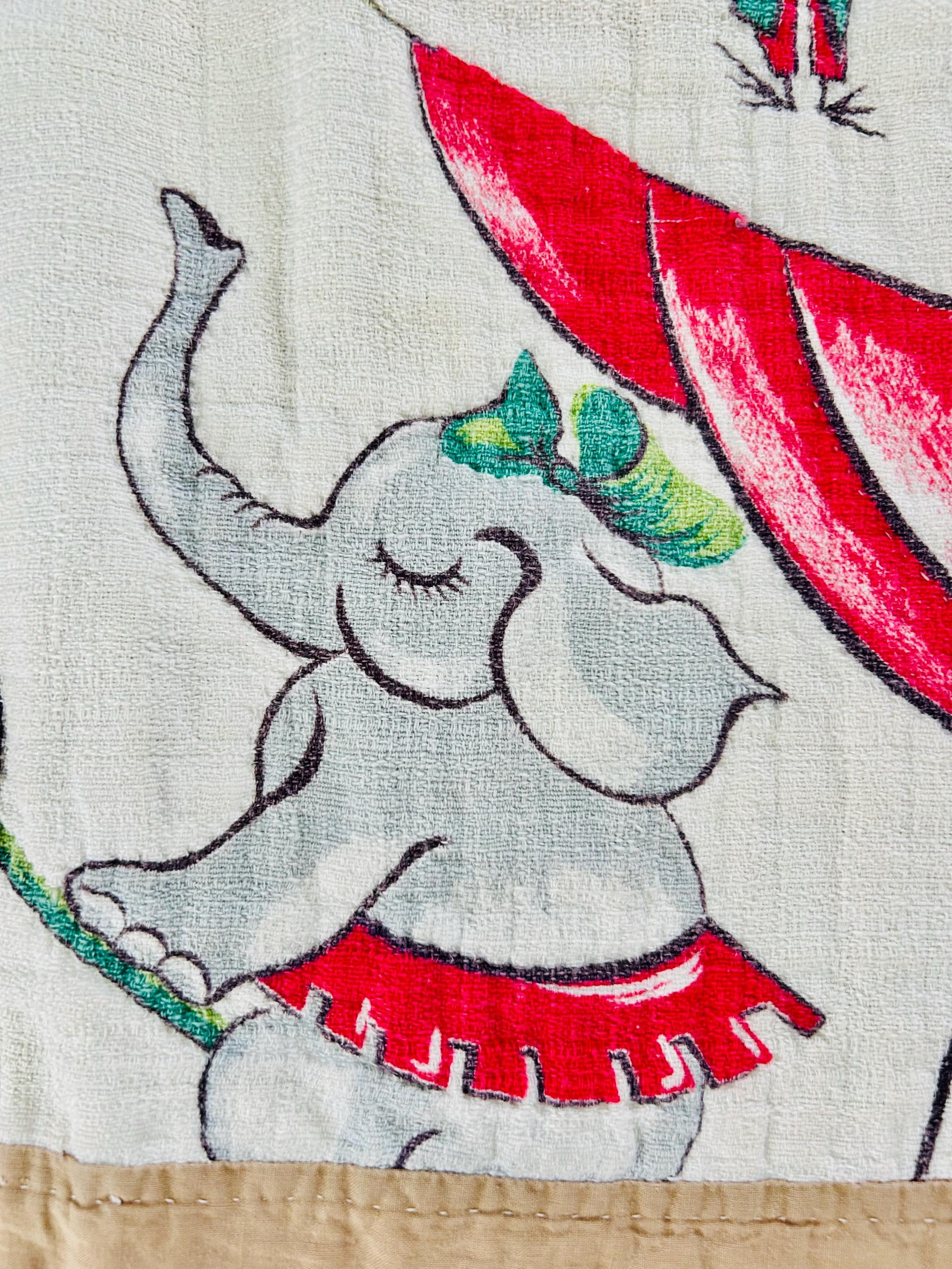 This retro child's quilt has a mid-century aesthetic and is circa 1960s-1970s. It features a circus-themed print filled with animals, including lions, elephants, giraffes, seals, cats and other animals balancing balls, playing instruments, dancing and playing, all in bright colors framed by a vivid red border.