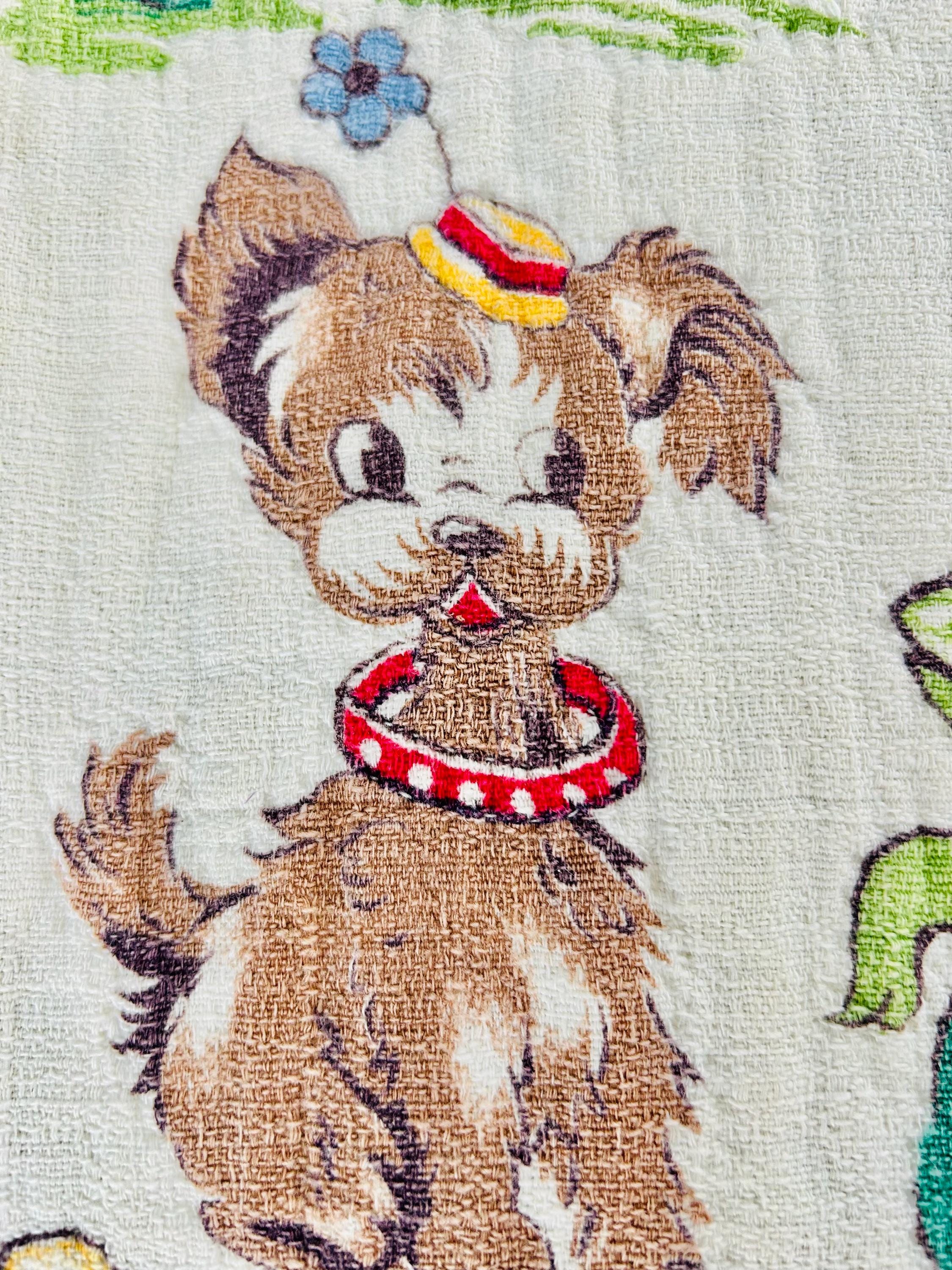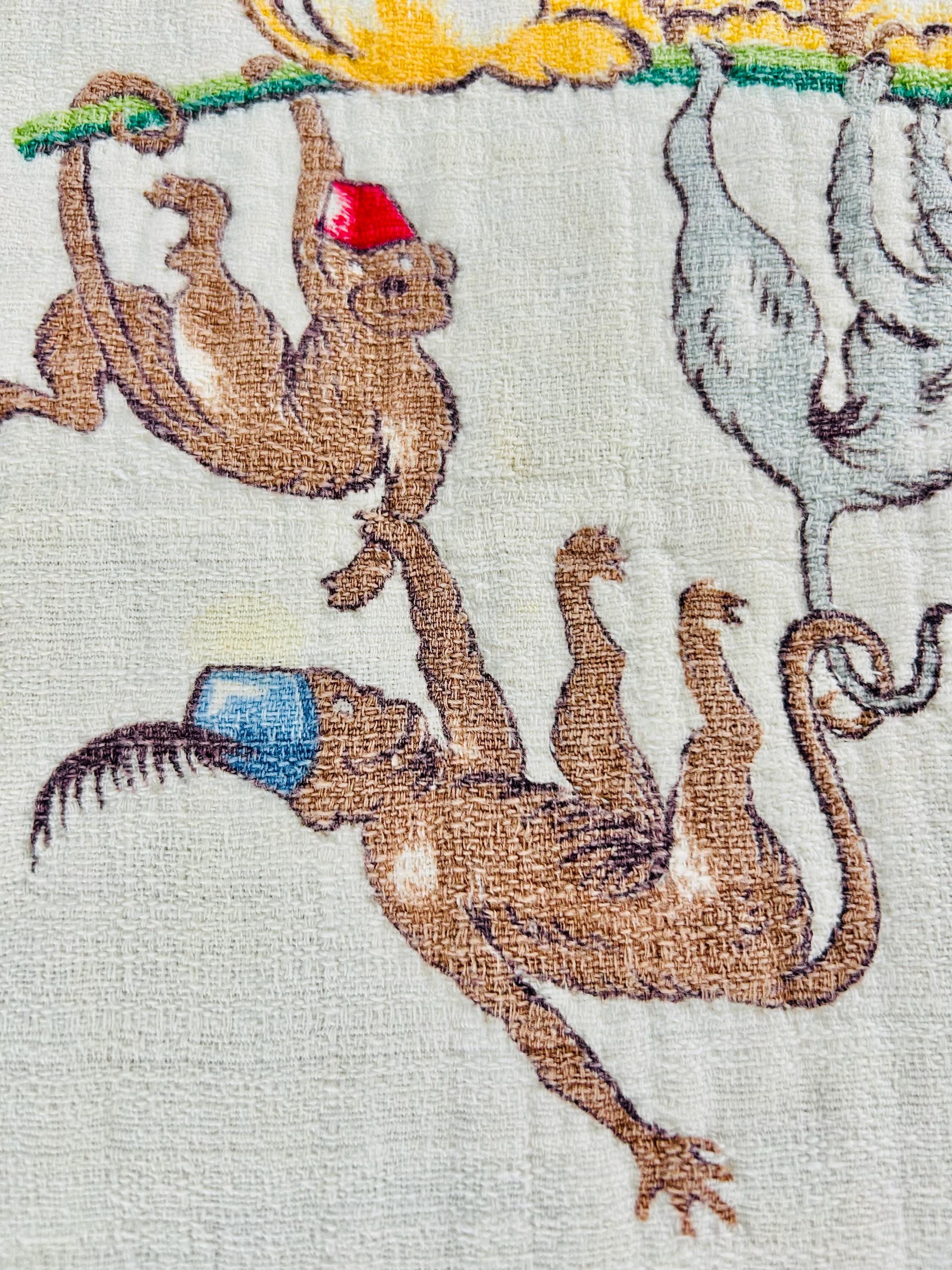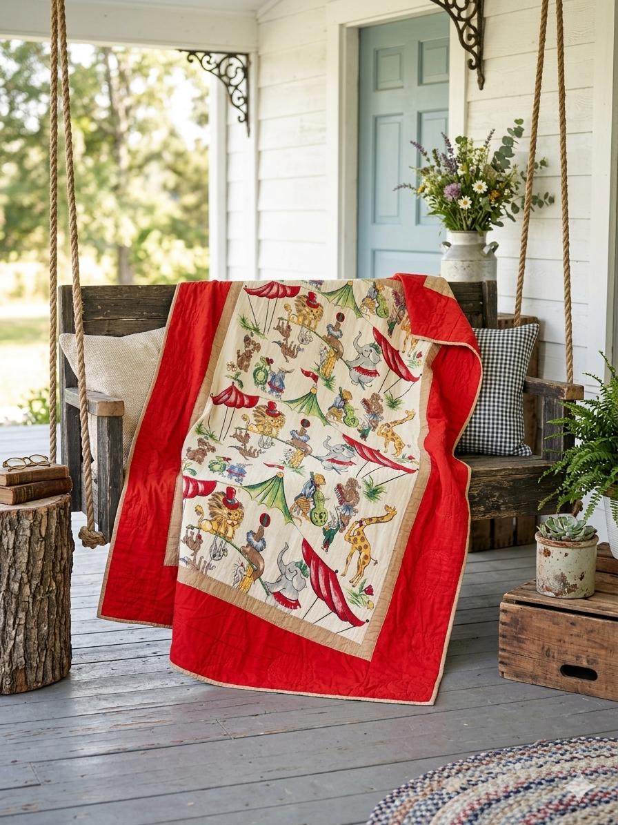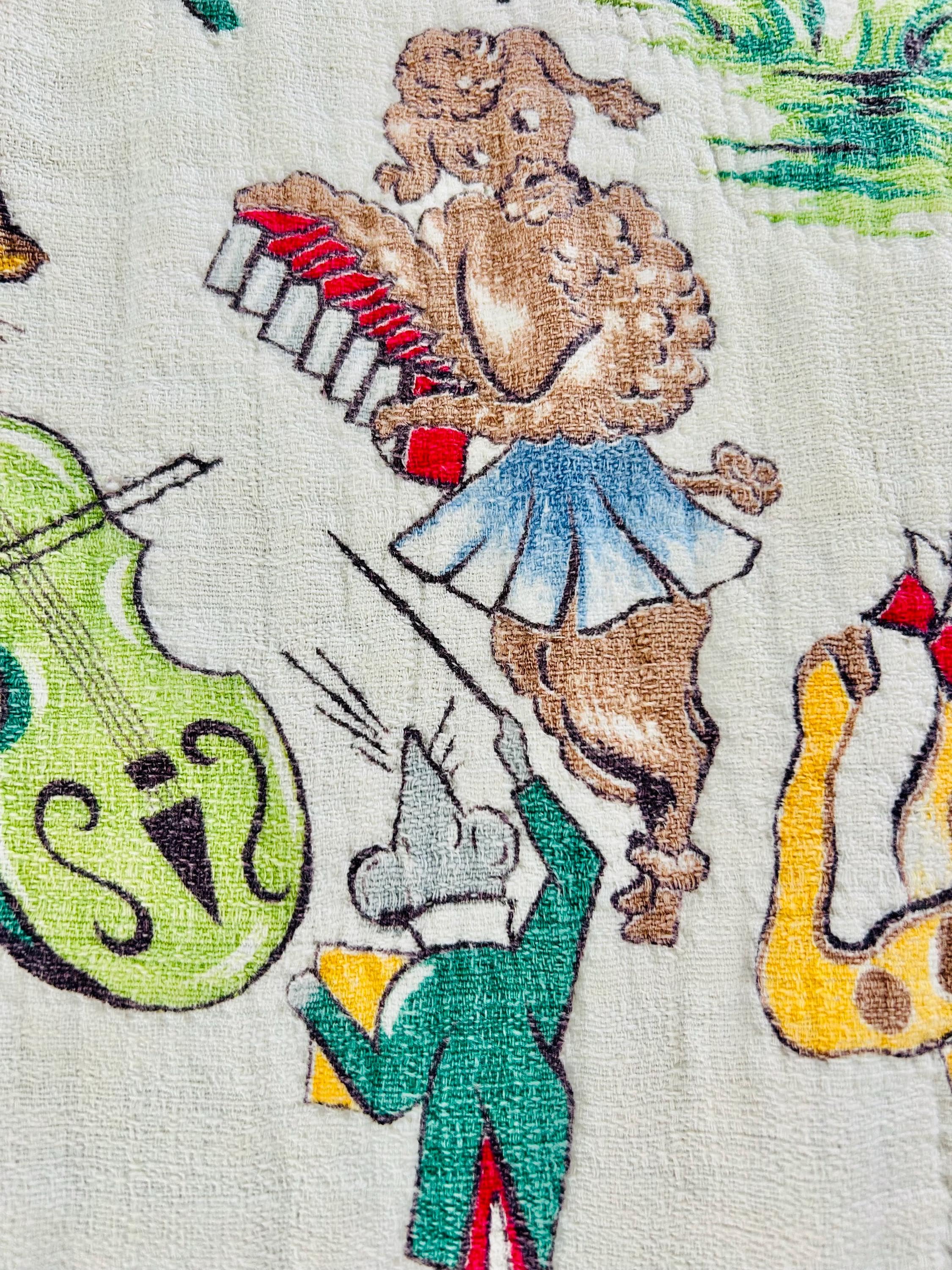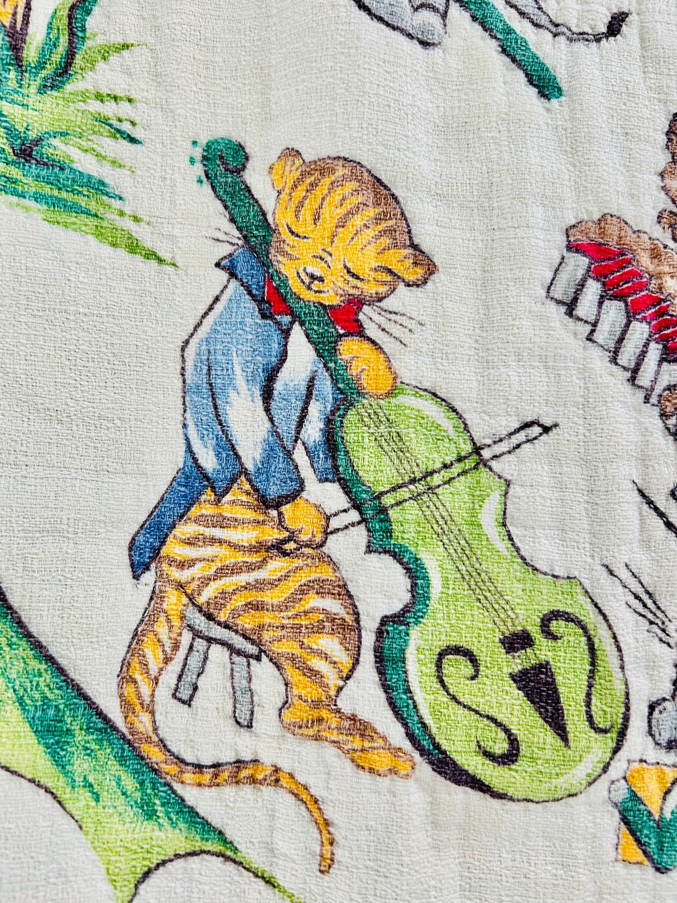 This retro child's quilt has a mid-century aesthetic and is circa 1960s-1970s. It features a circus-themed print filled with animals, including lions, elephants, giraffes, seals, cats and other animals balancing balls, playing instruments, dancing and playing, all in bright colors framed by a vivid red border.