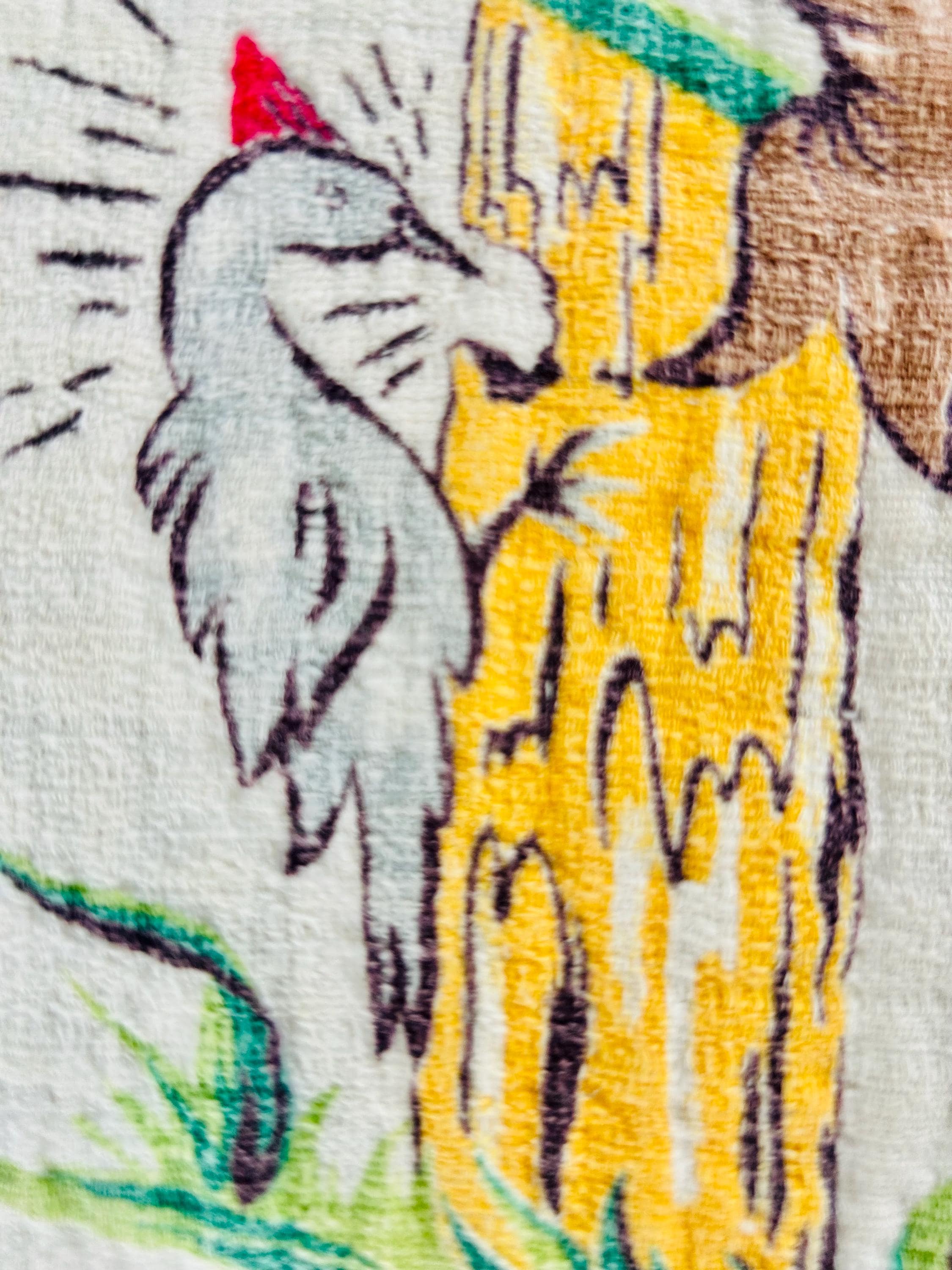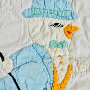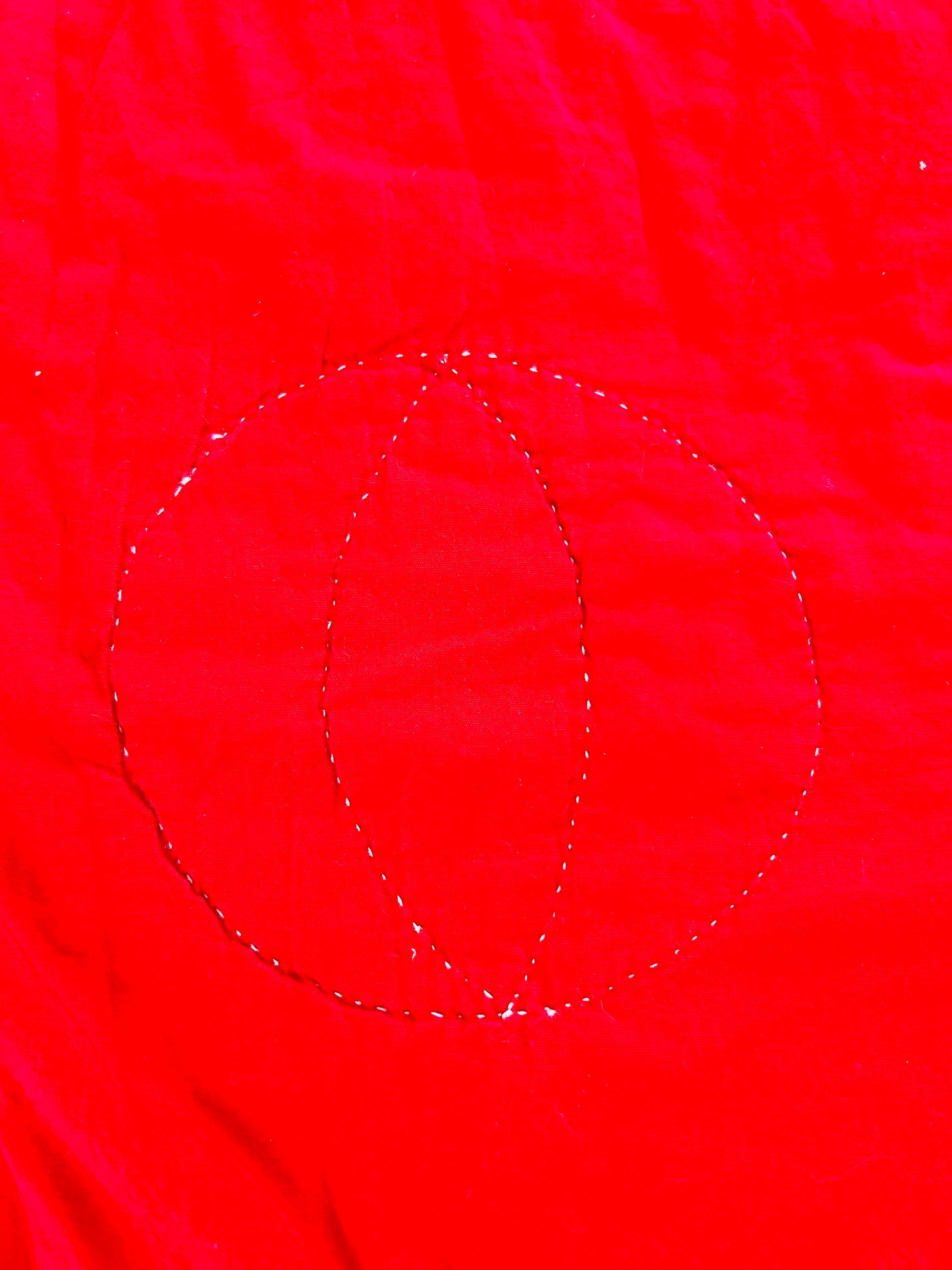 It is hand-quilted including in outlines of the animals and outlines of the inner beige/brown border, while the red border is hand-quilted with balls and flying balloons. The back is a chestnut cotton while the red border has been turned to the back and hand-stitched to form the binding. The cotton batting is lightweight.