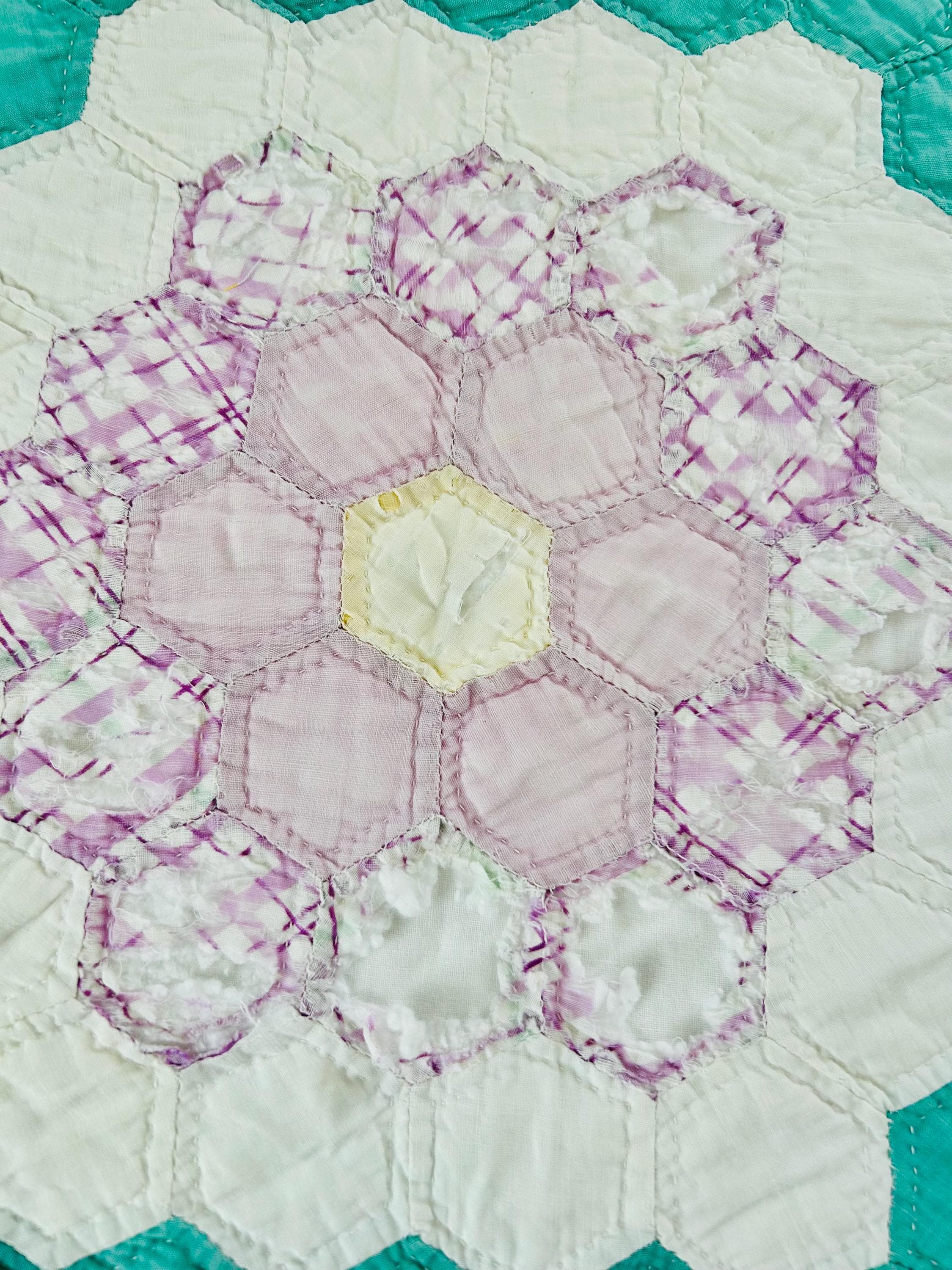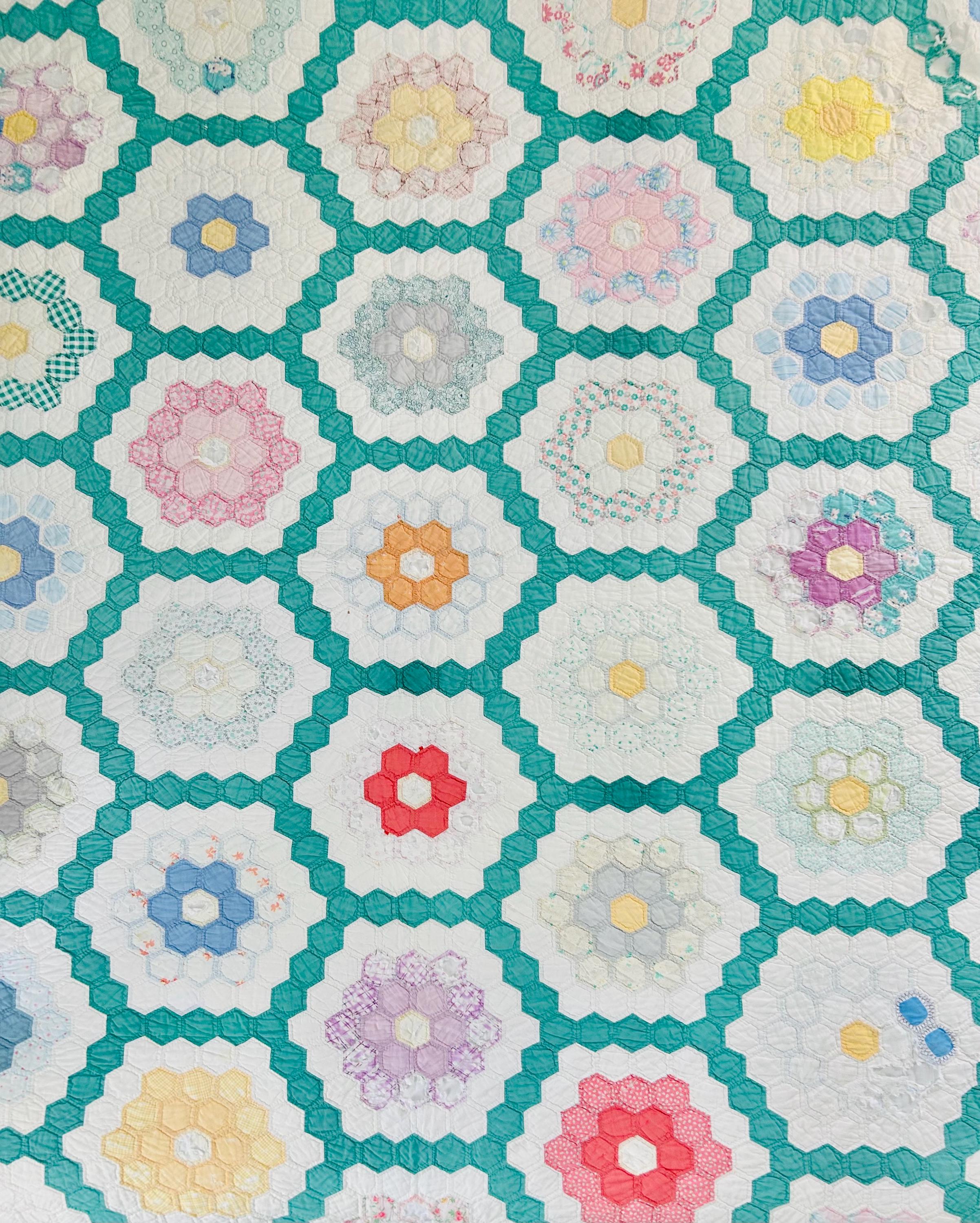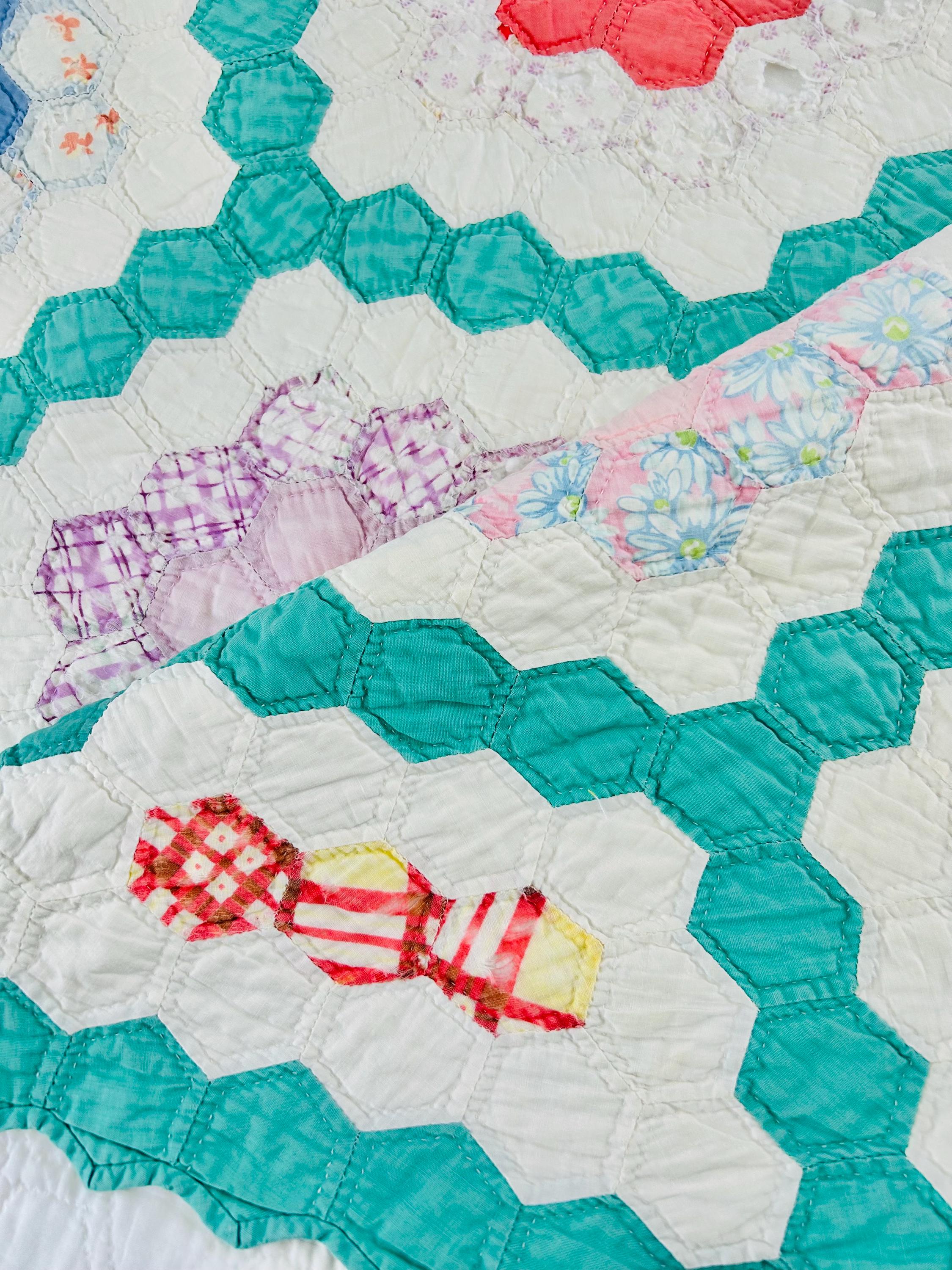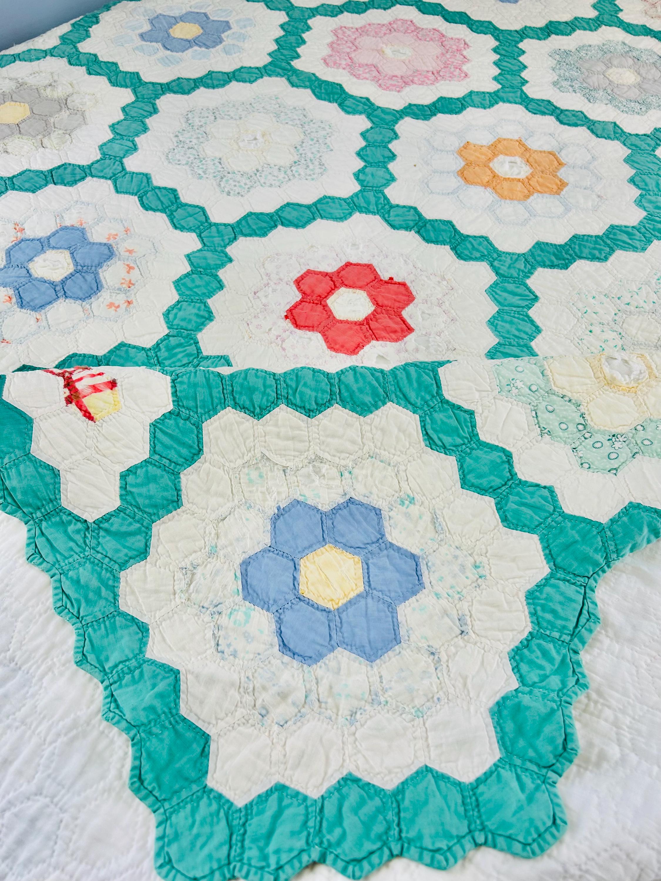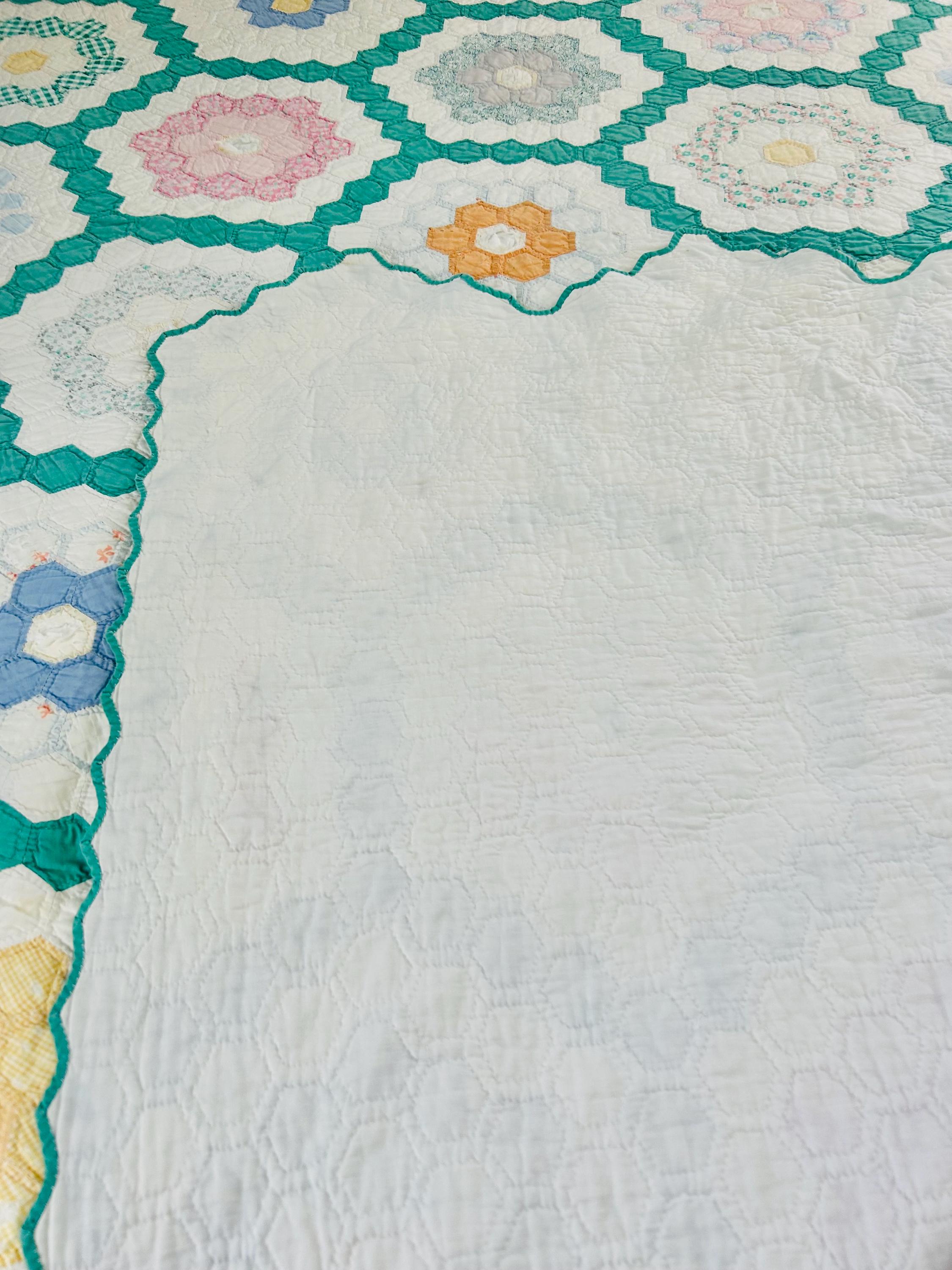 Details * Pattern: Grandmother’s Flower Garden (hexagon mosaic) * Era: 1930s * Size: 80” x 91” * Construction: Hand pieced and hand quilted * Materials: Cotton fabrics, cotton batting * Colors: Pastels on white with green pathway * Condition: Timeworn but sturdy with some fabric loss and wear (cutter quilt)
