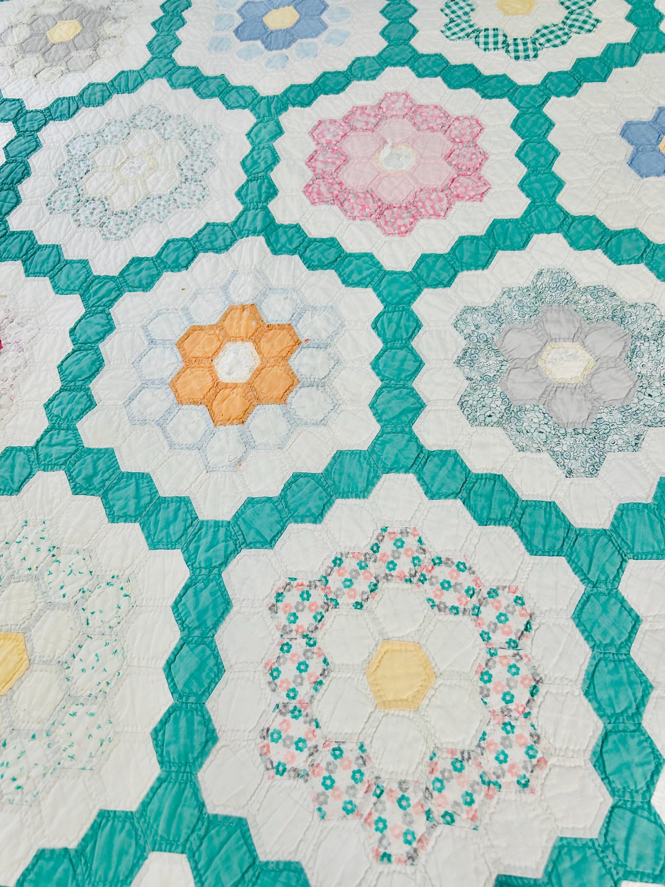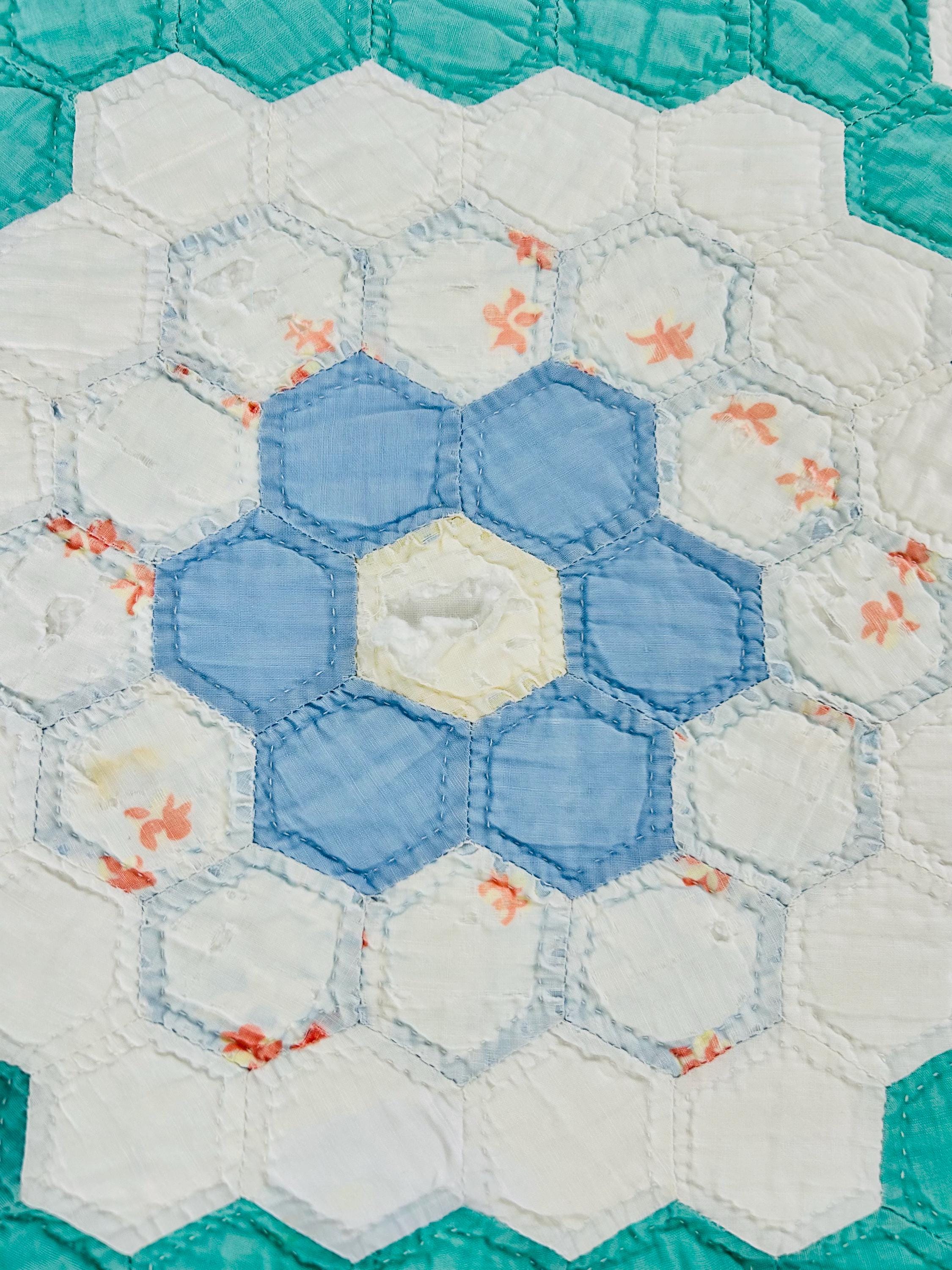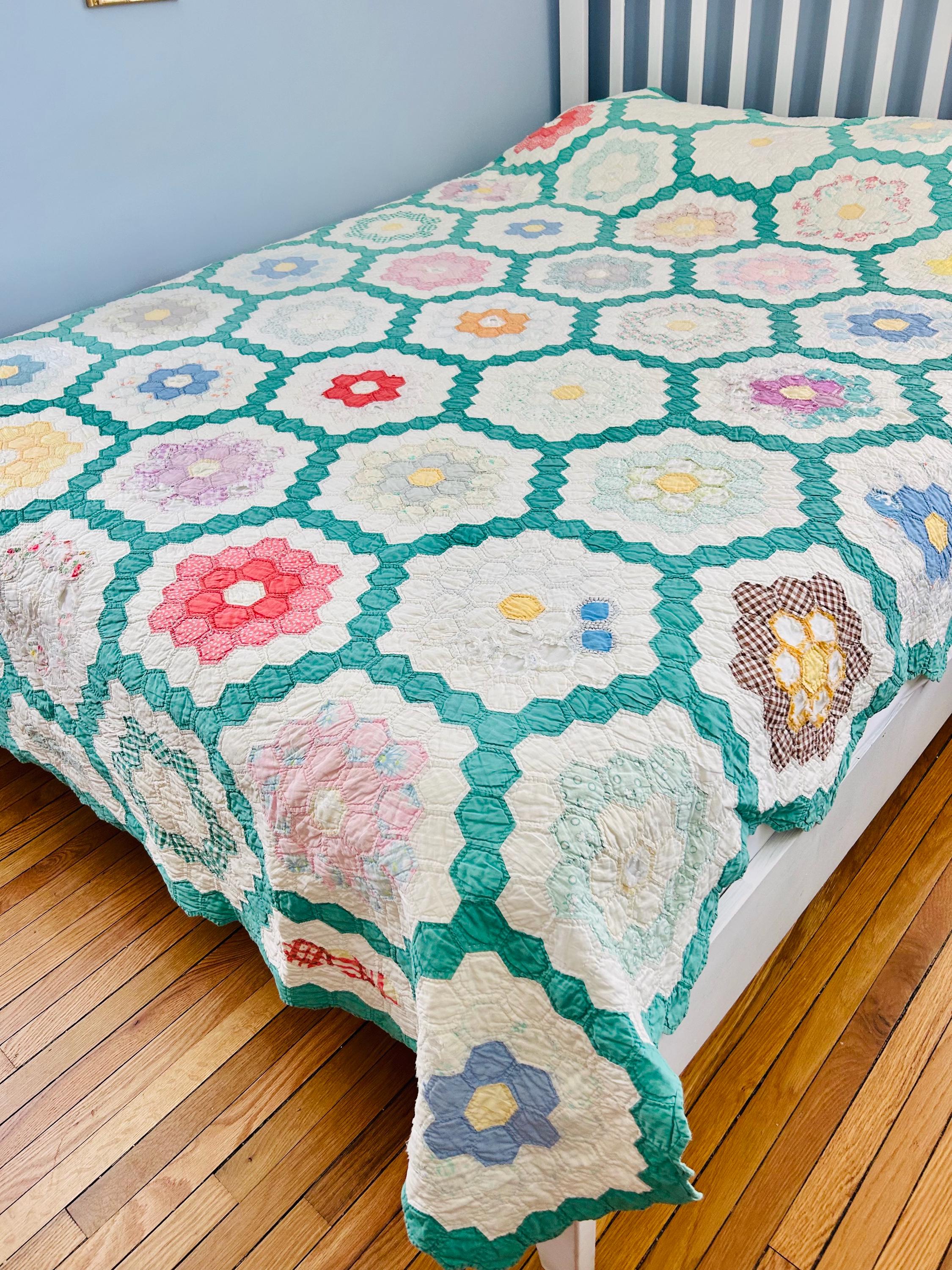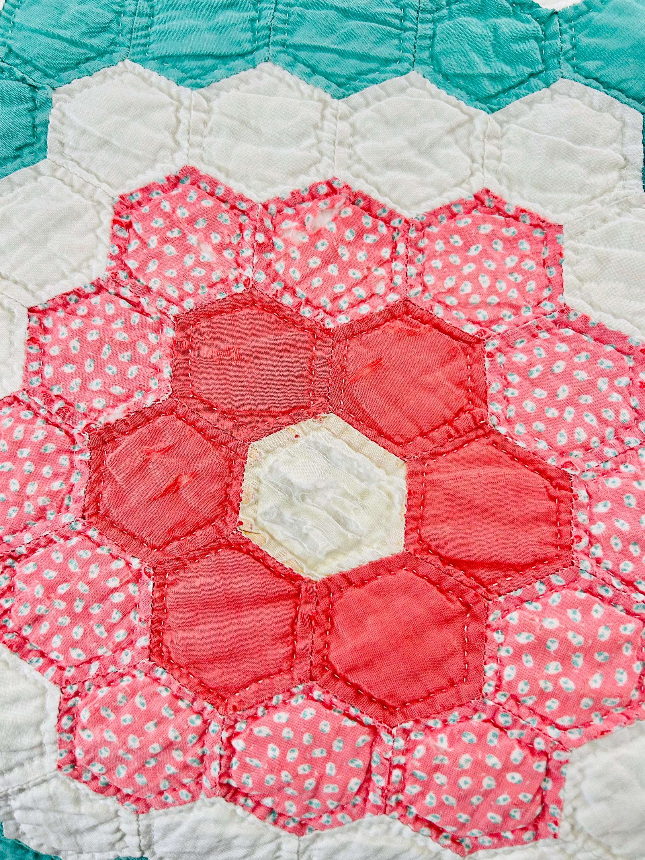 Details * Pattern: Grandmother’s Flower Garden (hexagon mosaic) * Era: 1930s * Size: 80” x 91” * Construction: Hand pieced and hand quilted * Materials: Cotton fabrics, cotton batting * Colors: Pastels on white with green pathway * Condition: Timeworn but sturdy with some fabric loss and wear (cutter quilt)
