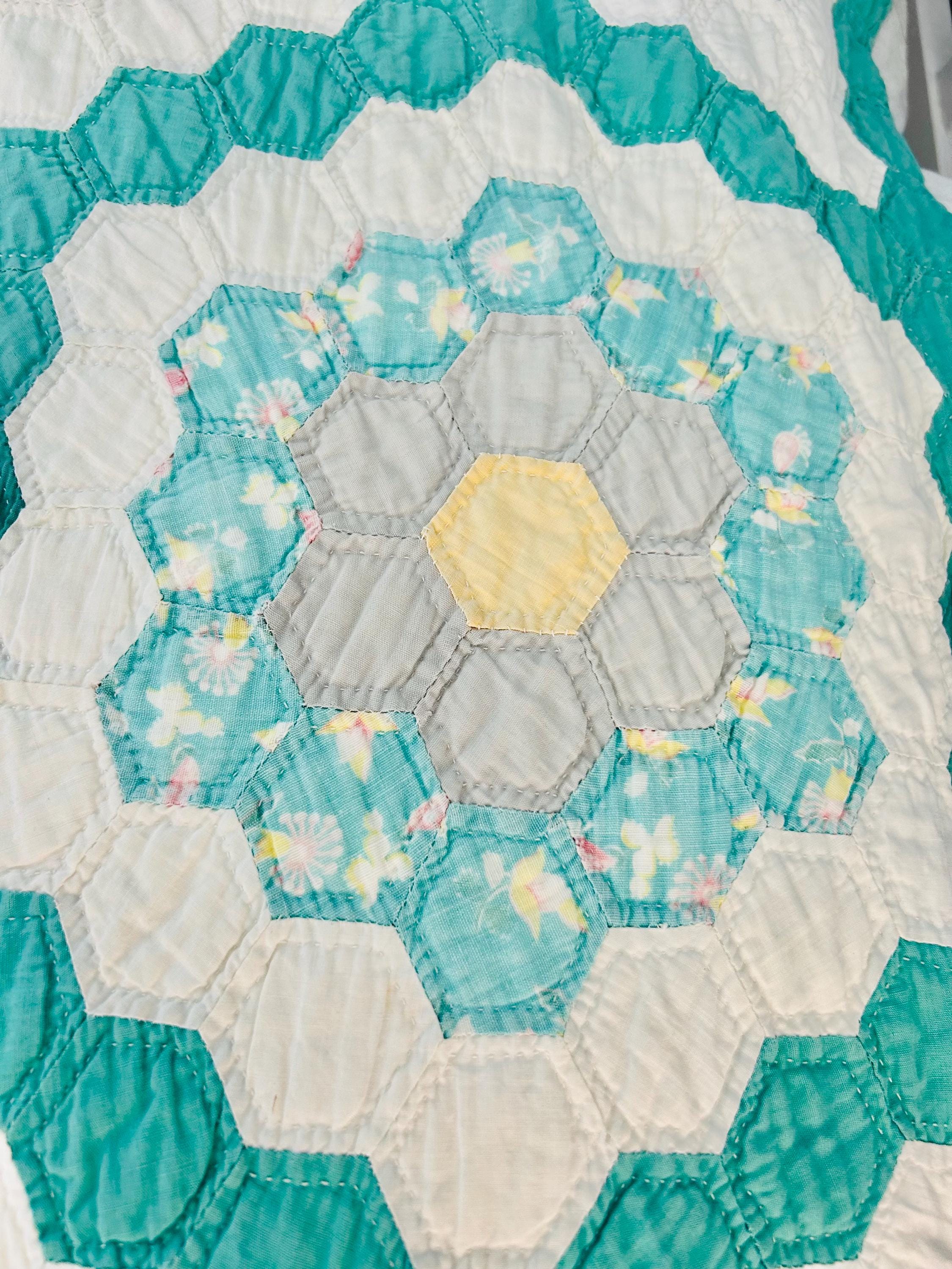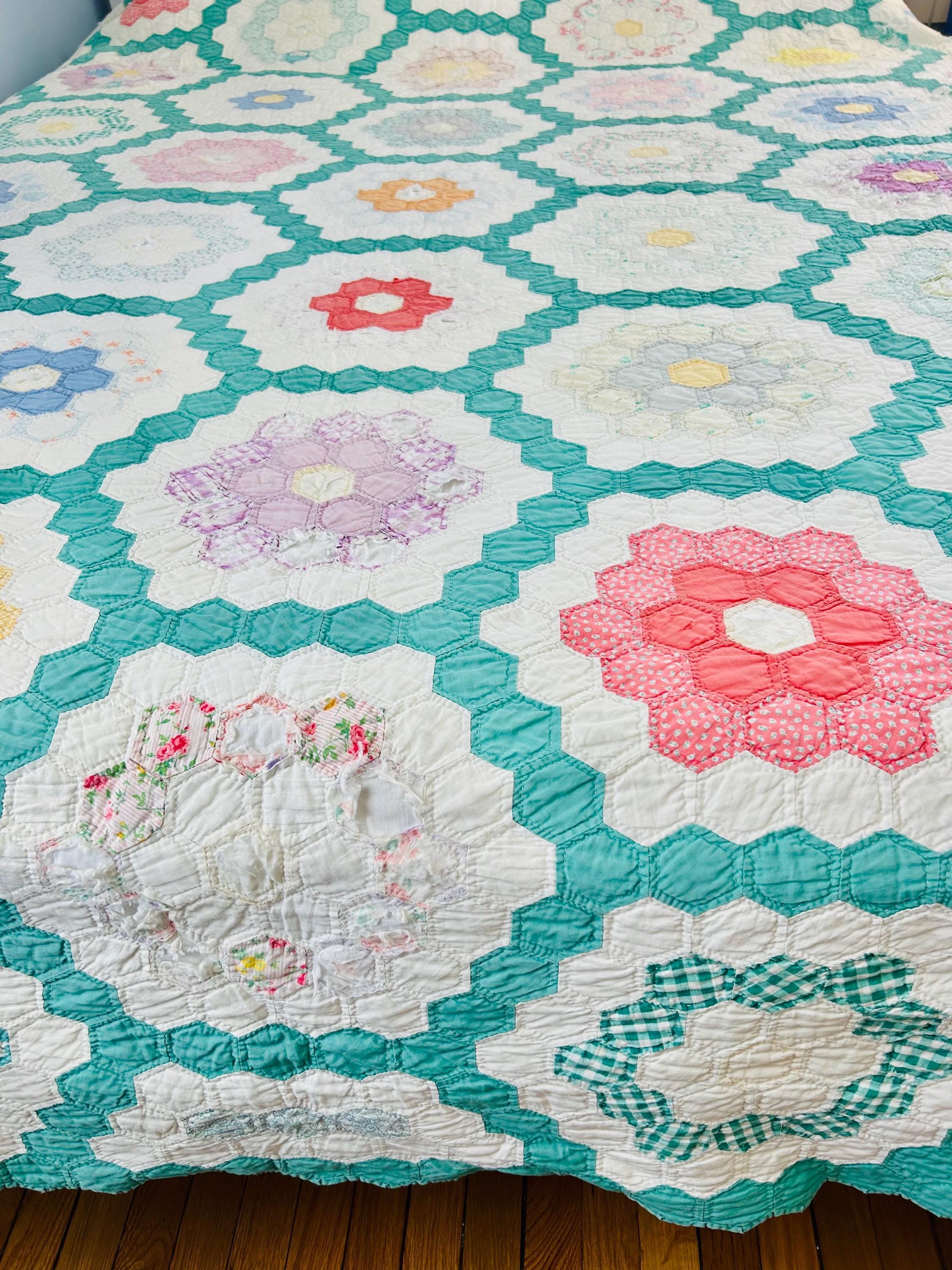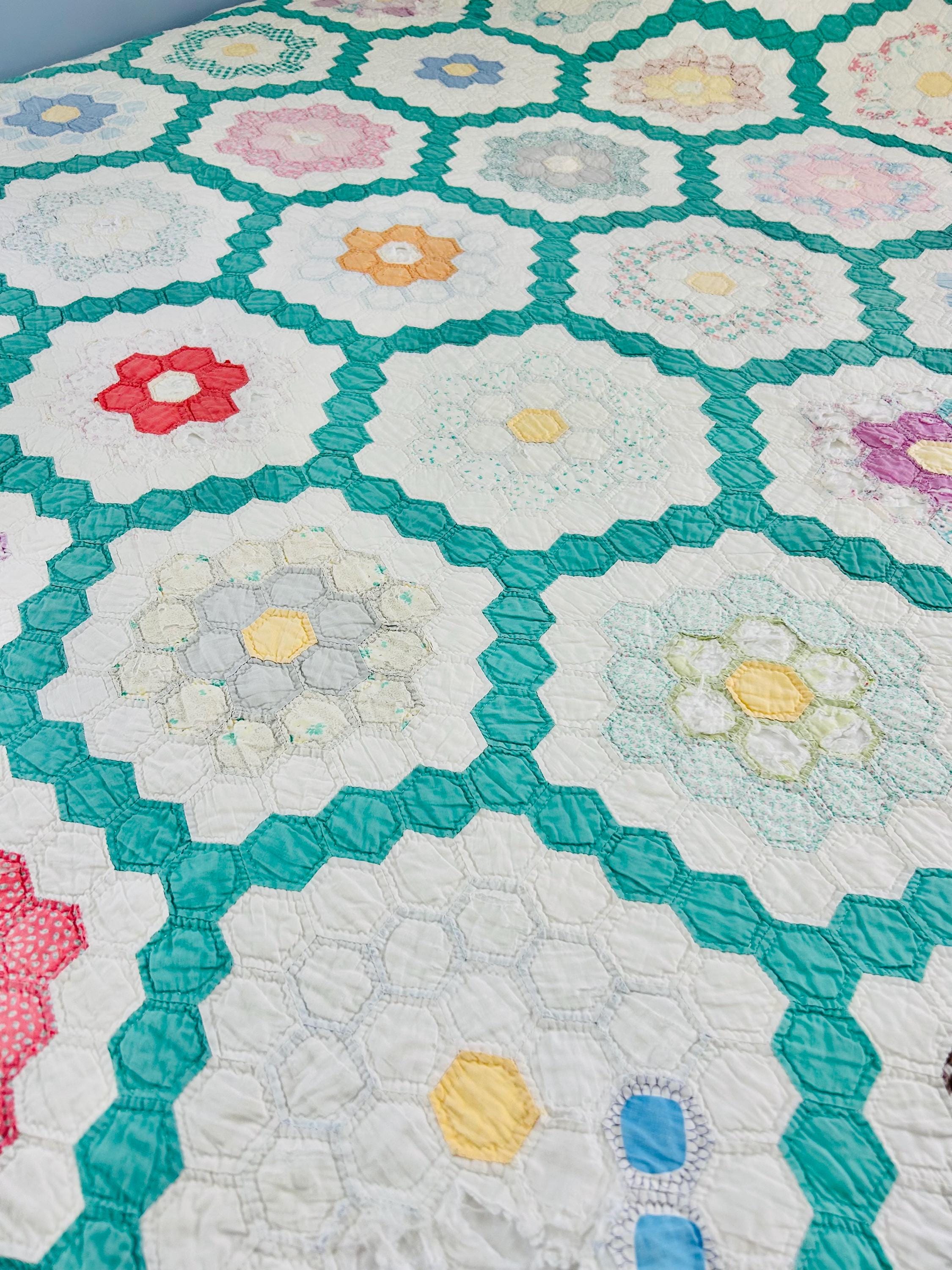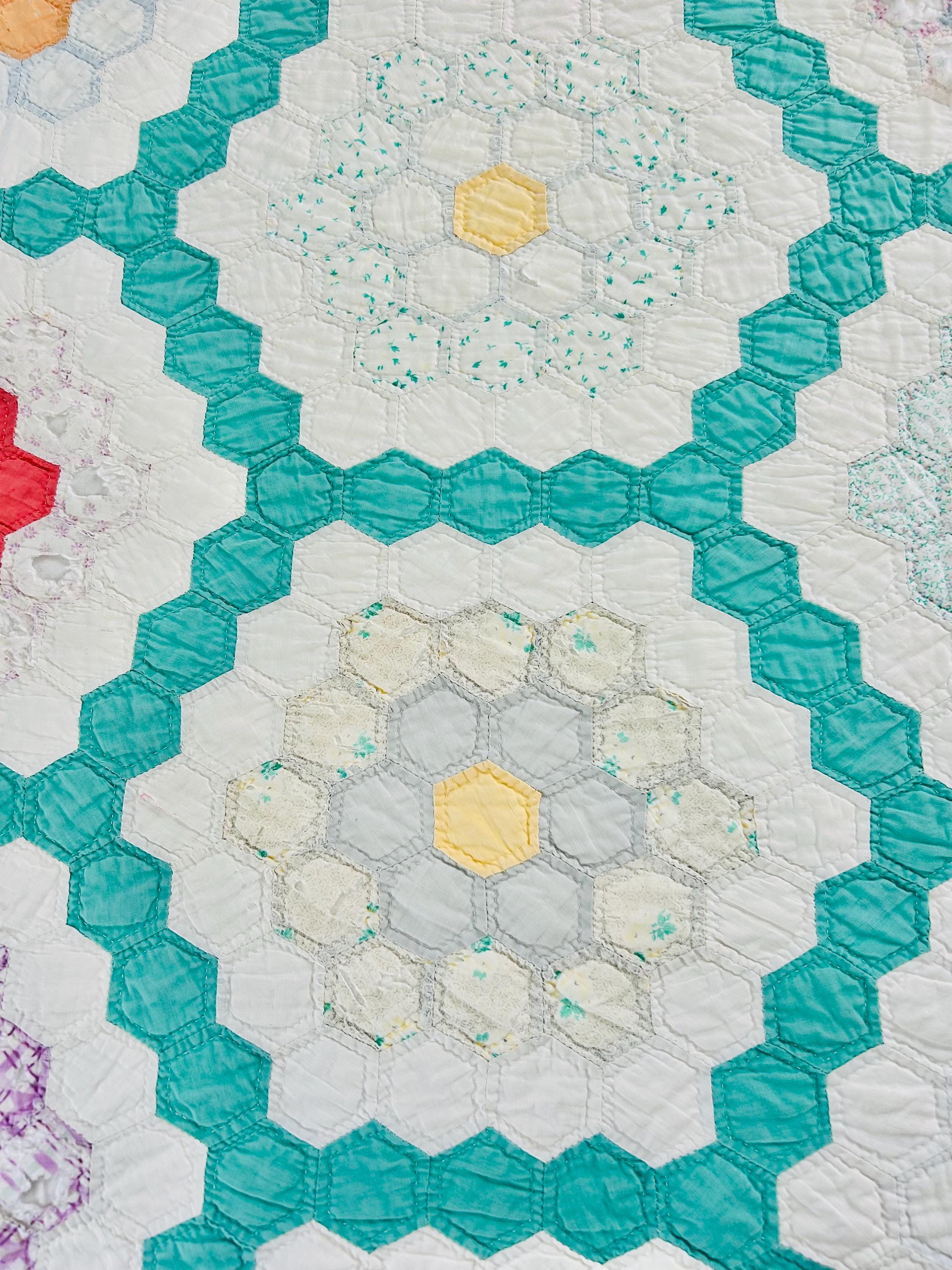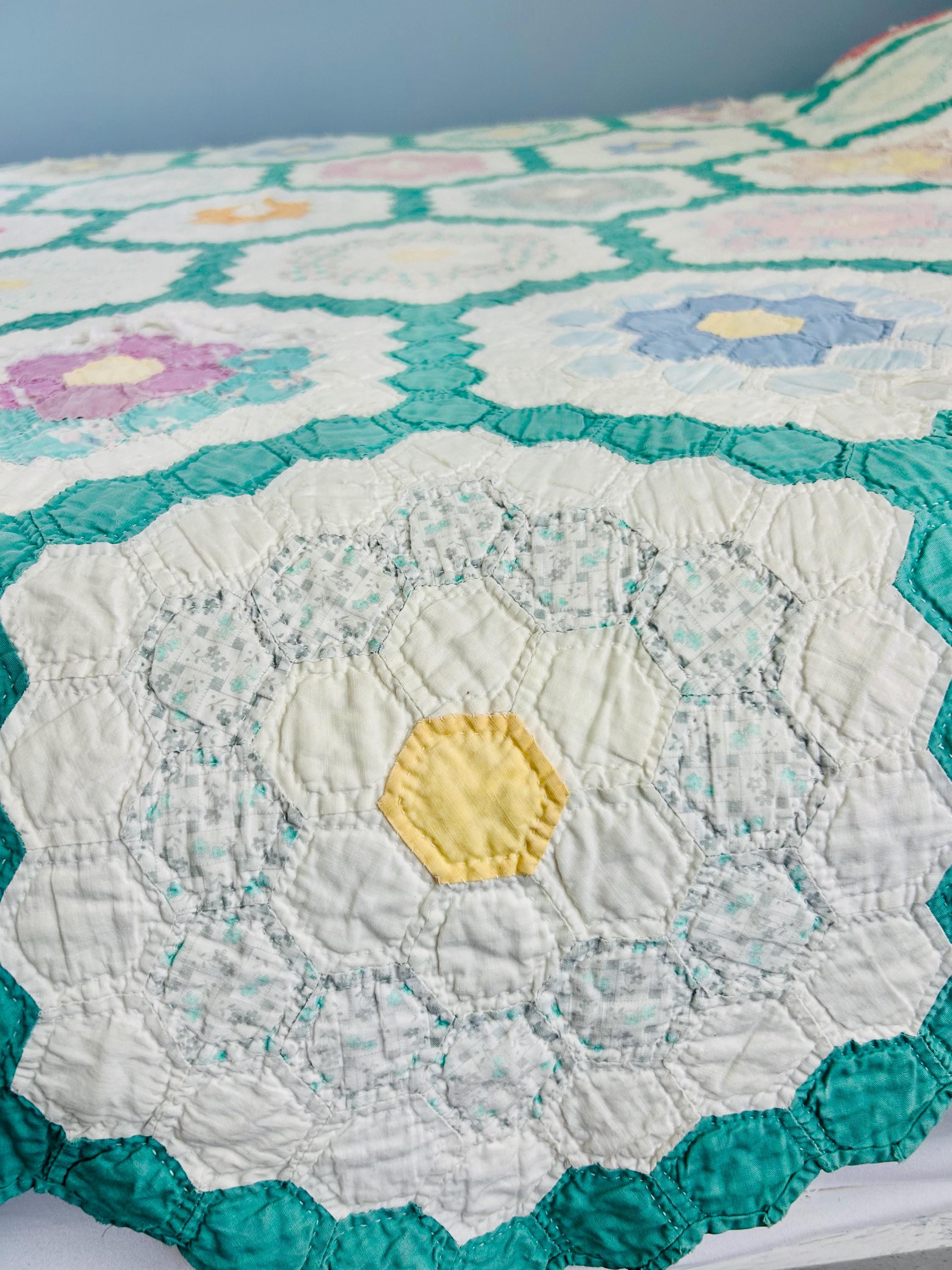 Details * Pattern: Grandmother’s Flower Garden (hexagon mosaic) * Era: 1930s * Size: 80” x 91” * Construction: Hand pieced and hand quilted * Materials: Cotton fabrics, cotton batting * Colors: Pastels on white with green pathway * Condition: Timeworn but sturdy with some fabric loss and wear (cutter quilt)