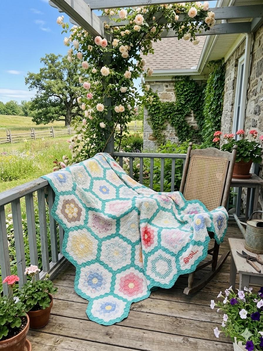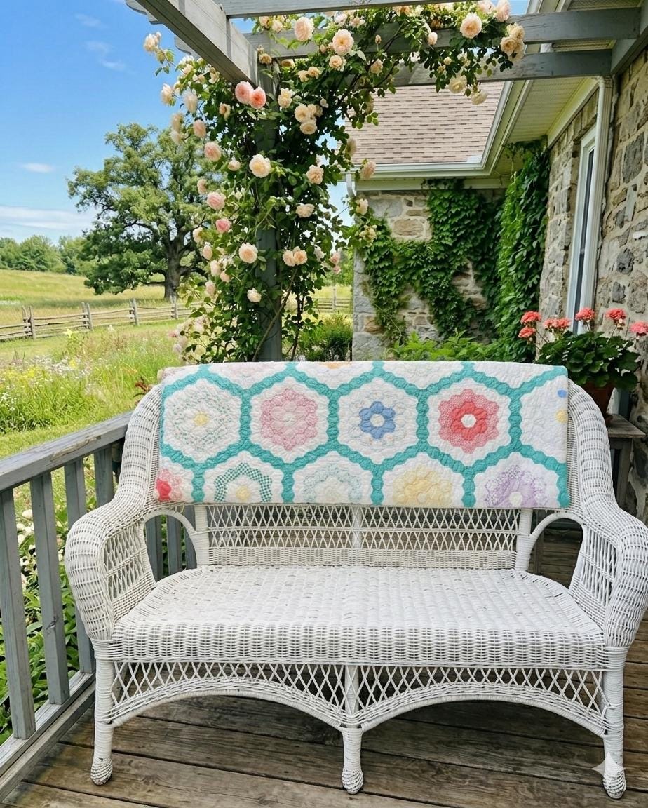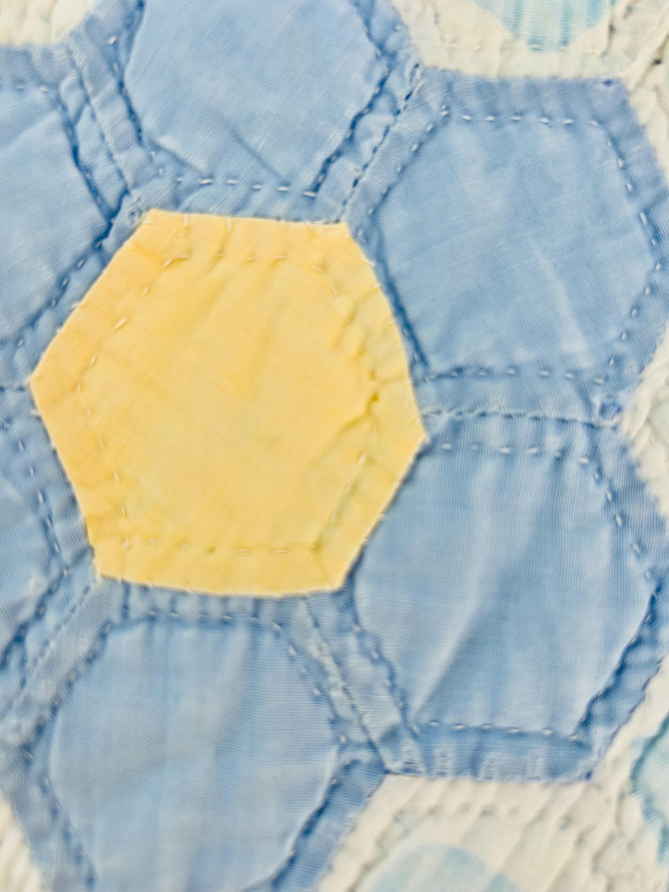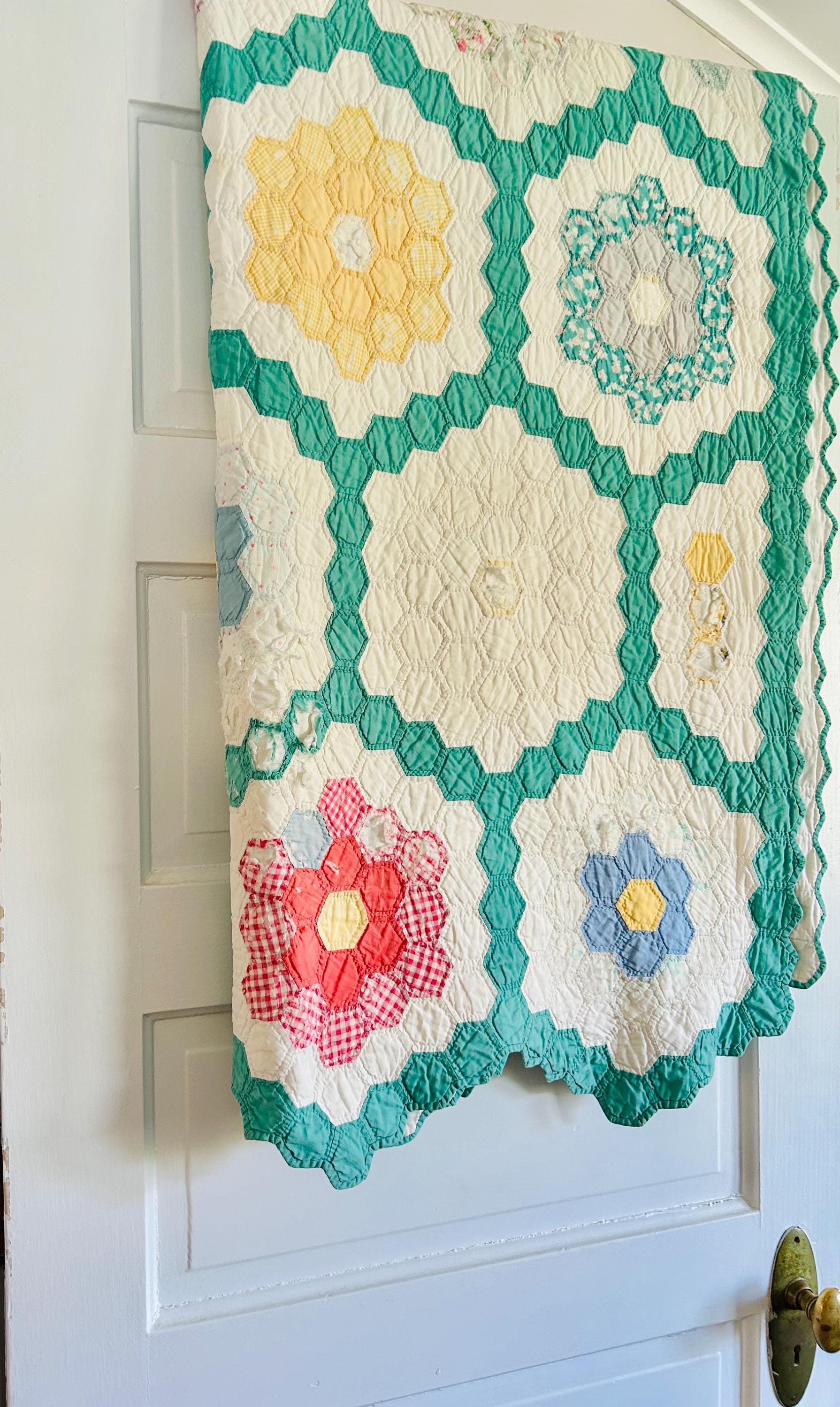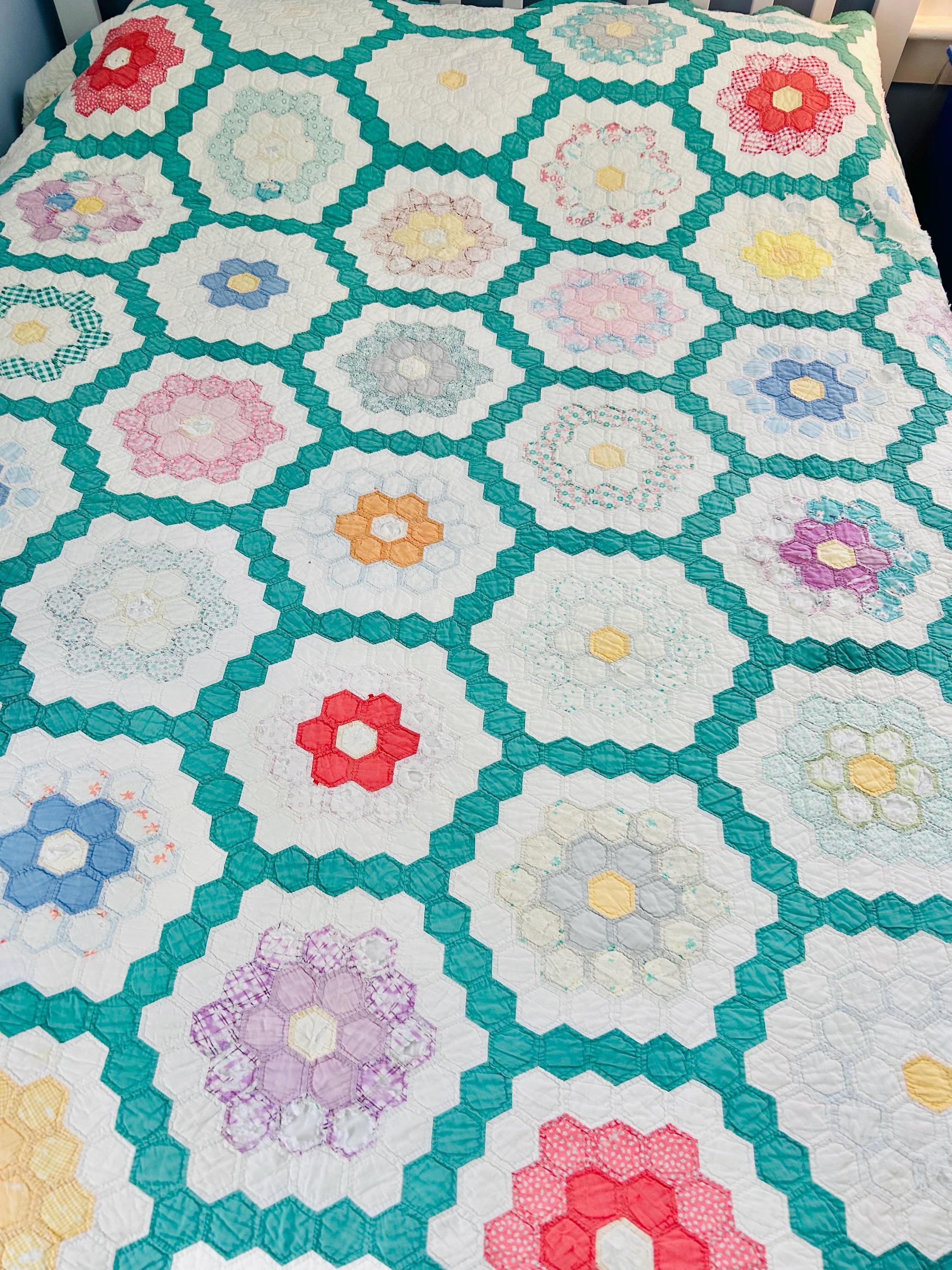 Details * Pattern: Grandmother’s Flower Garden (hexagon mosaic) * Era: 1930s * Size: 80” x 91” * Construction: Hand pieced and hand quilted * Materials: Cotton fabrics, cotton batting * Colors: Pastels on white with green pathway * Condition: Timeworn but sturdy with some fabric loss and wear (cutter quilt)