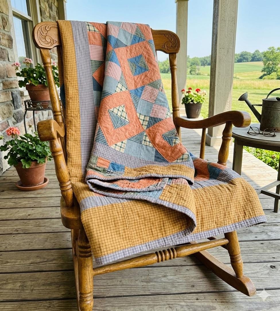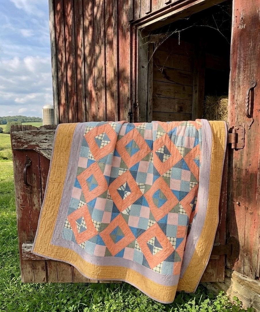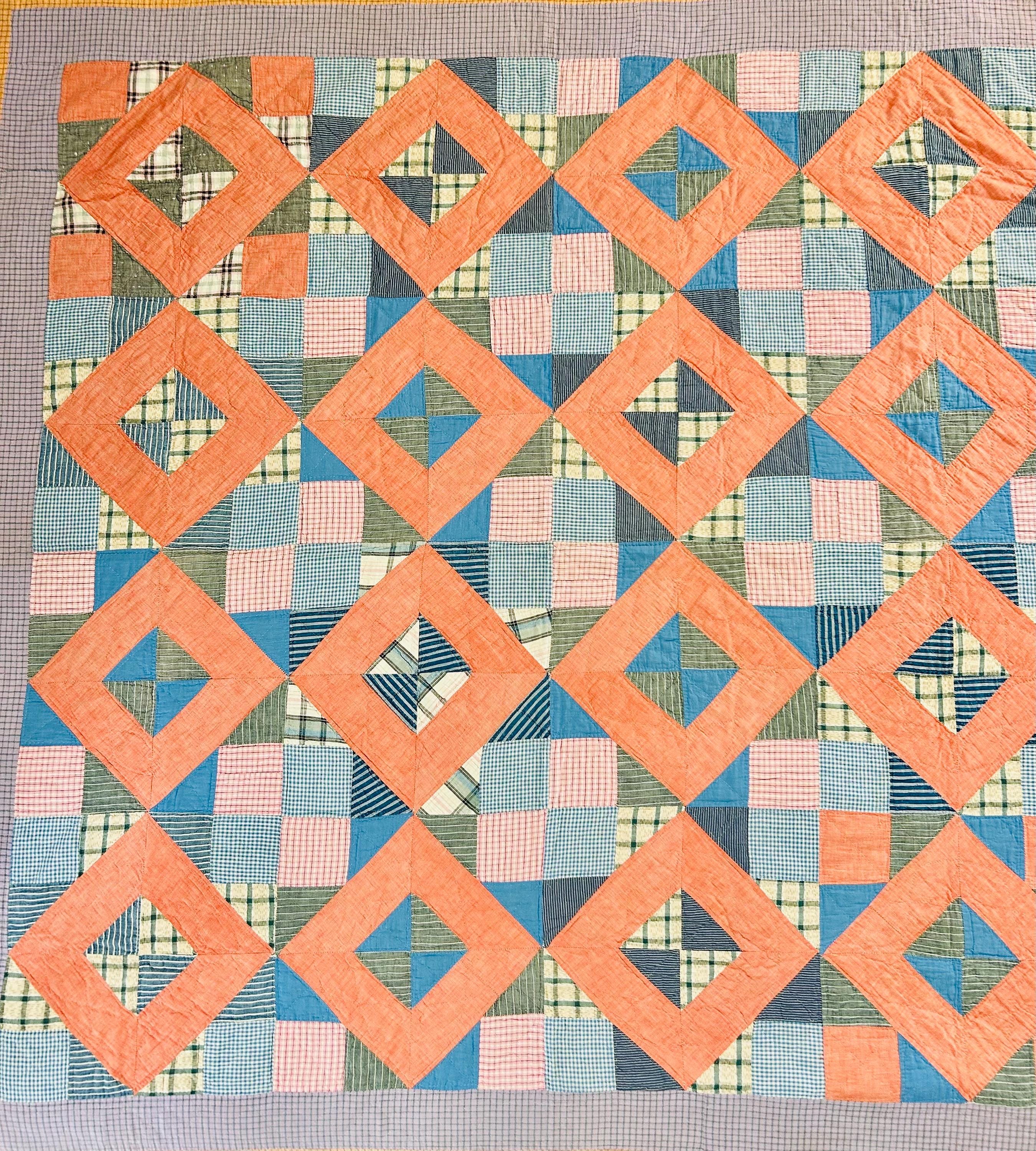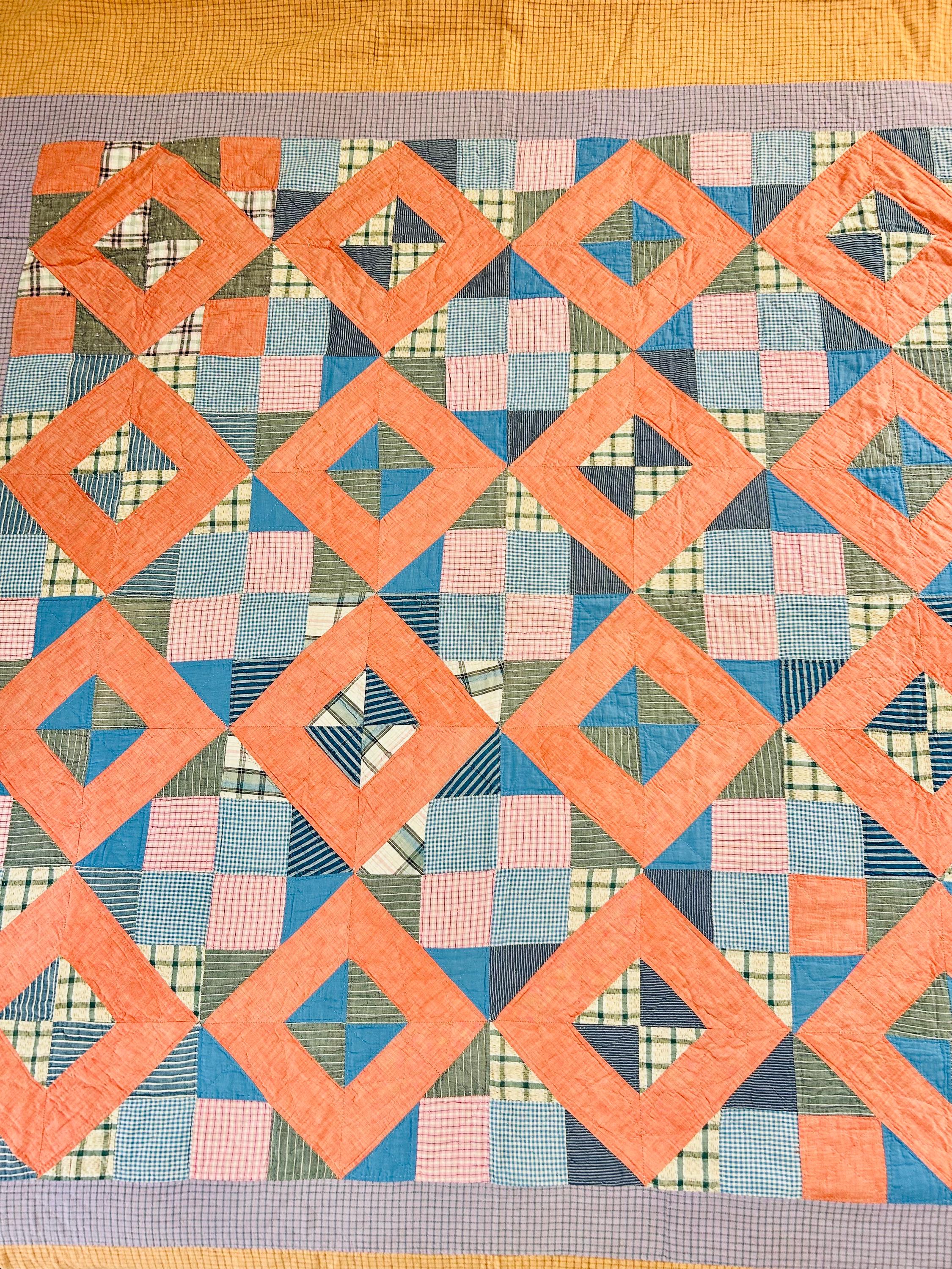 This is a beautiful quilt with a lovely color palette. It is a Four Corner Puzzle Quilt, circa 1930s, with soft coral frames and layered patchwork made of vintage cottons, including small-scale ginghams, stripes, and plaids in soft blues, greens, and muted pinks. The borders -- in a delicate gray-lavender check and a rich mustard grid -- frame the quilt.