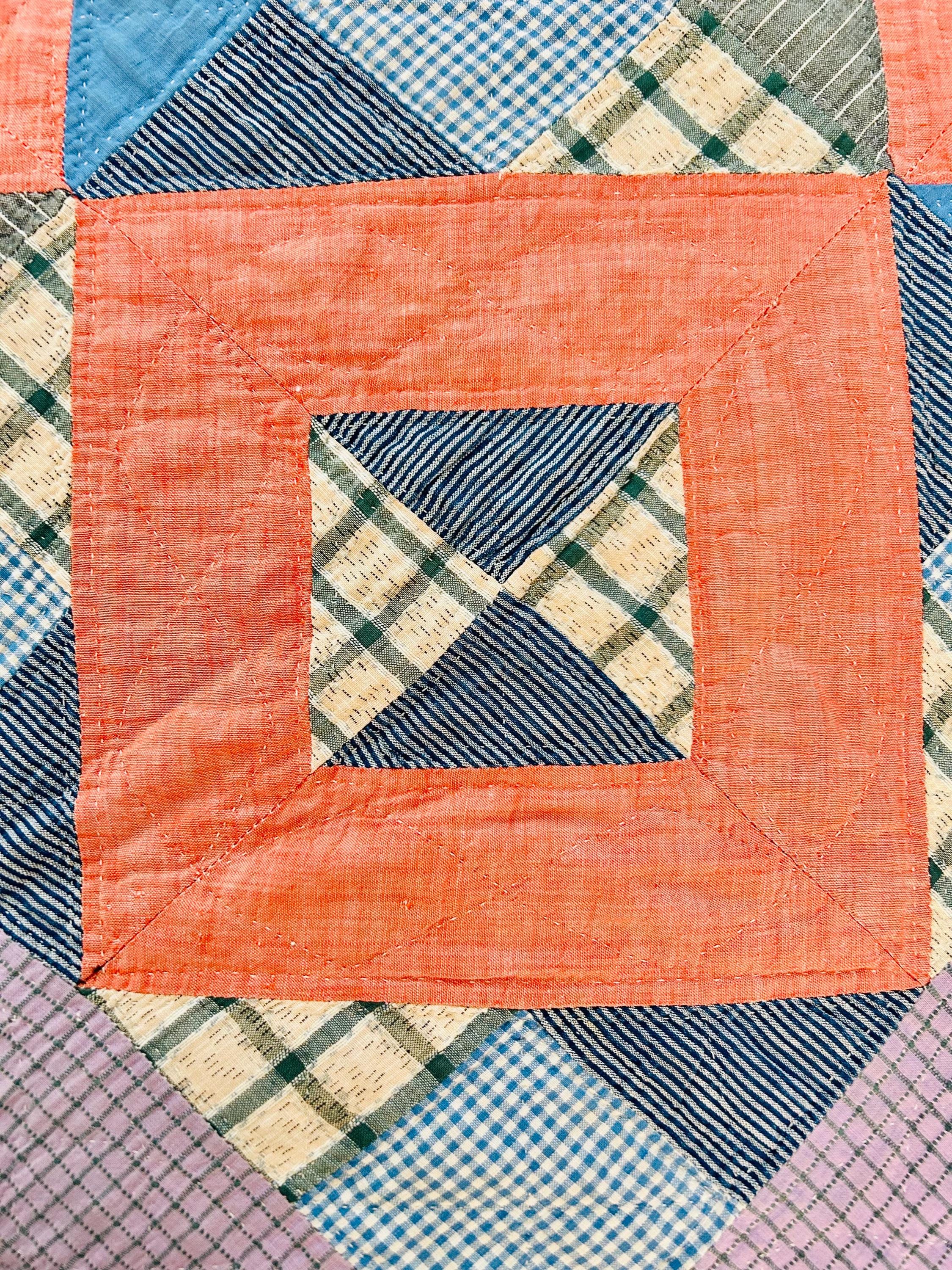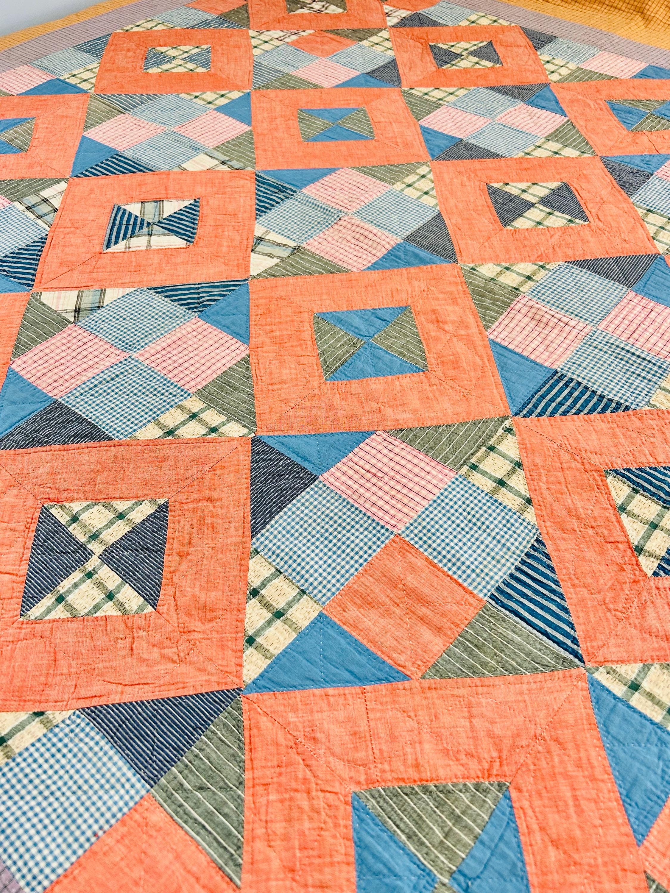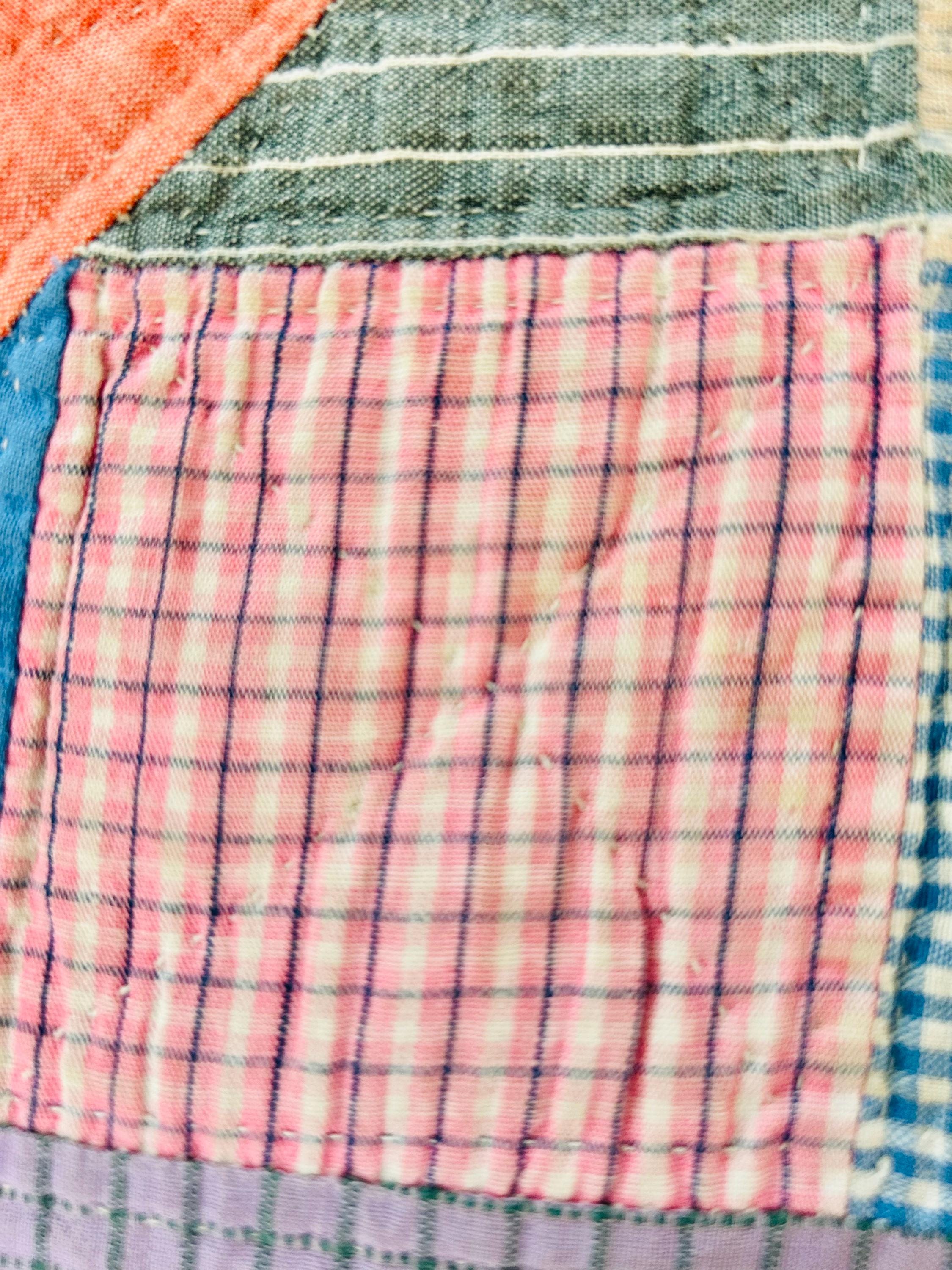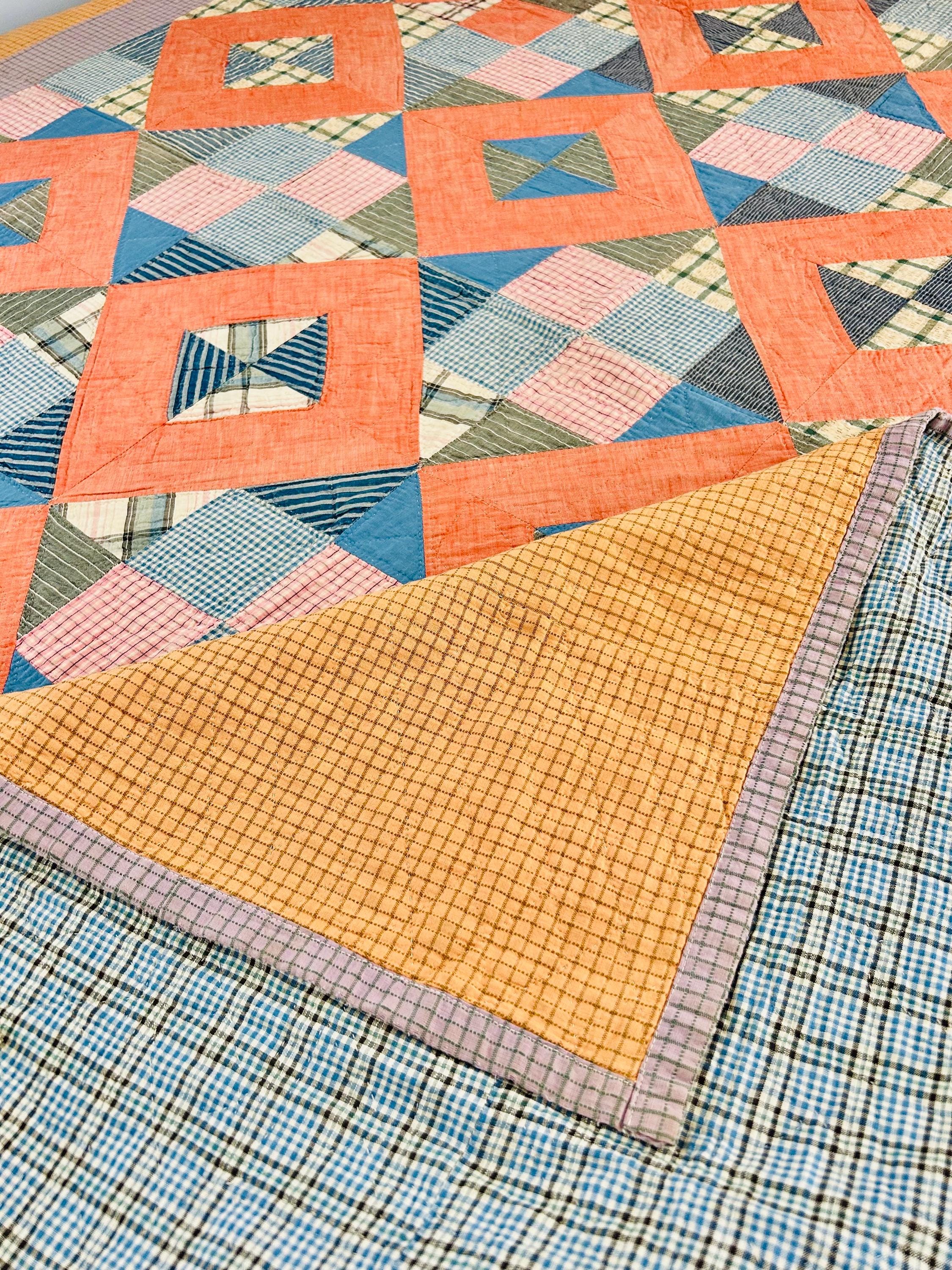 Details: * Date: Circa 1930s (Depression Era) * Pattern: Four Corner Puzzle * Size: 71” x 72” * Materials: 100% cotton fabrics and lightweight cotton batting * Construction: Hand pieced and hand quilted * Colors: Coral, blue, green, mustard, soft pink, and neutrals * Backing: Vintage plaid cotton