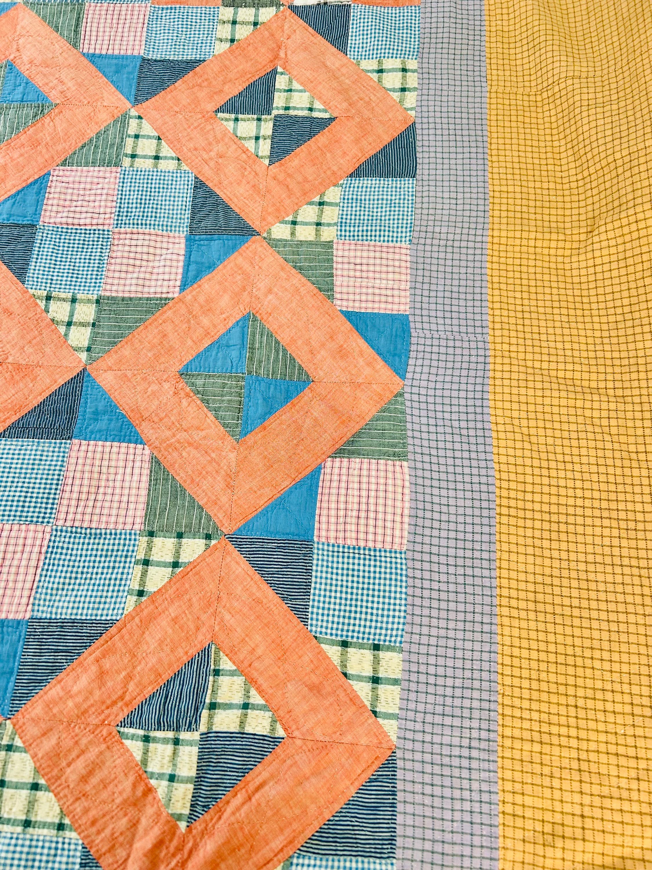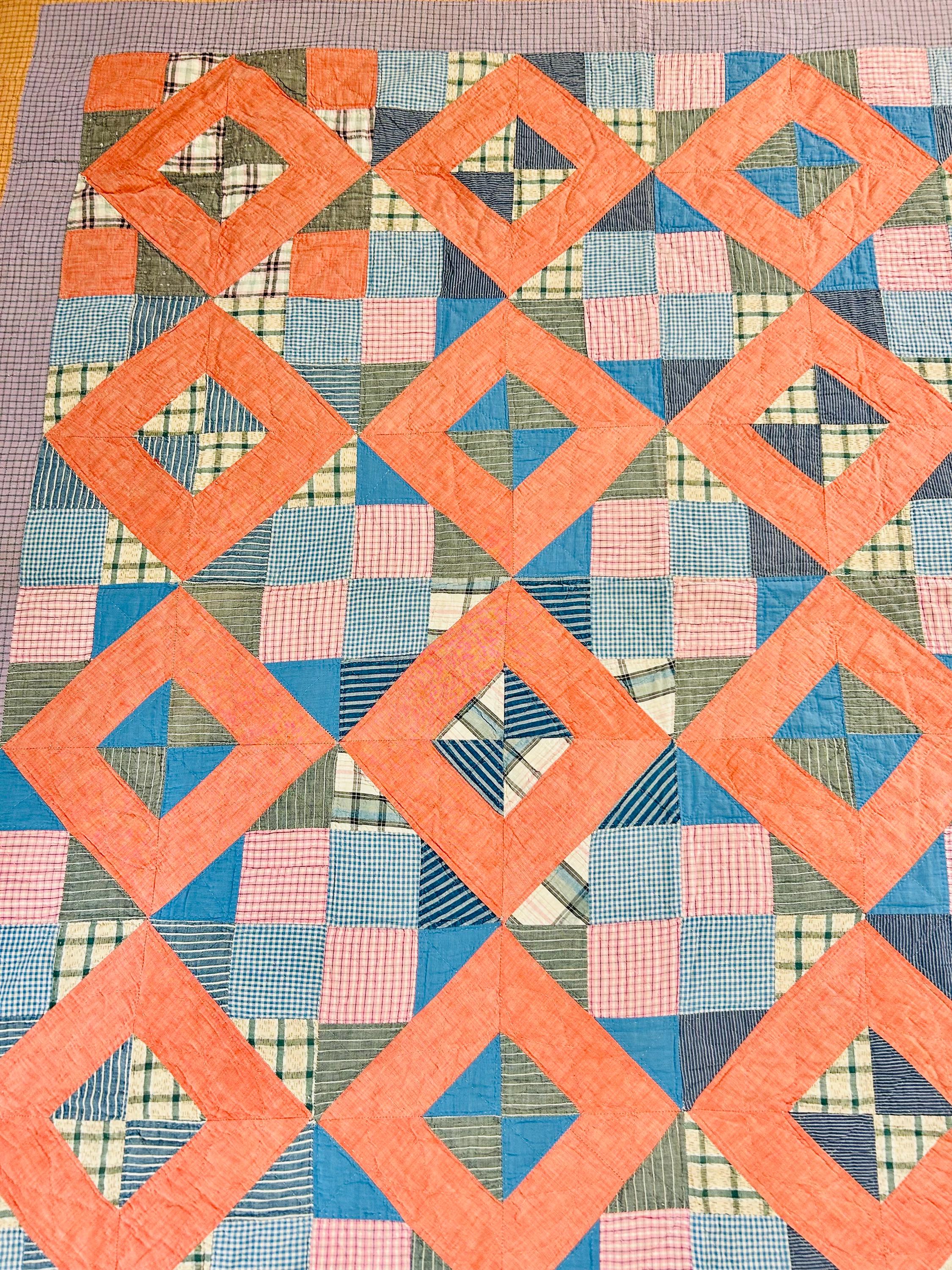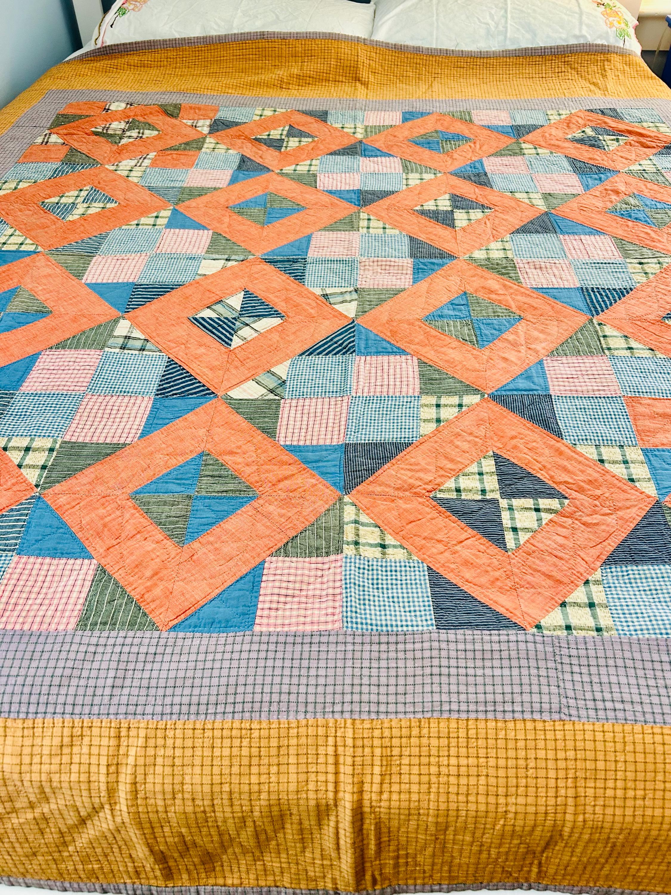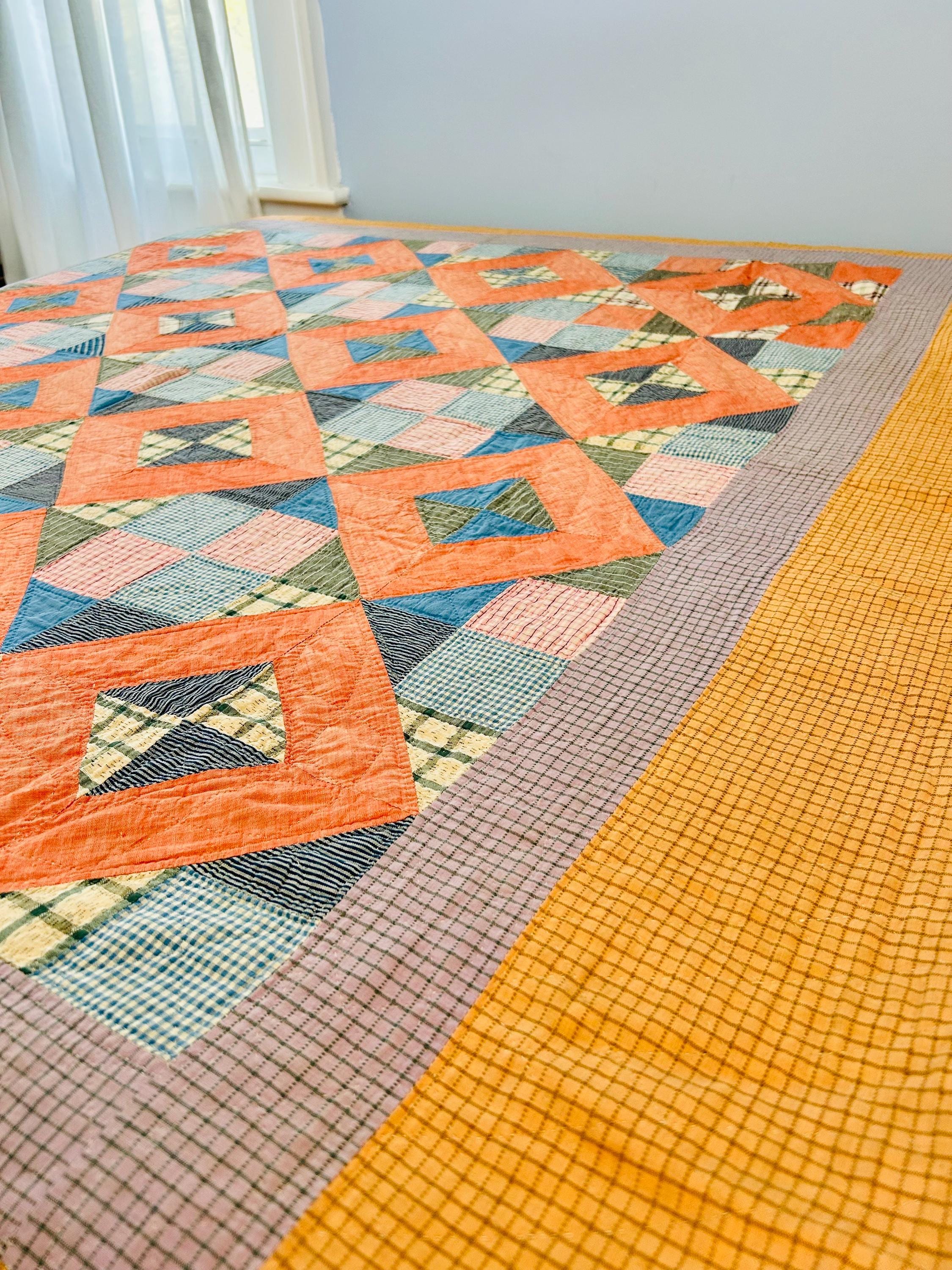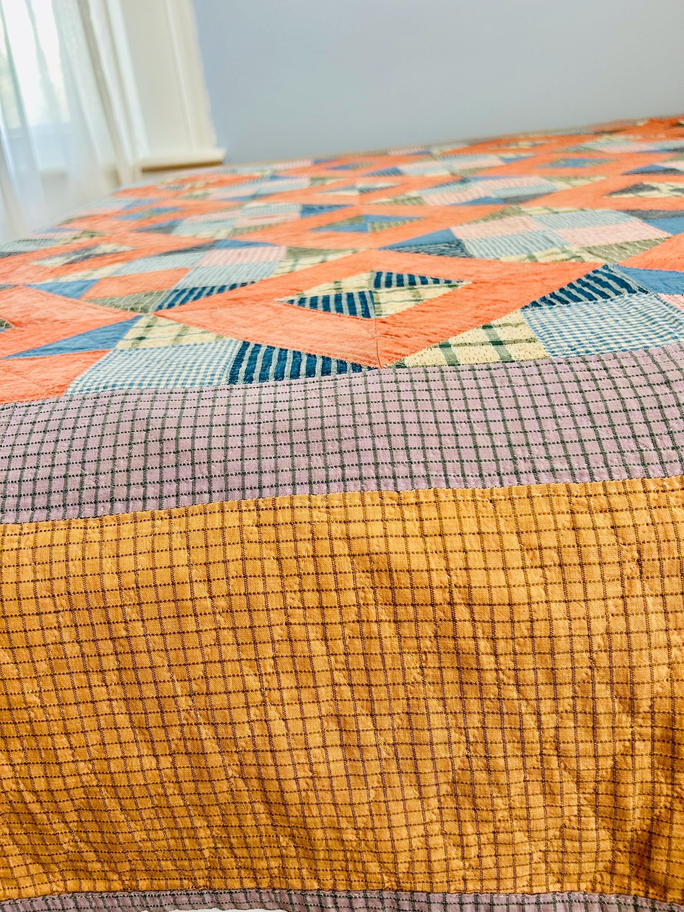 Details: * Date: Circa 1930s (Depression Era) * Pattern: Four Corner Puzzle * Size: 71” x 72” * Materials: 100% cotton fabrics and lightweight cotton batting * Construction: Hand pieced and hand quilted * Colors: Coral, blue, green, mustard, soft pink, and neutrals * Backing: Vintage plaid cotton
