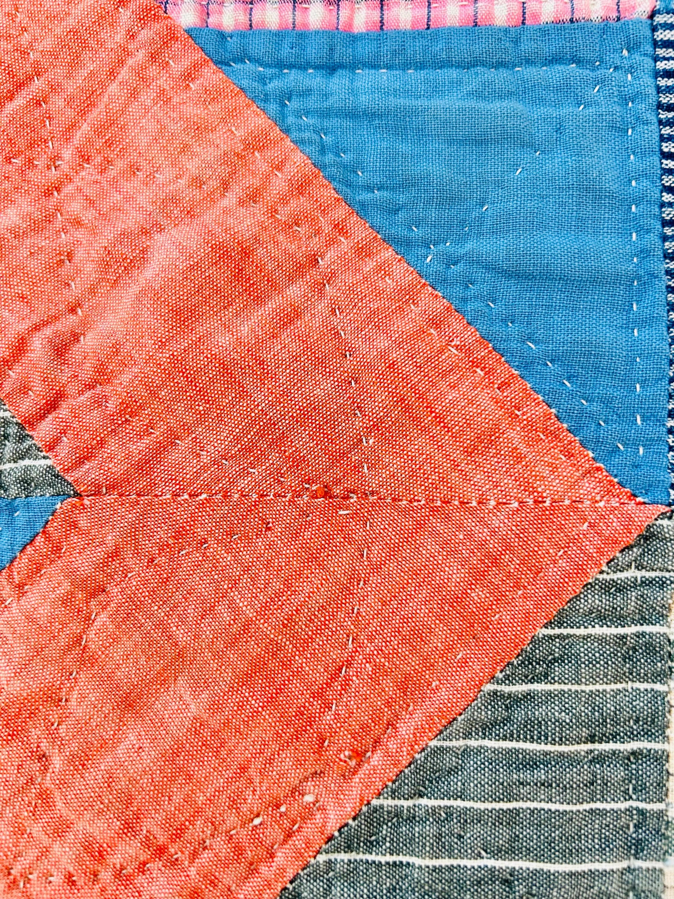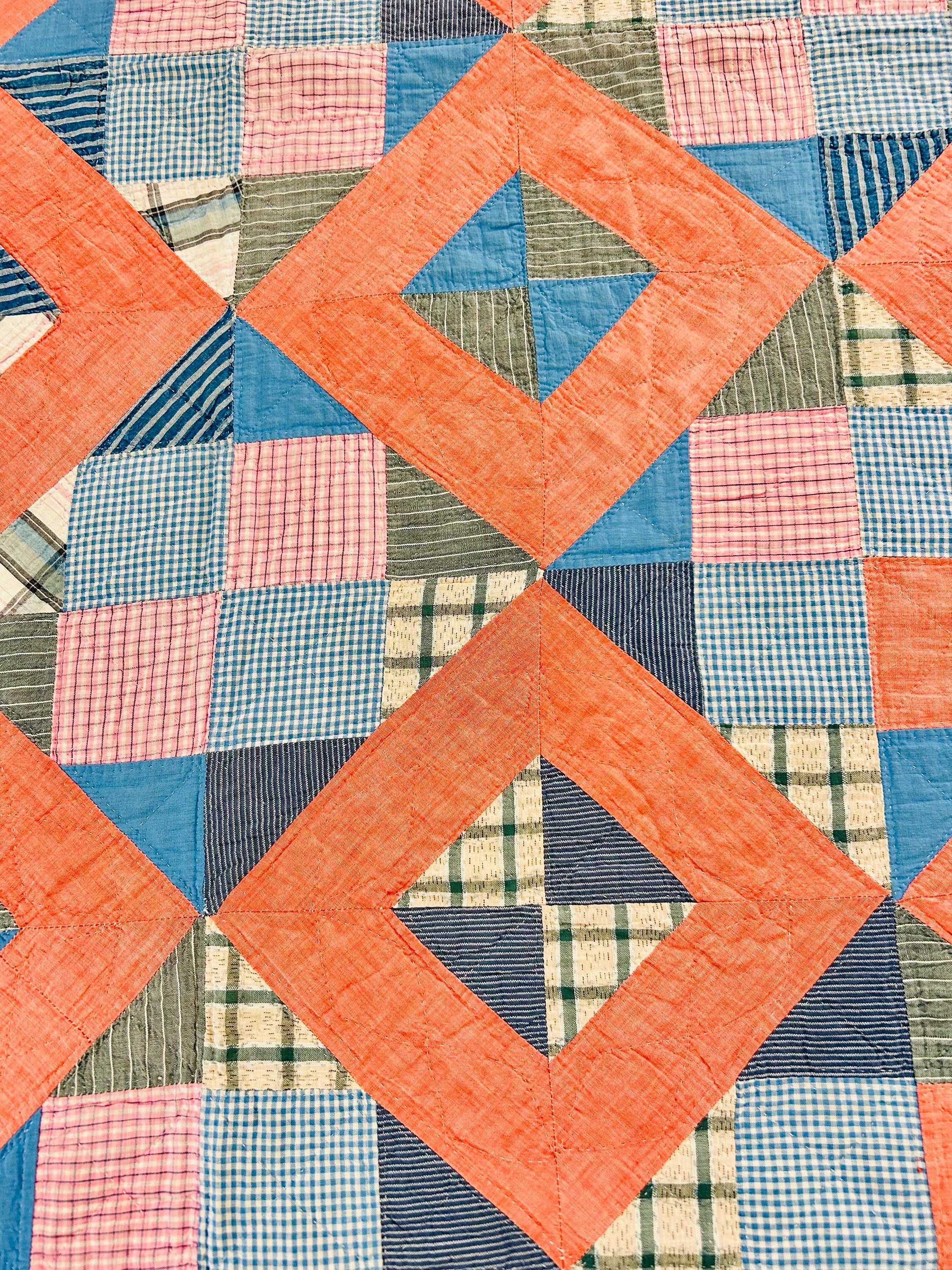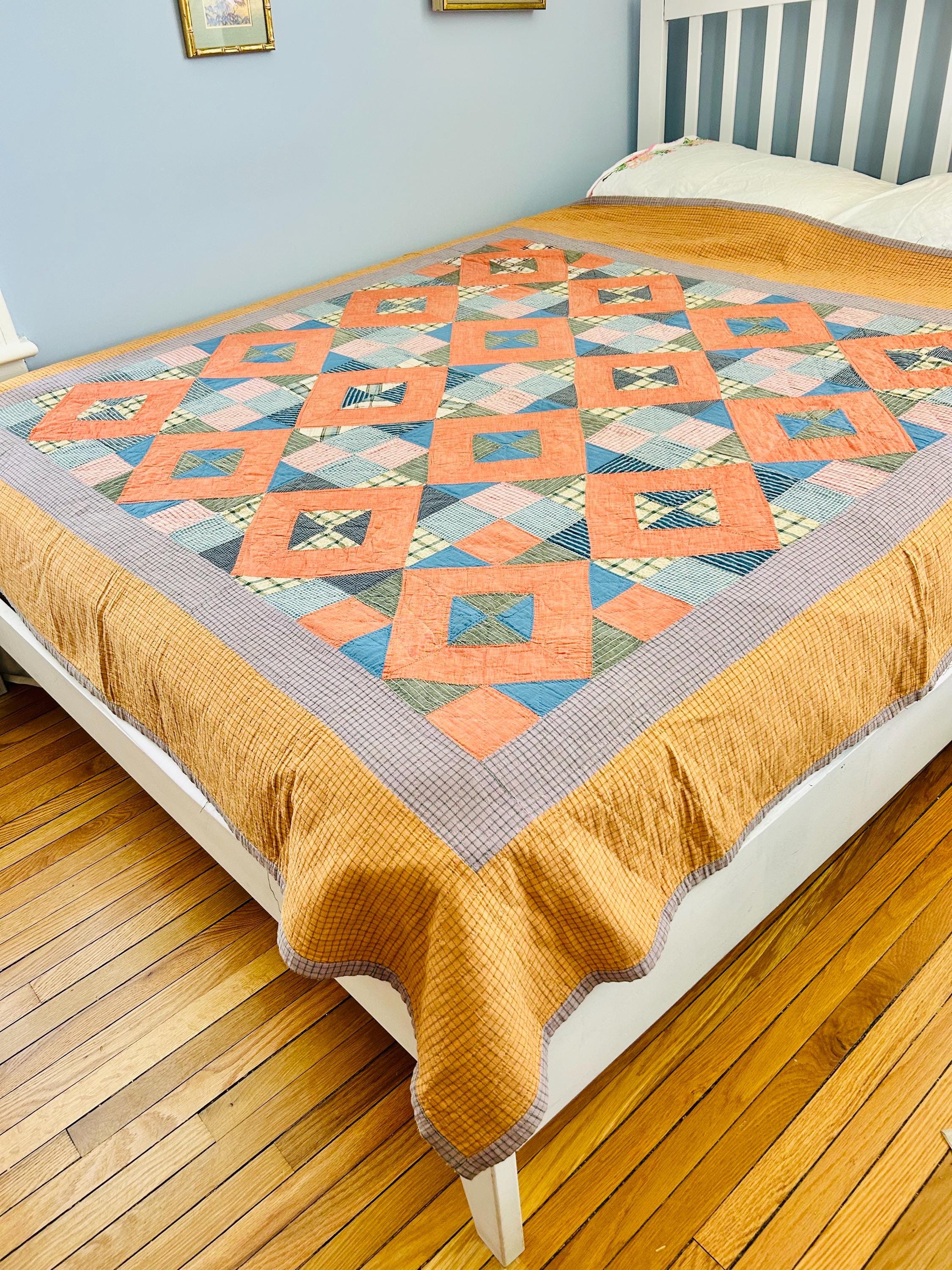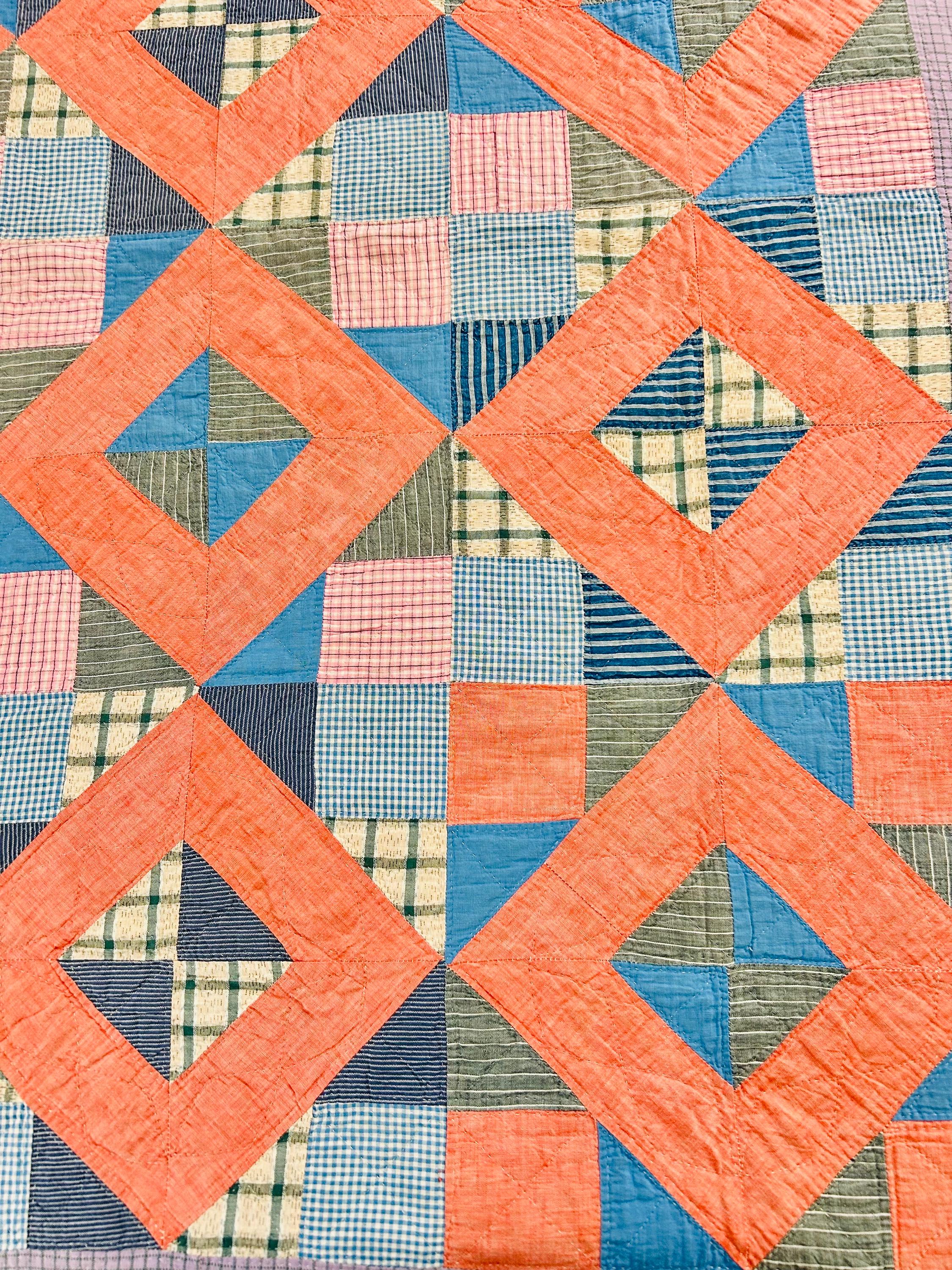 Details: * Date: Circa 1930s (Depression Era) * Pattern: Four Corner Puzzle * Size: 71” x 72” * Materials: 100% cotton fabrics and lightweight cotton batting * Construction: Hand pieced and hand quilted * Colors: Coral, blue, green, mustard, soft pink, and neutrals * Backing: Vintage plaid cotton