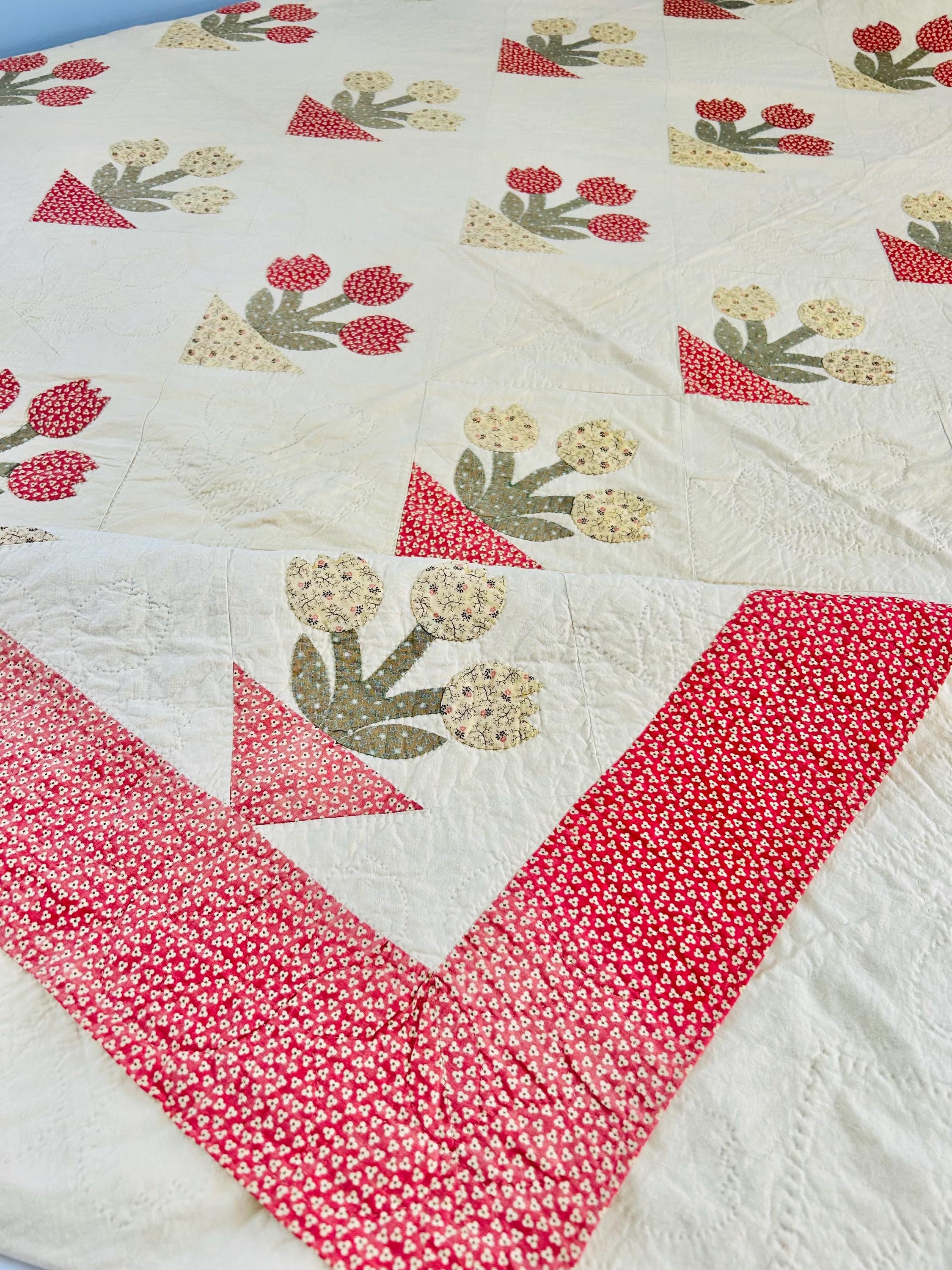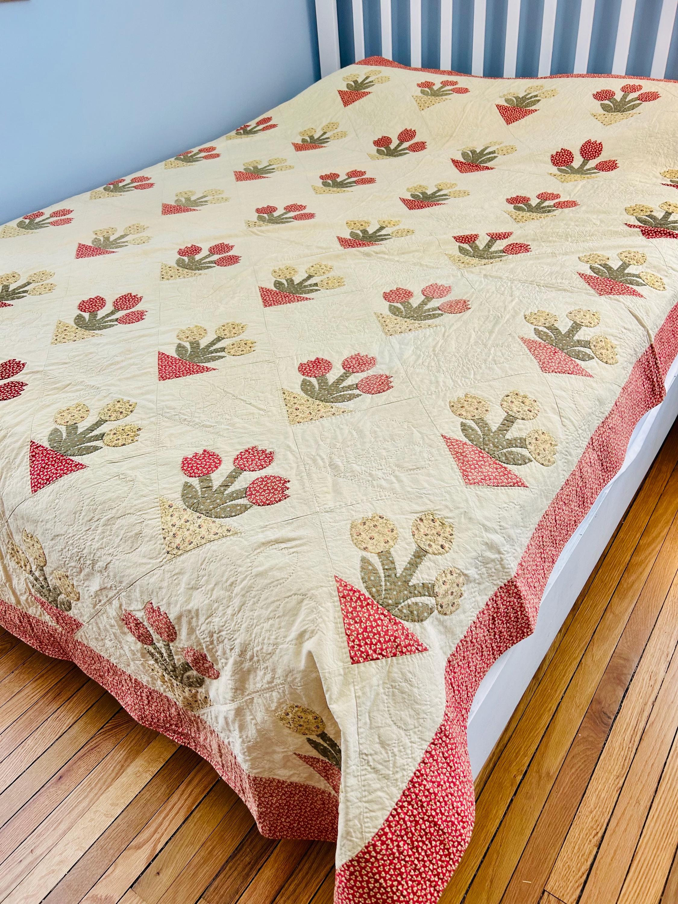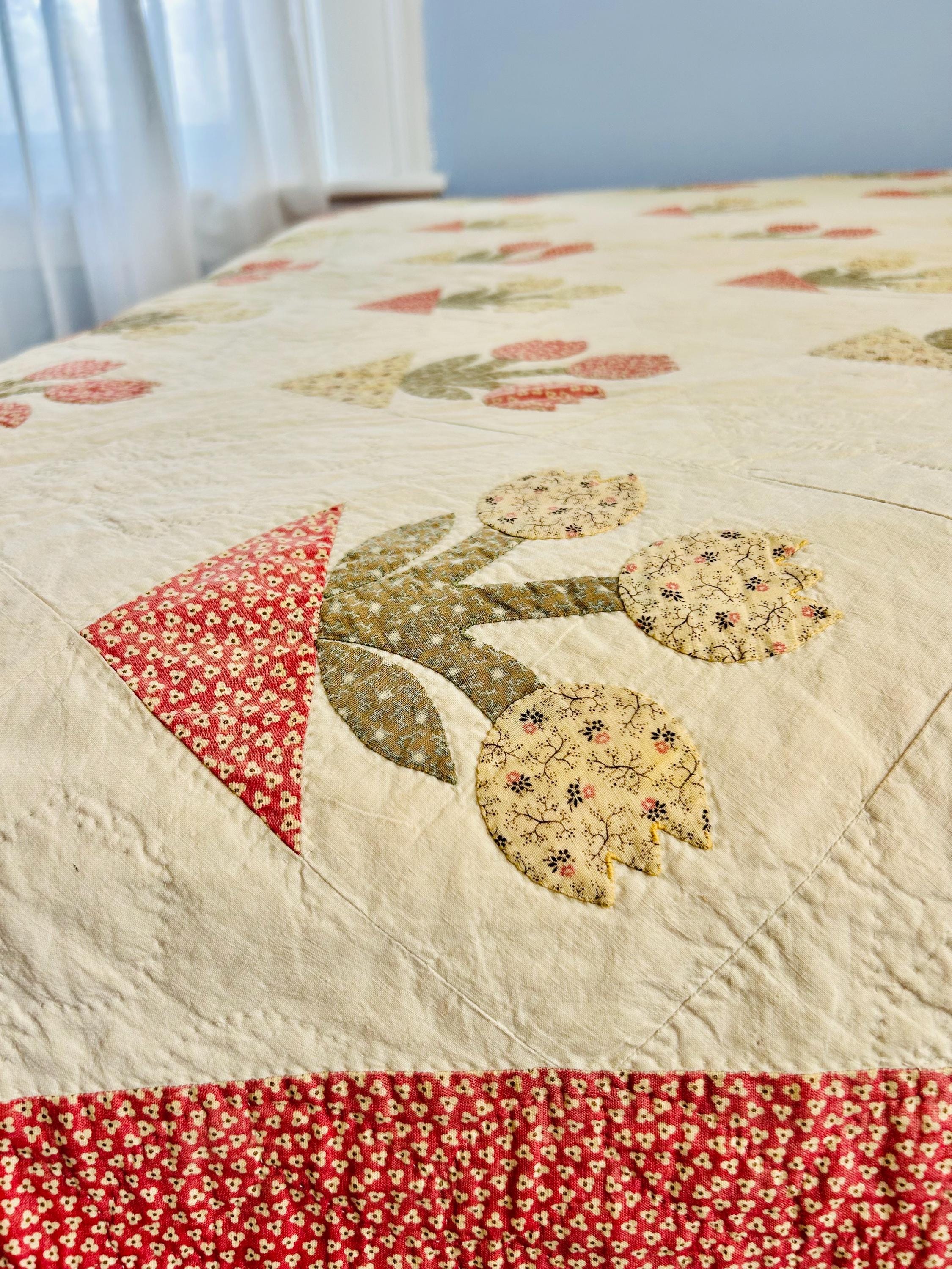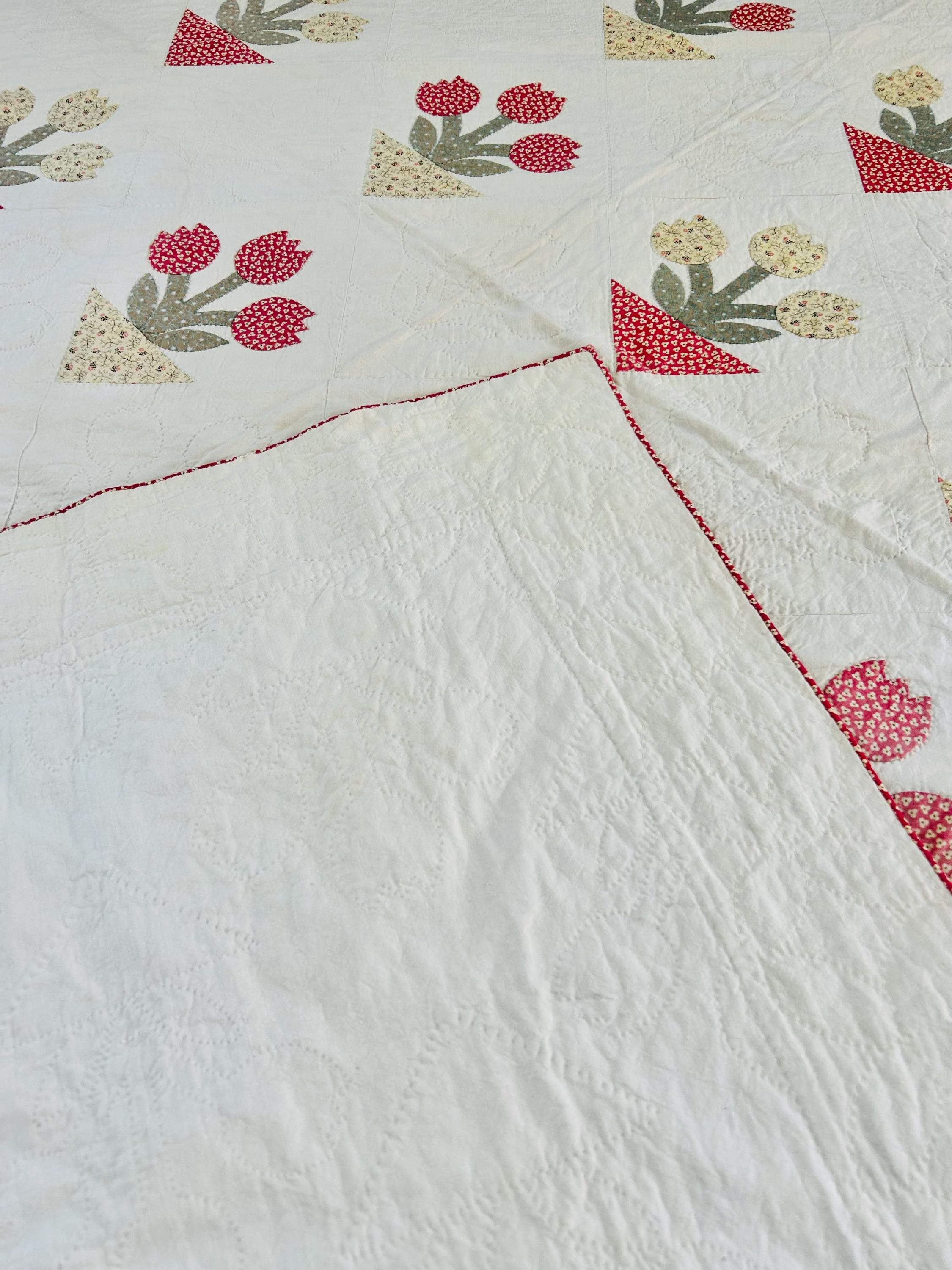 Details: * Date: Late 19th century (circa 1870–1890) * Pattern: Basket of Flowers (appliqué) * Size: 80” x 93” (generous full/queen size) * Construction: Hand appliquéd, hand quilted * Materials: Cotton fabrics, cotton batting * Quilting: Fine hand quilting with floral/scroll designs throughout * Colors: Turkey red, soft cream, sage/olive greens, small florals
