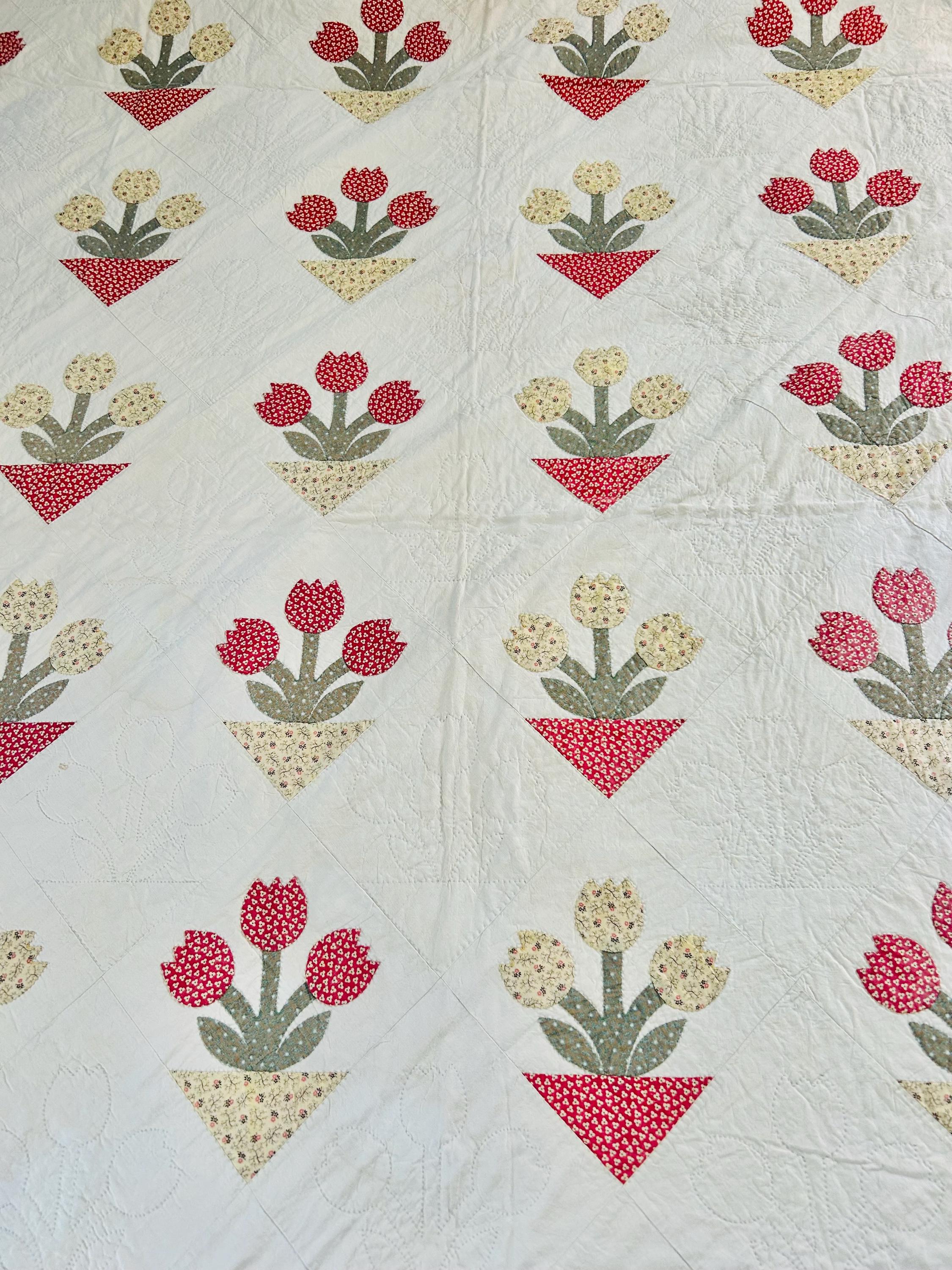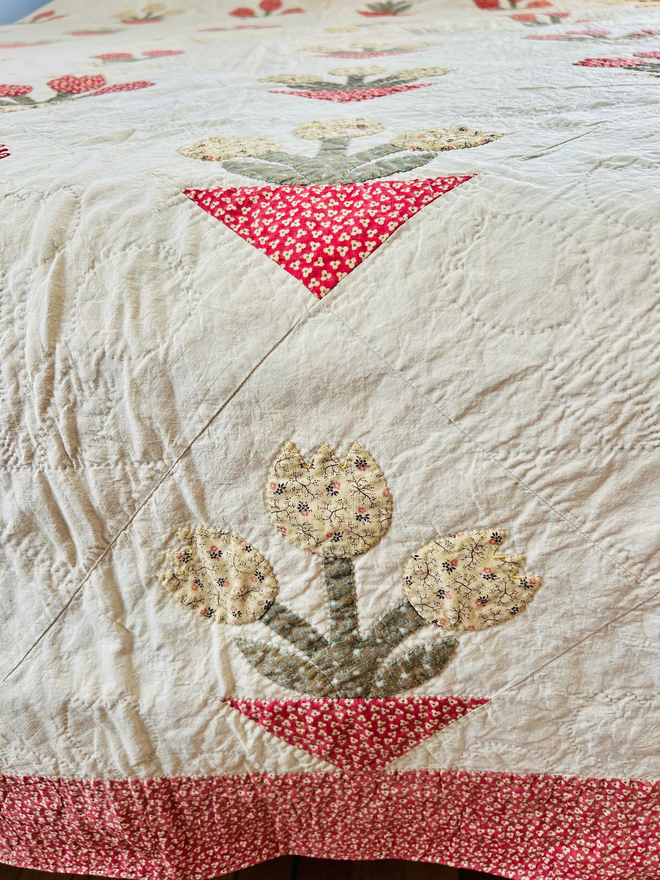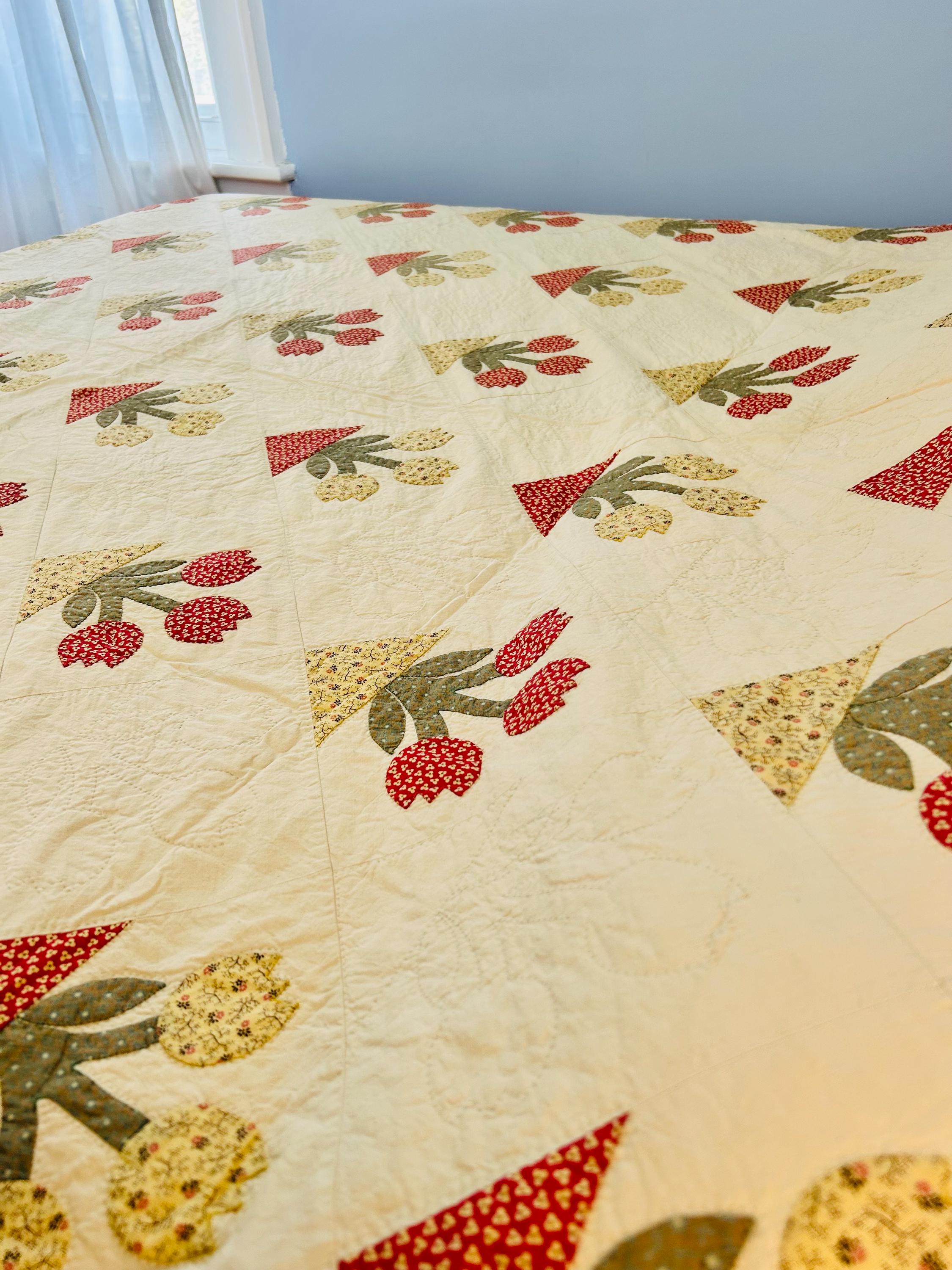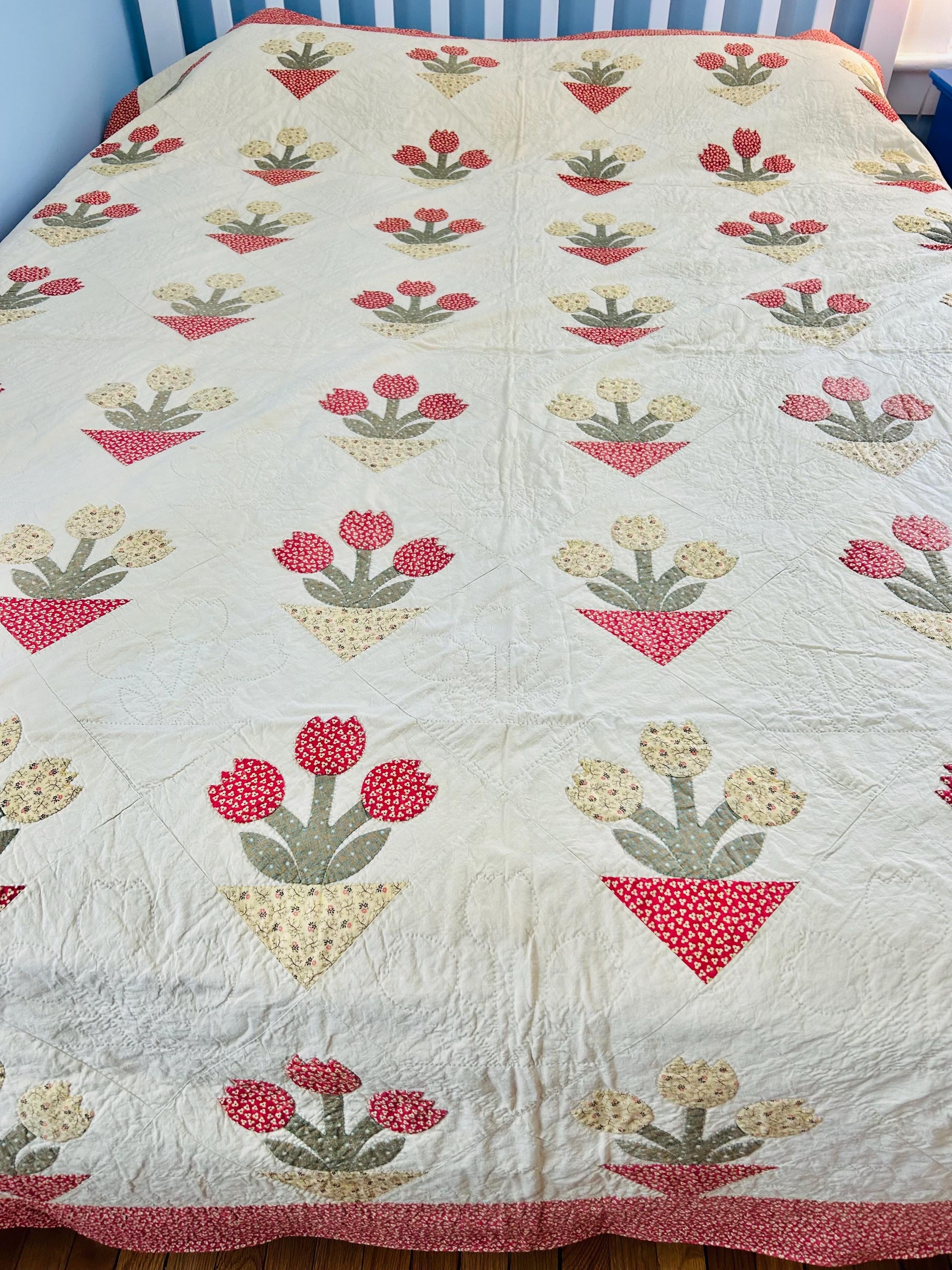 Details: * Date: Late 19th century (circa 1870–1890) * Pattern: Basket of Flowers (appliqué) * Size: 80” x 93” (generous full/queen size) * Construction: Hand appliquéd, hand quilted * Materials: Cotton fabrics, cotton batting * Quilting: Fine hand quilting with floral/scroll designs throughout * Colors: Turkey red, soft cream, sage/olive greens, small florals