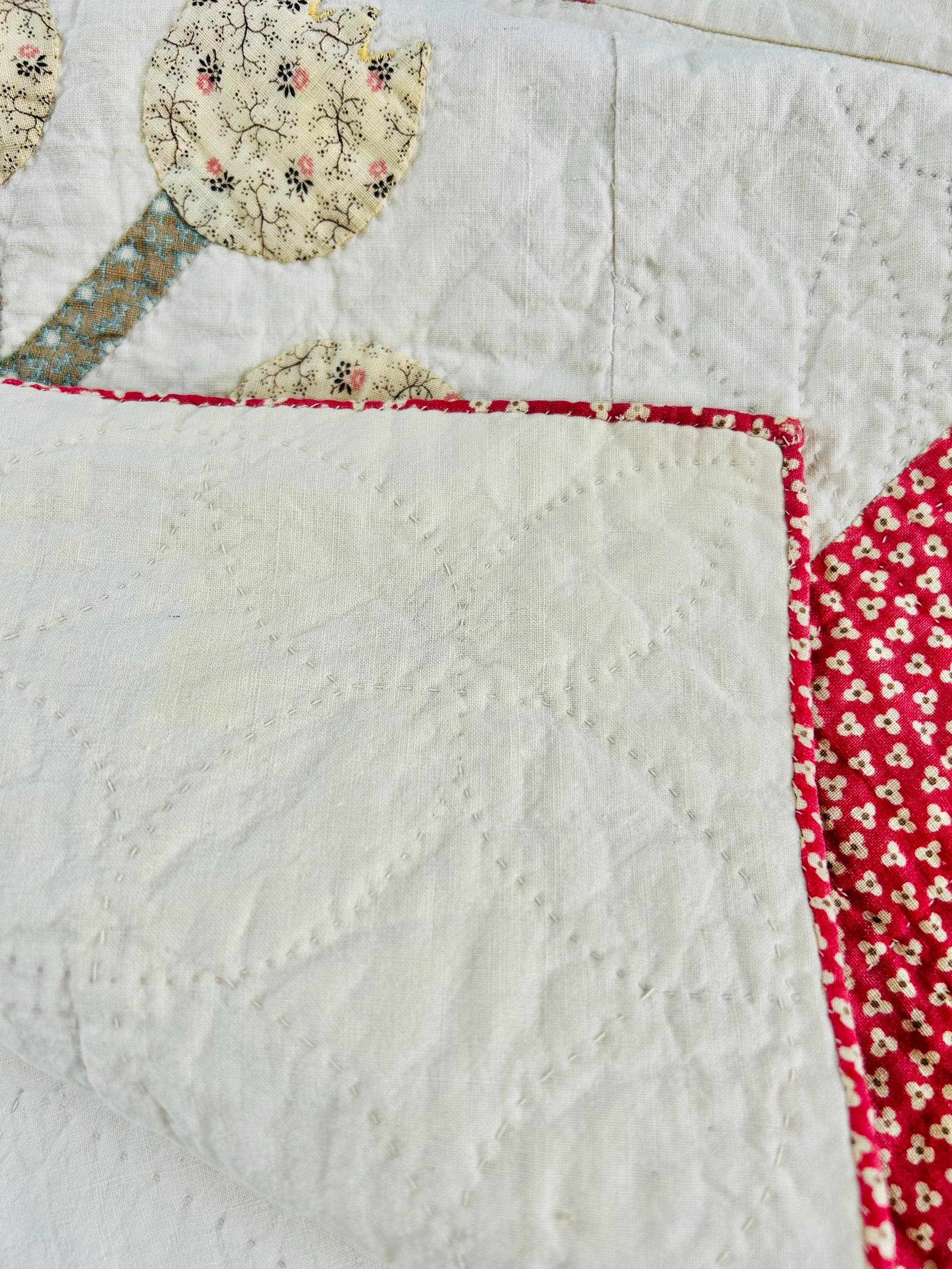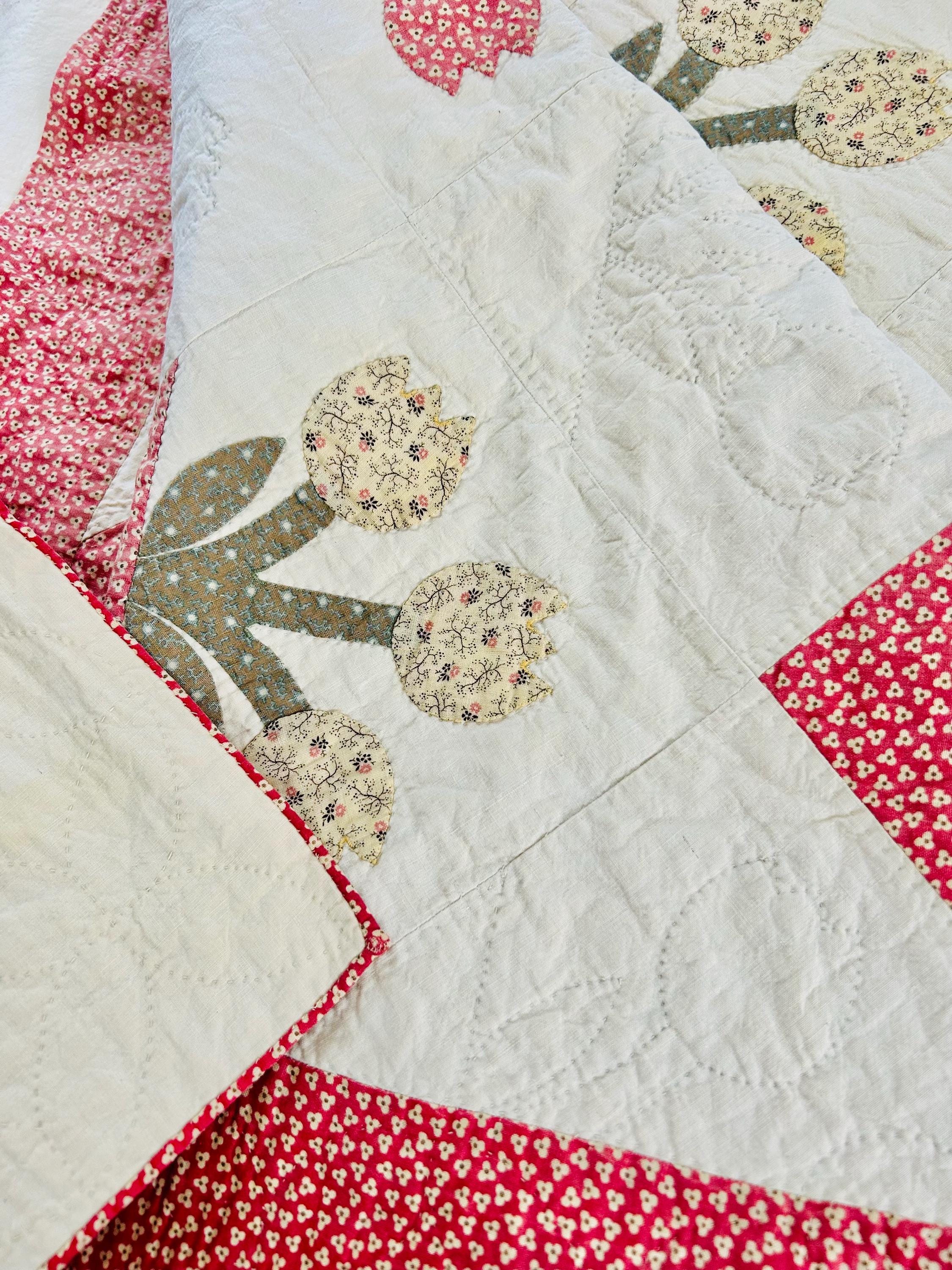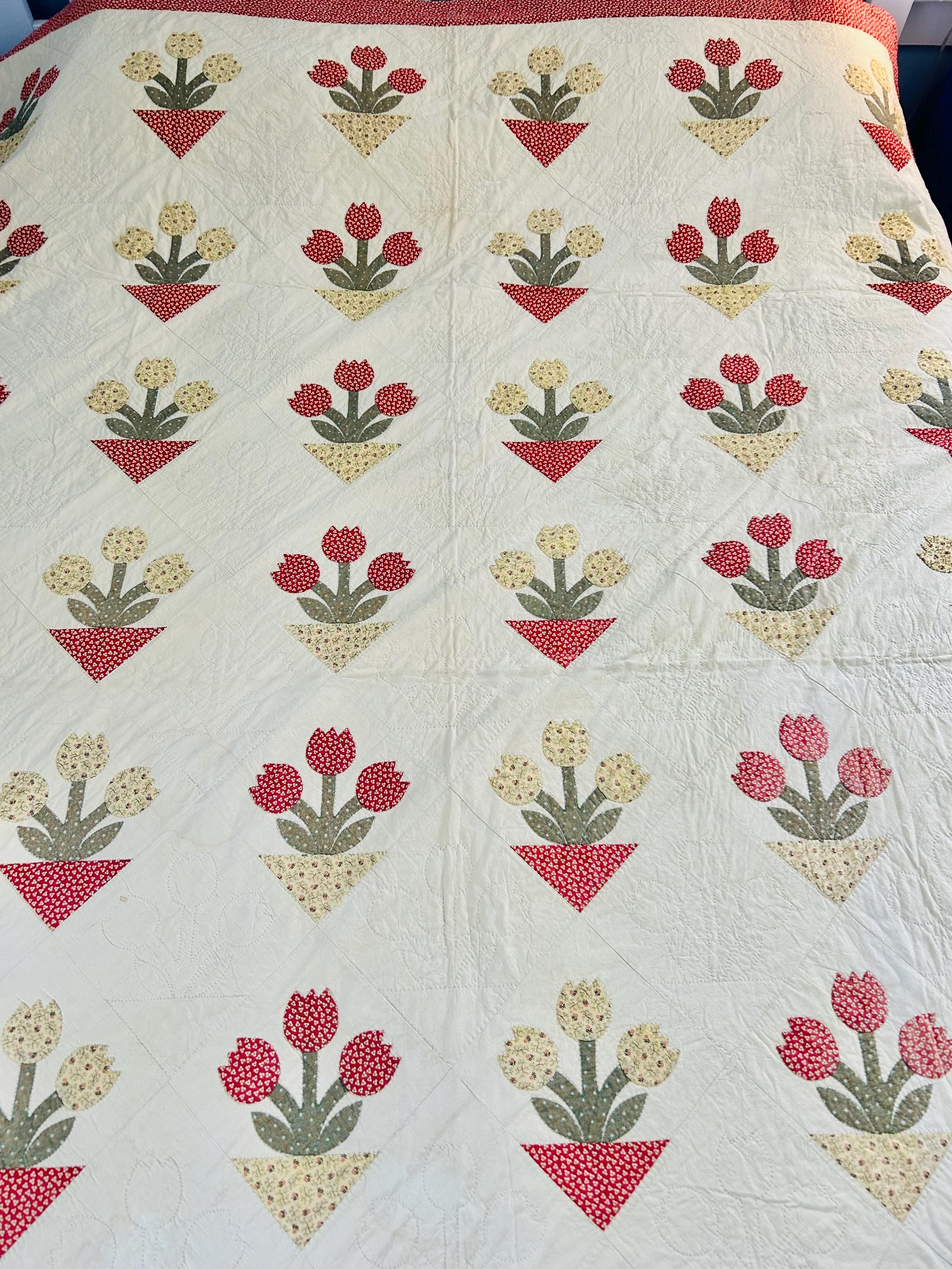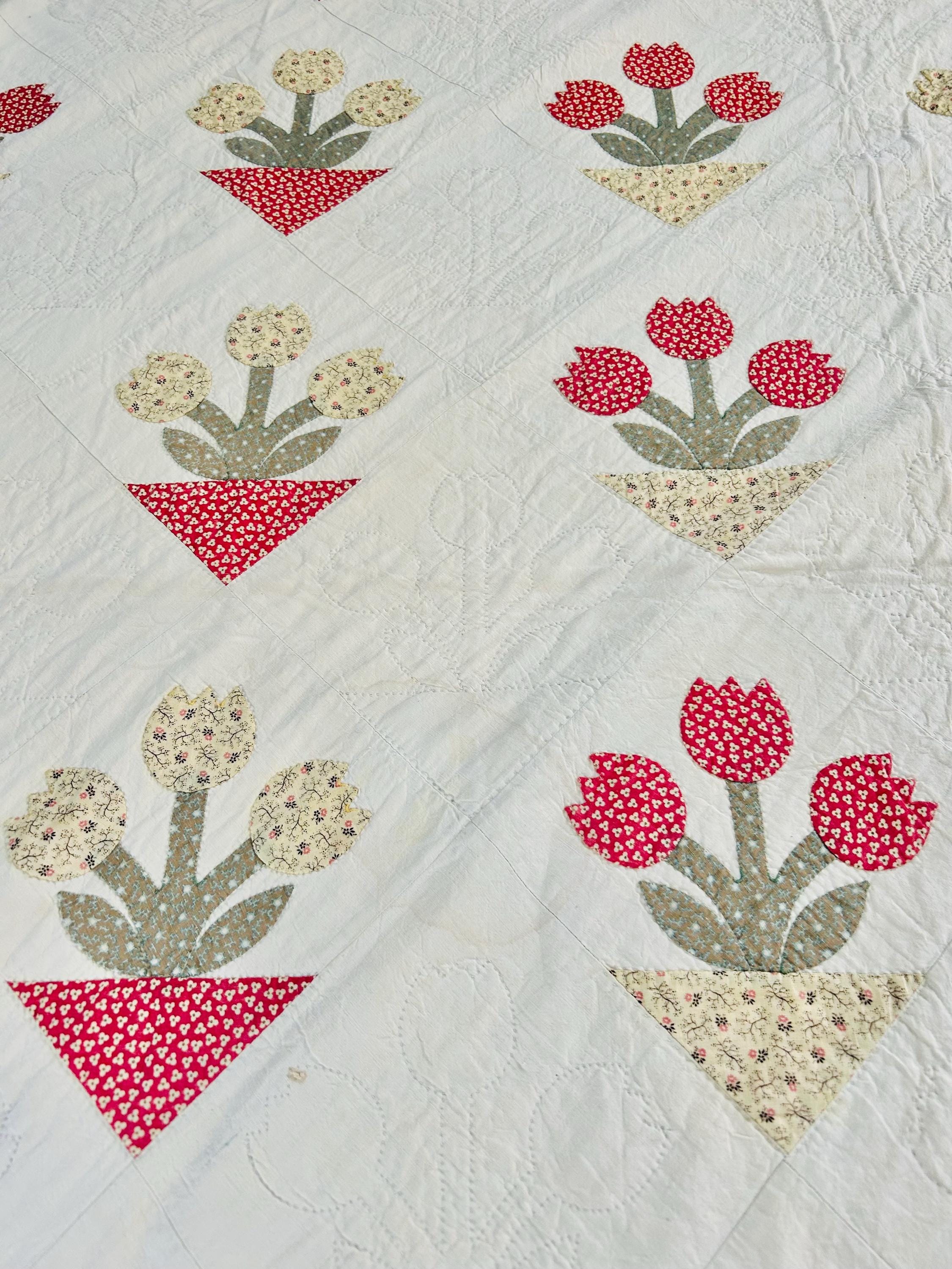 Details: * Date: Late 19th century (circa 1870–1890) * Pattern: Basket of Flowers (appliqué) * Size: 80” x 93” (generous full/queen size) * Construction: Hand appliquéd, hand quilted * Materials: Cotton fabrics, cotton batting * Quilting: Fine hand quilting with floral/scroll designs throughout * Colors: Turkey red, soft cream, sage/olive greens, small florals