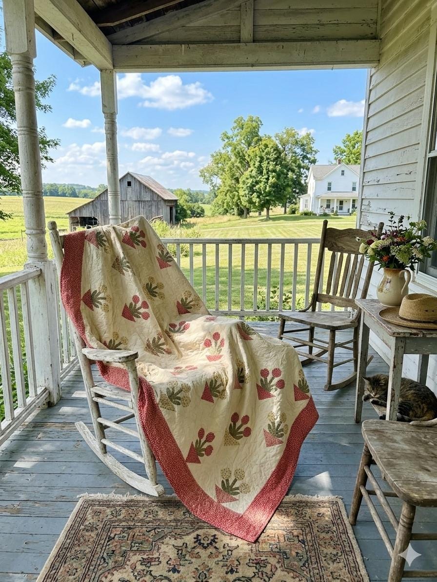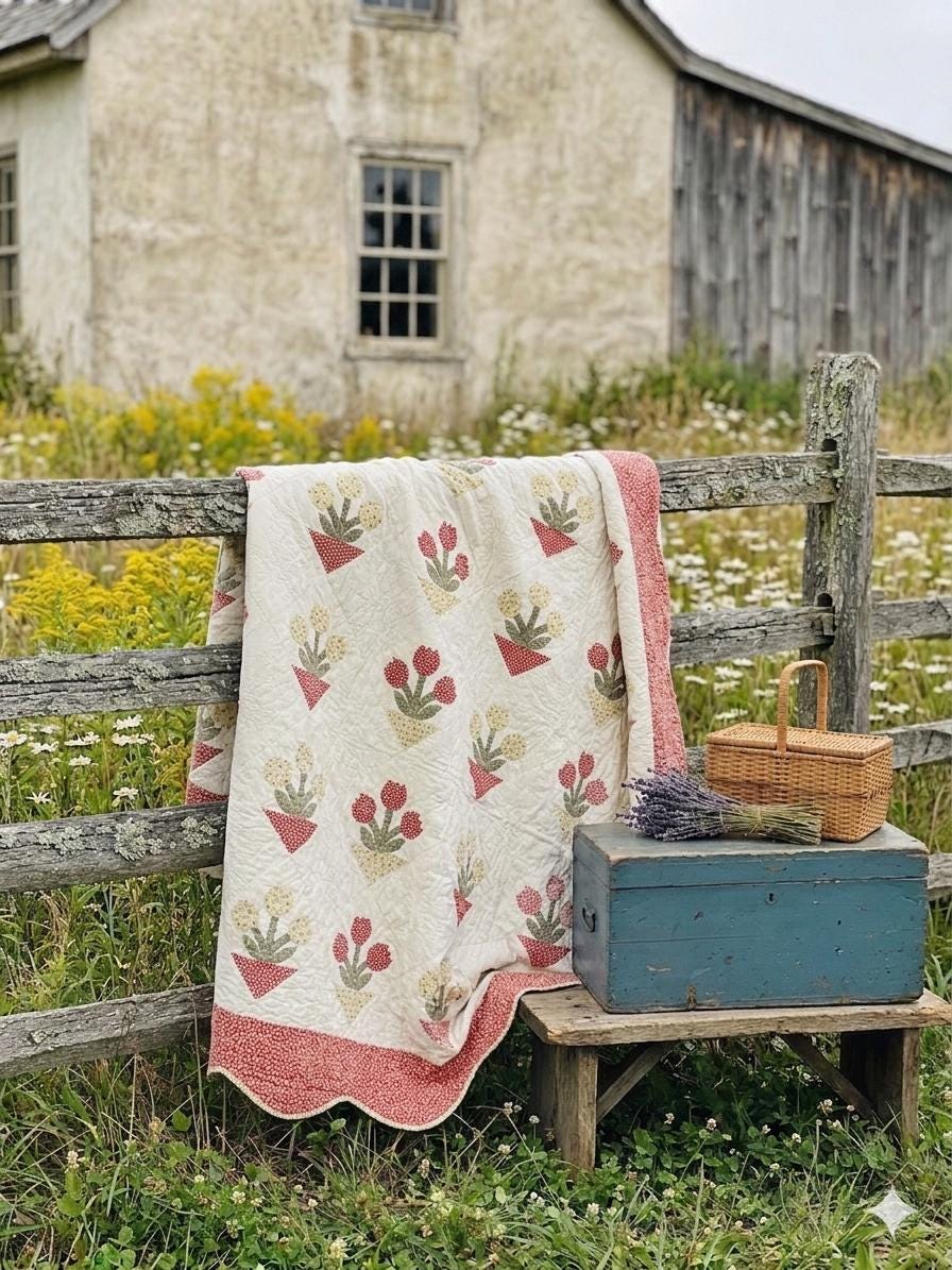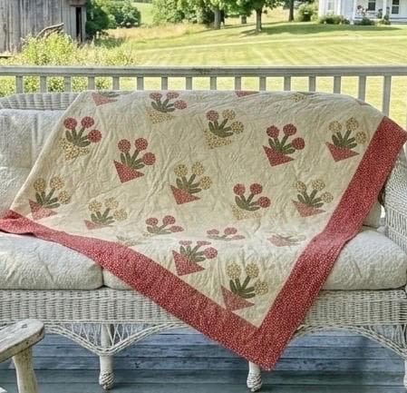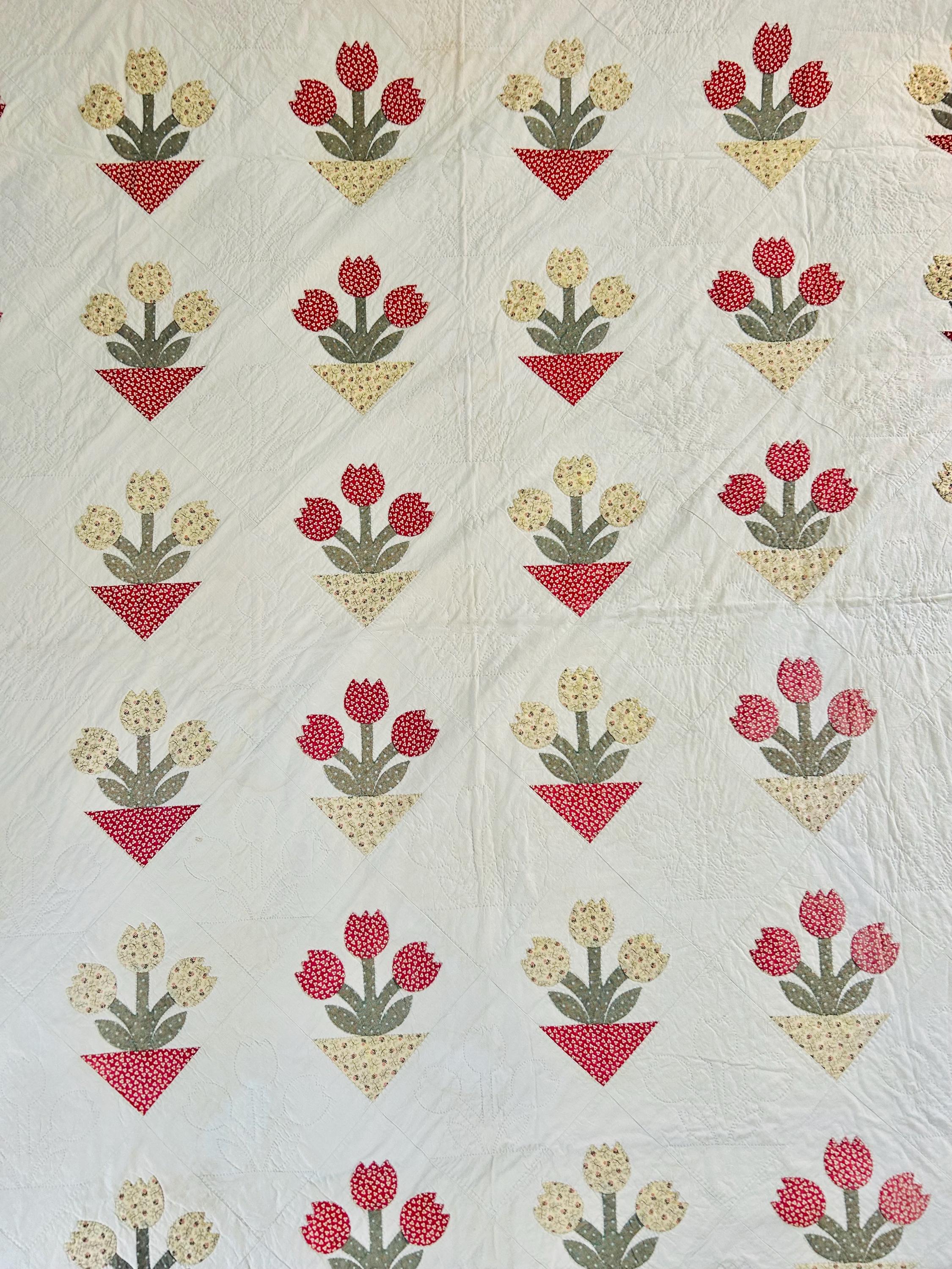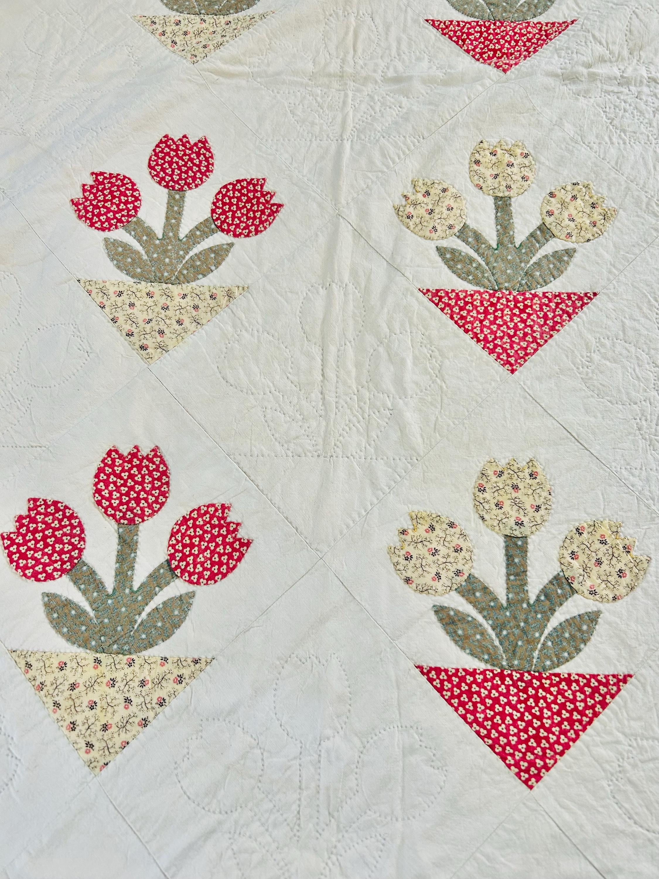 Details: * Date: Late 19th century (circa 1870–1890) * Pattern: Basket of Flowers (appliqué) * Size: 80” x 93” (generous full/queen size) * Construction: Hand appliquéd, hand quilted * Materials: Cotton fabrics, cotton batting * Quilting: Fine hand quilting with floral/scroll designs throughout * Colors: Turkey red, soft cream, sage/olive greens, small florals